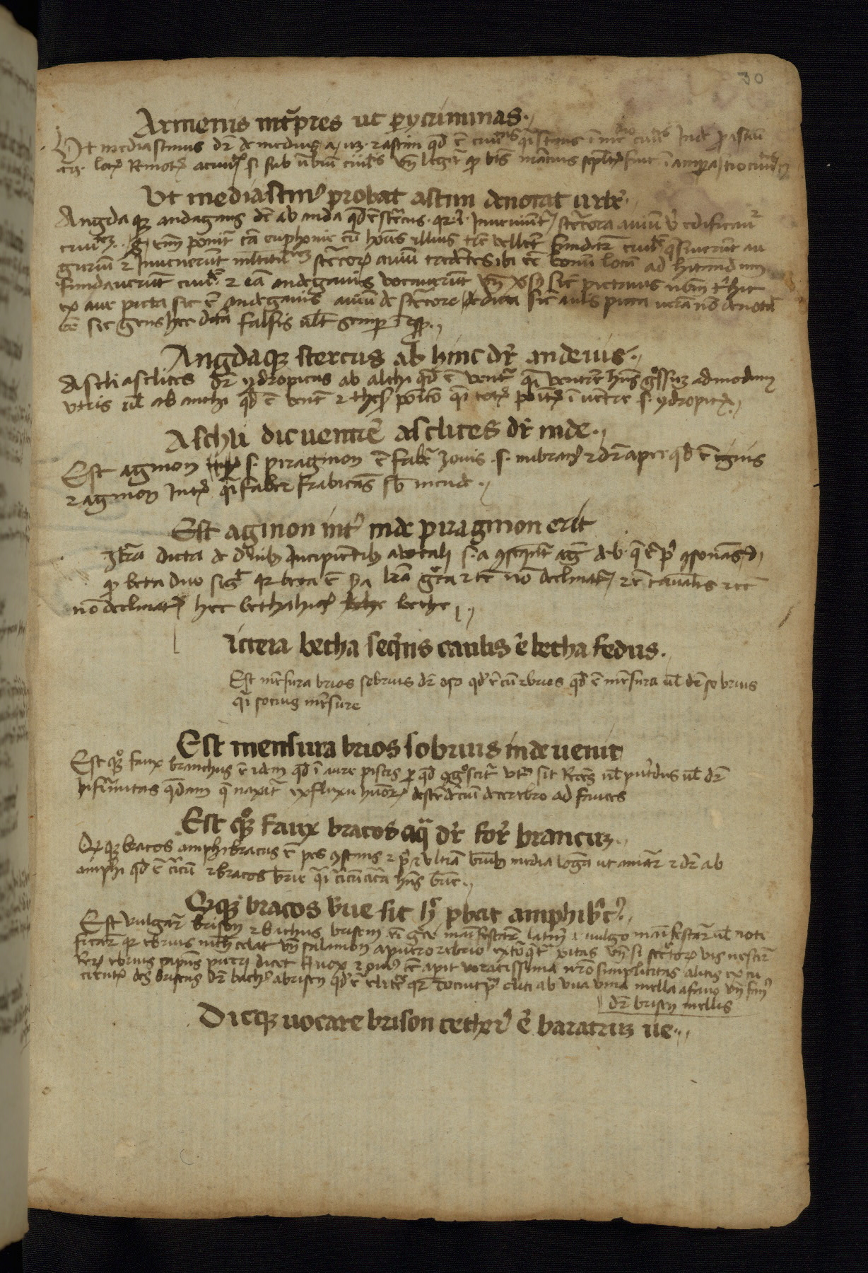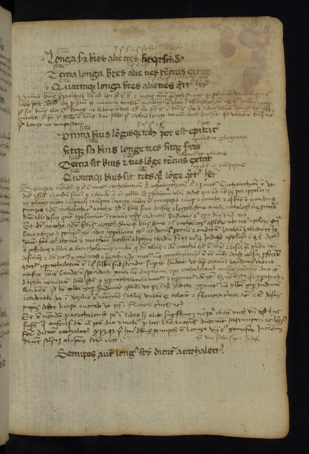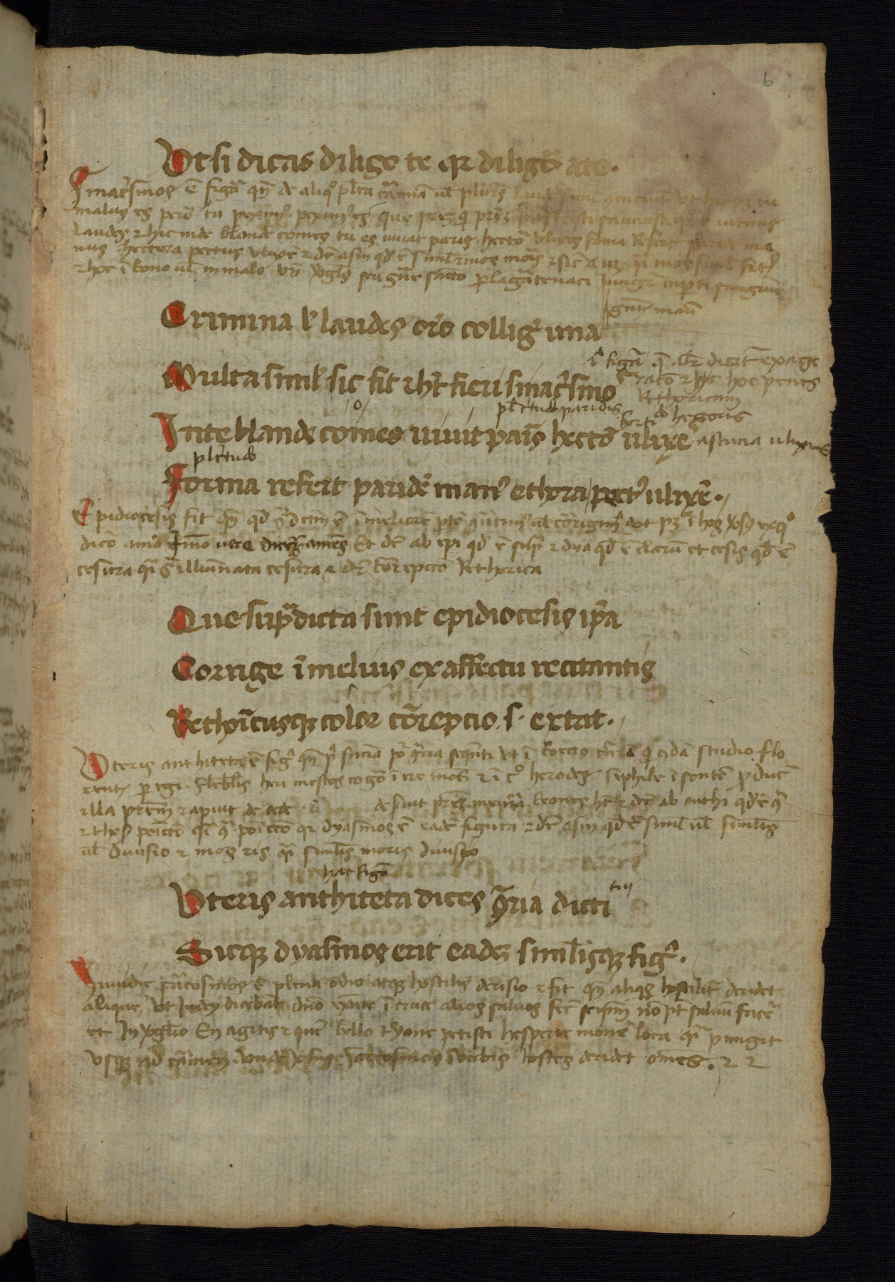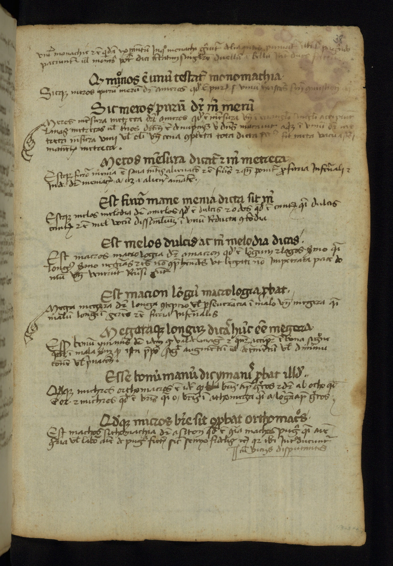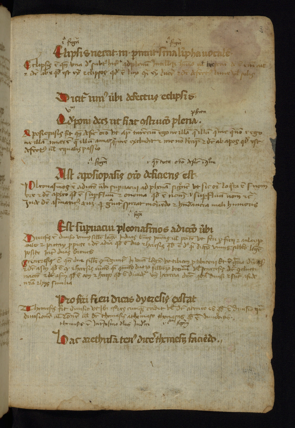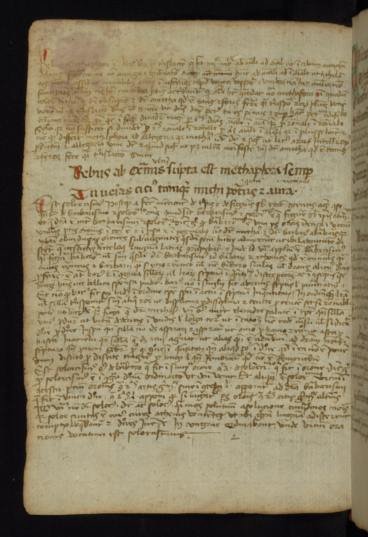 This German manuscript is a copy of Eberhard of Béthune's thirteenth-century grammatical poem Graecismus. The poem is accompanied by an extensive gloss by Jean-Vincent Metulin, a scholar from southern France. Having functioned as a textbook, the manuscript's condition suggests it was well-used by students eager to memorize and comprehend Béthune's ideas on the grammatical usage of Greek words.