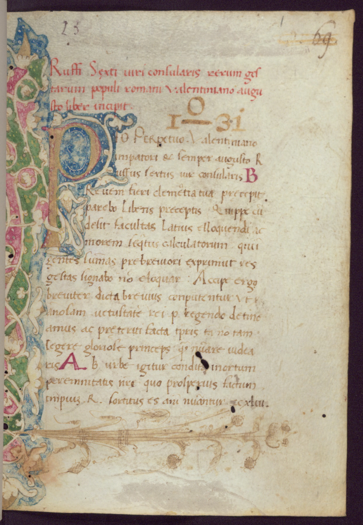 - Rubric: Ruffi Sexti viri consularis rerum gestarum populi romani Valentiniano augusto liber incipit