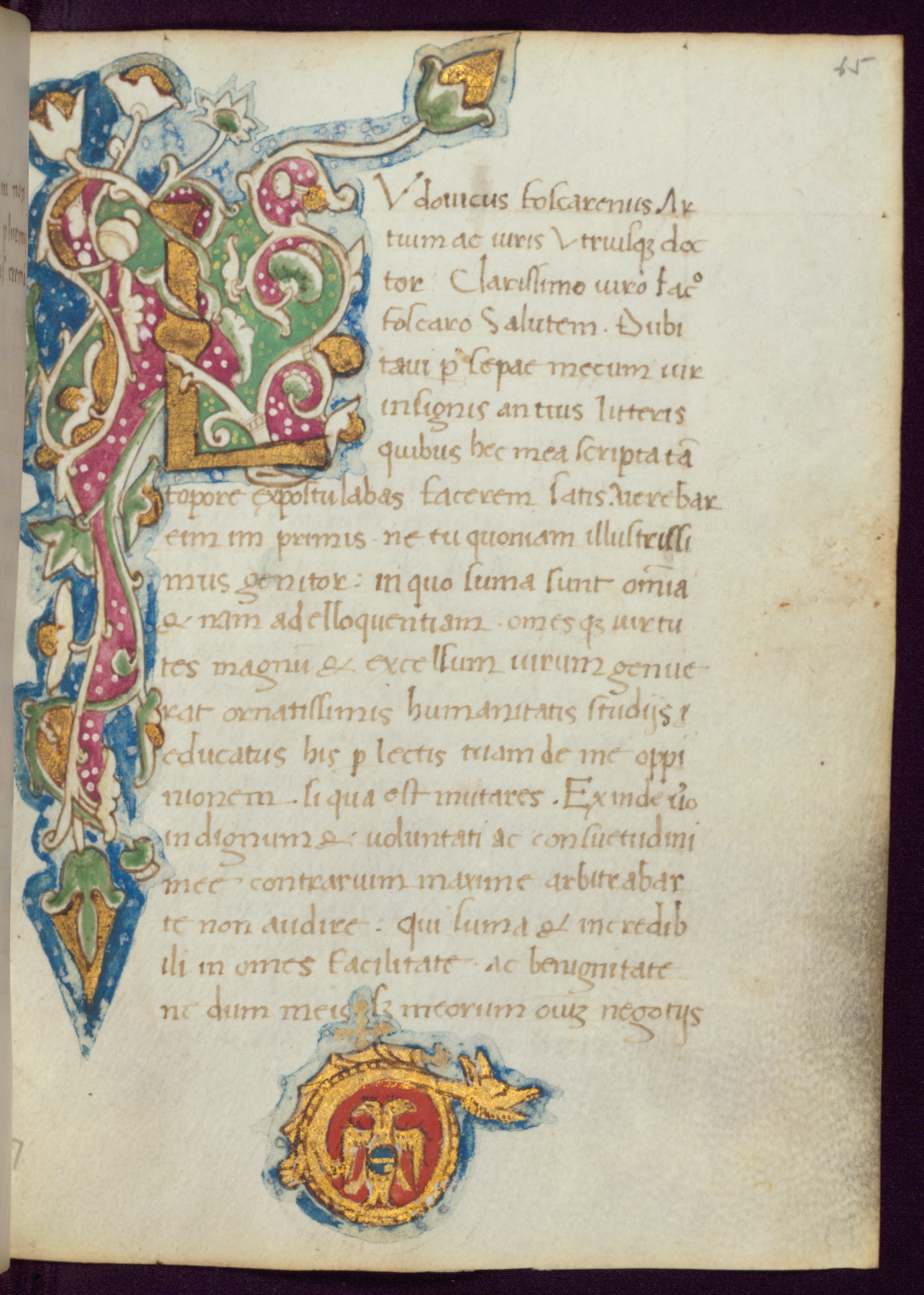 Written in the fifteenth century, perhaps ca. 1450-1460 in Venice, this manuscript contains works by Rufus Festus, Pseudo-Aurelius Victor, and Ludovico Foscarini. The first text, Breviarium Rerum Gestarum Populi Romani, is a purposefully brief history of the Roman Empire. The first half describes Rome's acquisition of its provinces in chronological order, while the second half is an account of Rome's wars with Persia. It was written in 370 CE for the Emperor Valens (r. 364 to 378 CE), who ruled the Eastern Roman Empire while his brother Valentinian I (r. 364 to 375 CE) ruled the West. In the rubric and incipit of the Walters' manuscript, Festus is erroneously named Ruffus Sextus, which stems from an early corruption of "Festus" to "Sextus." In addition, Valens is named Valentinian, confusing one brother for another. The second text, De Viris Illustribus, also concerns the history of the Roman Empire and dates to the fourth century CE. It gives short, concise biographies of important men from Rome's long history. It is one of many such texts that fall within the genre of Roman exemplary literature, the most famous of which is Suetonius' early second century CE work "De Vita Caesarum" or “The Lives of the Caesars.” In the manuscript tradition, the author of De Viris Illustribus has been given as both Pliny Secundus Veronesis, otherwise known as Pliny the Younger, who was writing in the late first century CE, or as Aurelius Victor, a fourth century CE historian. The Walters text adopts the former, naming the author as "Pliny Veronesis." Most scholars have dismissed both Pliny and Aurelius Victor as potential authors, and instead prefer to say he was a late antique scholarly commentator working in the fourth-early fifth century CE. The third text is an account of the lives of Victor and Corona, two Christian martyrs that were killed during the Roman Empire. According to its 1439 dedicatory letter, the text was written by Venetian humanist Ludovico Foscarini (1409-1480) and dedicated to Jacopo Foscaro (ca. 1416-1457), the son of the 65th Venetian Doge Francesco Foscari. In 1439 Jacopo was serving as praetor of Feltre, a small city and commune outside of Venice, whose patron saints are Victor and Corona. On fol. 65r, the beginning of the dedicatory letter, is depicted heraldry that likely represents the noble Giustiniani family of Venice. The text was written during the lifetime of Bernardo Giustiniani (1408–1489), a prominent Venetian senator and diplomat who was also an avid historian interested in the Roman Empire. His close friendship with Ludovico Foscarini suggests that it was perhaps Bernardo who commissioned the production of the Walters manuscript.