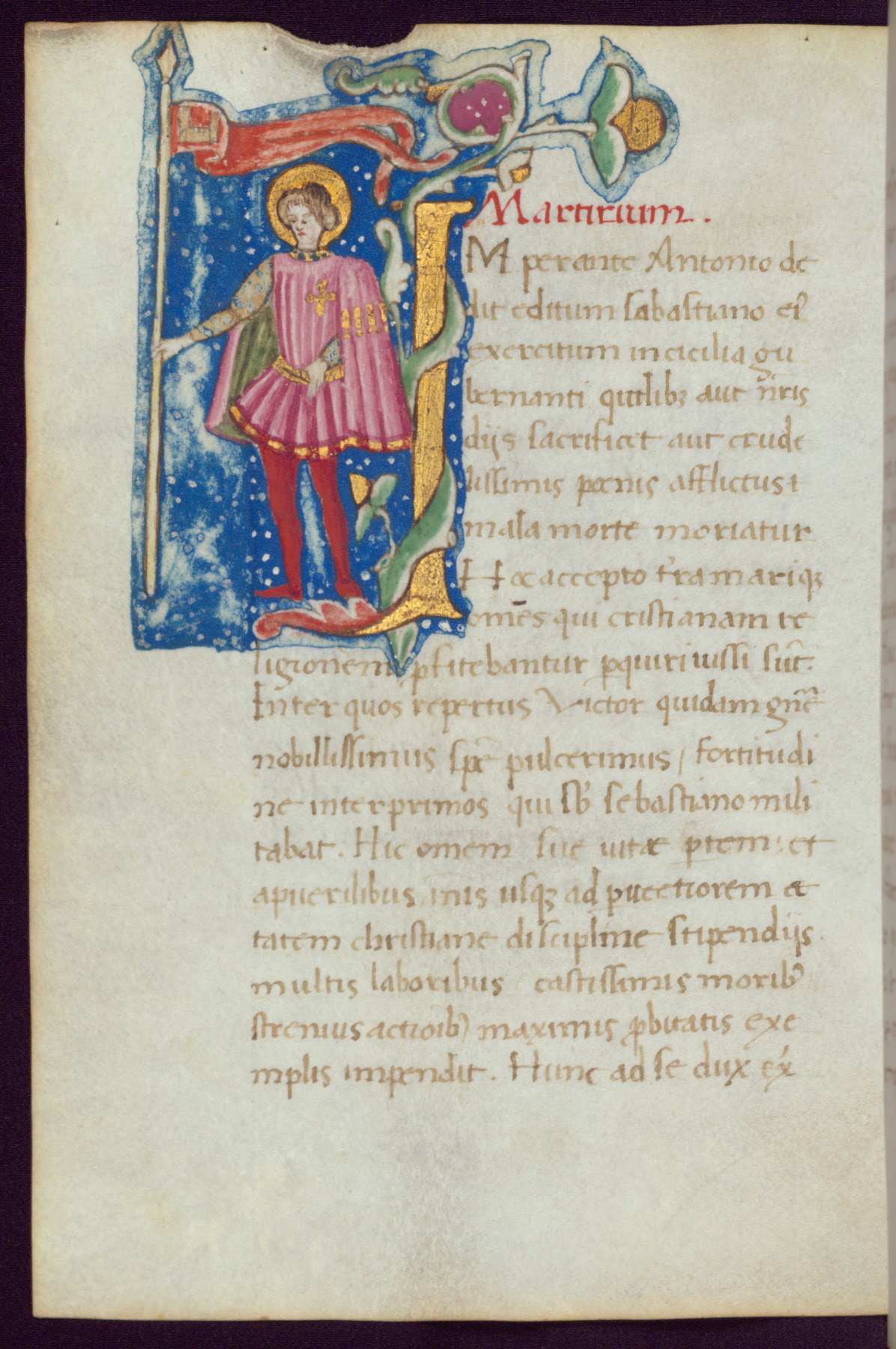 - Label: This page contains a historiated initial "I" that depicts a nimbed male figure, most likely Victor, whose story is recounted in the text.
