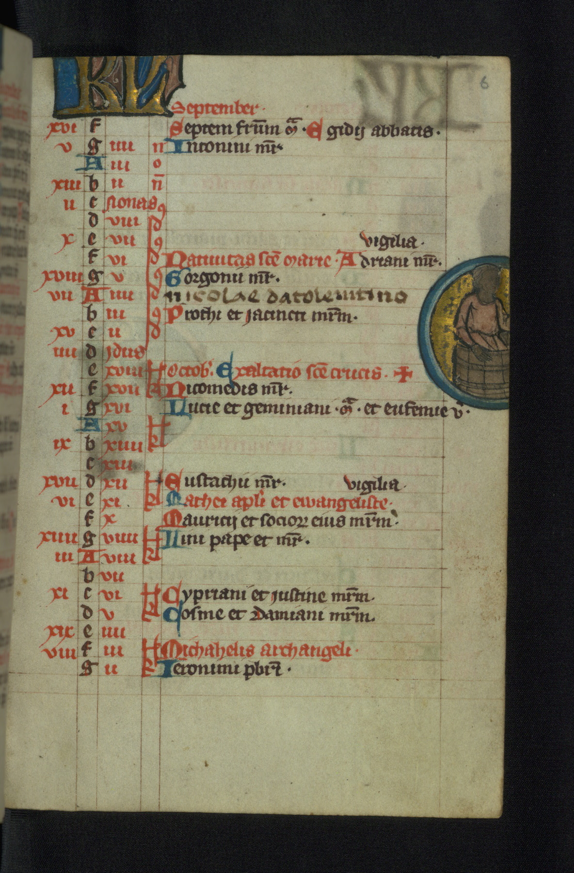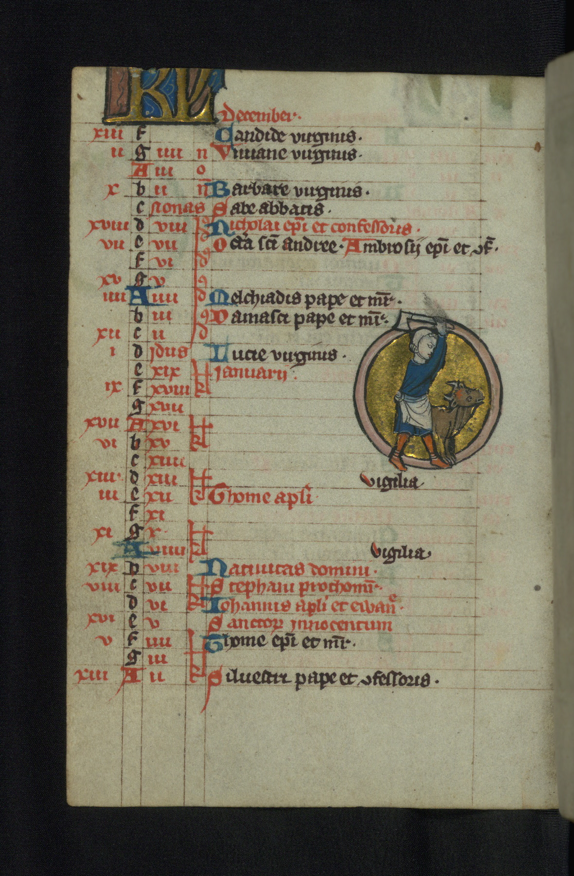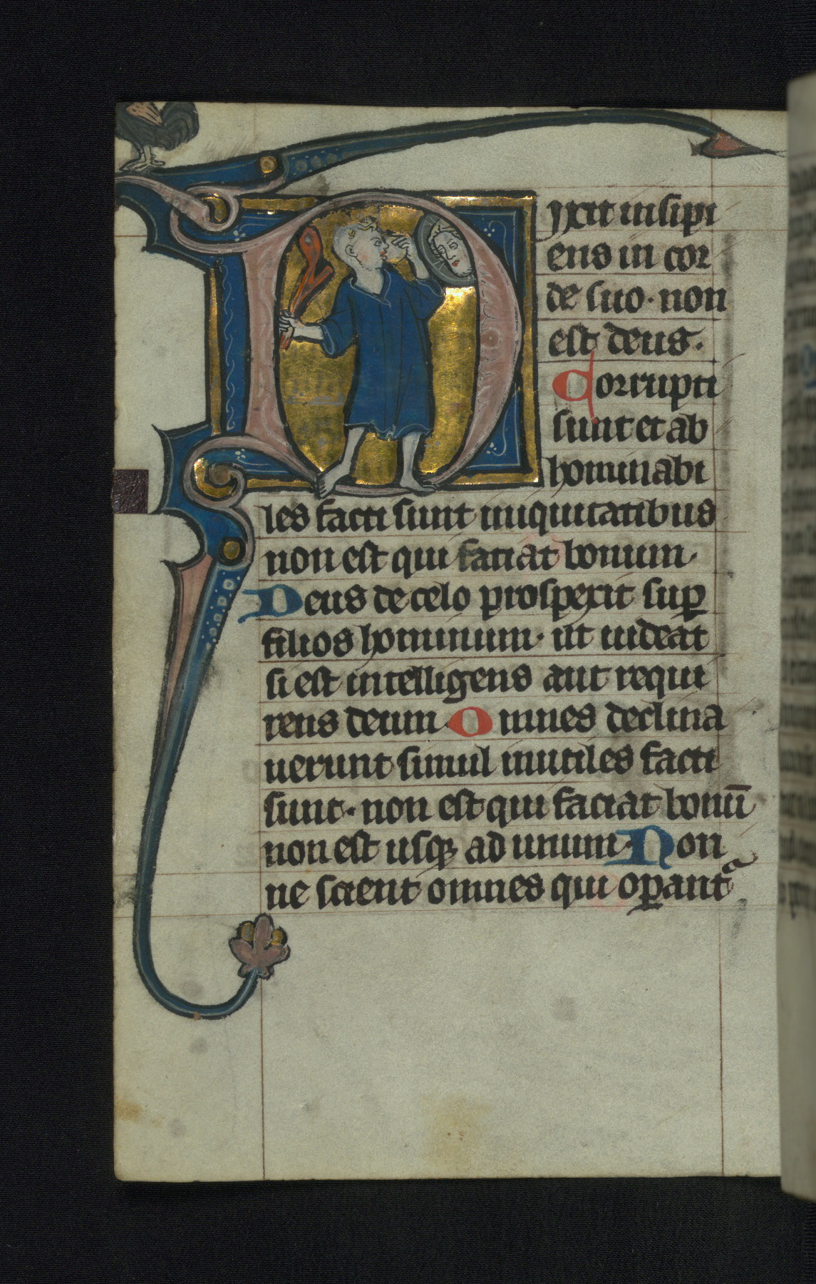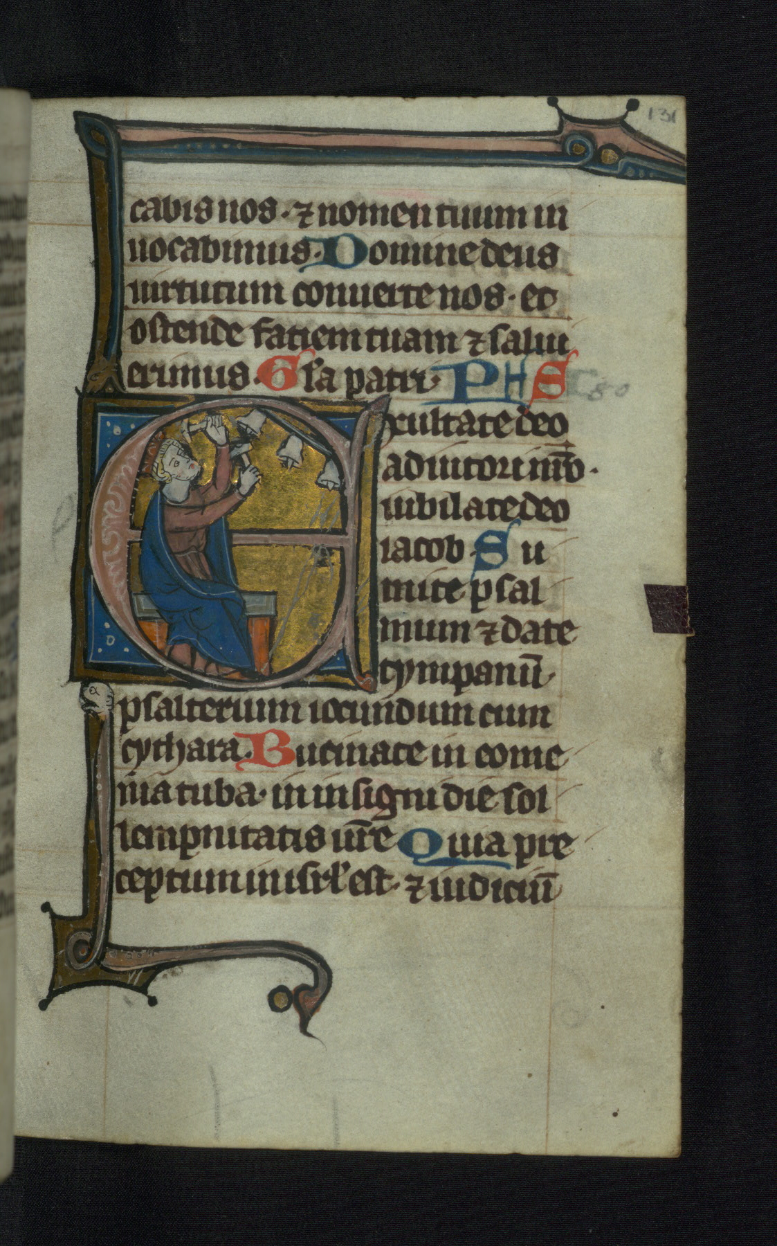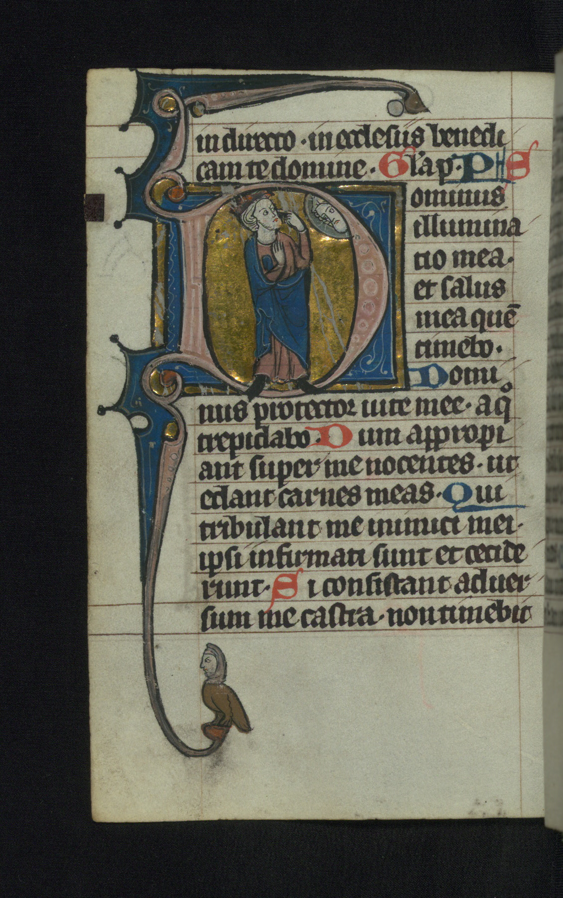- Decoration note: Two full-page miniatures; one full-page historiated initial; twelve large historiated initials (7-8 lines high); two small historiated initials (4-5 lines high); calendar containing twelve medallions (8 lines high) and KL monograms in gold; images mainly in rose and blue against burnished gold grounds; Psalm incipits beginning with decorated initials in gold (3 lines high) with bar borders on rose and blue grounds with white penwork; single grotesques on tops of bar borders and initial tails; red or blue capitals beginning each sentence; rubrics in red; text in black ink