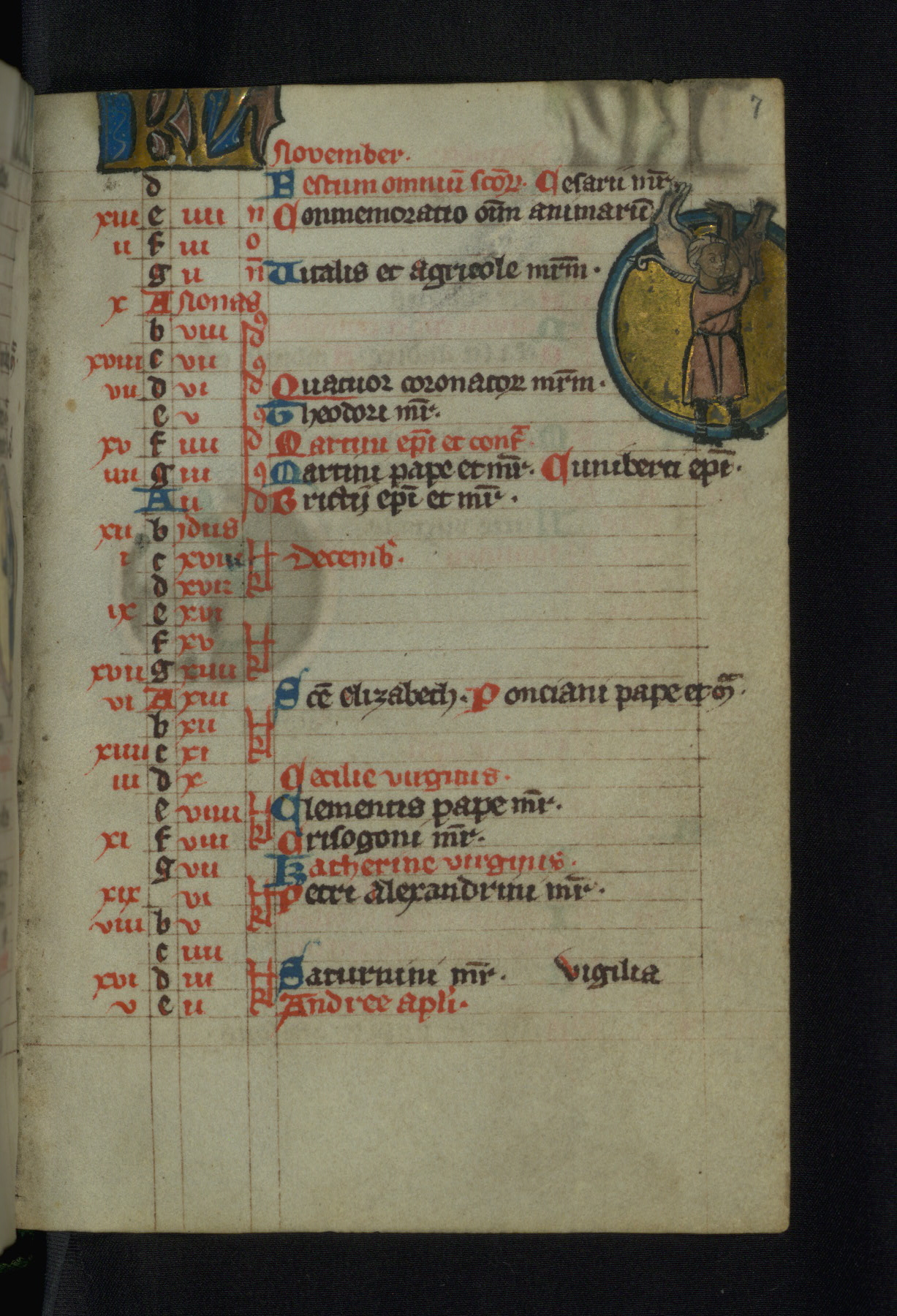 This Psalter-Hours was made for a Franciscan community in Cologne, Germany, in the late thirteenth century. It is especially notable for its large program of illuminations, which includes roundels in the calendar depicting the labors of the month, two full-page miniatures, fourteen historiated initials, and grotesques perched upon the top of bar borders throughout. It is identical in style to Baltimore, Walters Ms. W.111, and both are related to the style of Liège manuscripts of the 1280s-90s. They are also considered to be stylistic precursors of works by Johannes von Valkenburg, such as two graduals he created for Franciscans in Cologne in 1299 (Cologne, Diözesan Bibliothek Ms. 1B and Bonn, Universitätsbibliothek Ms. 384).