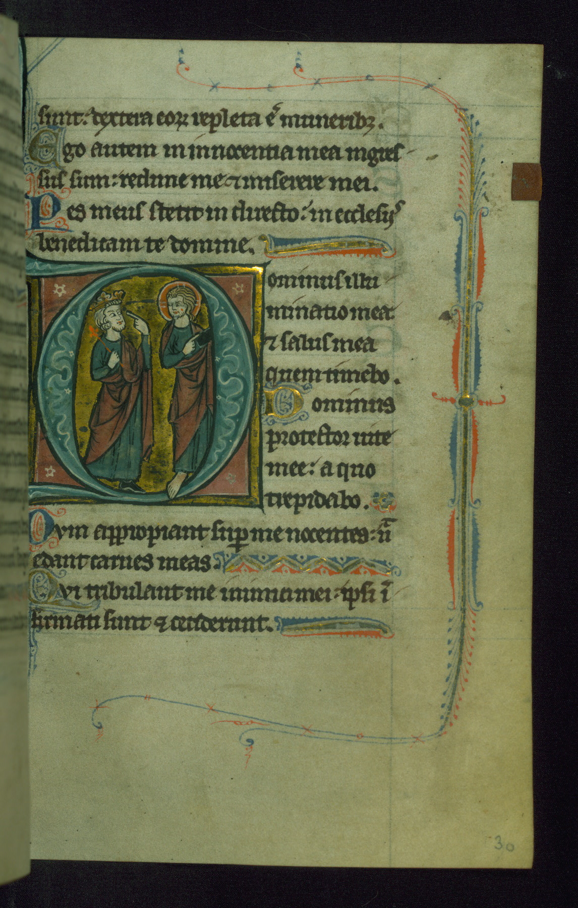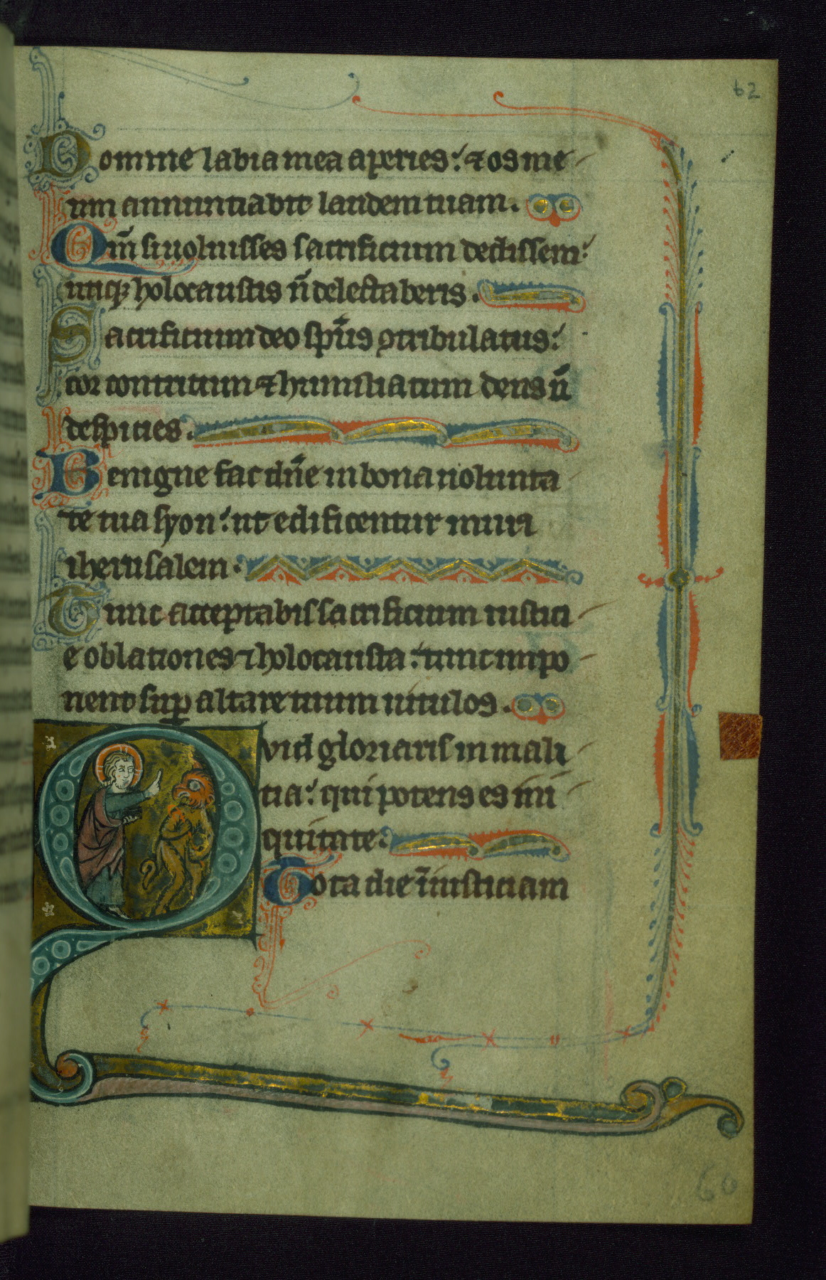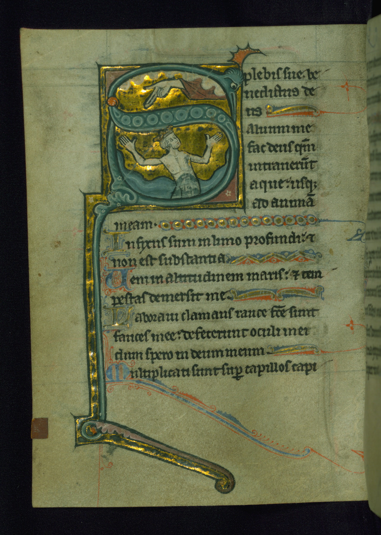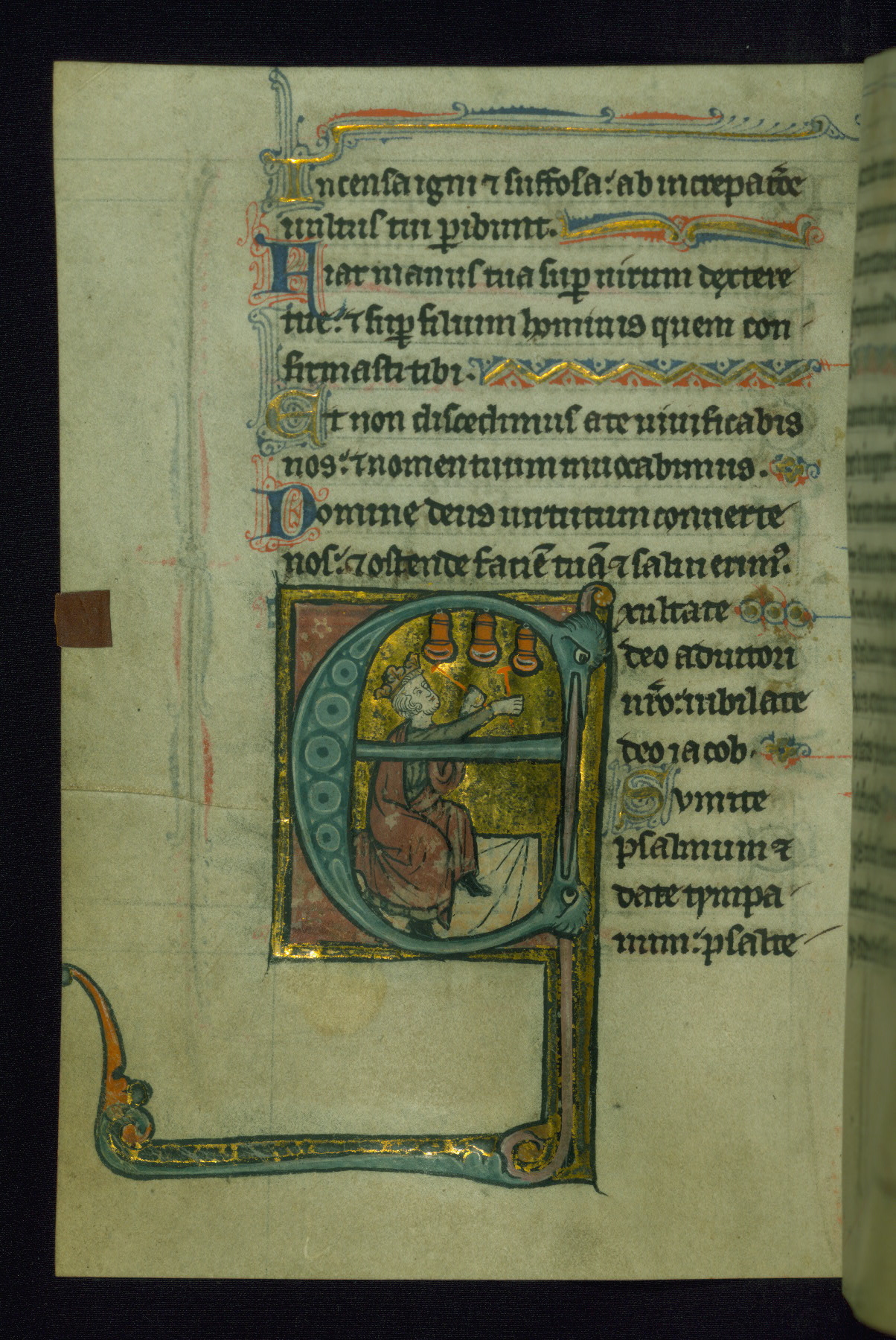 - Decoration note: Two missing historiated initials (from Psalms 1 and 38); eight extant historiated initials (5-8 lines); minor psalms and canticles introduced by enlarged decorated initials in gold against blue and rose grounds with white accents (3 lines); psalm versals in alternating gold with blue flourishes and blue with red flourishes; geometric line fillers and marginal pen flourishes in gold, blue, and red throughout; rubrics in red; text in black ink