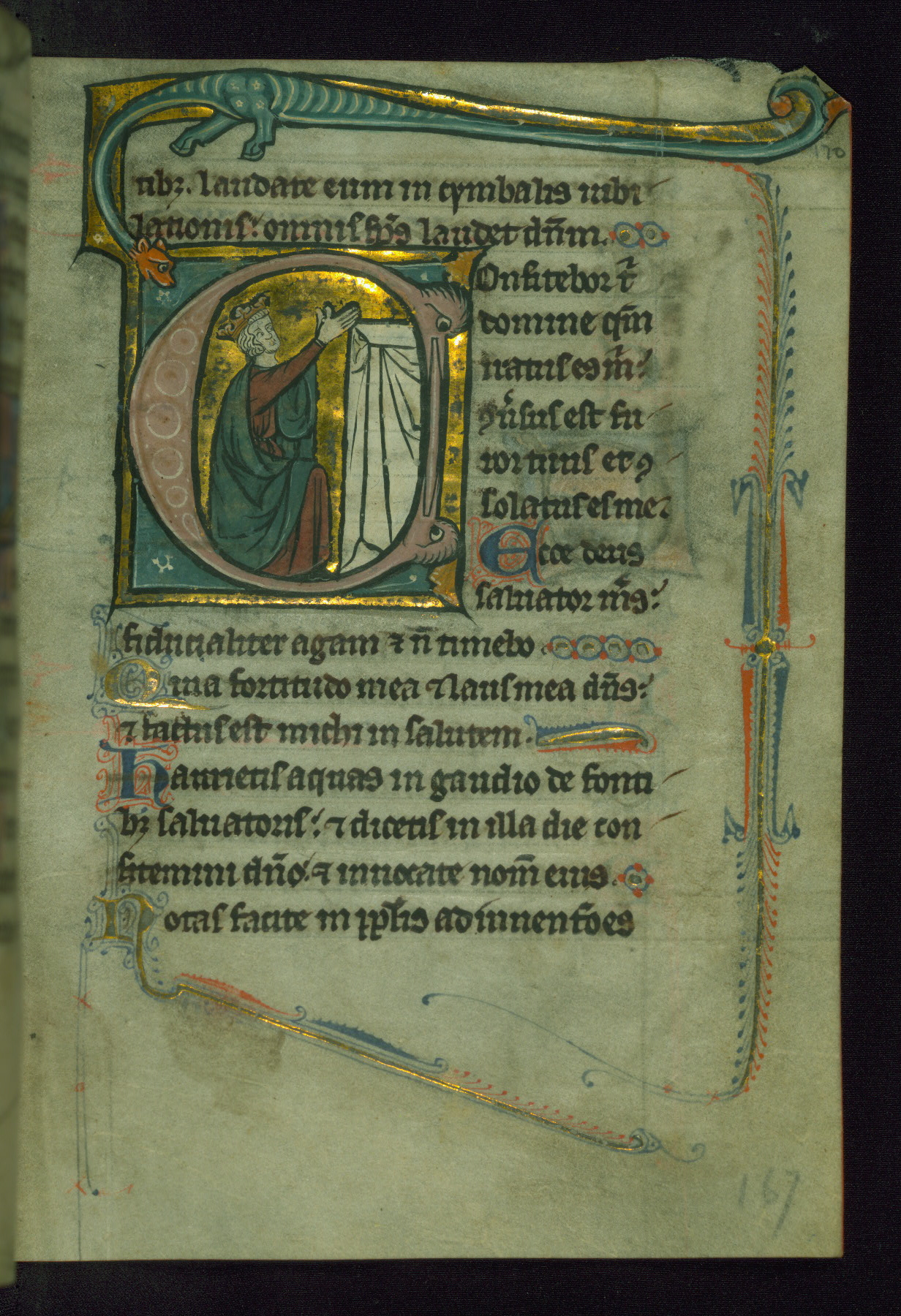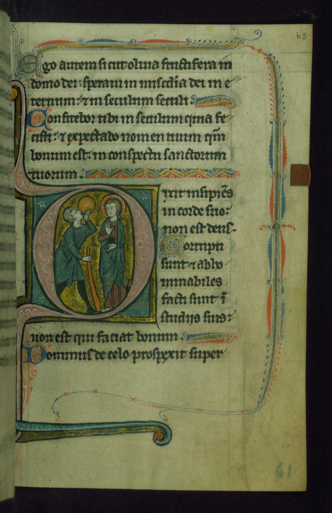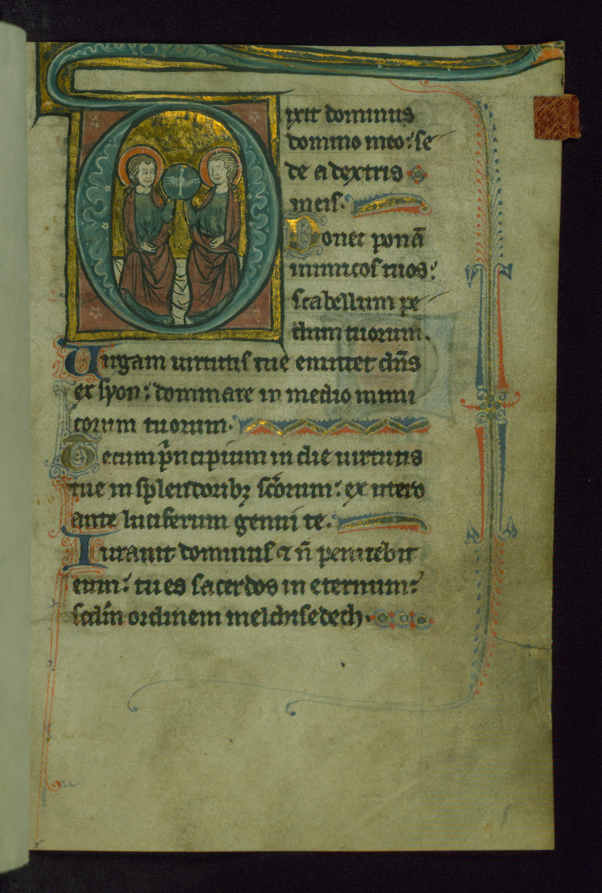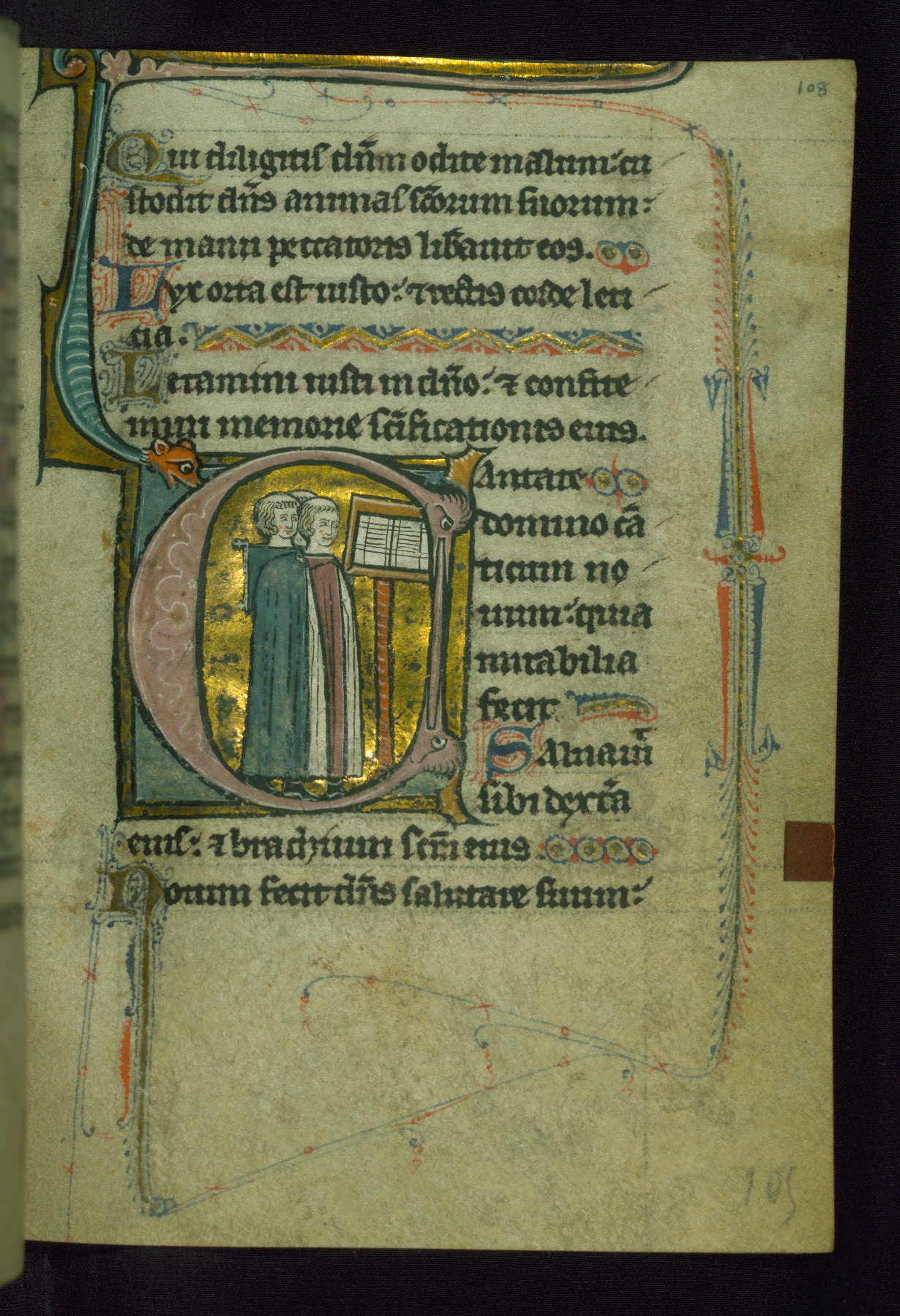 - Decoration note: Two missing historiated initials (from Psalms 1 and 38); eight extant historiated initials (5-8 lines); minor psalms and canticles introduced by enlarged decorated initials in gold against blue and rose grounds with white accents (3 lines); psalm versals in alternating gold with blue flourishes and blue with red flourishes; geometric line fillers and marginal pen flourishes in gold, blue, and red throughout; rubrics in red; text in black ink
