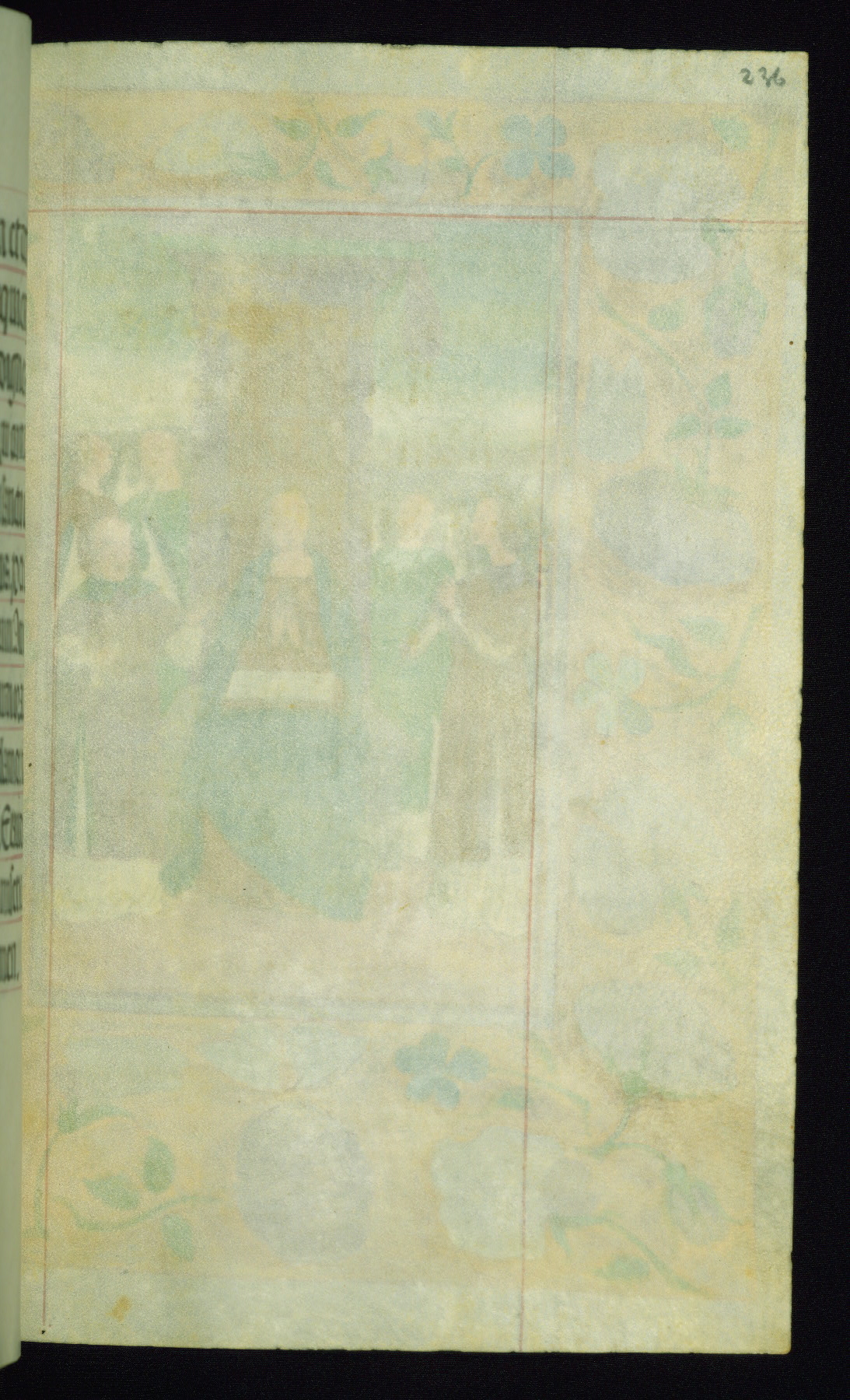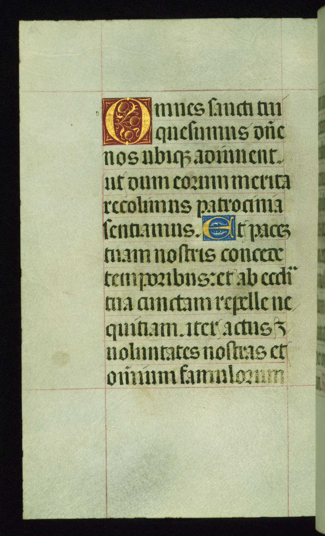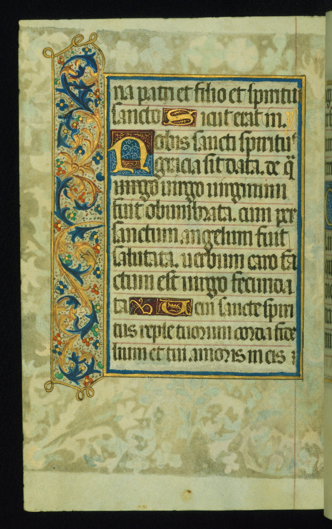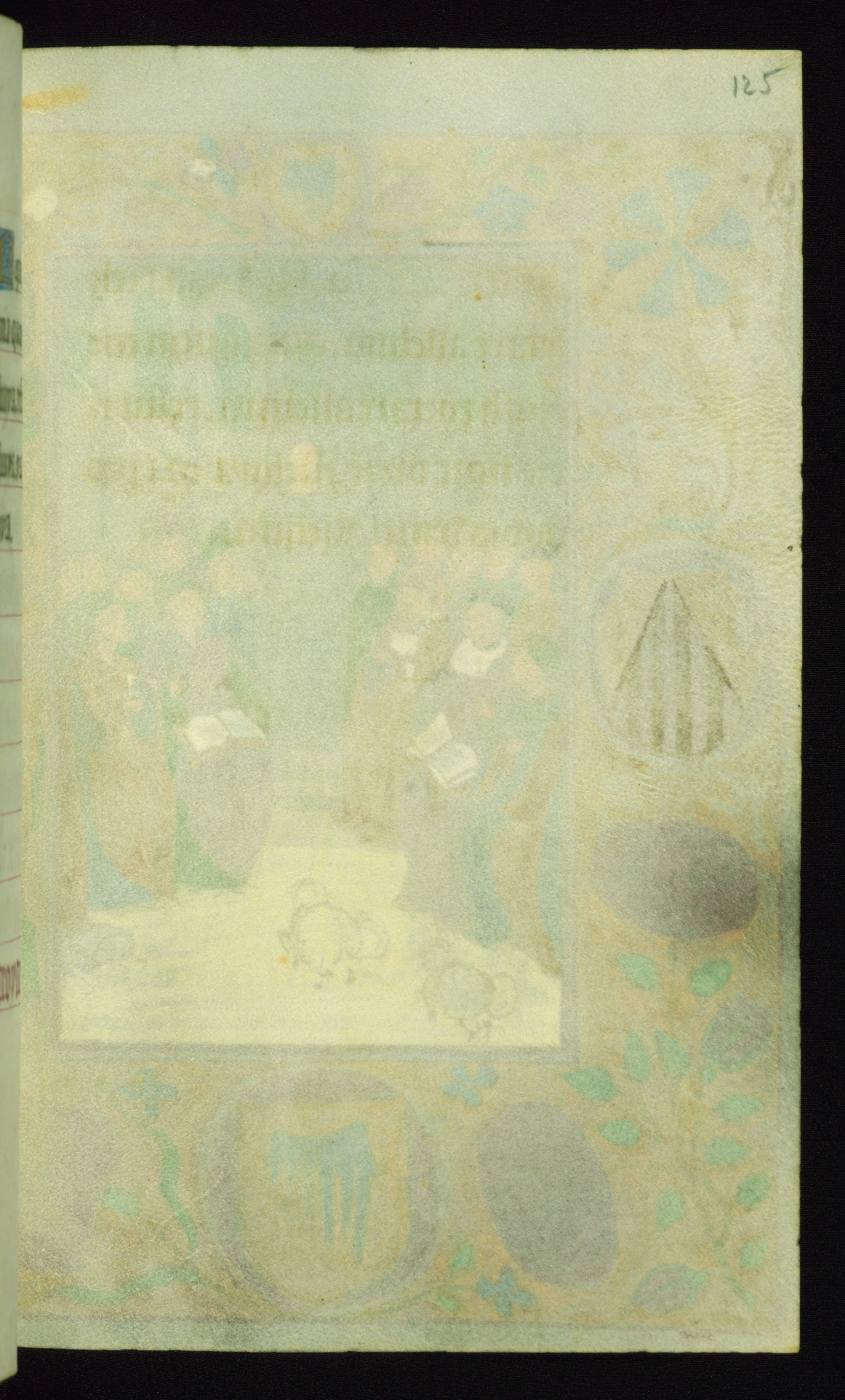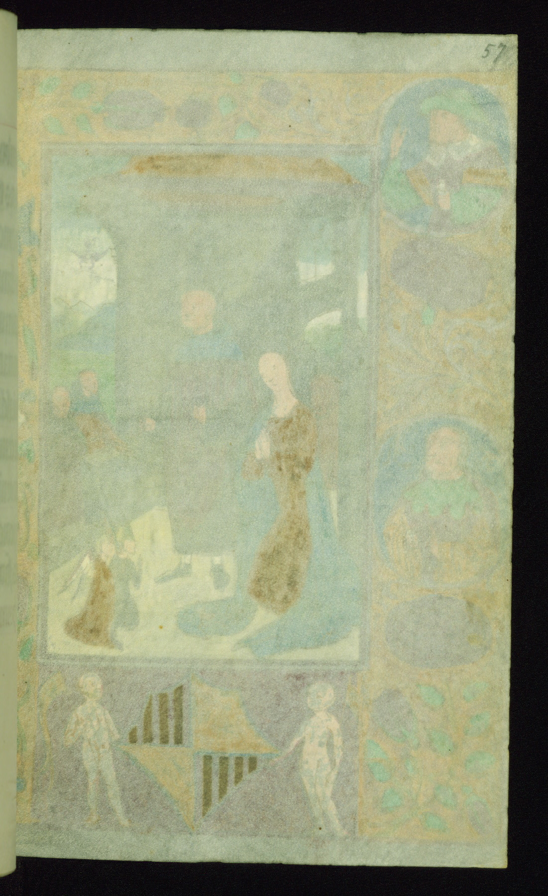 This book of hours was produced ca. 1510-1520 for a member of the Catalonian Almugavar (or AlmogĂ ver) family, whose coat of arms appears throughout the manuscript in the borders of the lavish full-page miniatures. There are twenty-six full-page polychrome miniatures (three are missing), of which six were removed from the original quire structure after portions of the miniatures were excised, and then returned to the manuscript, having been pasted onto heavy card-stock folios. There are also eighteen full-page incipits, of which three include historiated vignettes, and numerous folios with elaborate floral motif borders. A significant number of feast days associated with Barcelona help reinforce the Spanish attribution of the manuscript, although the style of the decoration is clearly influenced by contemporary Flemish design.