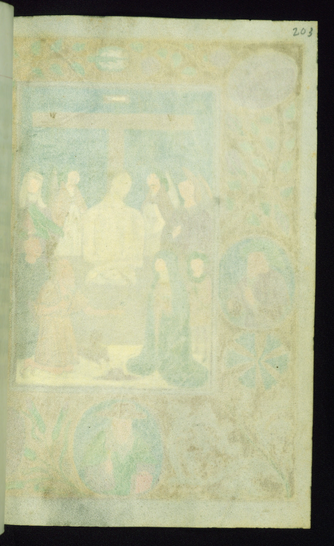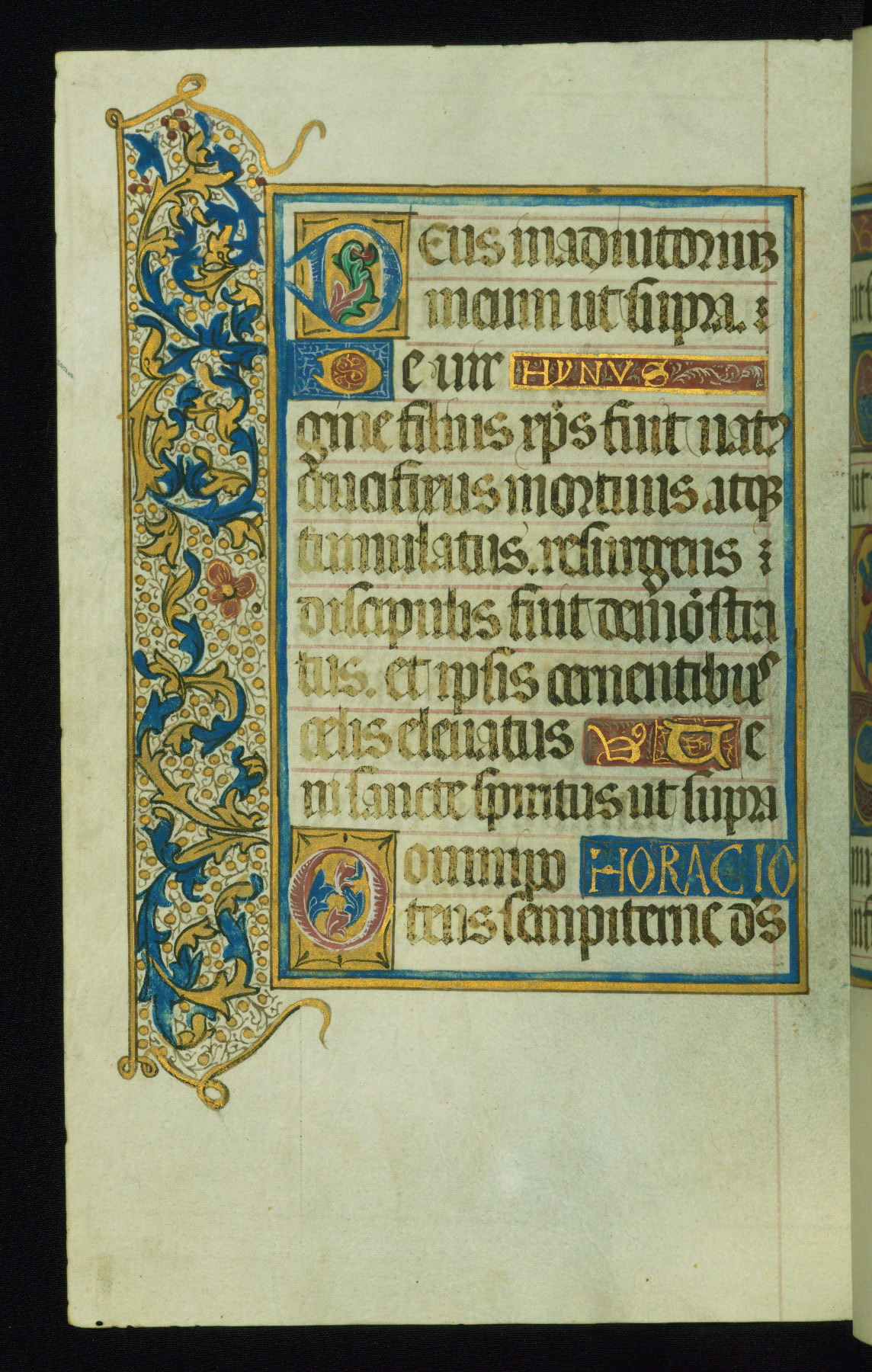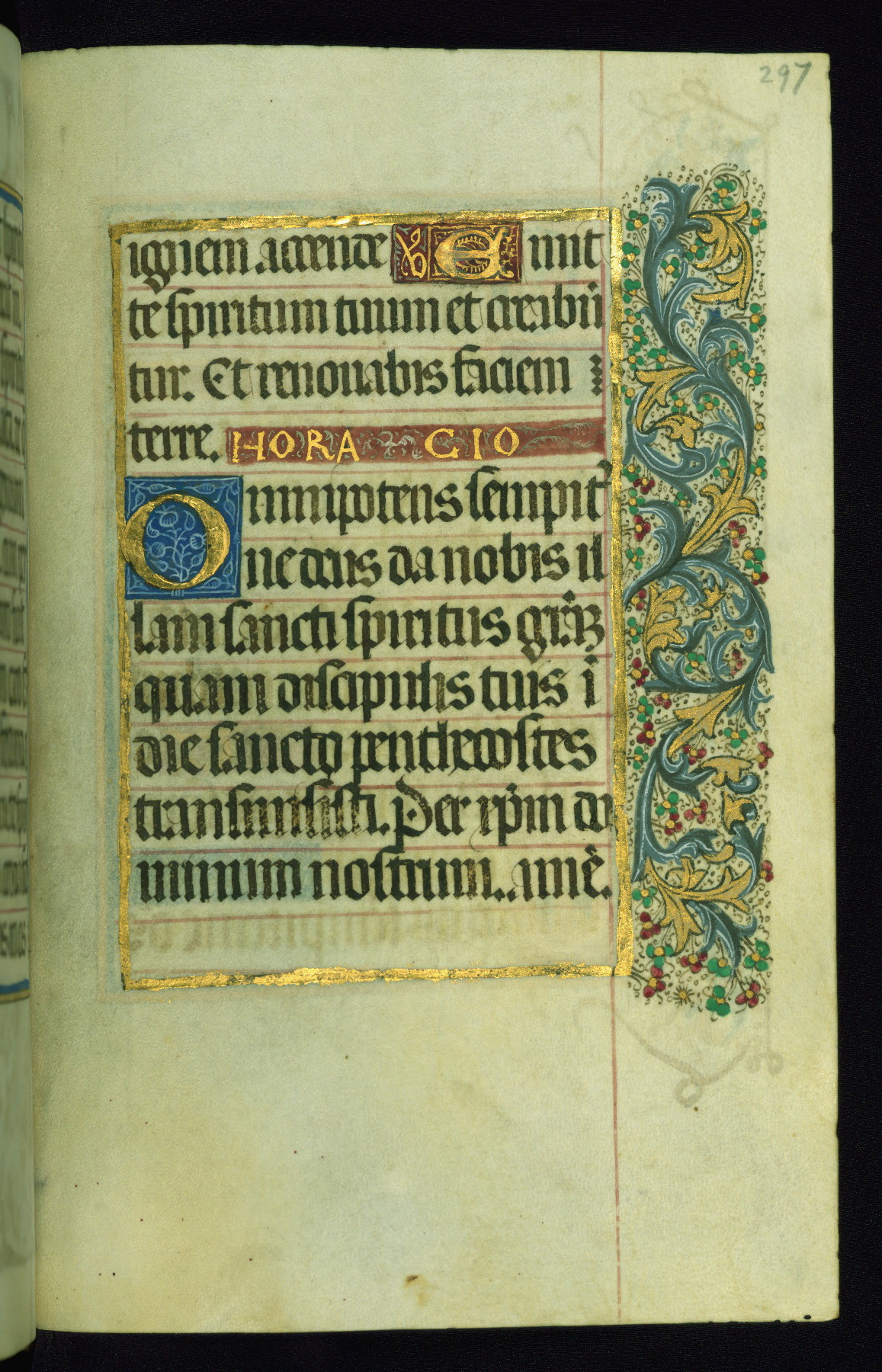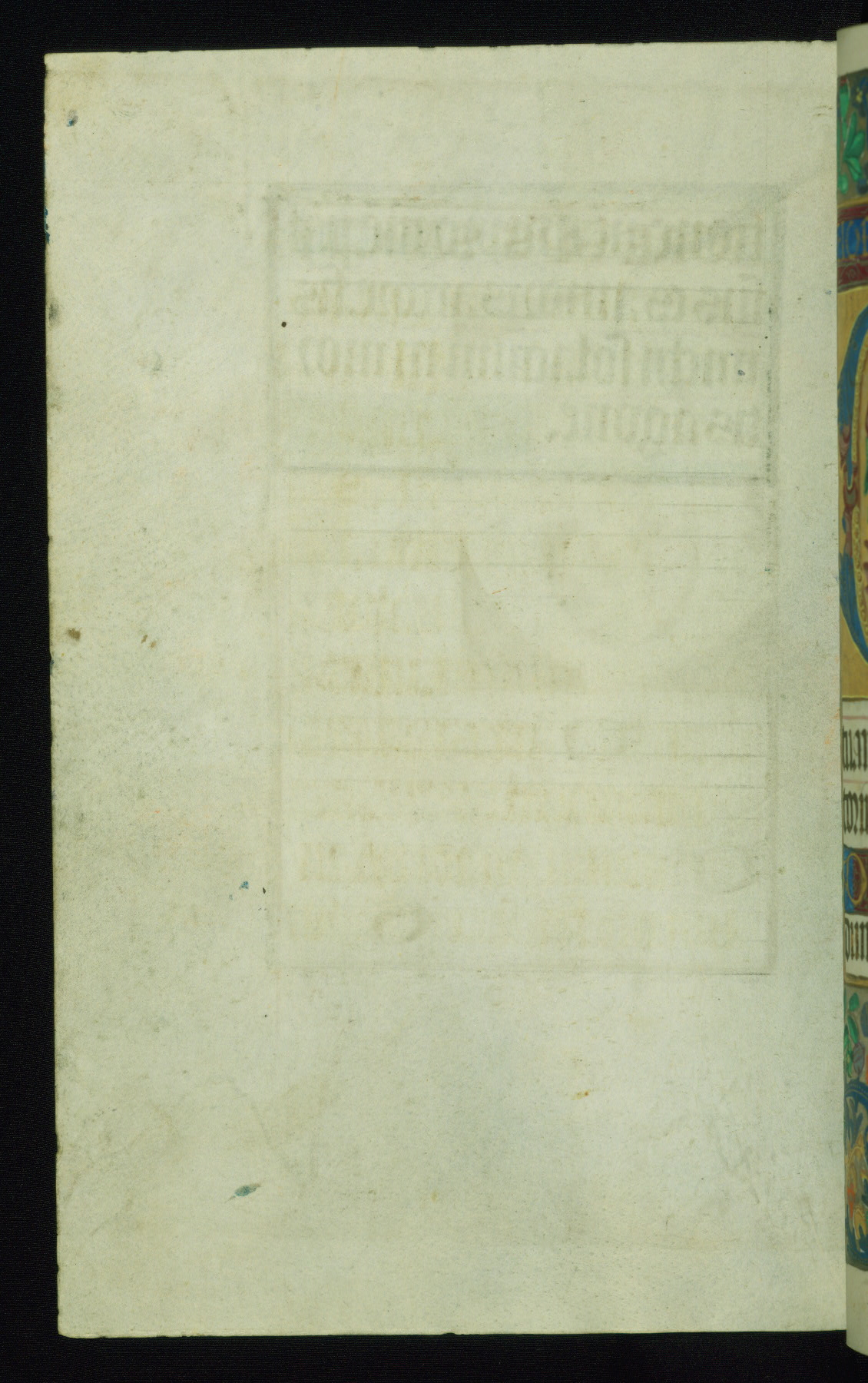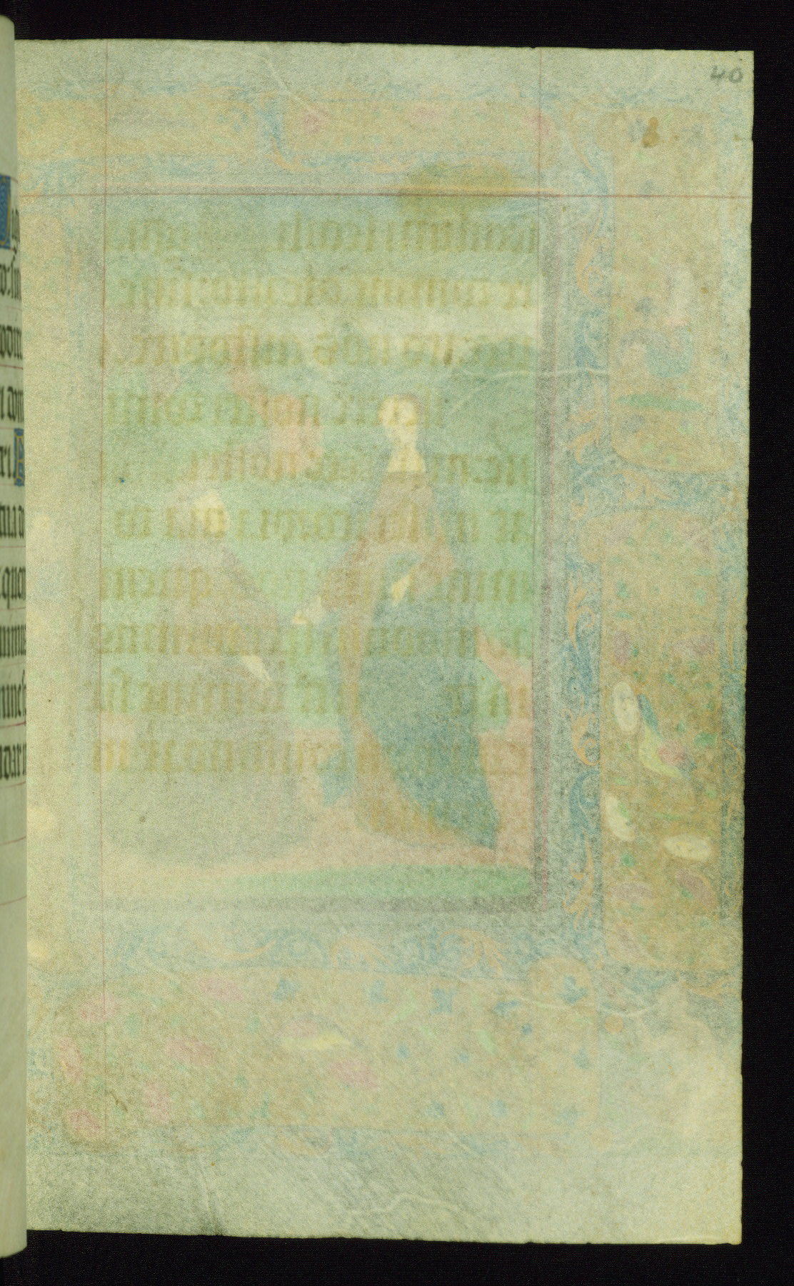 This book of hours was produced ca. 1510-1520 for a member of the Catalonian Almugavar (or AlmogĂ ver) family, whose coat of arms appears throughout the manuscript in the borders of the lavish full-page miniatures. There are twenty-six full-page polychrome miniatures (three are missing), of which six were removed from the original quire structure after portions of the miniatures were excised, and then returned to the manuscript, having been pasted onto heavy card-stock folios. There are also eighteen full-page incipits, of which three include historiated vignettes, and numerous folios with elaborate floral motif borders. A significant number of feast days associated with Barcelona help reinforce the Spanish attribution of the manuscript, although the style of the decoration is clearly influenced by contemporary Flemish design.
