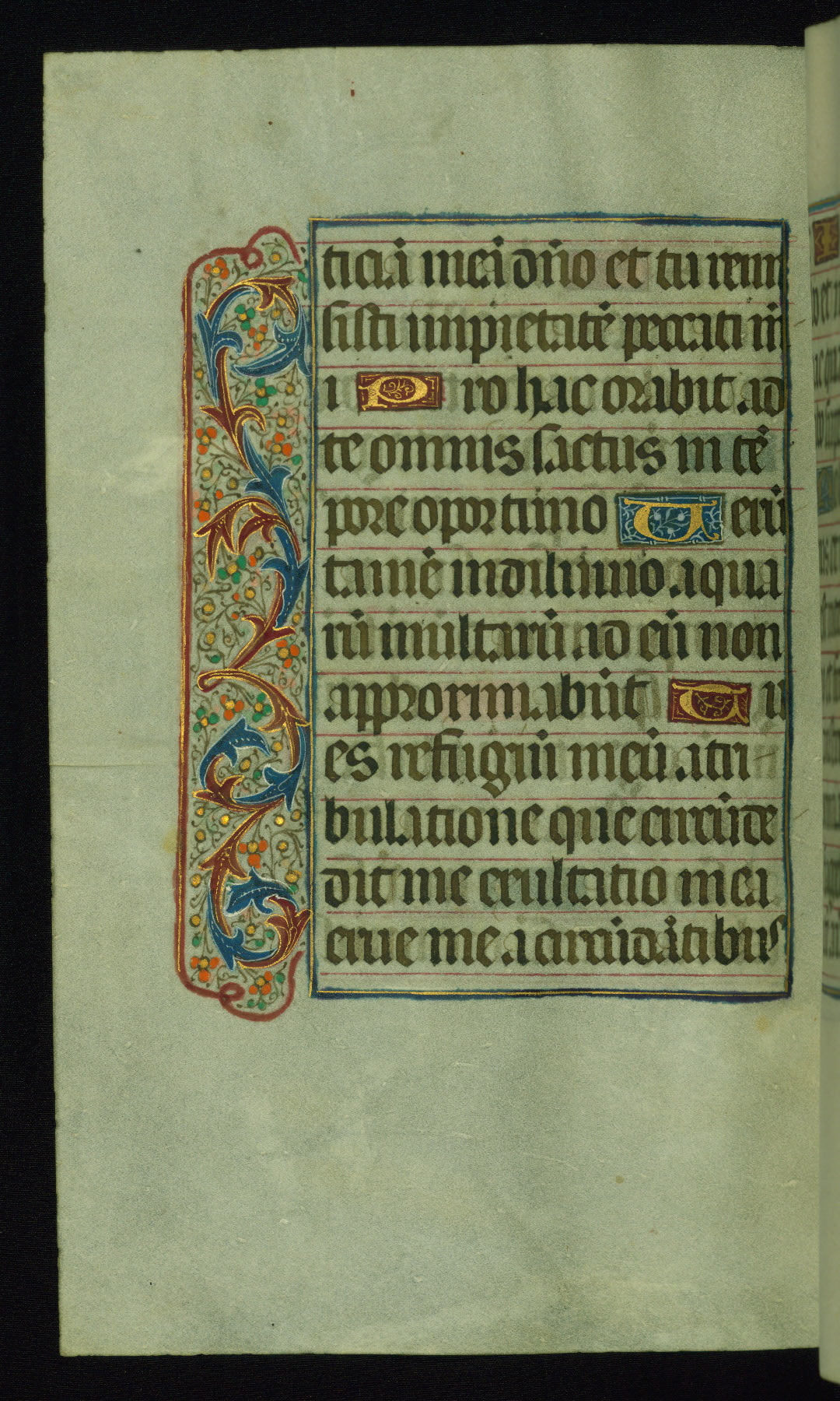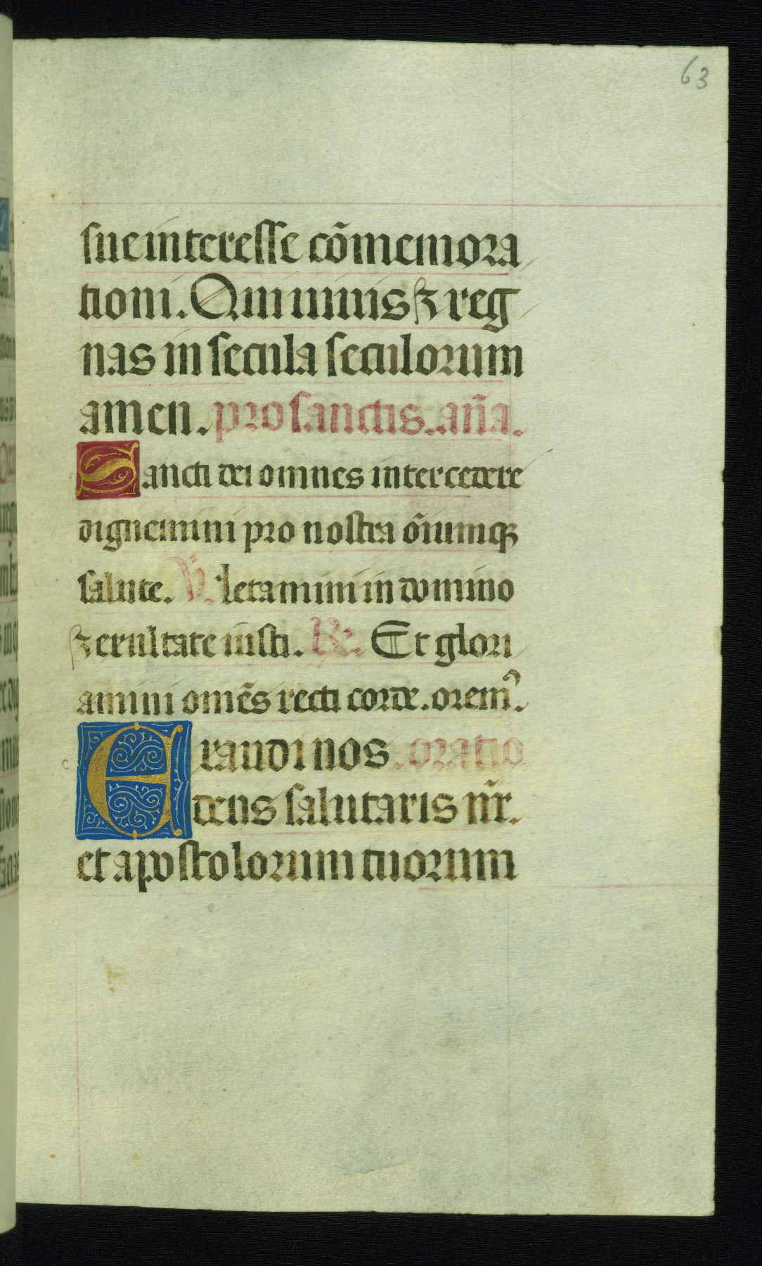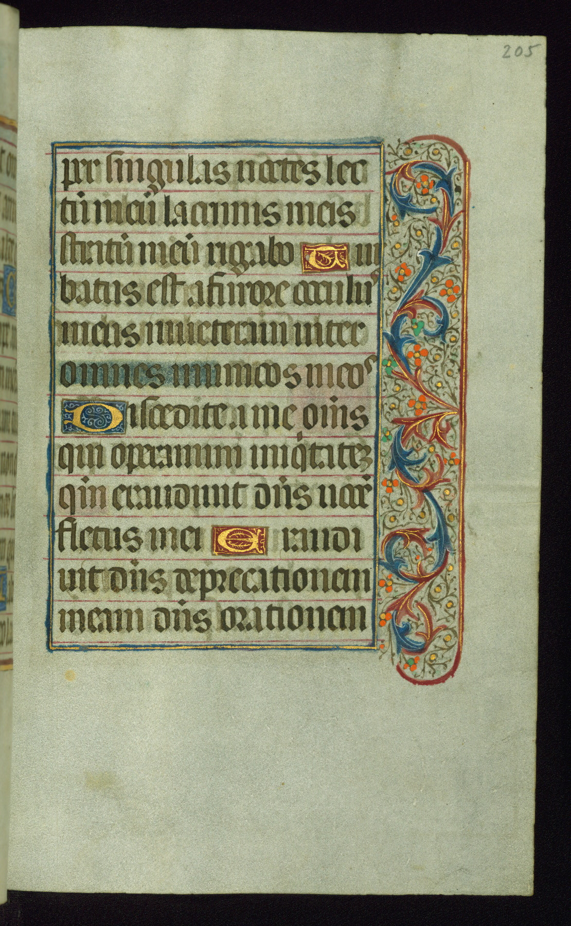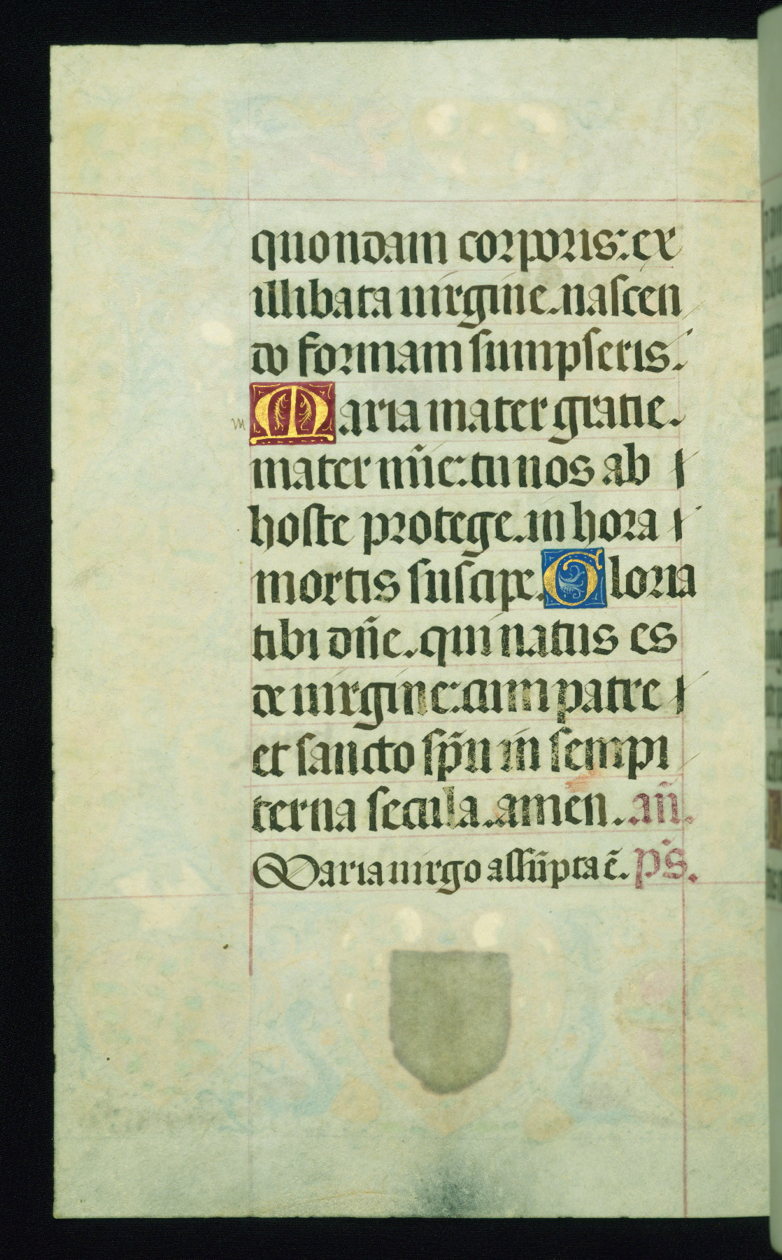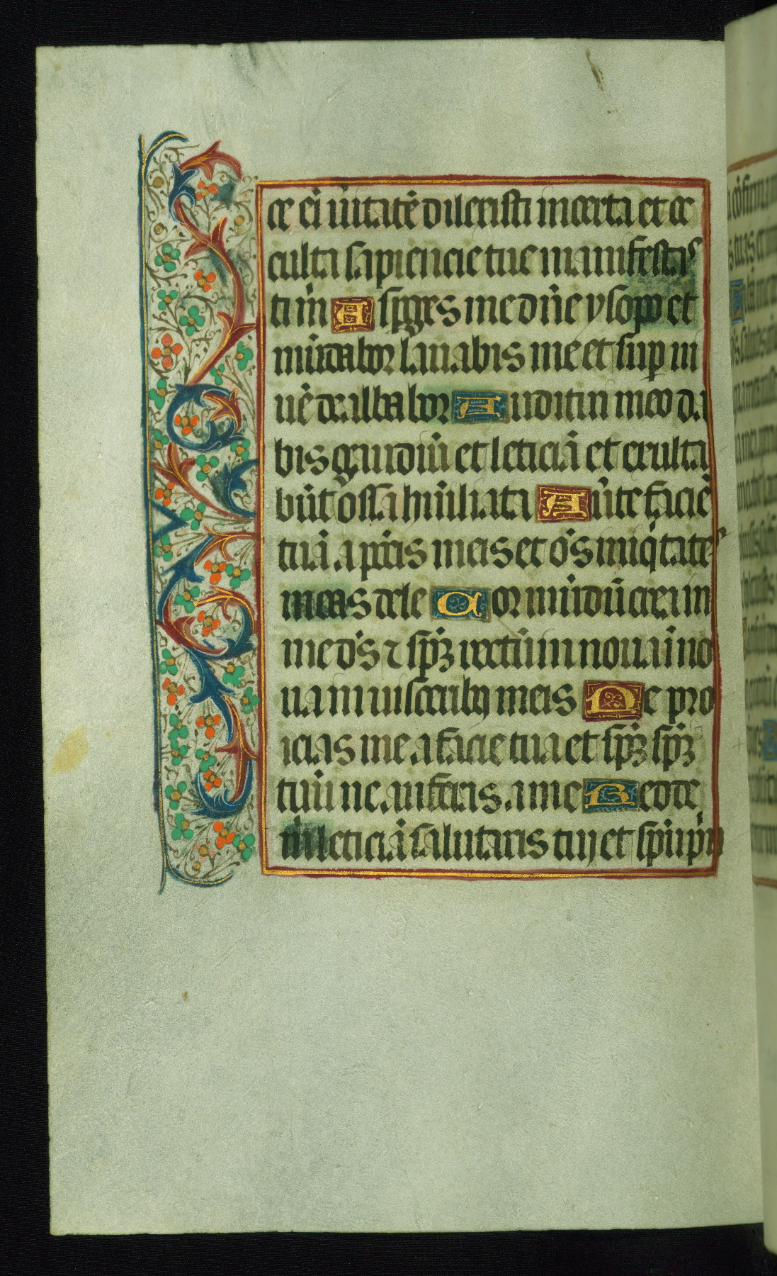 This book of hours was produced ca. 1510-1520 for a member of the Catalonian Almugavar (or AlmogĂ ver) family, whose coat of arms appears throughout the manuscript in the borders of the lavish full-page miniatures. There are twenty-six full-page polychrome miniatures (three are missing), of which six were removed from the original quire structure after portions of the miniatures were excised, and then returned to the manuscript, having been pasted onto heavy card-stock folios. There are also eighteen full-page incipits, of which three include historiated vignettes, and numerous folios with elaborate floral motif borders. A significant number of feast days associated with Barcelona help reinforce the Spanish attribution of the manuscript, although the style of the decoration is clearly influenced by contemporary Flemish design.