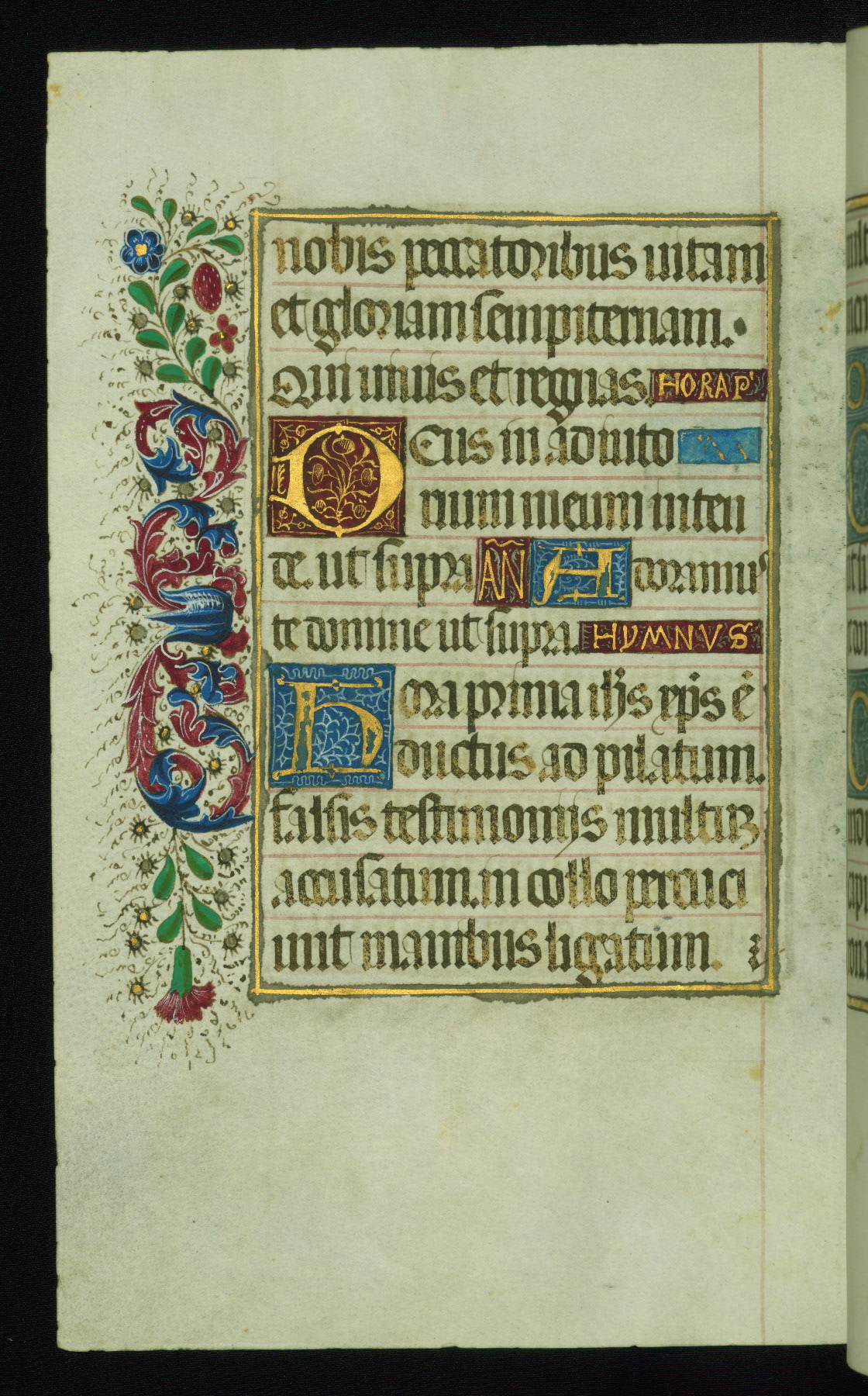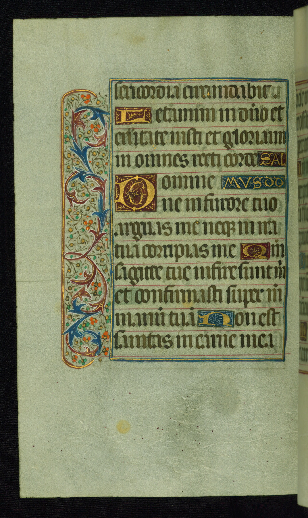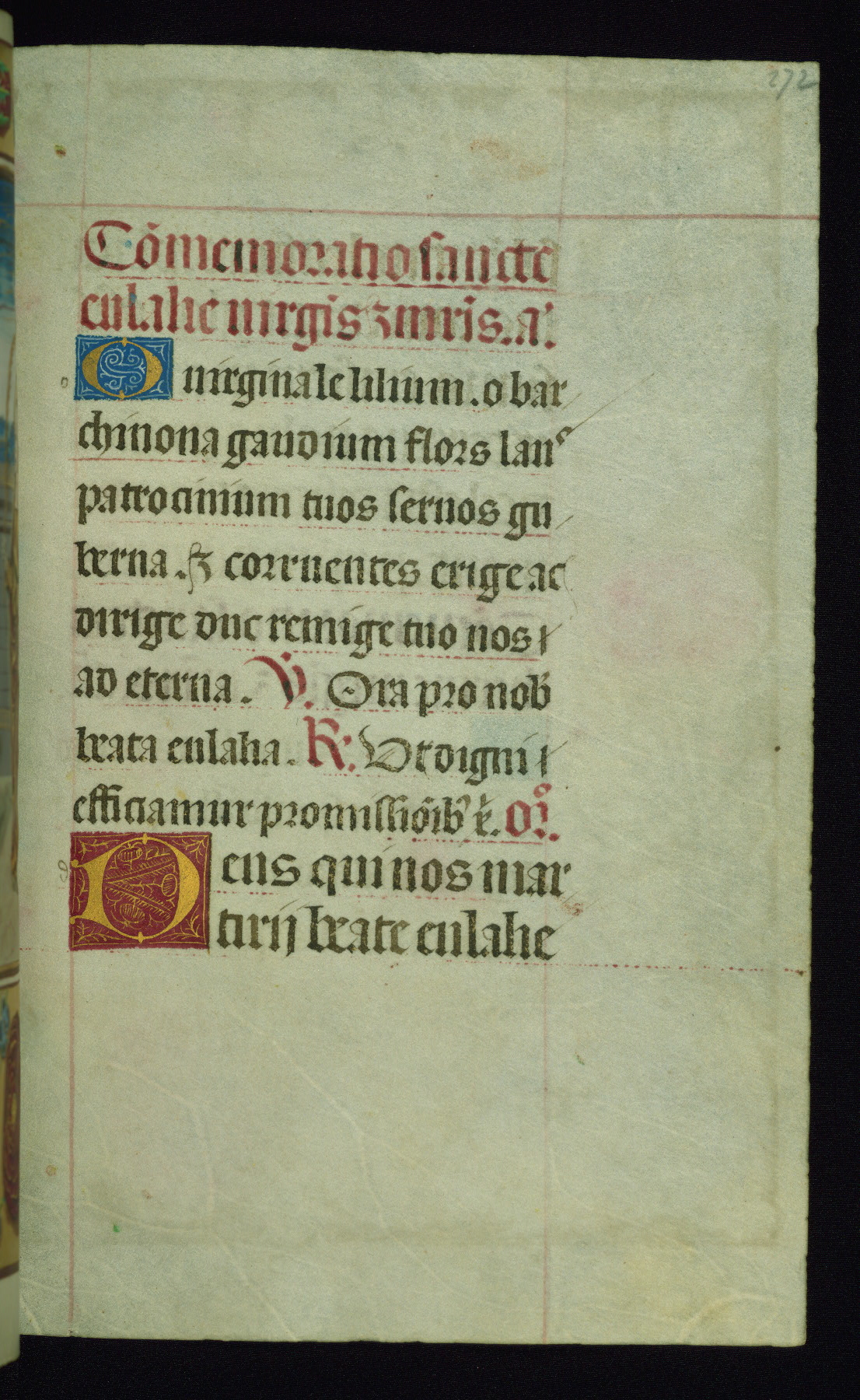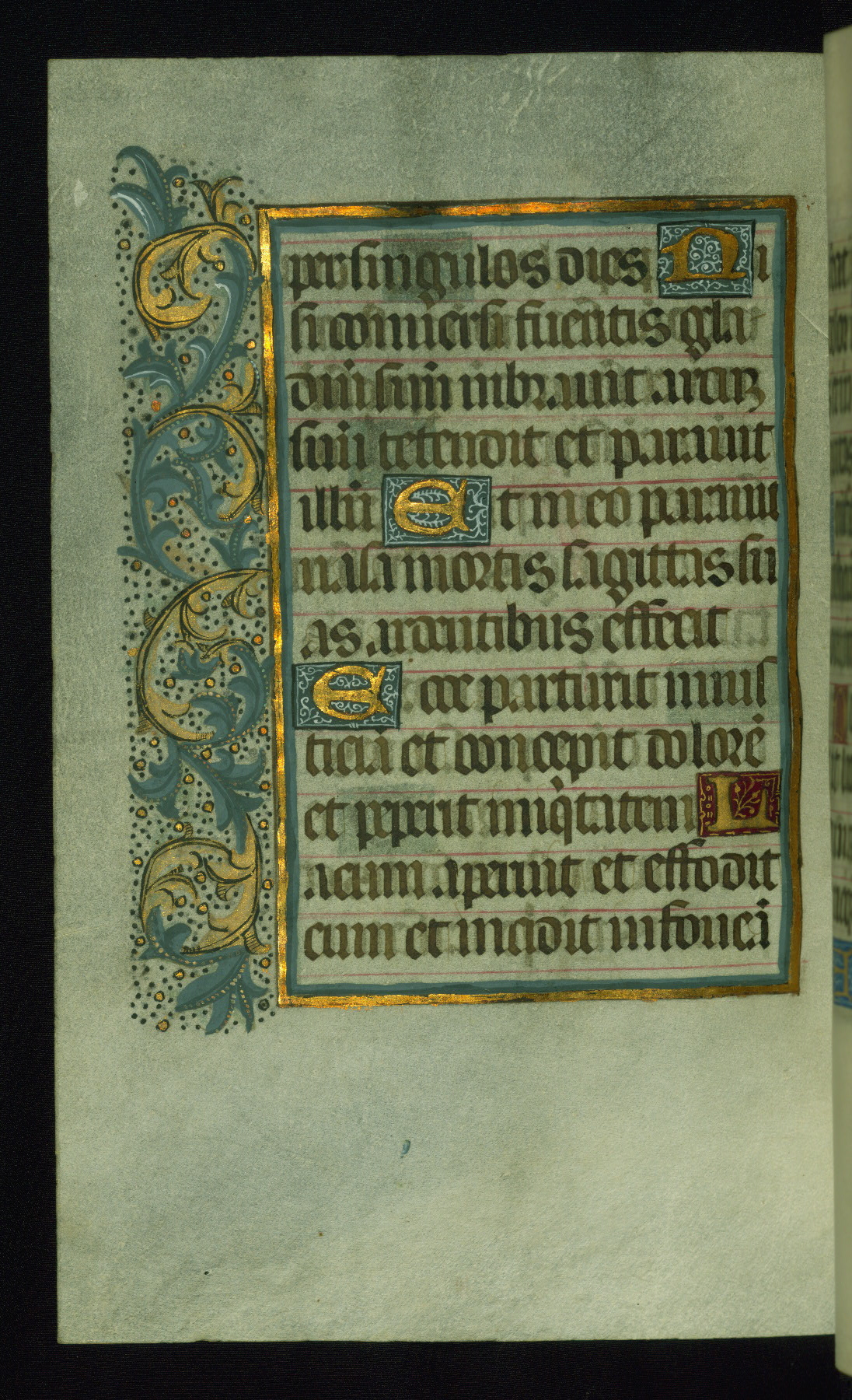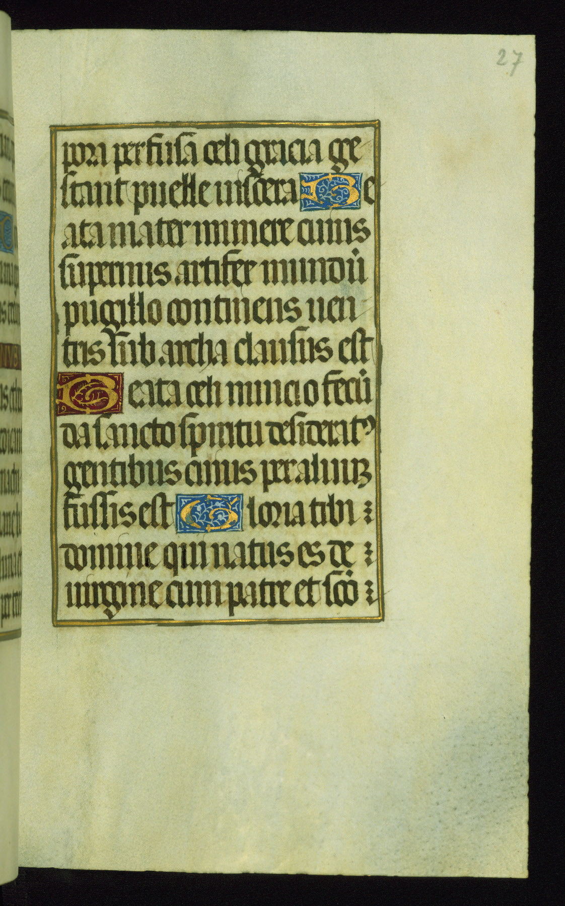 This book of hours was produced ca. 1510-1520 for a member of the Catalonian Almugavar (or AlmogĂ ver) family, whose coat of arms appears throughout the manuscript in the borders of the lavish full-page miniatures. There are twenty-six full-page polychrome miniatures (three are missing), of which six were removed from the original quire structure after portions of the miniatures were excised, and then returned to the manuscript, having been pasted onto heavy card-stock folios. There are also eighteen full-page incipits, of which three include historiated vignettes, and numerous folios with elaborate floral motif borders. A significant number of feast days associated with Barcelona help reinforce the Spanish attribution of the manuscript, although the style of the decoration is clearly influenced by contemporary Flemish design.