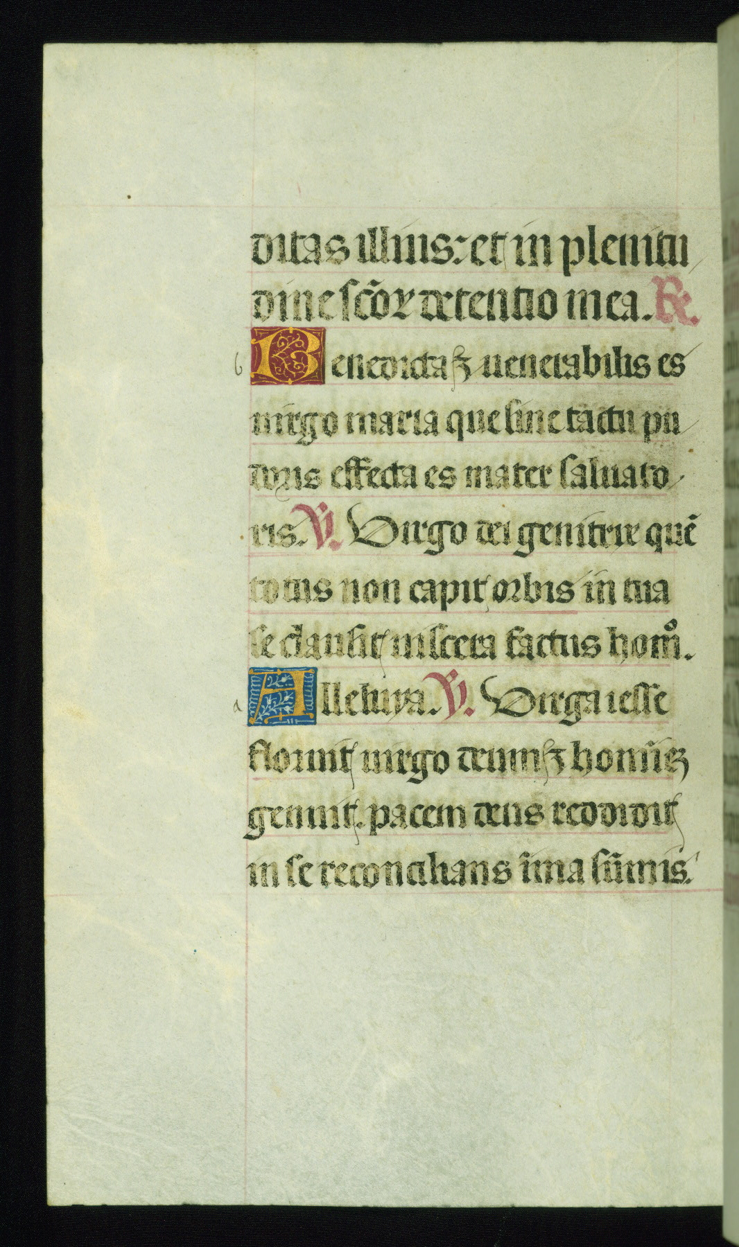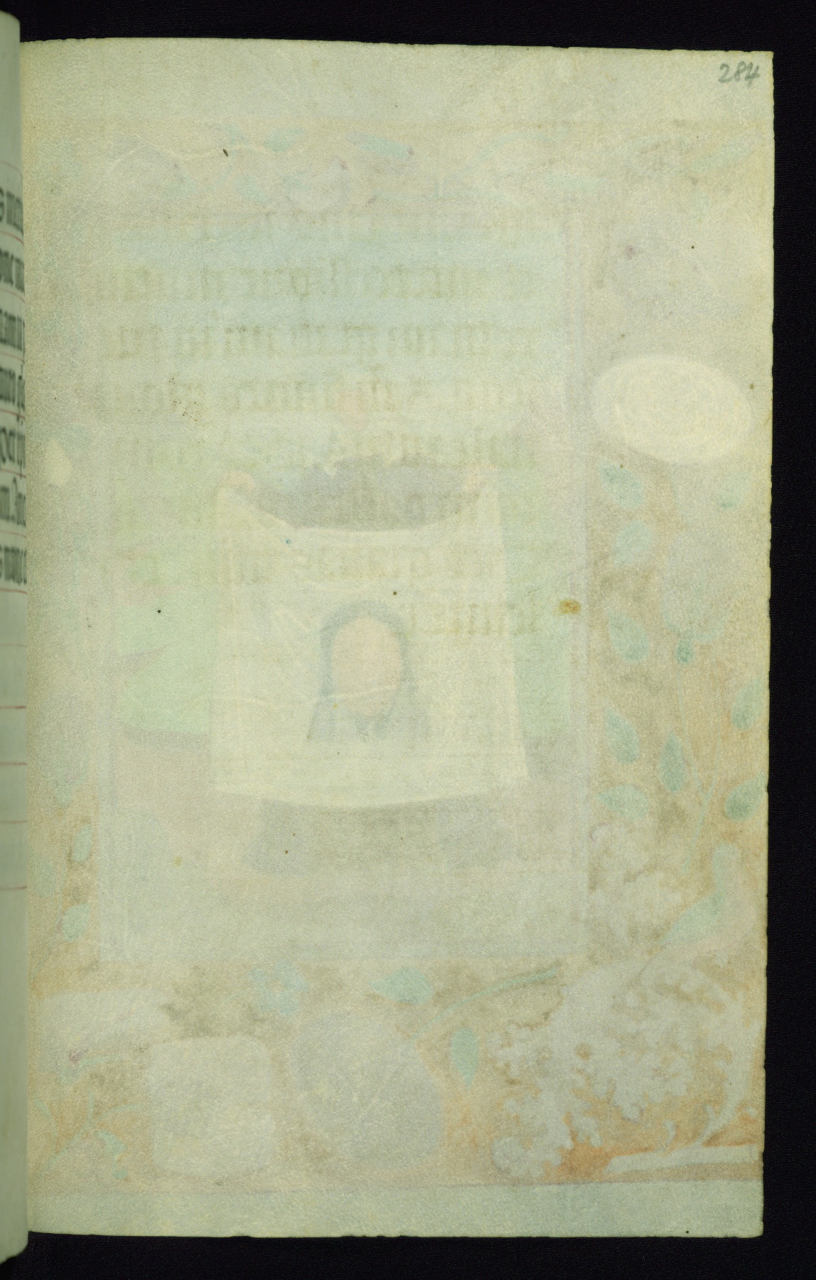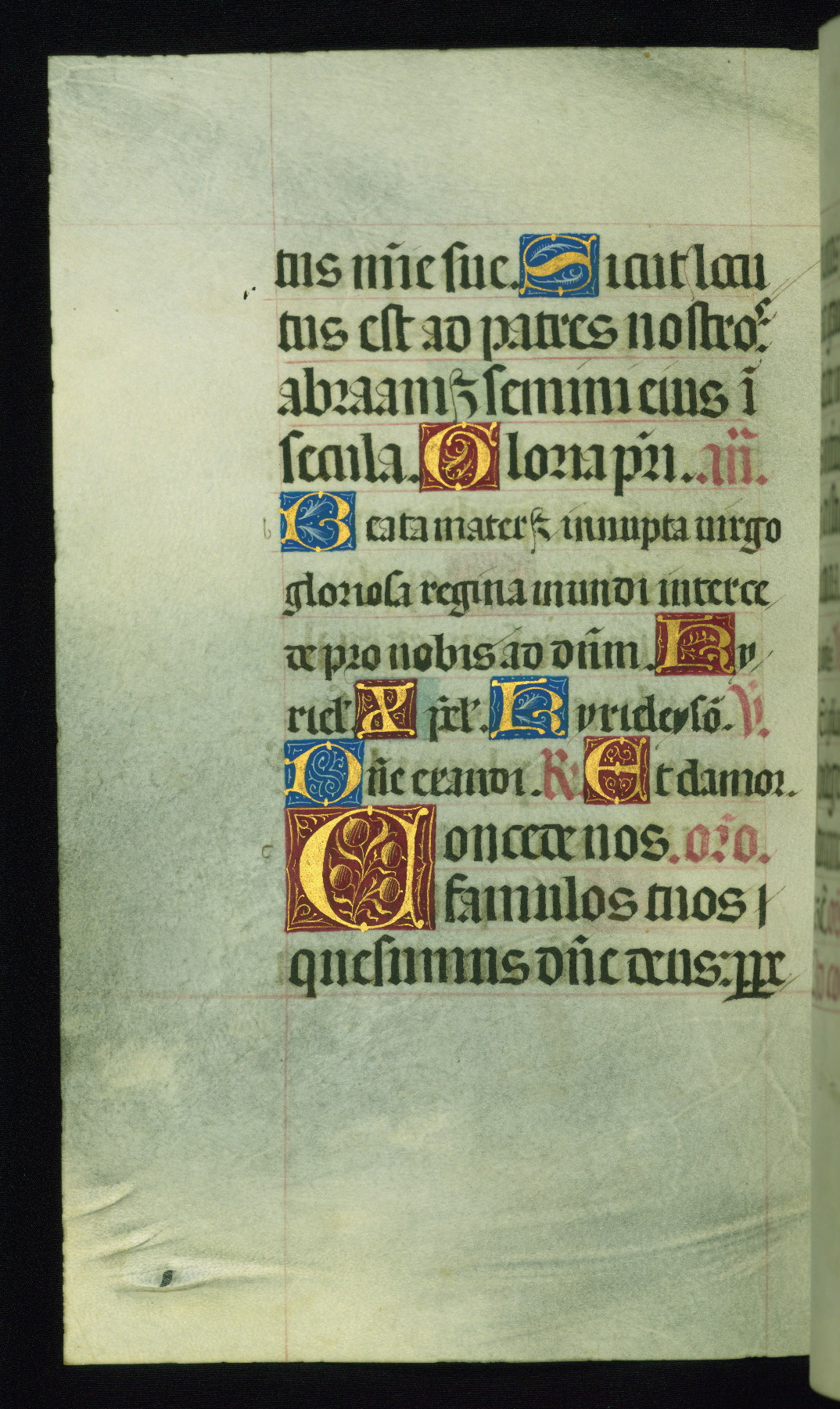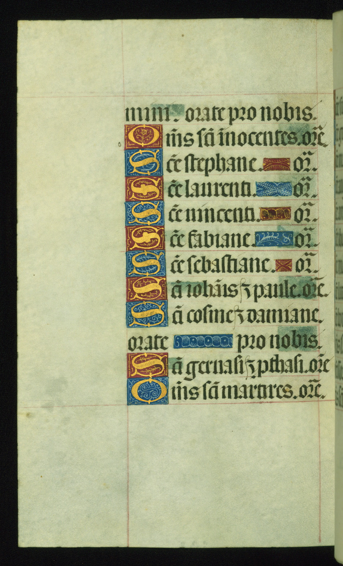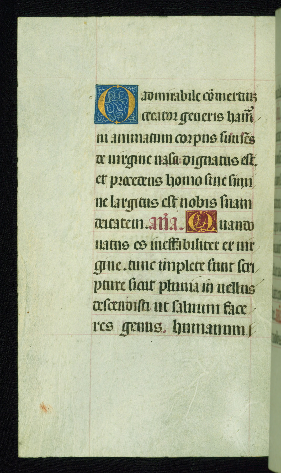 This book of hours was produced ca. 1510-1520 for a member of the Catalonian Almugavar (or AlmogĂ ver) family, whose coat of arms appears throughout the manuscript in the borders of the lavish full-page miniatures. There are twenty-six full-page polychrome miniatures (three are missing), of which six were removed from the original quire structure after portions of the miniatures were excised, and then returned to the manuscript, having been pasted onto heavy card-stock folios. There are also eighteen full-page incipits, of which three include historiated vignettes, and numerous folios with elaborate floral motif borders. A significant number of feast days associated with Barcelona help reinforce the Spanish attribution of the manuscript, although the style of the decoration is clearly influenced by contemporary Flemish design.