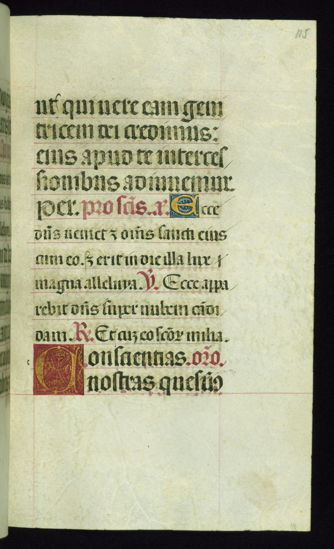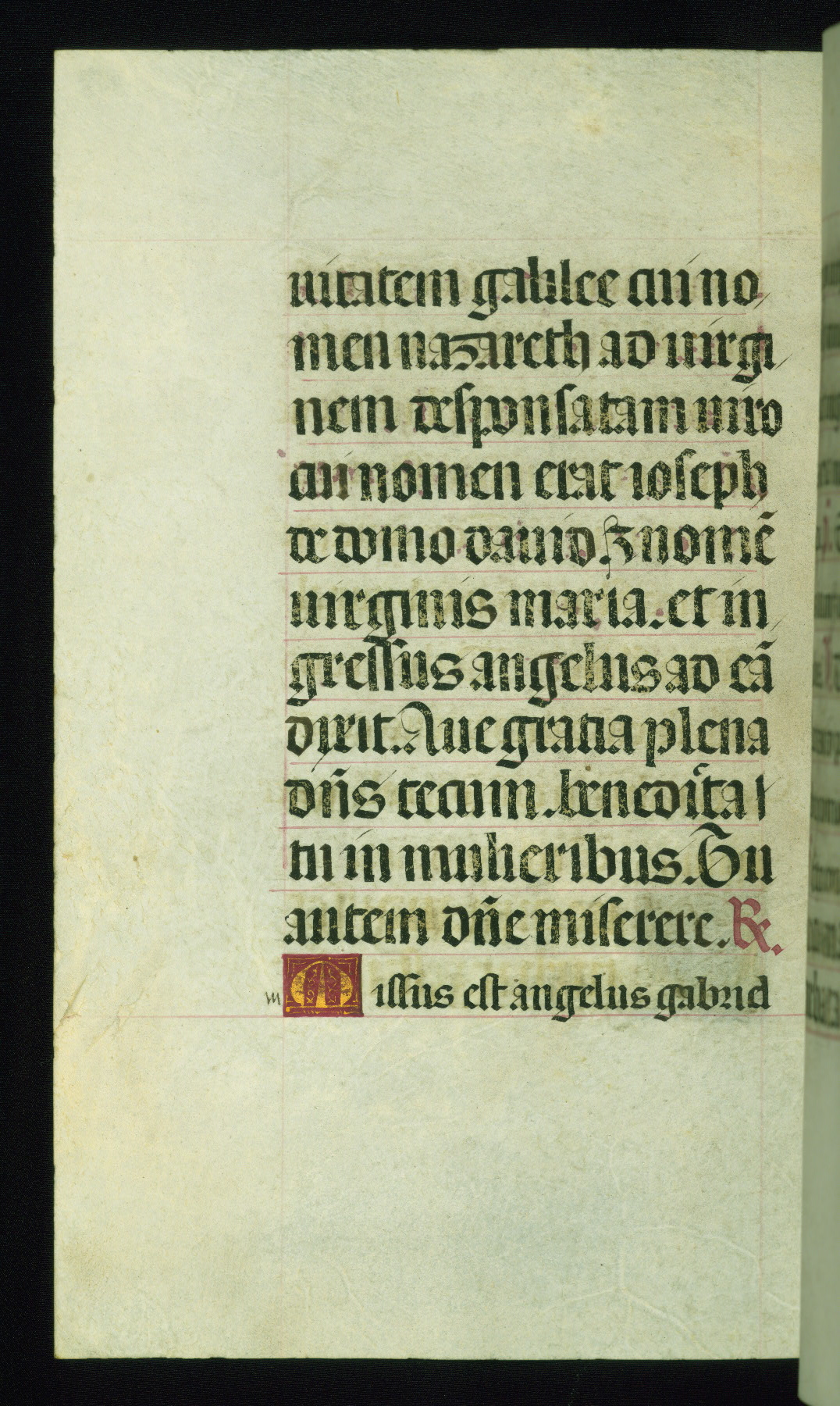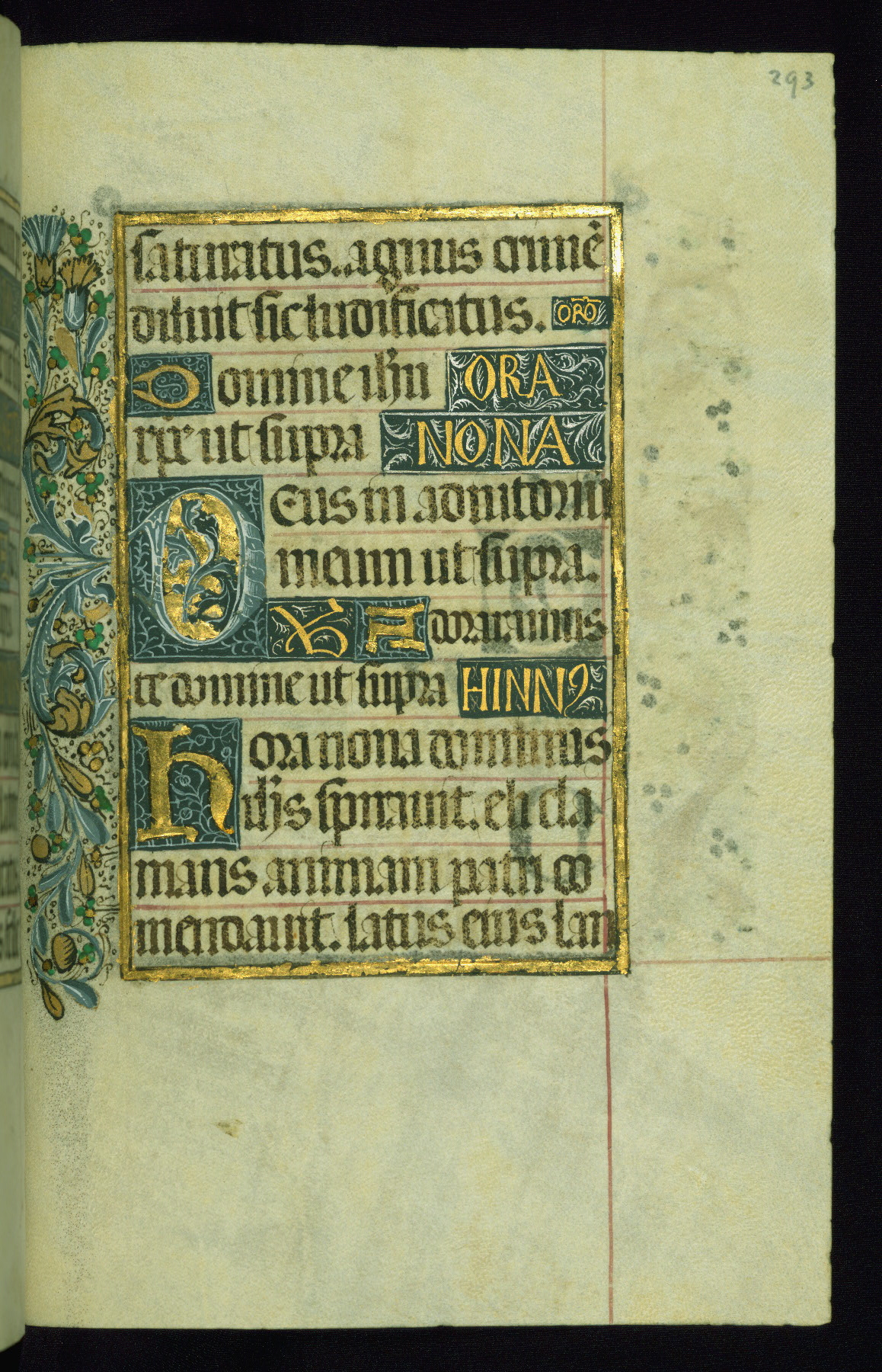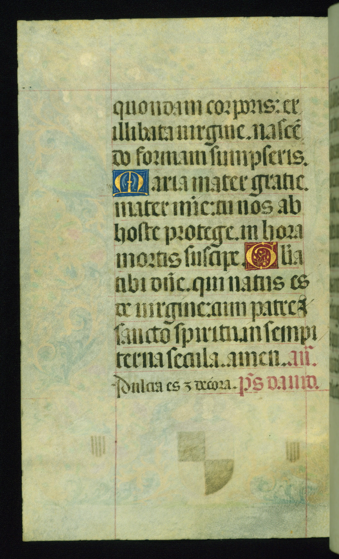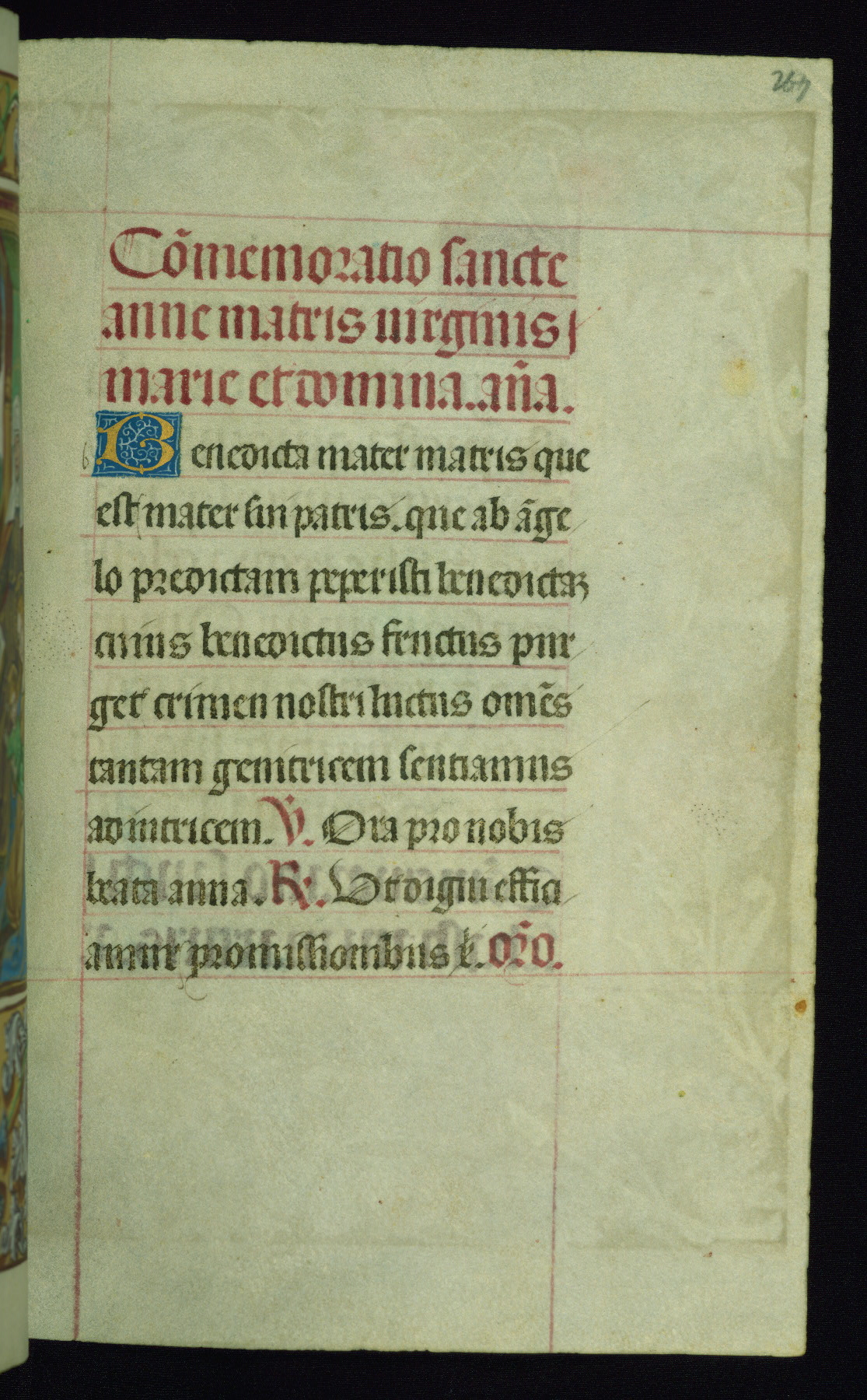 This book of hours was produced ca. 1510-1520 for a member of the Catalonian Almugavar (or AlmogĂ ver) family, whose coat of arms appears throughout the manuscript in the borders of the lavish full-page miniatures. There are twenty-six full-page polychrome miniatures (three are missing), of which six were removed from the original quire structure after portions of the miniatures were excised, and then returned to the manuscript, having been pasted onto heavy card-stock folios. There are also eighteen full-page incipits, of which three include historiated vignettes, and numerous folios with elaborate floral motif borders. A significant number of feast days associated with Barcelona help reinforce the Spanish attribution of the manuscript, although the style of the decoration is clearly influenced by contemporary Flemish design.