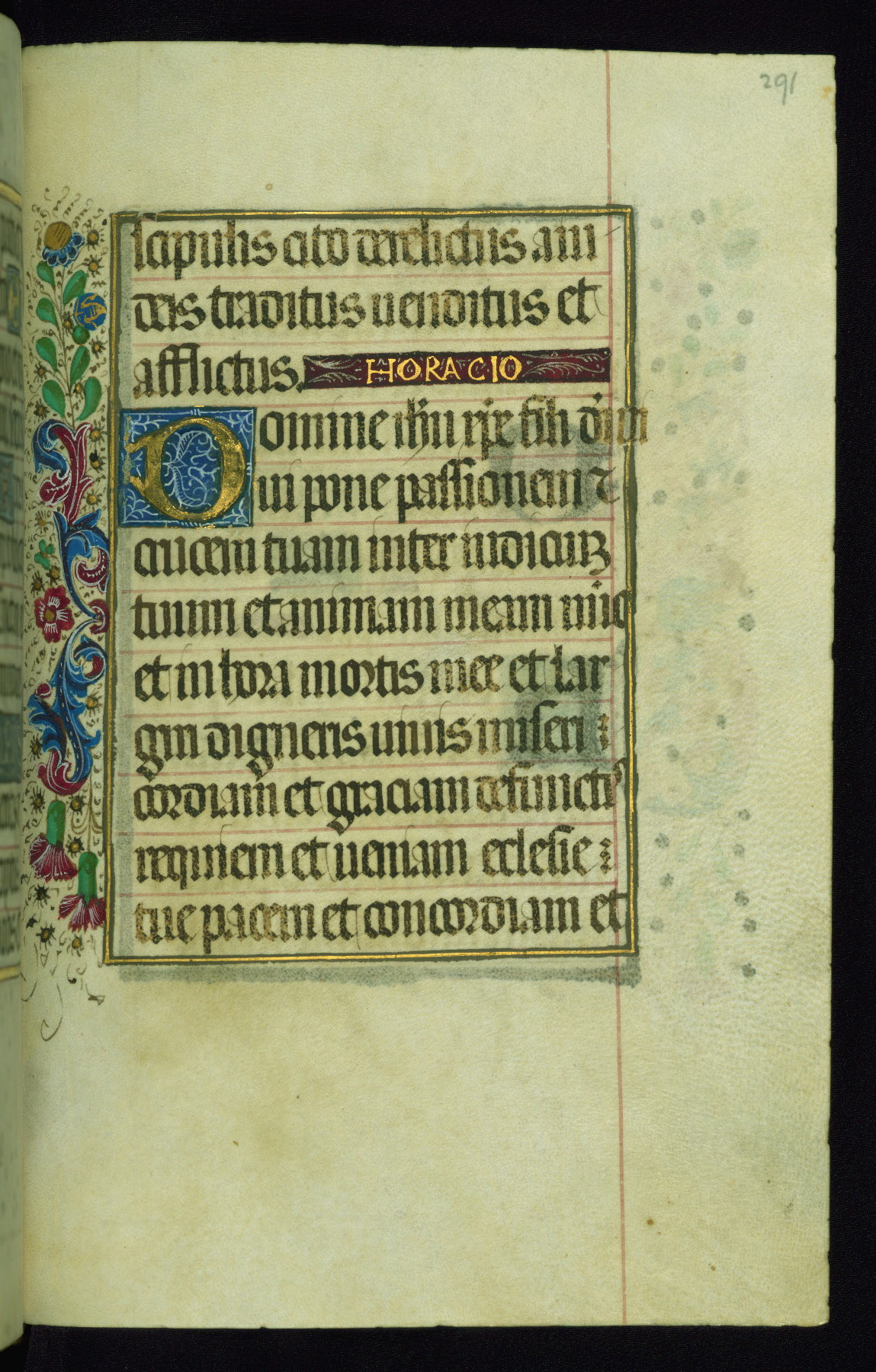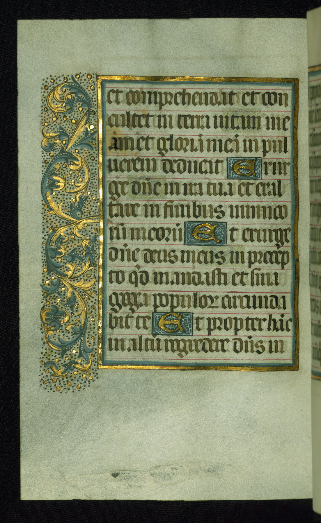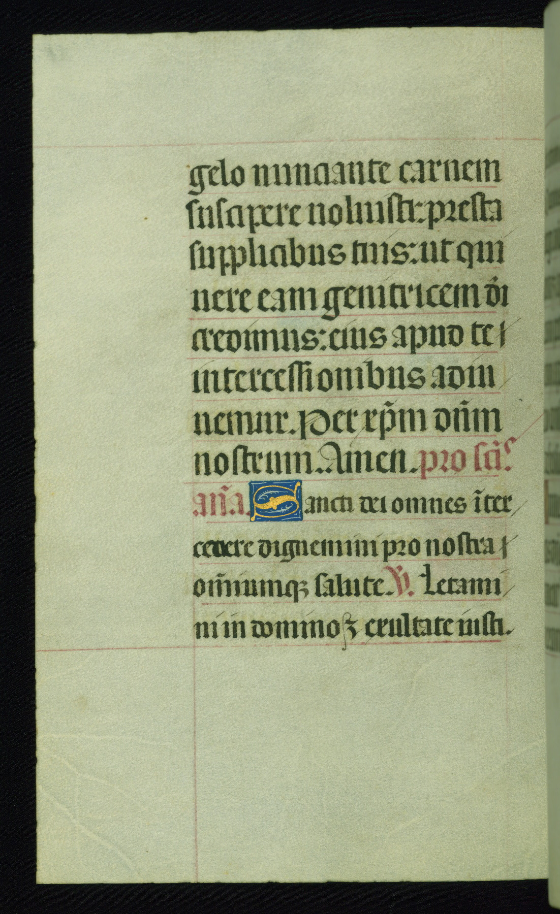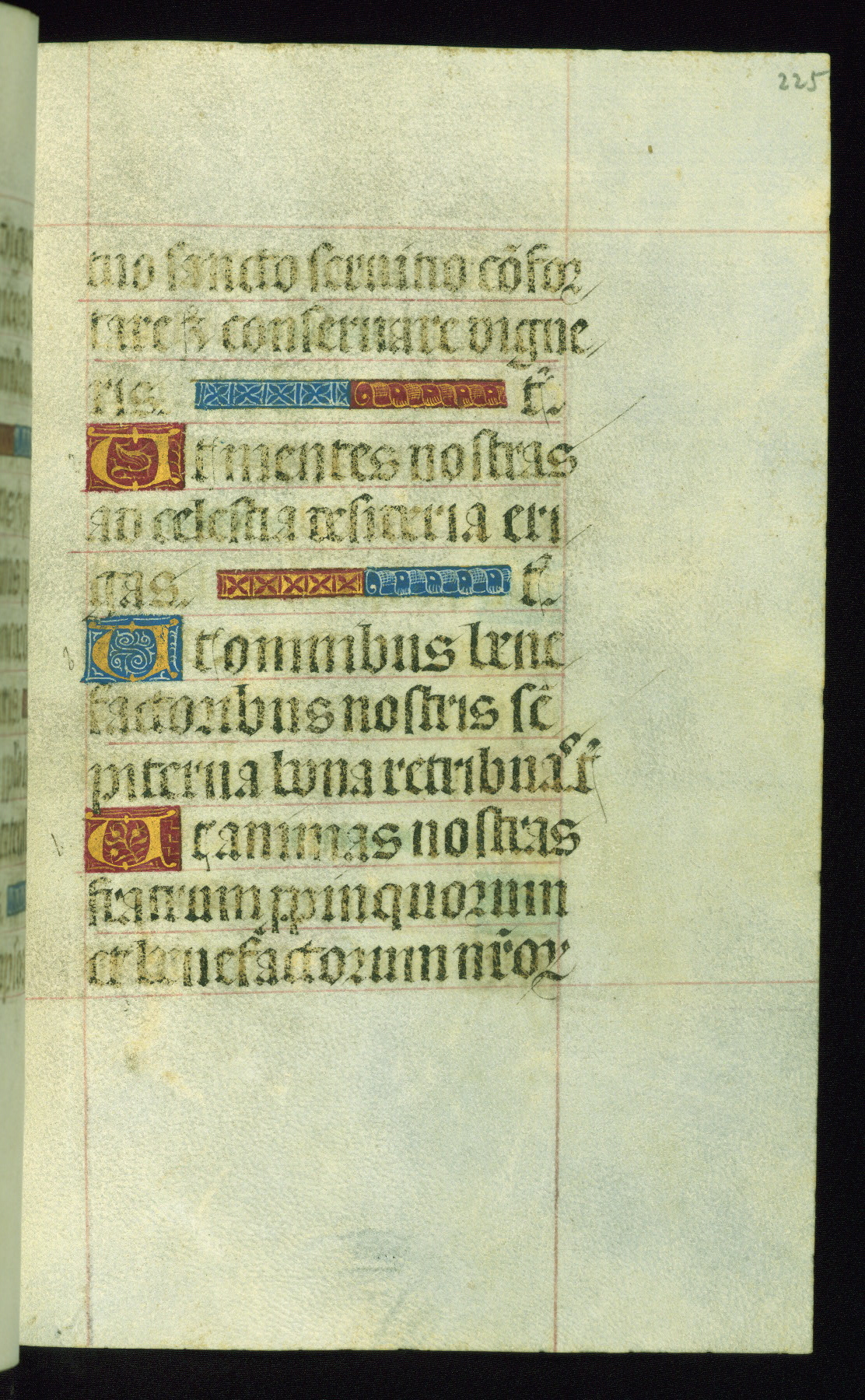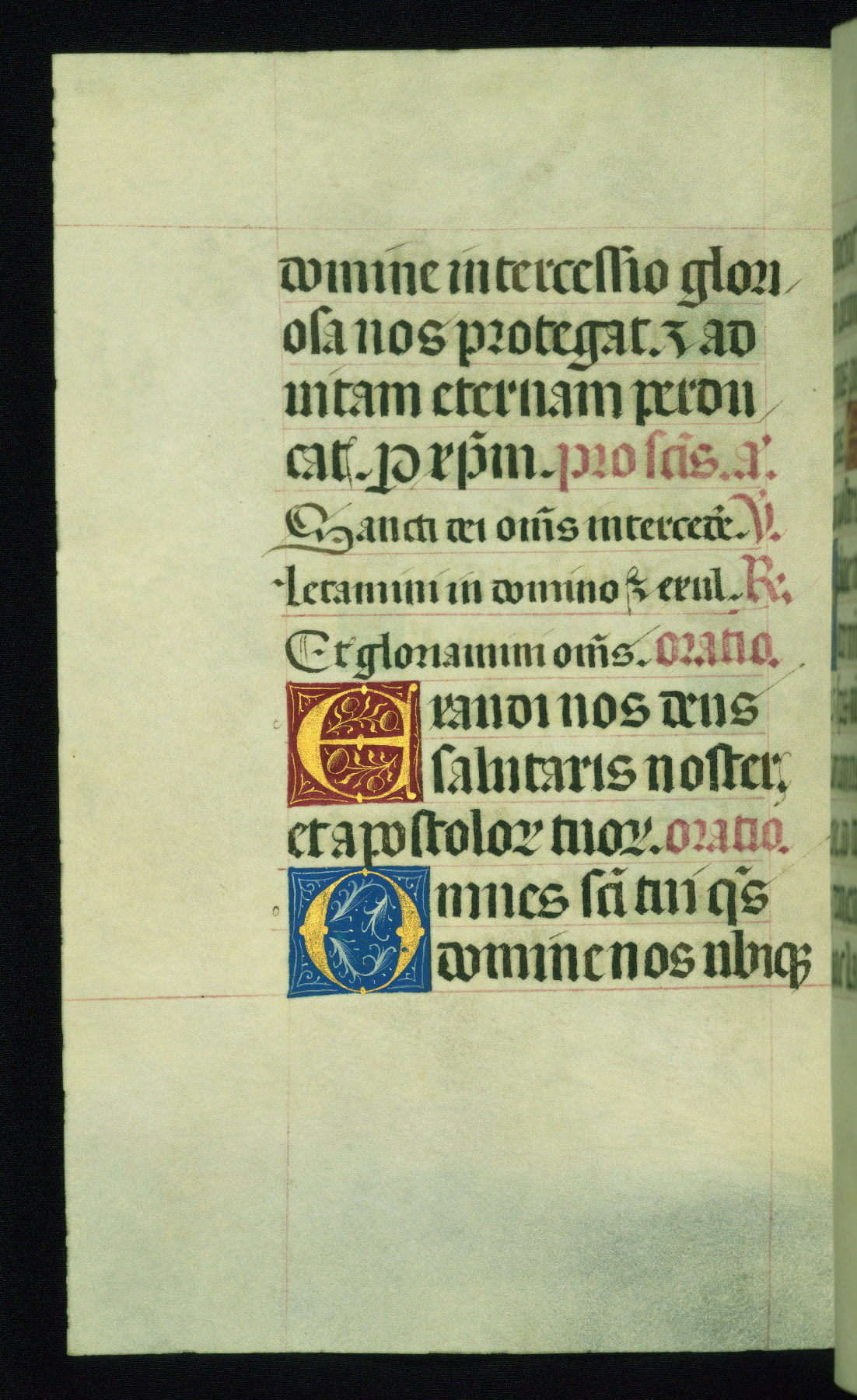 This book of hours was produced ca. 1510-1520 for a member of the Catalonian Almugavar (or AlmogĂ ver) family, whose coat of arms appears throughout the manuscript in the borders of the lavish full-page miniatures. There are twenty-six full-page polychrome miniatures (three are missing), of which six were removed from the original quire structure after portions of the miniatures were excised, and then returned to the manuscript, having been pasted onto heavy card-stock folios. There are also eighteen full-page incipits, of which three include historiated vignettes, and numerous folios with elaborate floral motif borders. A significant number of feast days associated with Barcelona help reinforce the Spanish attribution of the manuscript, although the style of the decoration is clearly influenced by contemporary Flemish design.