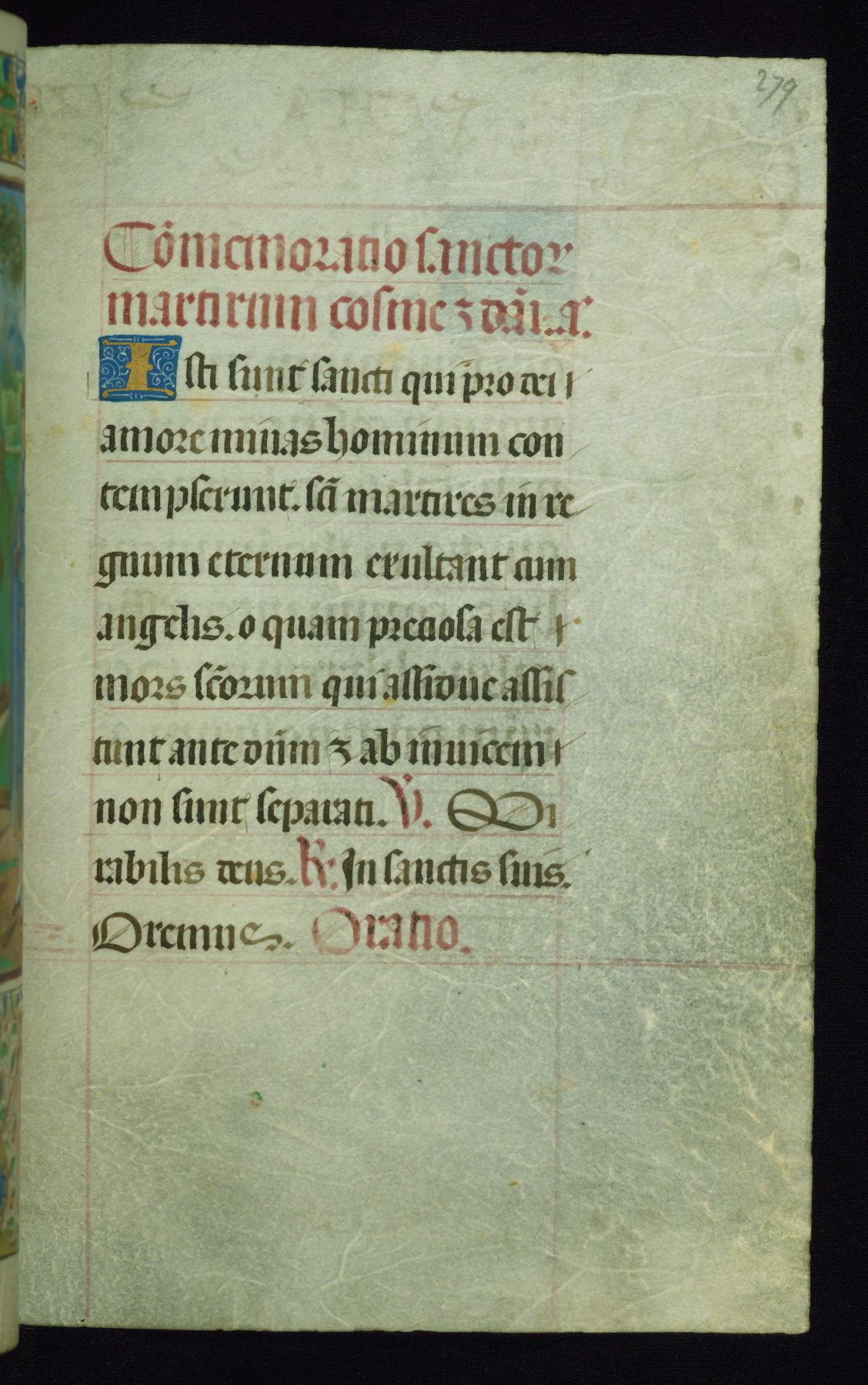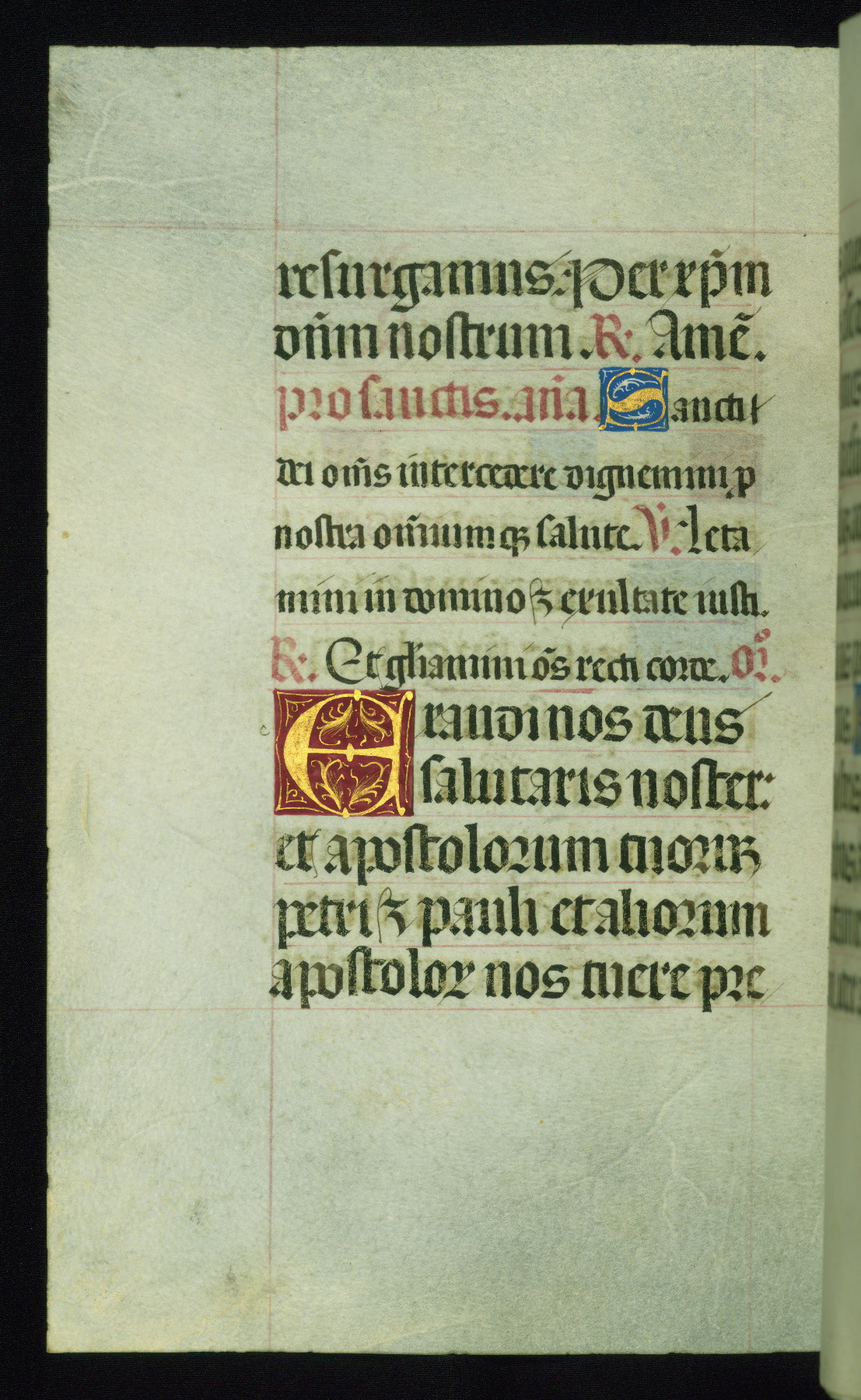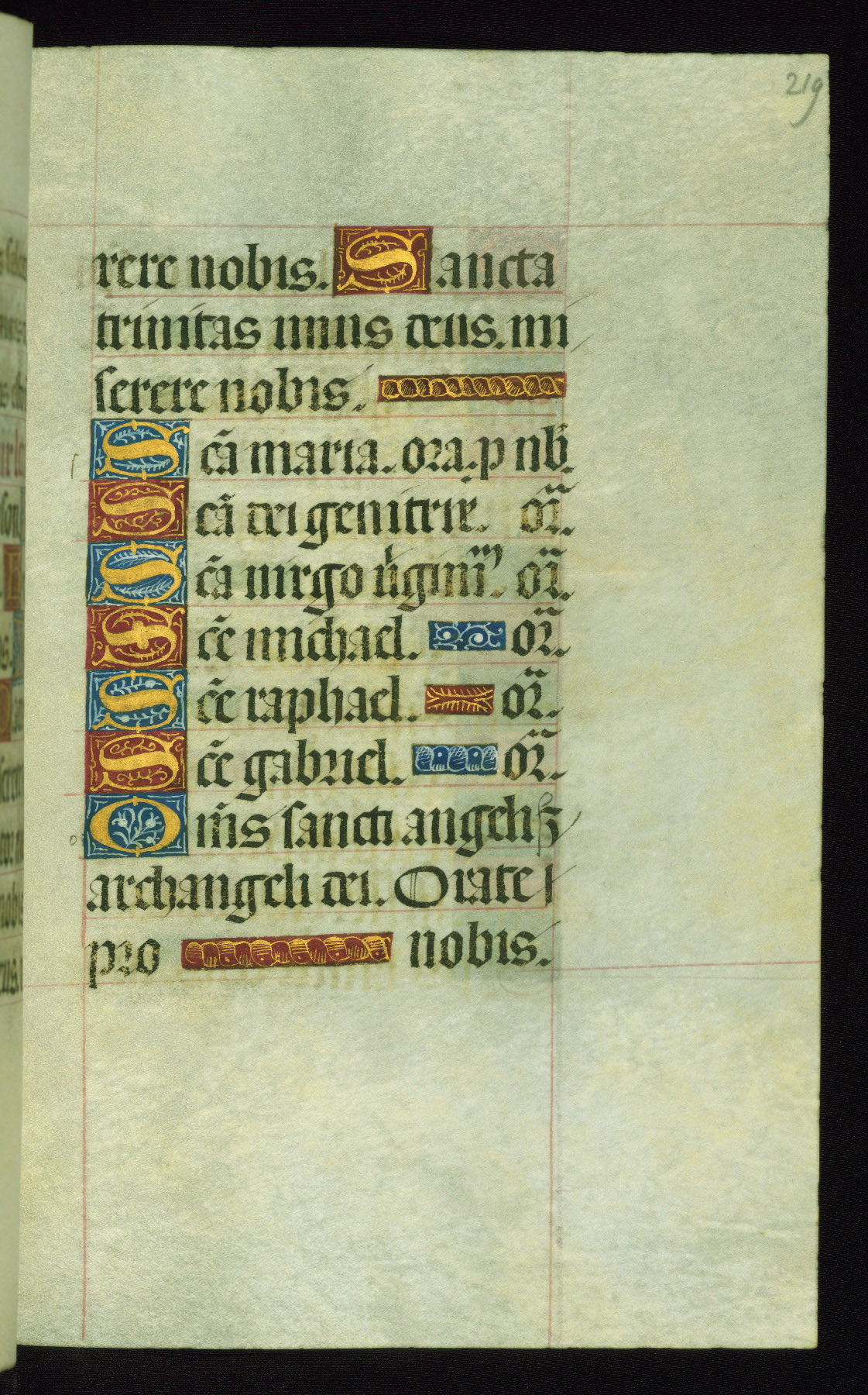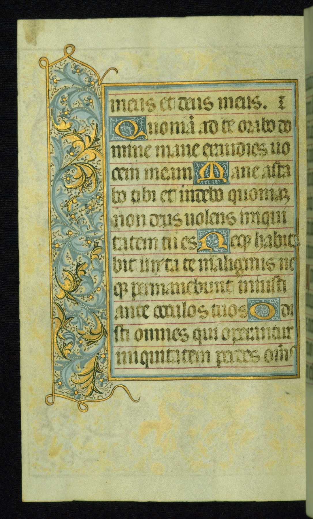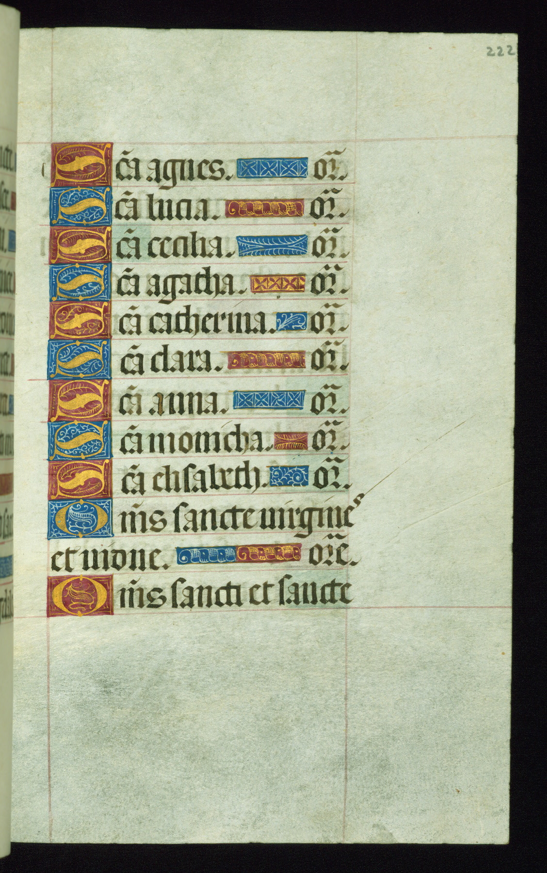 This book of hours was produced ca. 1510-1520 for a member of the Catalonian Almugavar (or AlmogĂ ver) family, whose coat of arms appears throughout the manuscript in the borders of the lavish full-page miniatures. There are twenty-six full-page polychrome miniatures (three are missing), of which six were removed from the original quire structure after portions of the miniatures were excised, and then returned to the manuscript, having been pasted onto heavy card-stock folios. There are also eighteen full-page incipits, of which three include historiated vignettes, and numerous folios with elaborate floral motif borders. A significant number of feast days associated with Barcelona help reinforce the Spanish attribution of the manuscript, although the style of the decoration is clearly influenced by contemporary Flemish design.