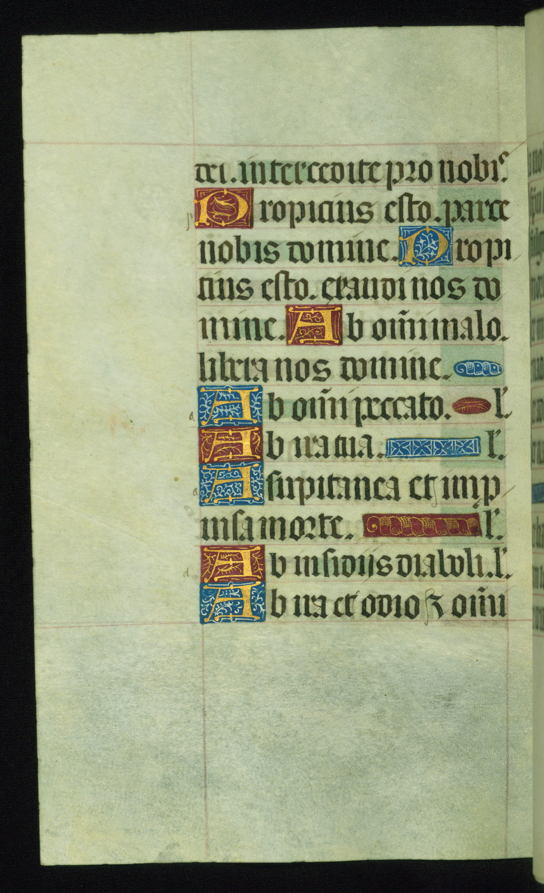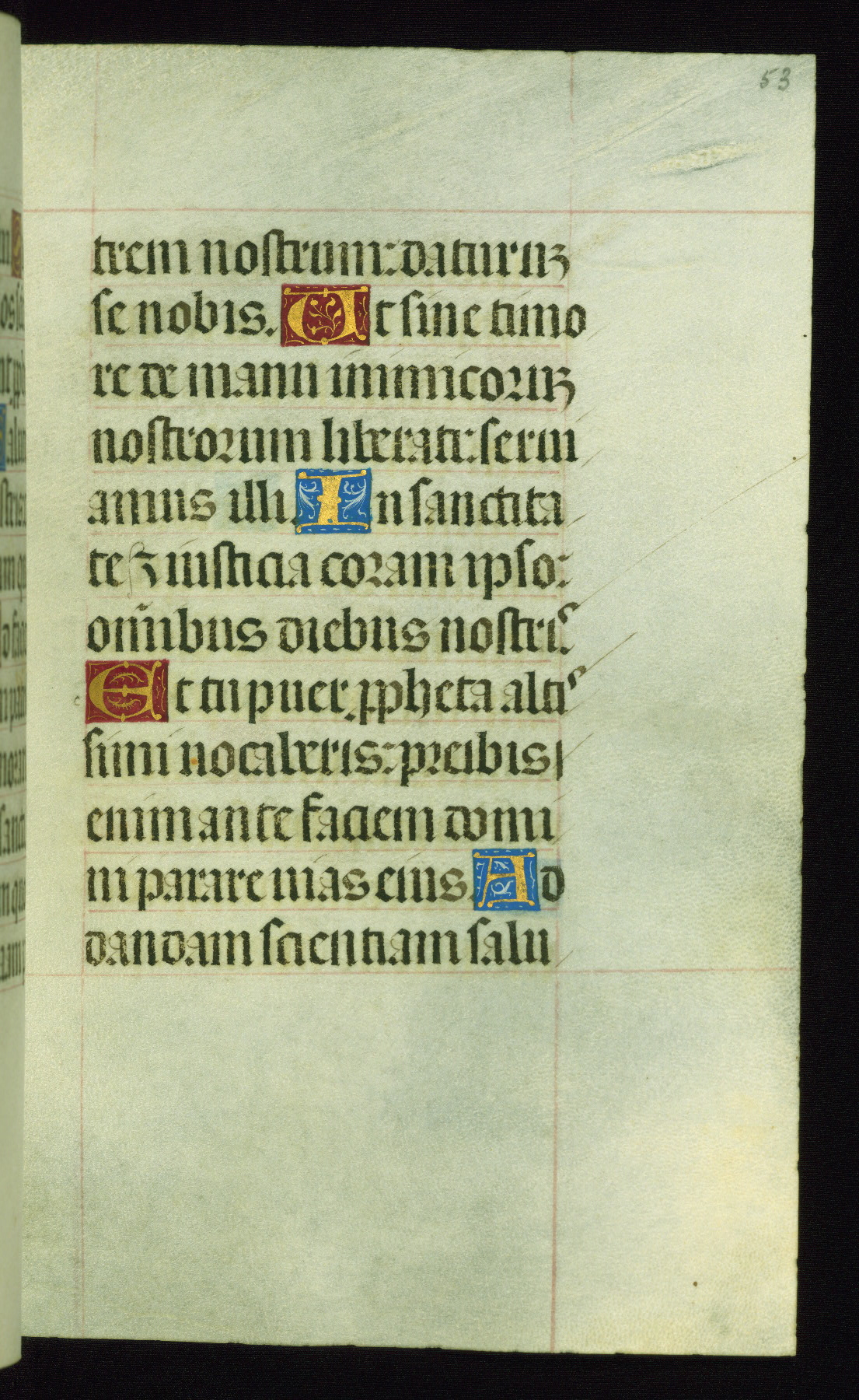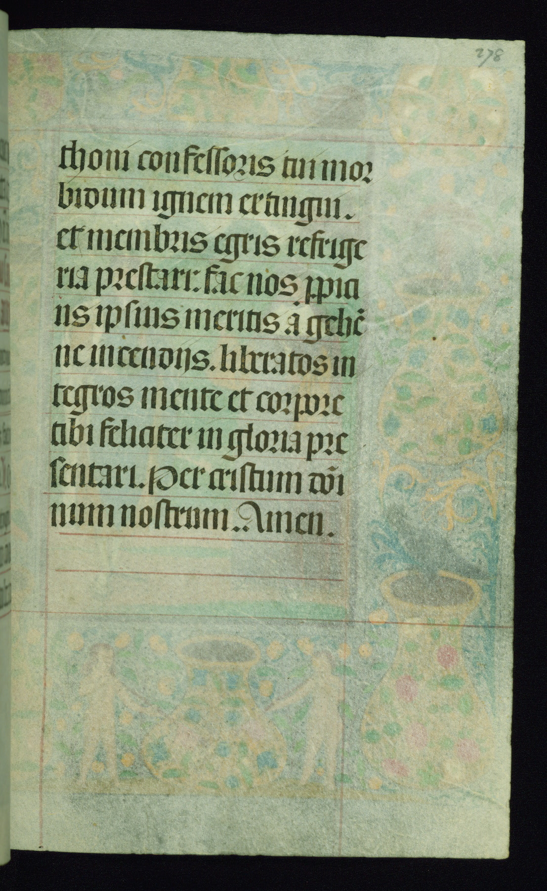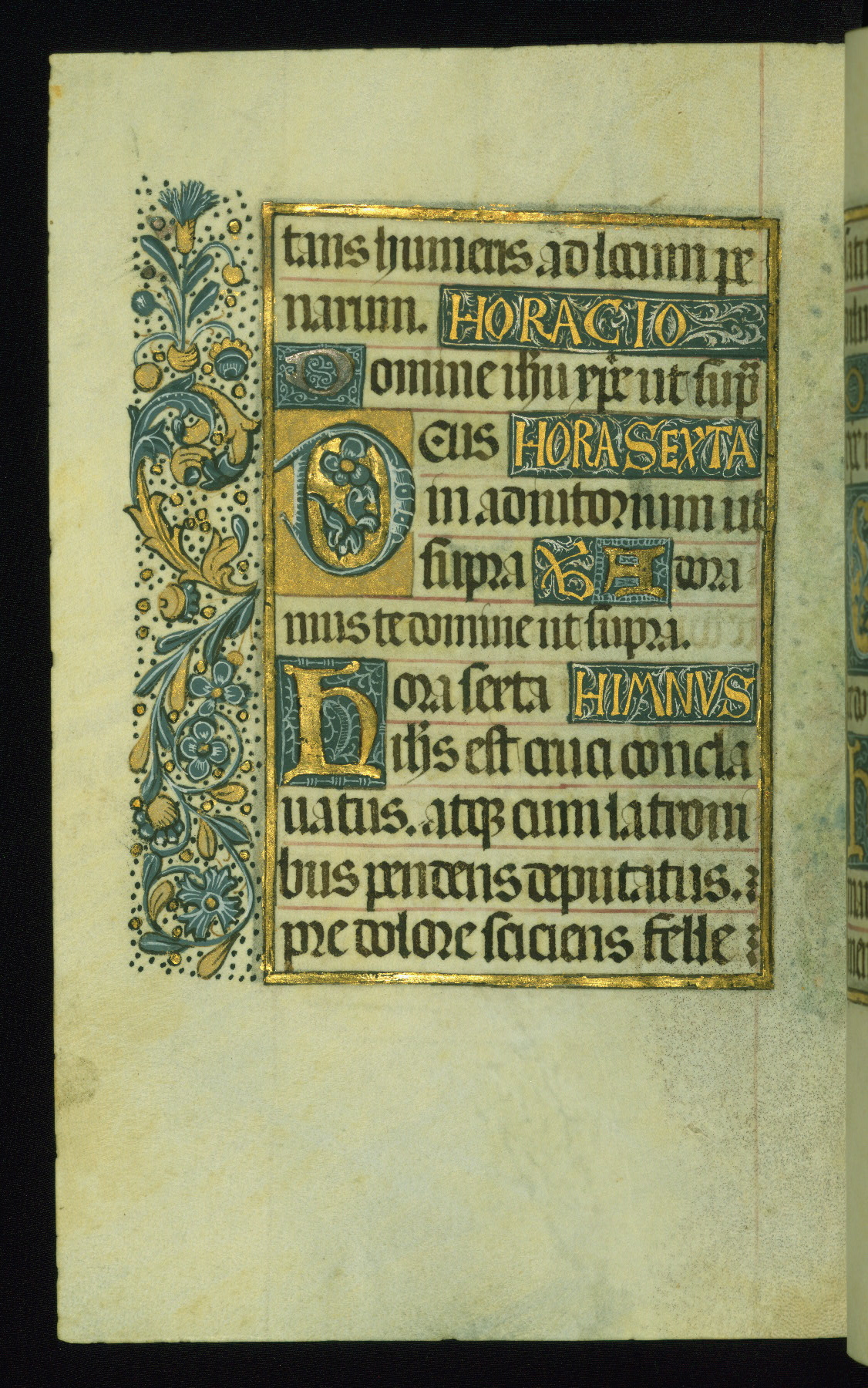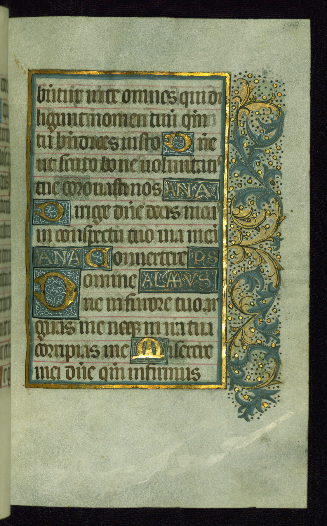 This book of hours was produced ca. 1510-1520 for a member of the Catalonian Almugavar (or AlmogĂ ver) family, whose coat of arms appears throughout the manuscript in the borders of the lavish full-page miniatures. There are twenty-six full-page polychrome miniatures (three are missing), of which six were removed from the original quire structure after portions of the miniatures were excised, and then returned to the manuscript, having been pasted onto heavy card-stock folios. There are also eighteen full-page incipits, of which three include historiated vignettes, and numerous folios with elaborate floral motif borders. A significant number of feast days associated with Barcelona help reinforce the Spanish attribution of the manuscript, although the style of the decoration is clearly influenced by contemporary Flemish design.