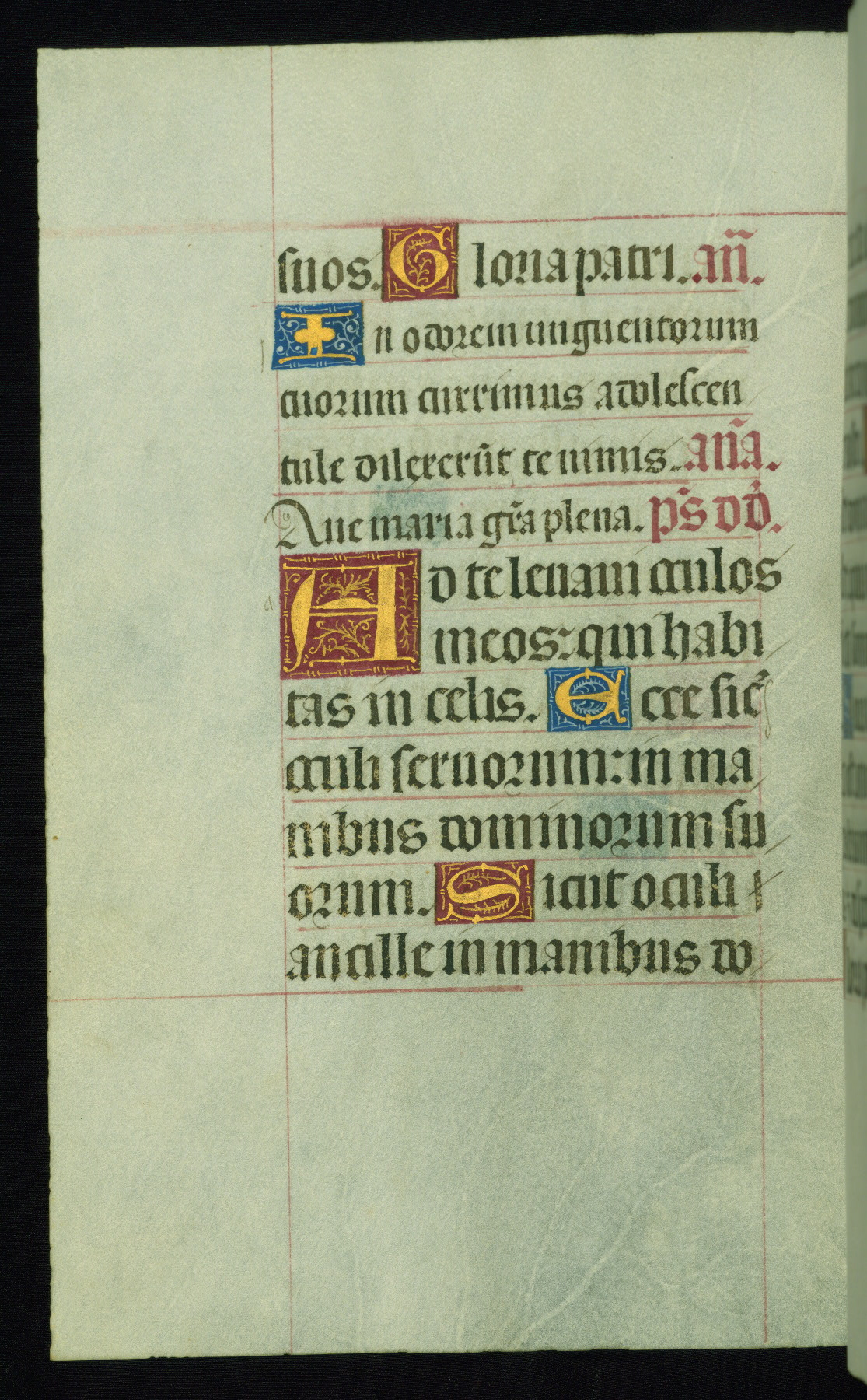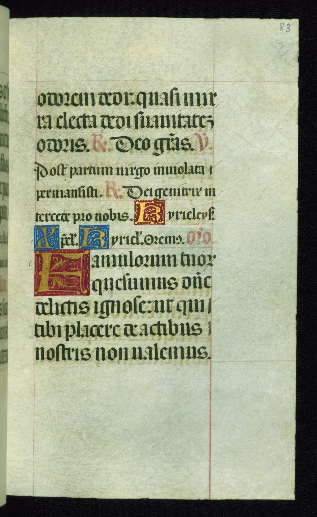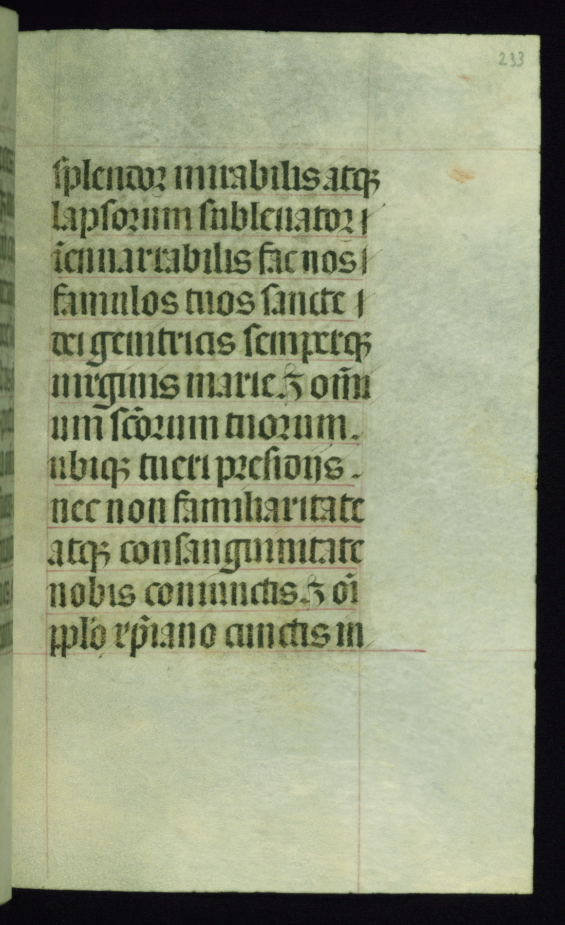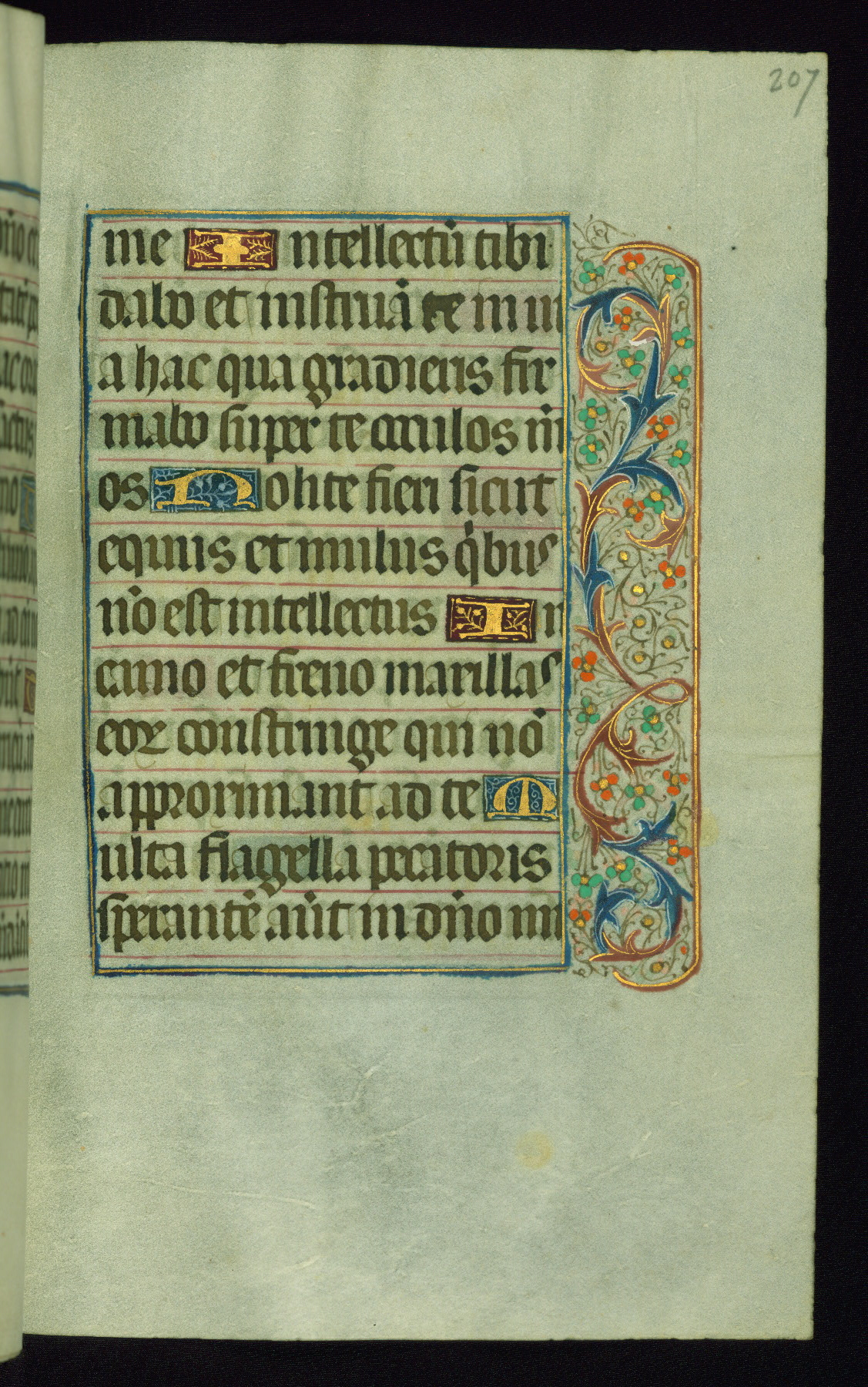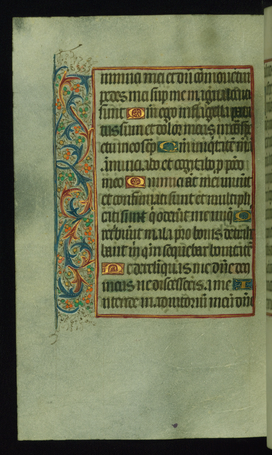This book of hours was produced ca. 1510-1520 for a member of the Catalonian Almugavar (or AlmogĂ ver) family, whose coat of arms appears throughout the manuscript in the borders of the lavish full-page miniatures. There are twenty-six full-page polychrome miniatures (three are missing), of which six were removed from the original quire structure after portions of the miniatures were excised, and then returned to the manuscript, having been pasted onto heavy card-stock folios. There are also eighteen full-page incipits, of which three include historiated vignettes, and numerous folios with elaborate floral motif borders. A significant number of feast days associated with Barcelona help reinforce the Spanish attribution of the manuscript, although the style of the decoration is clearly influenced by contemporary Flemish design.