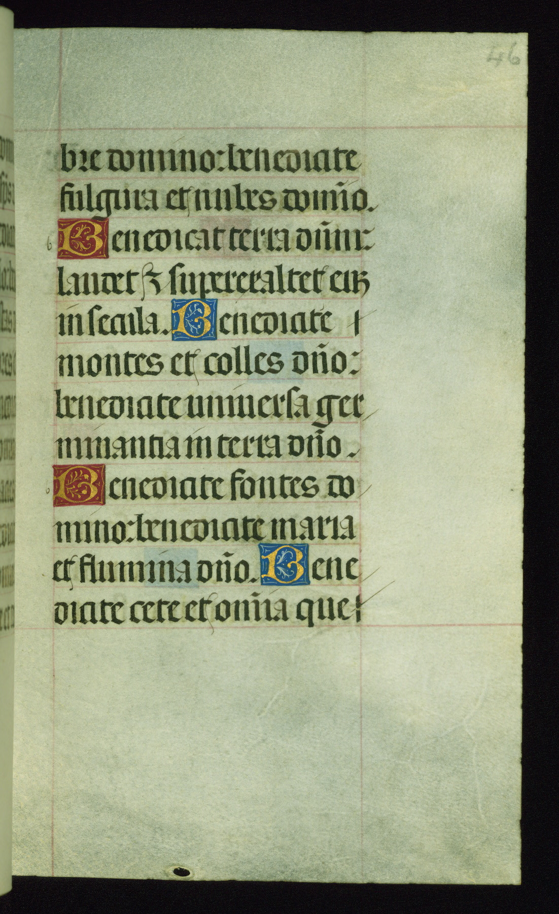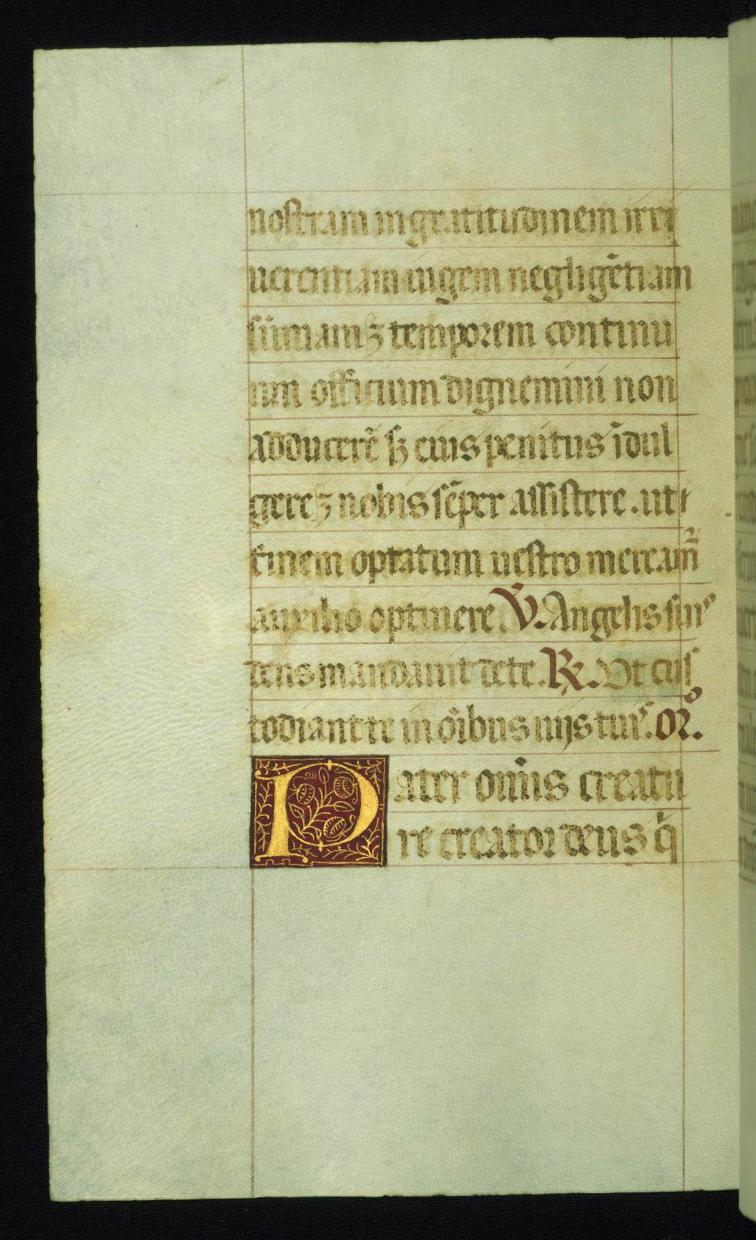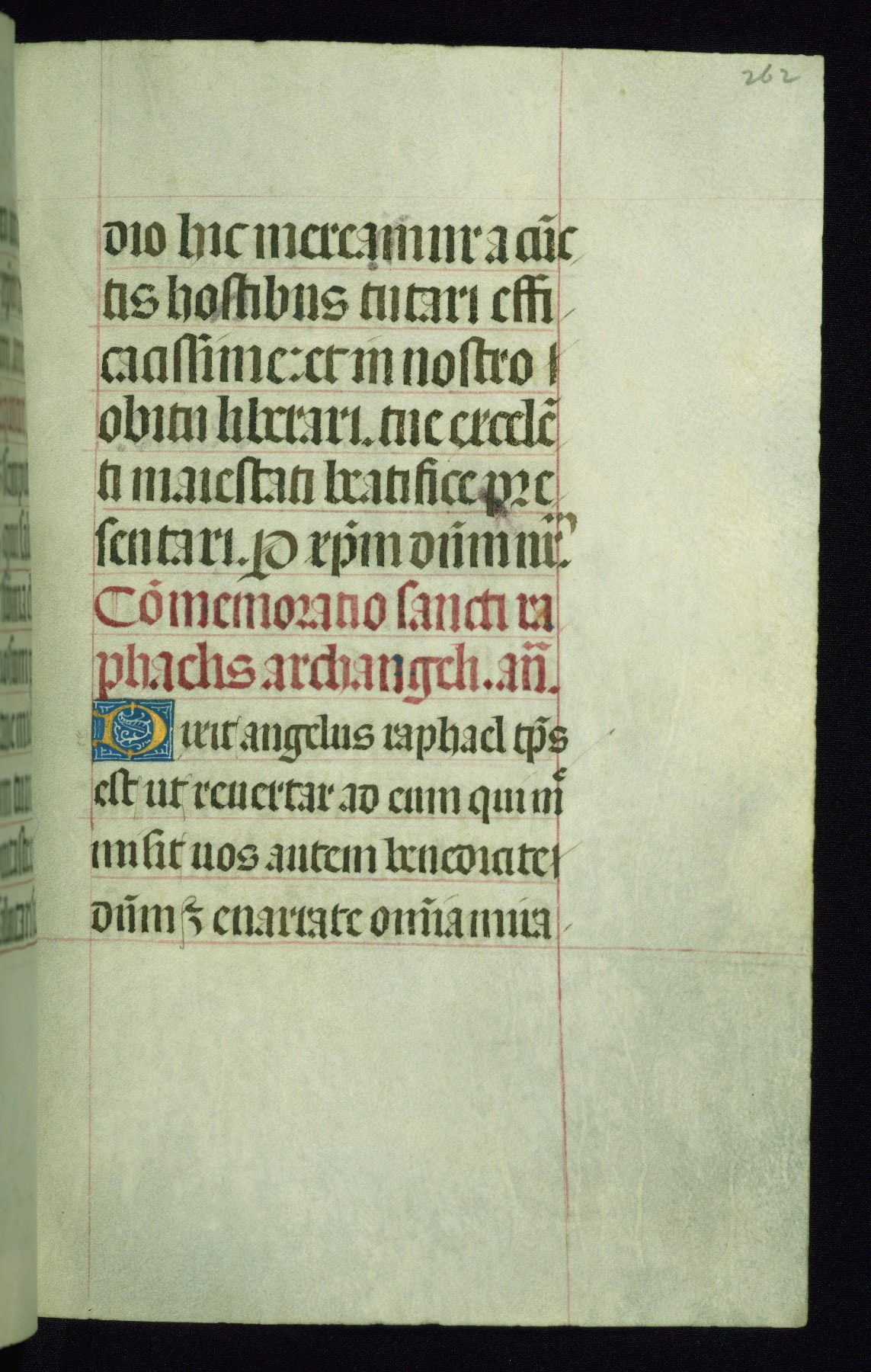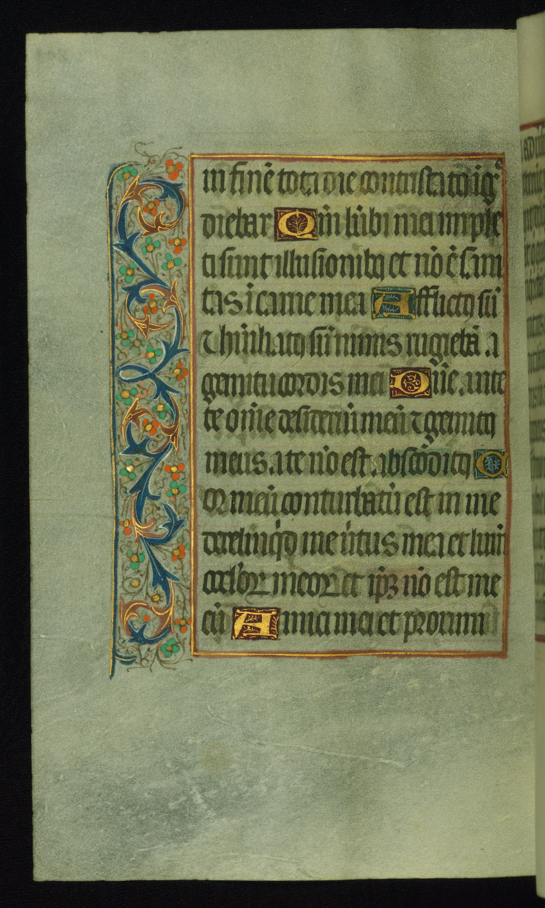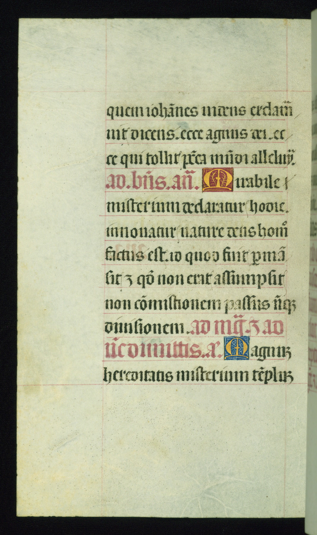 This book of hours was produced ca. 1510-1520 for a member of the Catalonian Almugavar (or AlmogĂ ver) family, whose coat of arms appears throughout the manuscript in the borders of the lavish full-page miniatures. There are twenty-six full-page polychrome miniatures (three are missing), of which six were removed from the original quire structure after portions of the miniatures were excised, and then returned to the manuscript, having been pasted onto heavy card-stock folios. There are also eighteen full-page incipits, of which three include historiated vignettes, and numerous folios with elaborate floral motif borders. A significant number of feast days associated with Barcelona help reinforce the Spanish attribution of the manuscript, although the style of the decoration is clearly influenced by contemporary Flemish design.