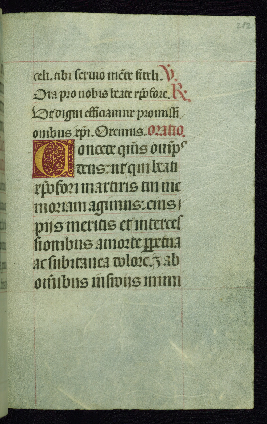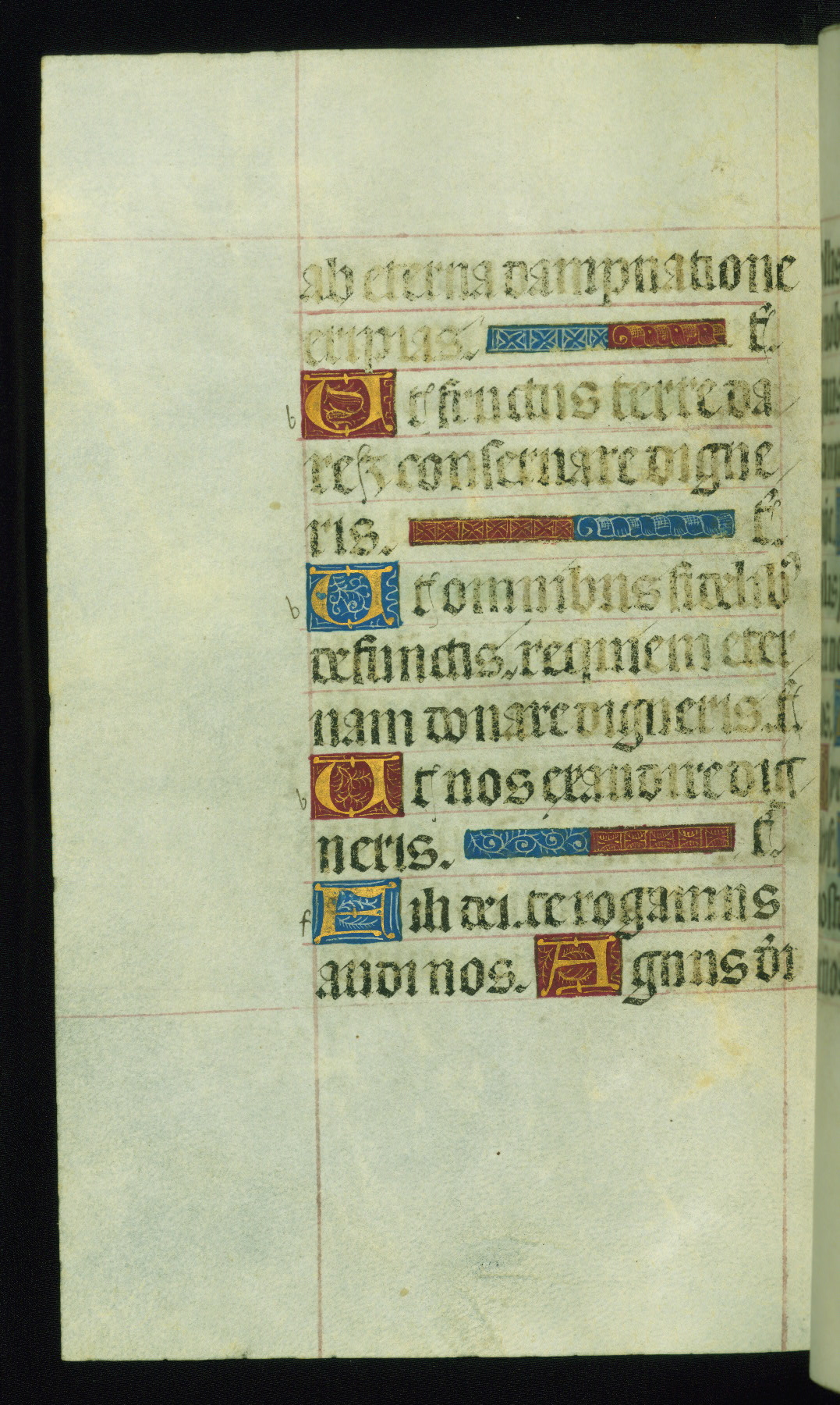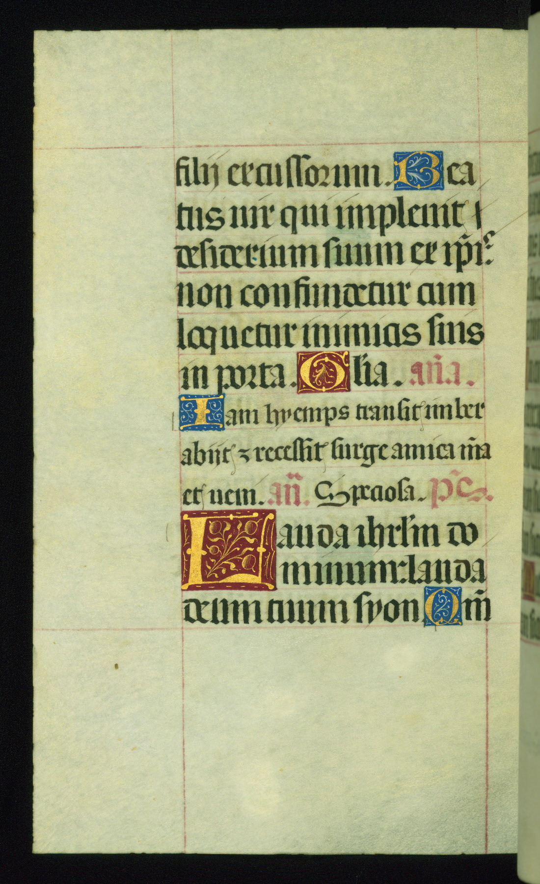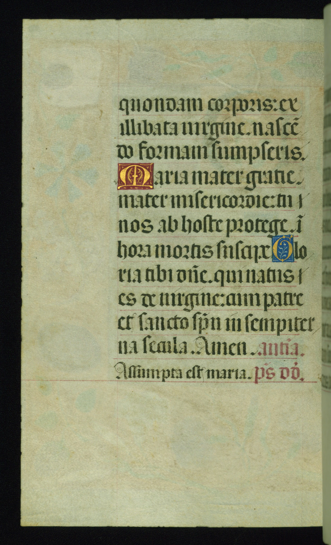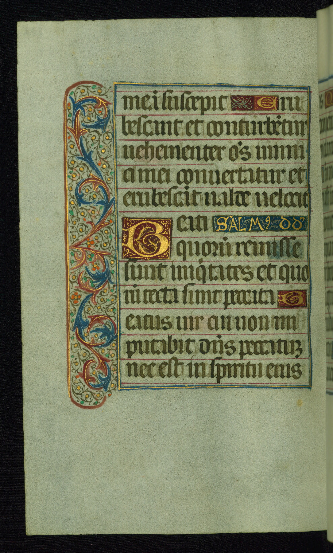 This book of hours was produced ca. 1510-1520 for a member of the Catalonian Almugavar (or AlmogĂ ver) family, whose coat of arms appears throughout the manuscript in the borders of the lavish full-page miniatures. There are twenty-six full-page polychrome miniatures (three are missing), of which six were removed from the original quire structure after portions of the miniatures were excised, and then returned to the manuscript, having been pasted onto heavy card-stock folios. There are also eighteen full-page incipits, of which three include historiated vignettes, and numerous folios with elaborate floral motif borders. A significant number of feast days associated with Barcelona help reinforce the Spanish attribution of the manuscript, although the style of the decoration is clearly influenced by contemporary Flemish design.