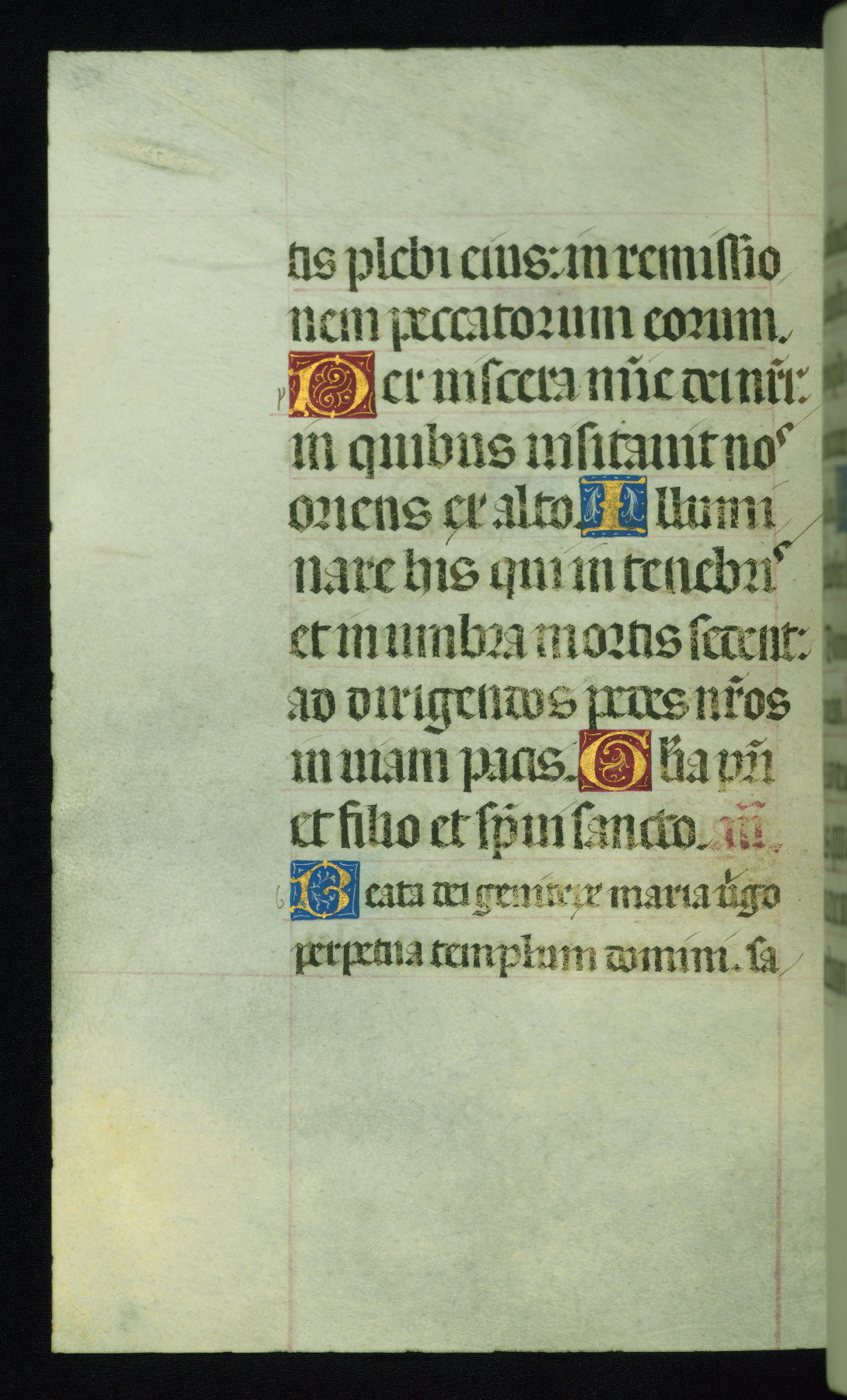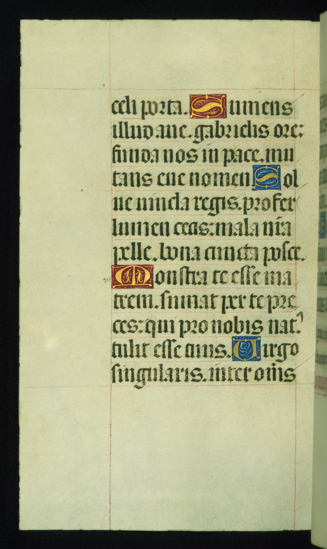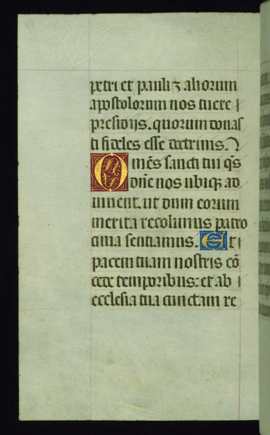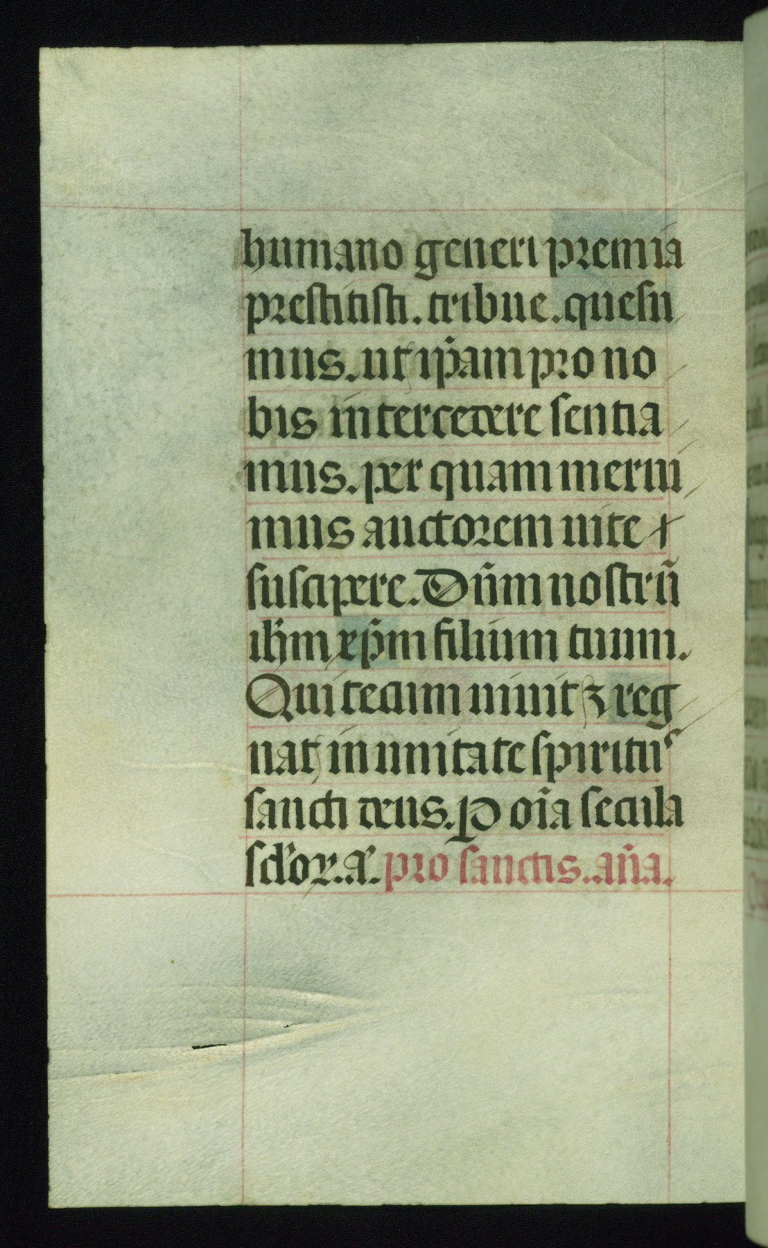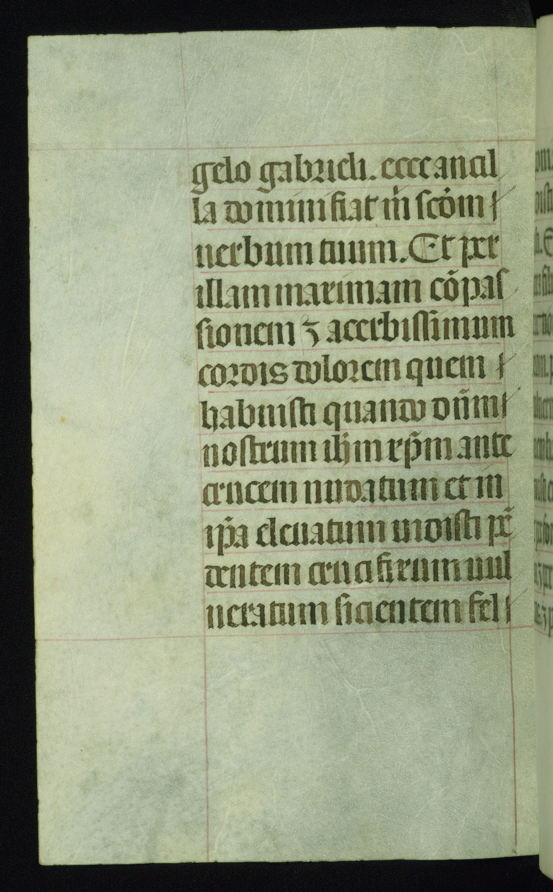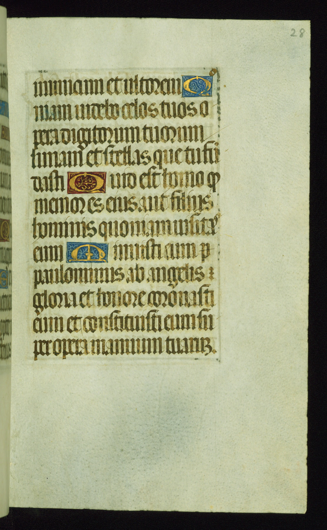 This book of hours was produced ca. 1510-1520 for a member of the Catalonian Almugavar (or AlmogĂ ver) family, whose coat of arms appears throughout the manuscript in the borders of the lavish full-page miniatures. There are twenty-six full-page polychrome miniatures (three are missing), of which six were removed from the original quire structure after portions of the miniatures were excised, and then returned to the manuscript, having been pasted onto heavy card-stock folios. There are also eighteen full-page incipits, of which three include historiated vignettes, and numerous folios with elaborate floral motif borders. A significant number of feast days associated with Barcelona help reinforce the Spanish attribution of the manuscript, although the style of the decoration is clearly influenced by contemporary Flemish design.
