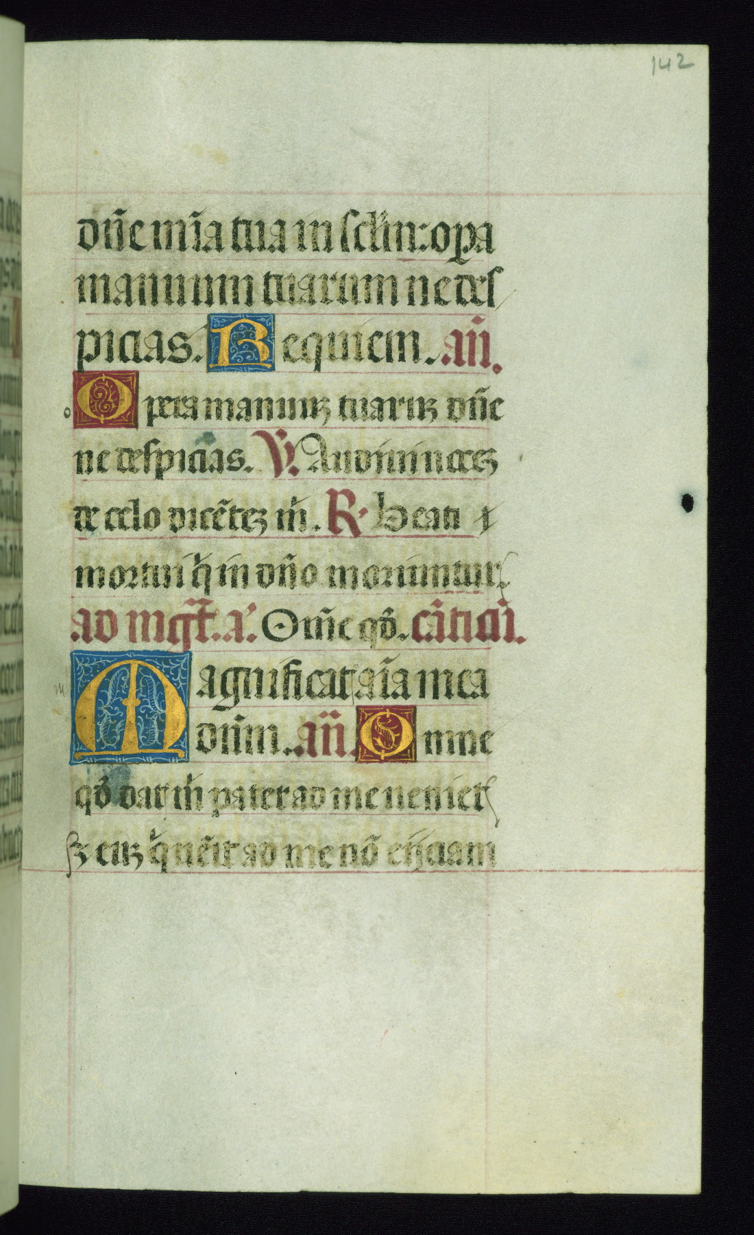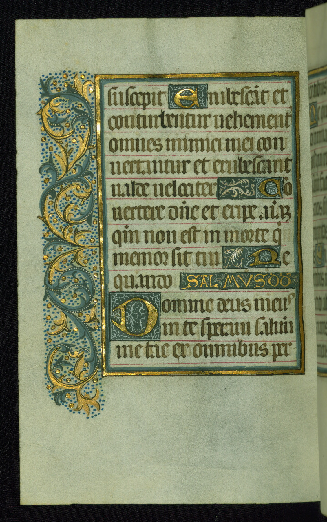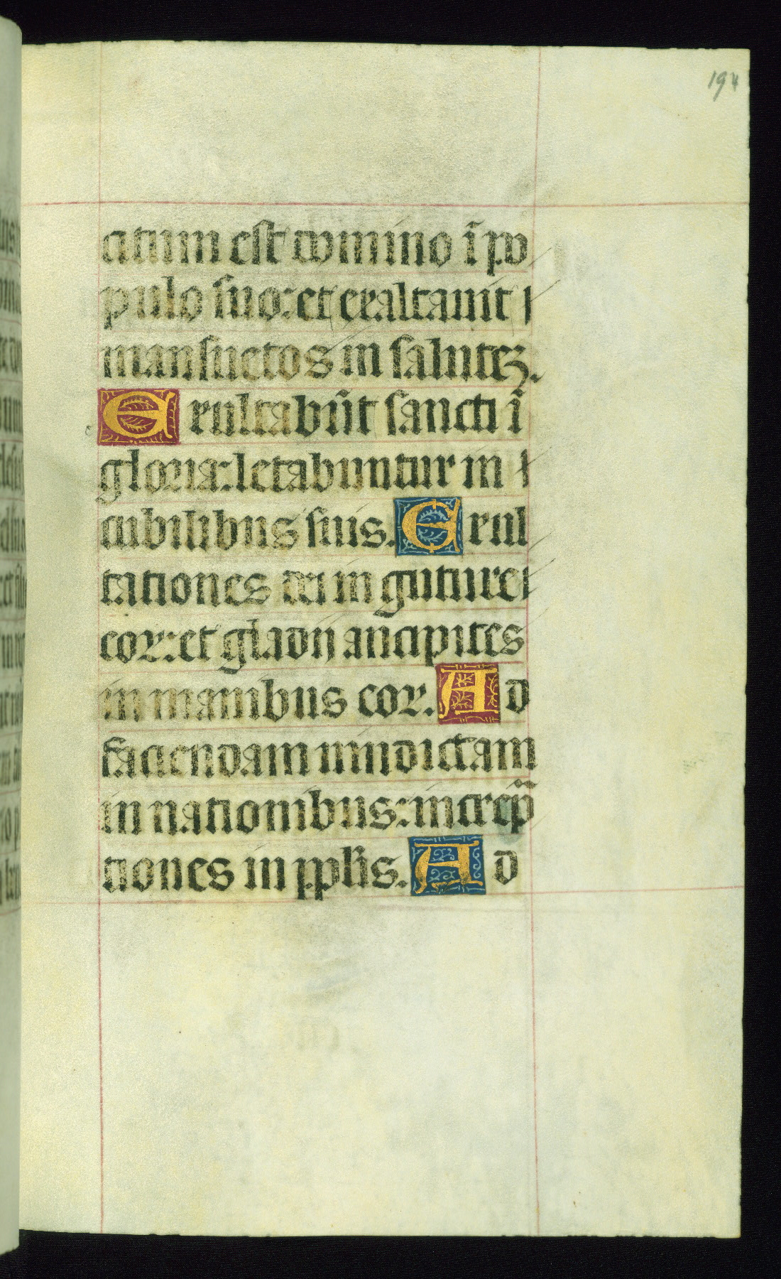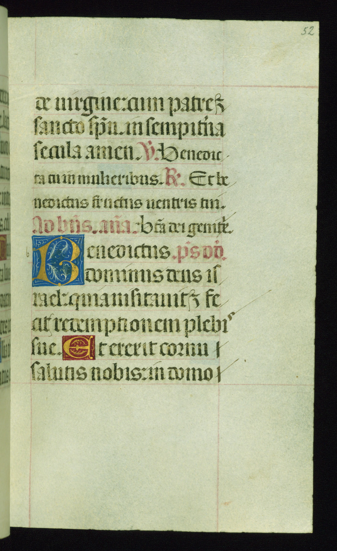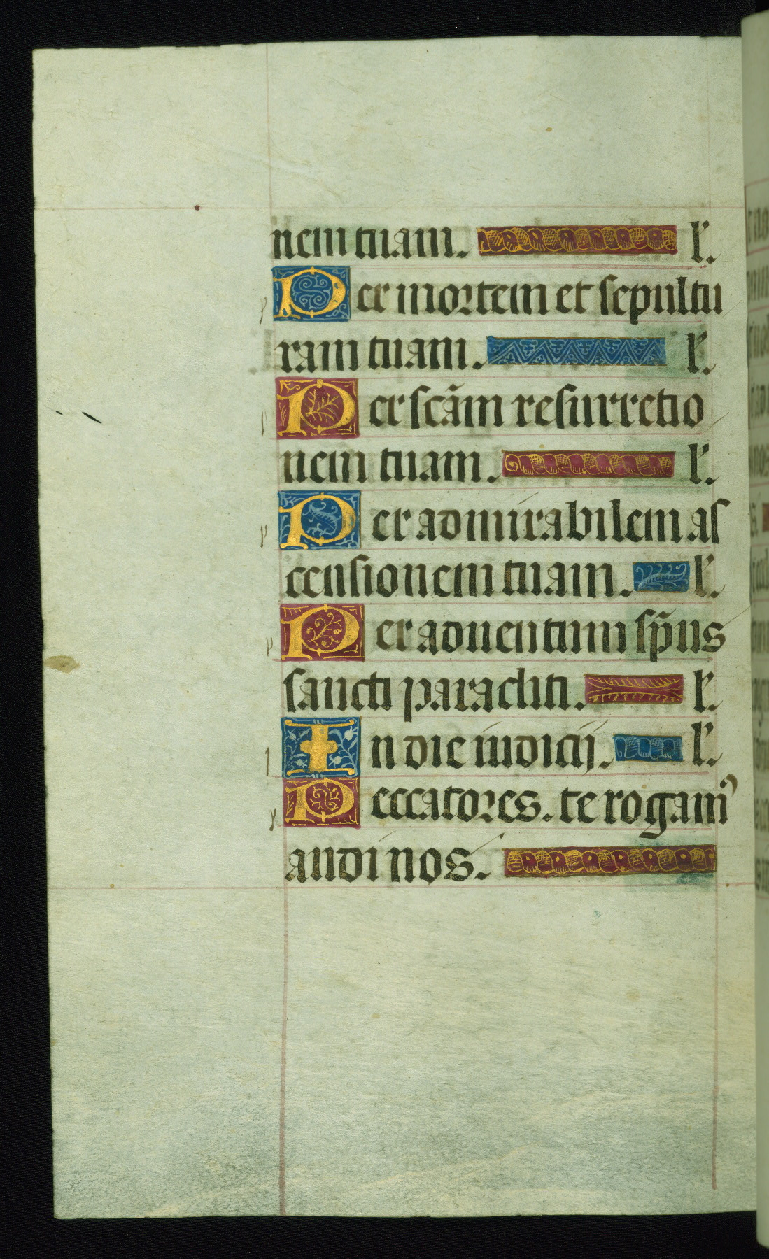 This book of hours was produced ca. 1510-1520 for a member of the Catalonian Almugavar (or AlmogĂ ver) family, whose coat of arms appears throughout the manuscript in the borders of the lavish full-page miniatures. There are twenty-six full-page polychrome miniatures (three are missing), of which six were removed from the original quire structure after portions of the miniatures were excised, and then returned to the manuscript, having been pasted onto heavy card-stock folios. There are also eighteen full-page incipits, of which three include historiated vignettes, and numerous folios with elaborate floral motif borders. A significant number of feast days associated with Barcelona help reinforce the Spanish attribution of the manuscript, although the style of the decoration is clearly influenced by contemporary Flemish design.