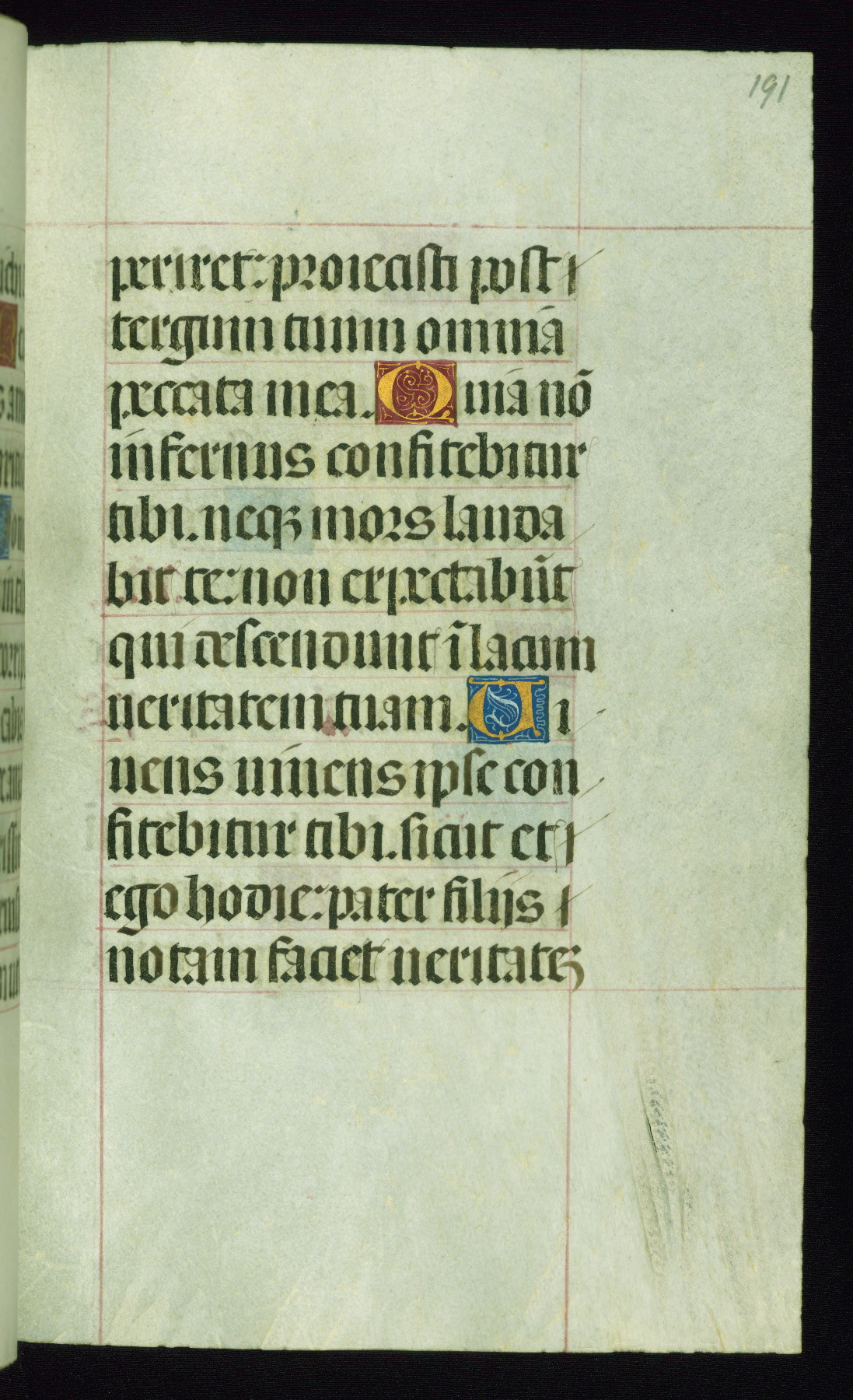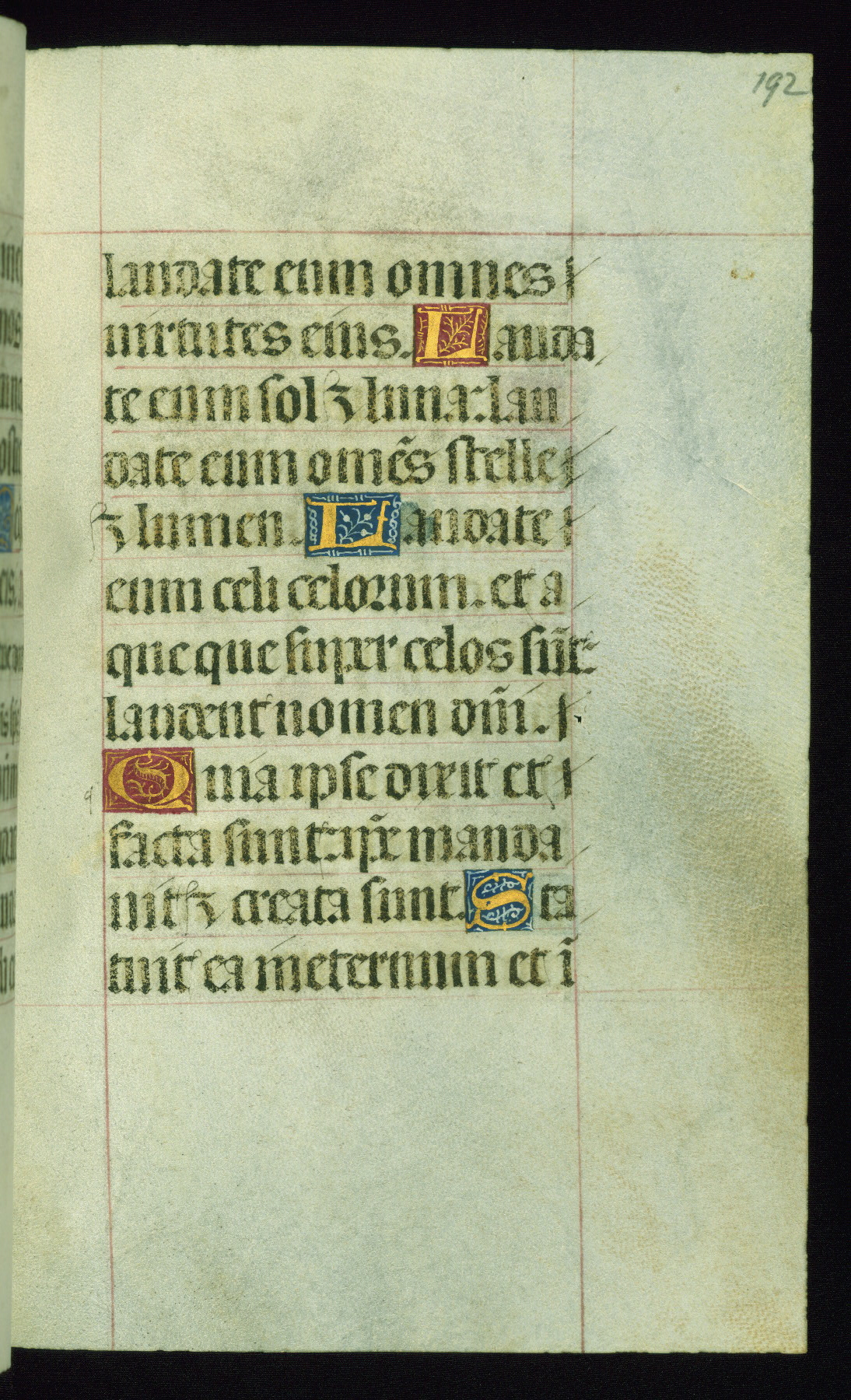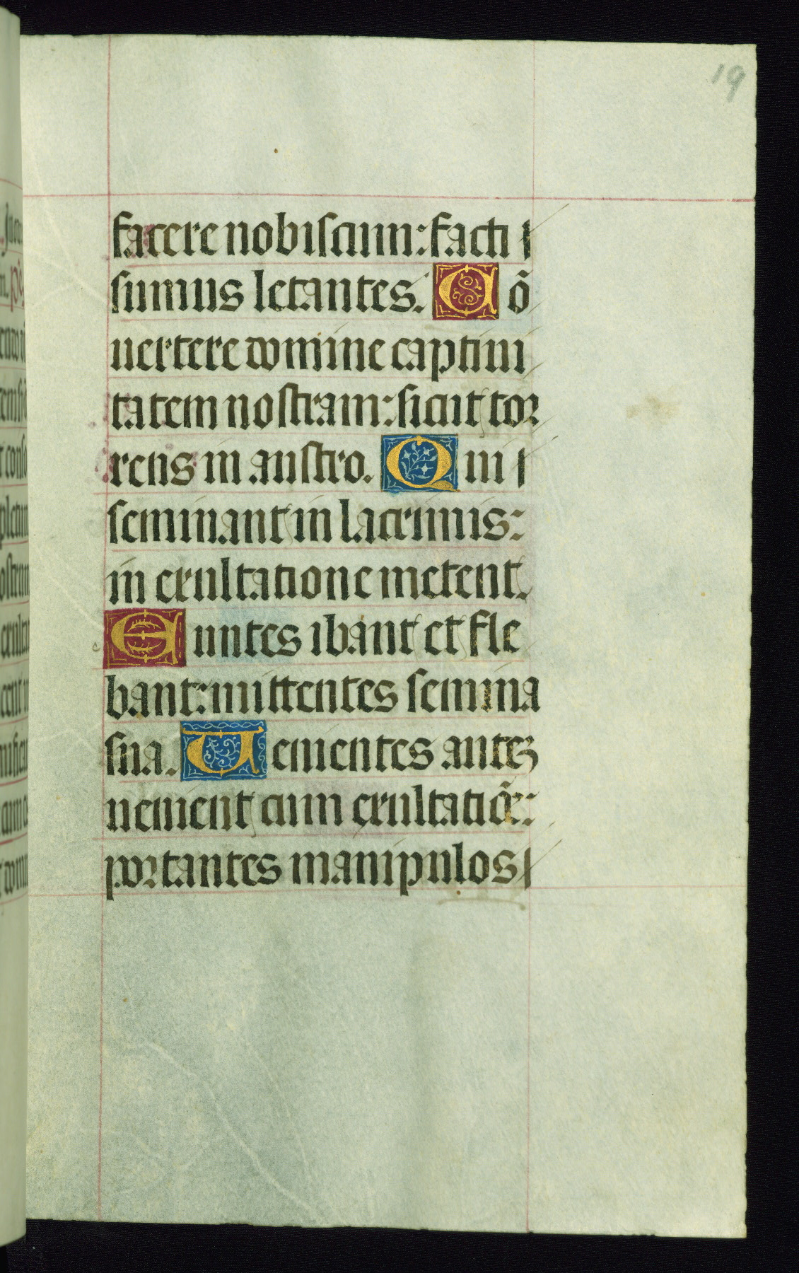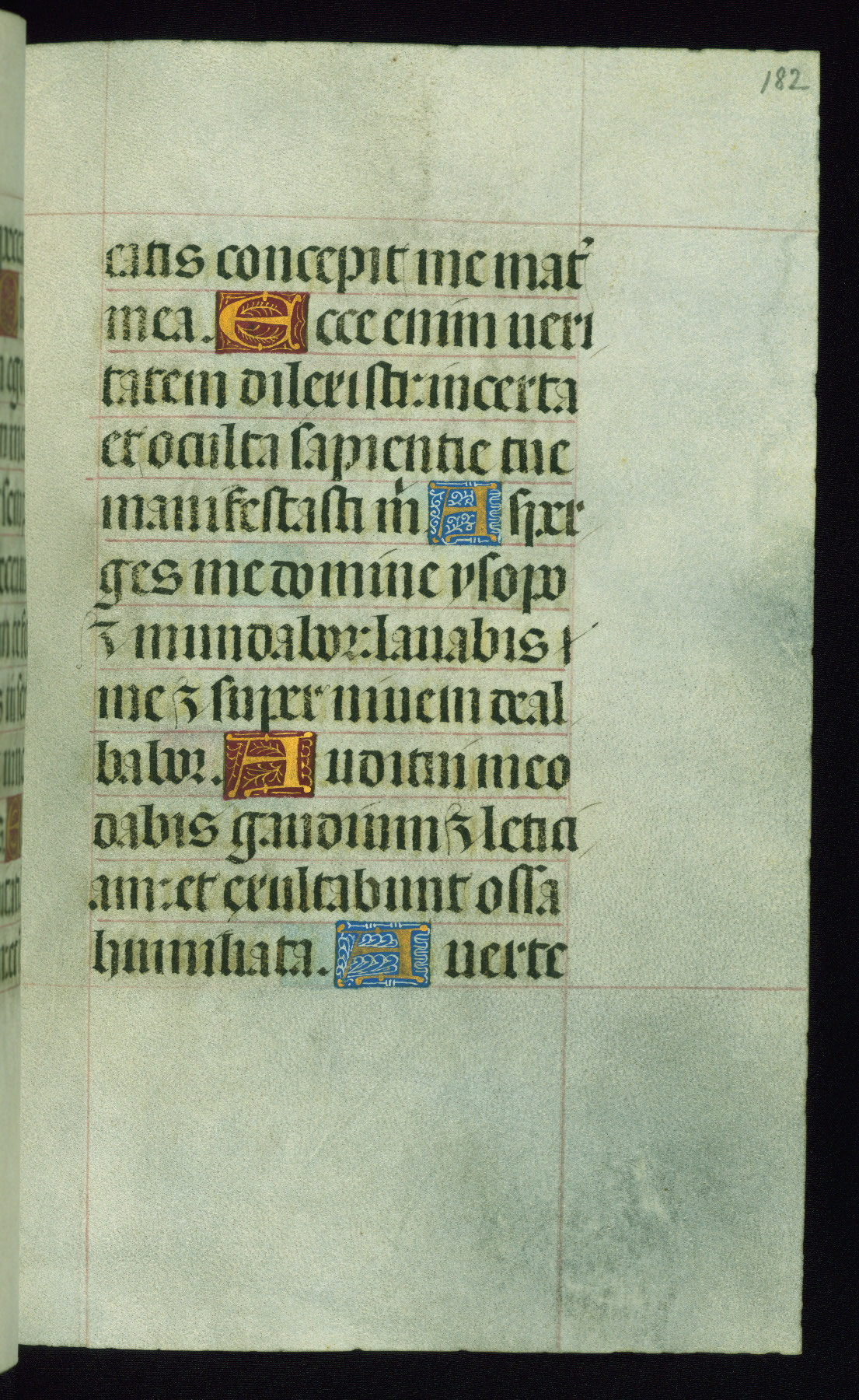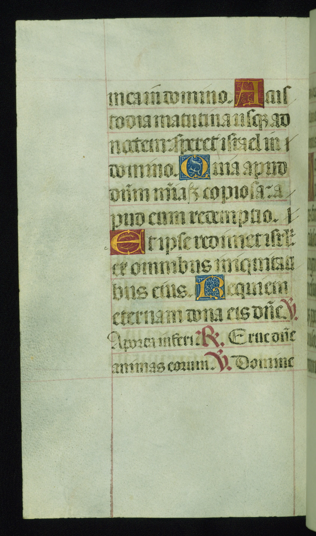 This book of hours was produced ca. 1510-1520 for a member of the Catalonian Almugavar (or AlmogĂ ver) family, whose coat of arms appears throughout the manuscript in the borders of the lavish full-page miniatures. There are twenty-six full-page polychrome miniatures (three are missing), of which six were removed from the original quire structure after portions of the miniatures were excised, and then returned to the manuscript, having been pasted onto heavy card-stock folios. There are also eighteen full-page incipits, of which three include historiated vignettes, and numerous folios with elaborate floral motif borders. A significant number of feast days associated with Barcelona help reinforce the Spanish attribution of the manuscript, although the style of the decoration is clearly influenced by contemporary Flemish design.