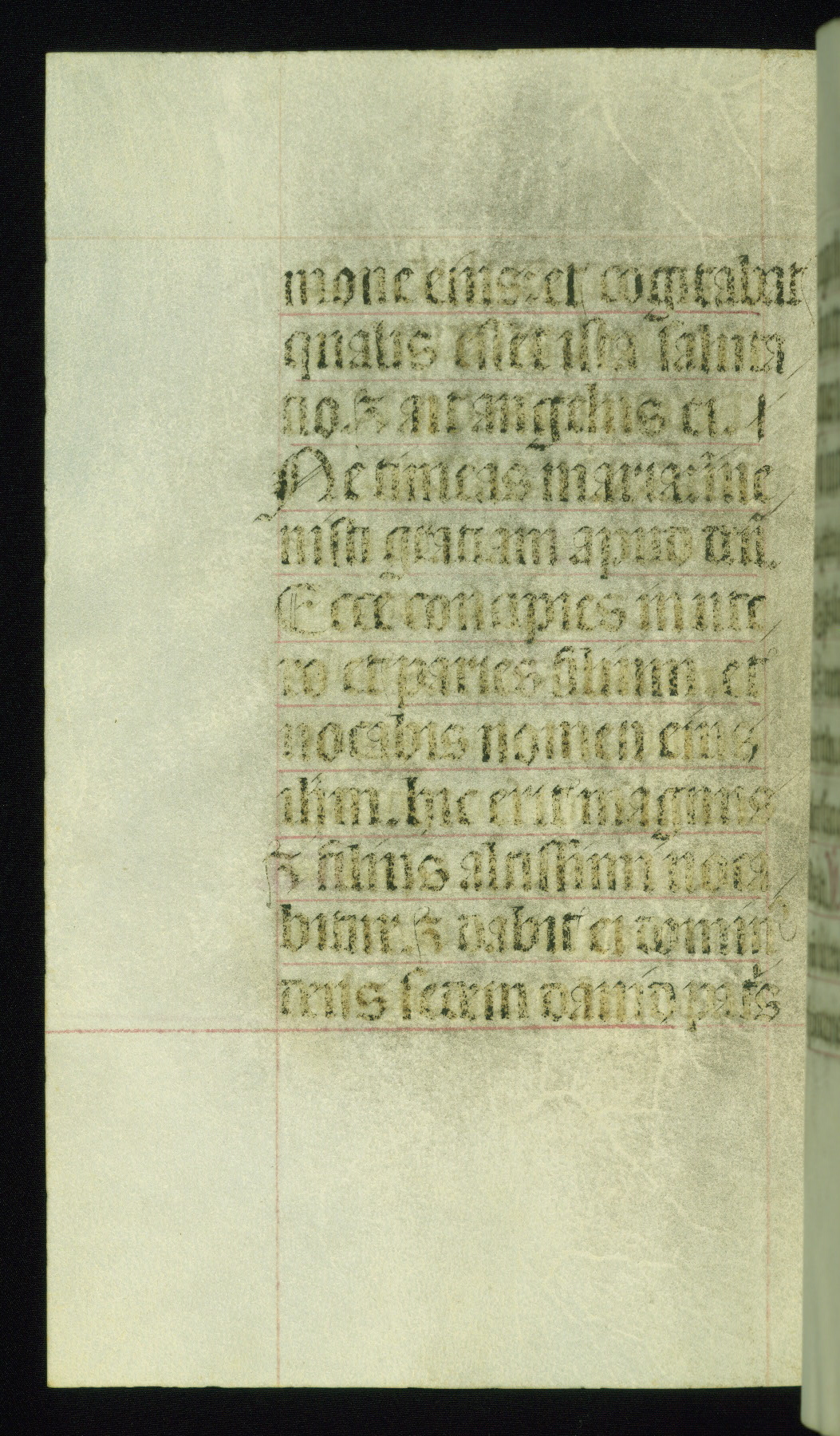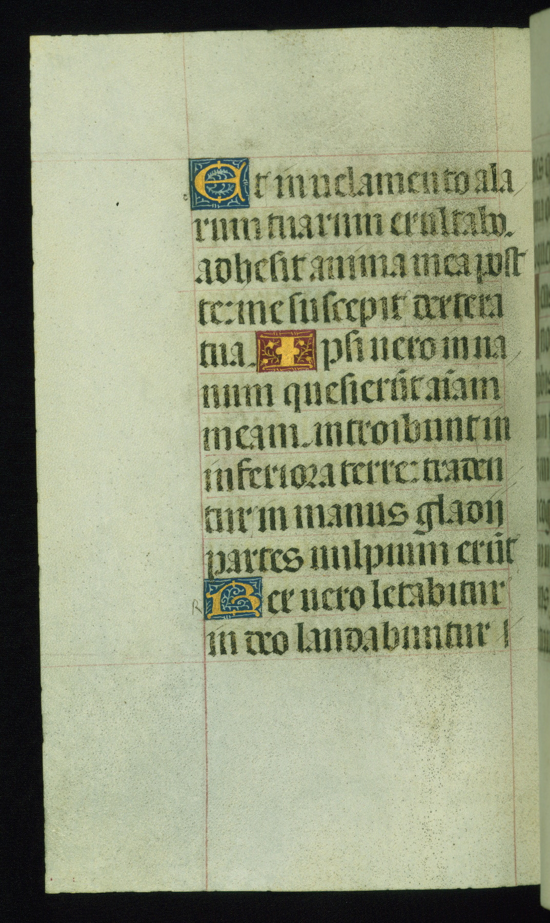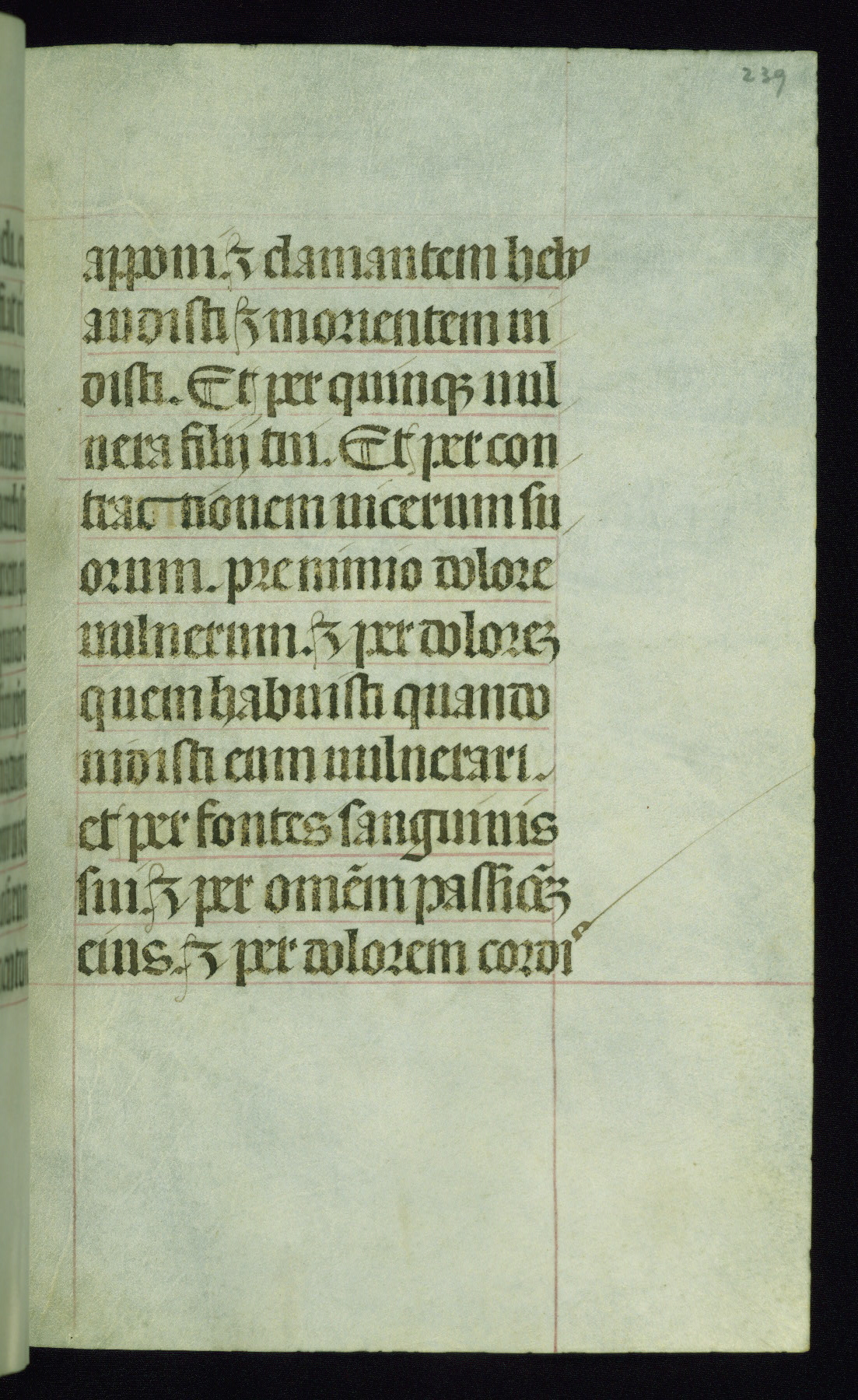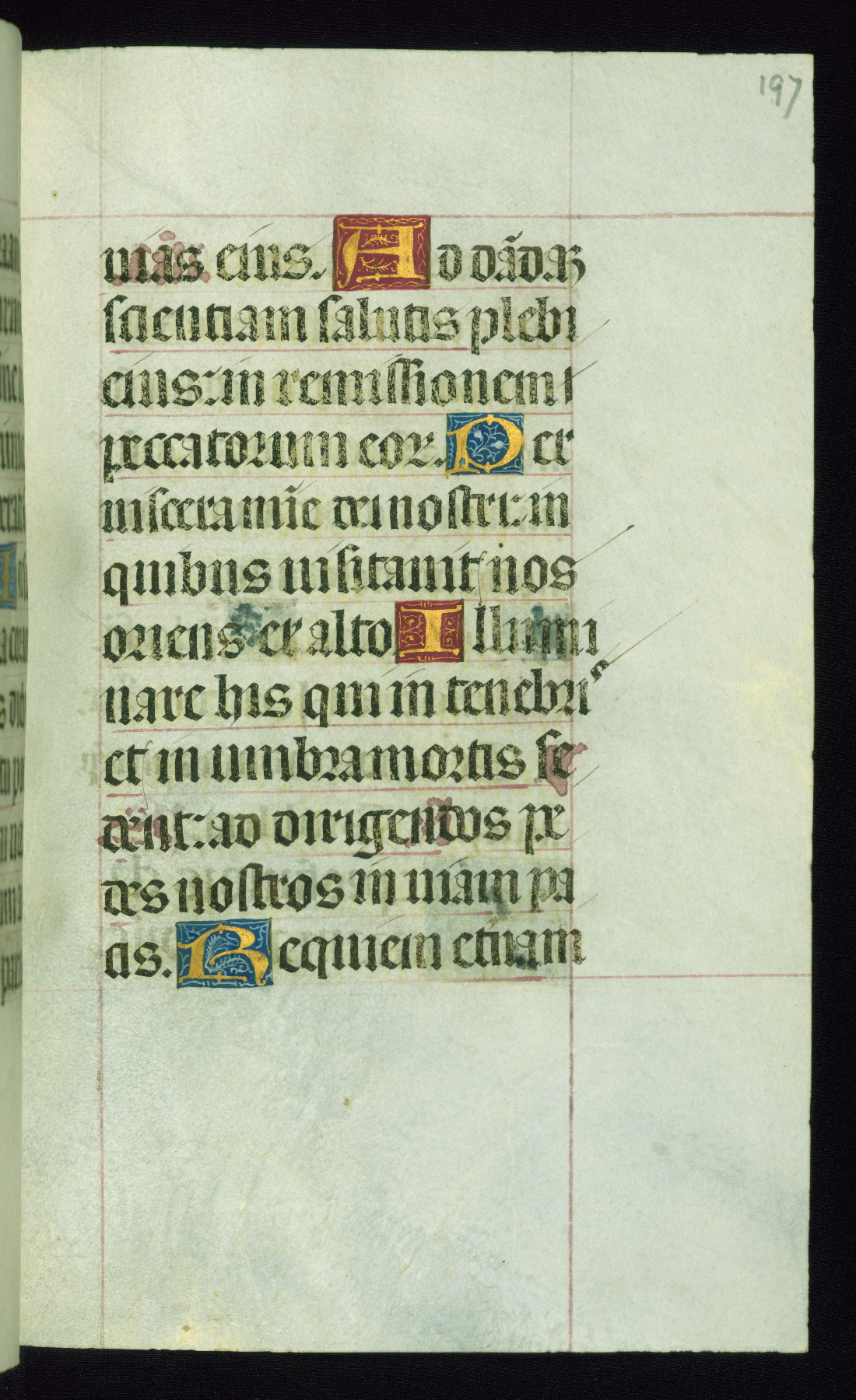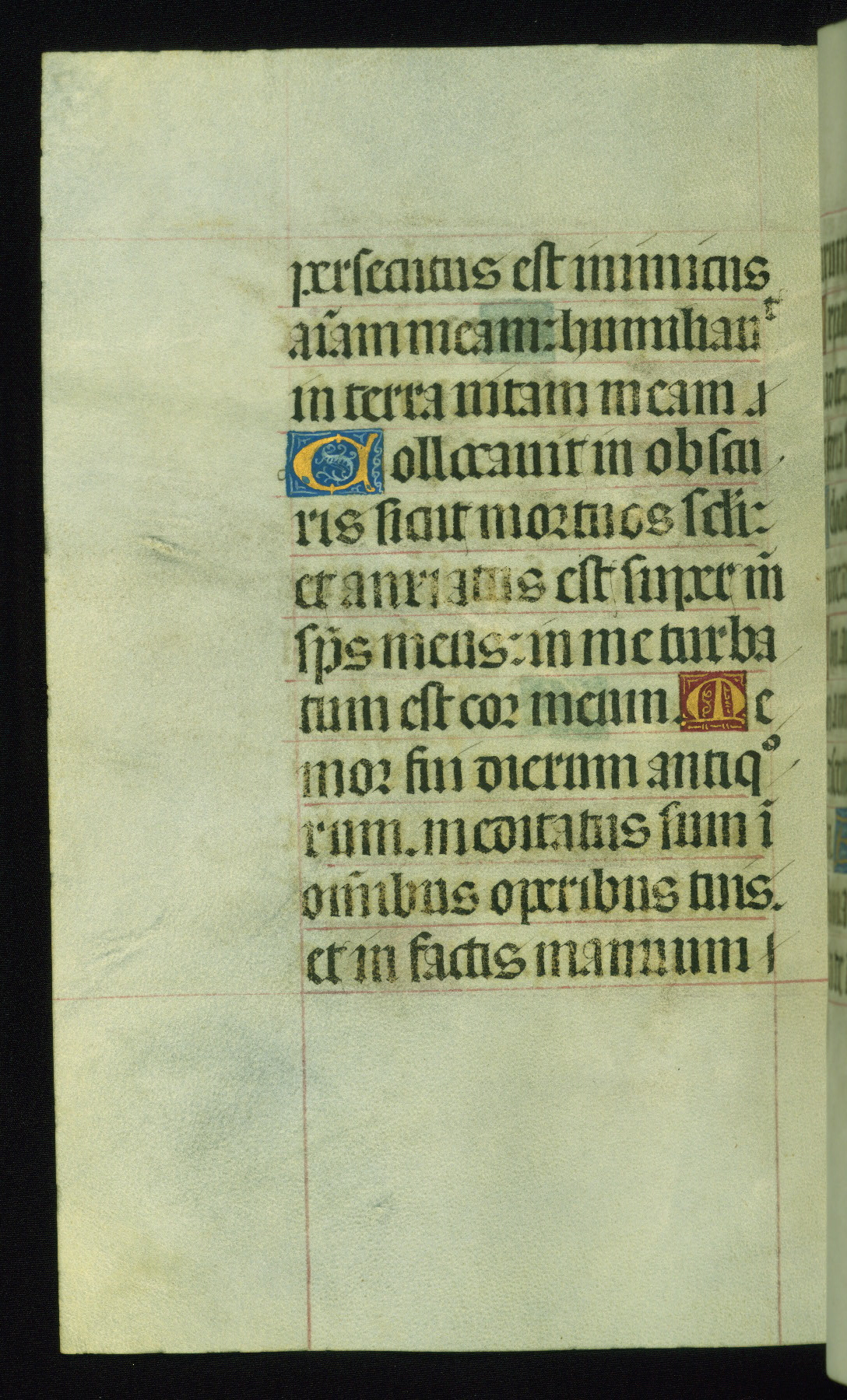 This book of hours was produced ca. 1510-1520 for a member of the Catalonian Almugavar (or AlmogĂ ver) family, whose coat of arms appears throughout the manuscript in the borders of the lavish full-page miniatures. There are twenty-six full-page polychrome miniatures (three are missing), of which six were removed from the original quire structure after portions of the miniatures were excised, and then returned to the manuscript, having been pasted onto heavy card-stock folios. There are also eighteen full-page incipits, of which three include historiated vignettes, and numerous folios with elaborate floral motif borders. A significant number of feast days associated with Barcelona help reinforce the Spanish attribution of the manuscript, although the style of the decoration is clearly influenced by contemporary Flemish design.