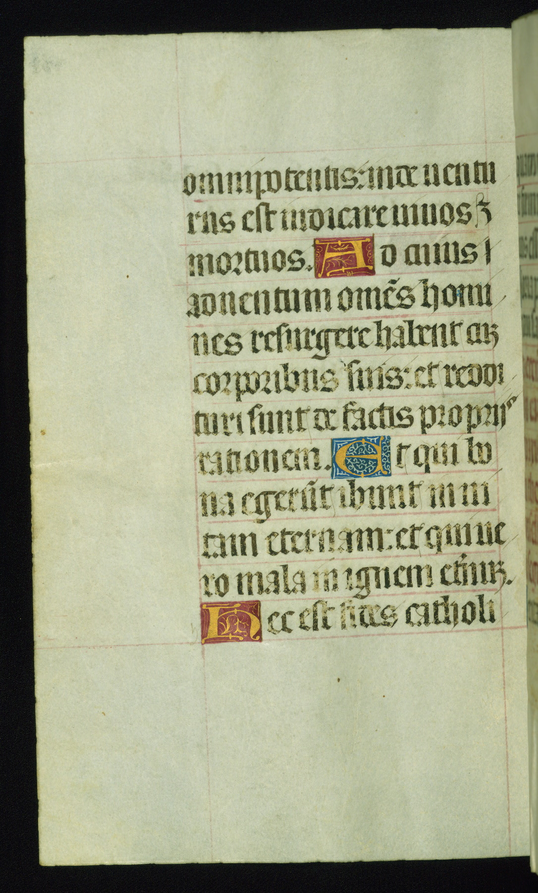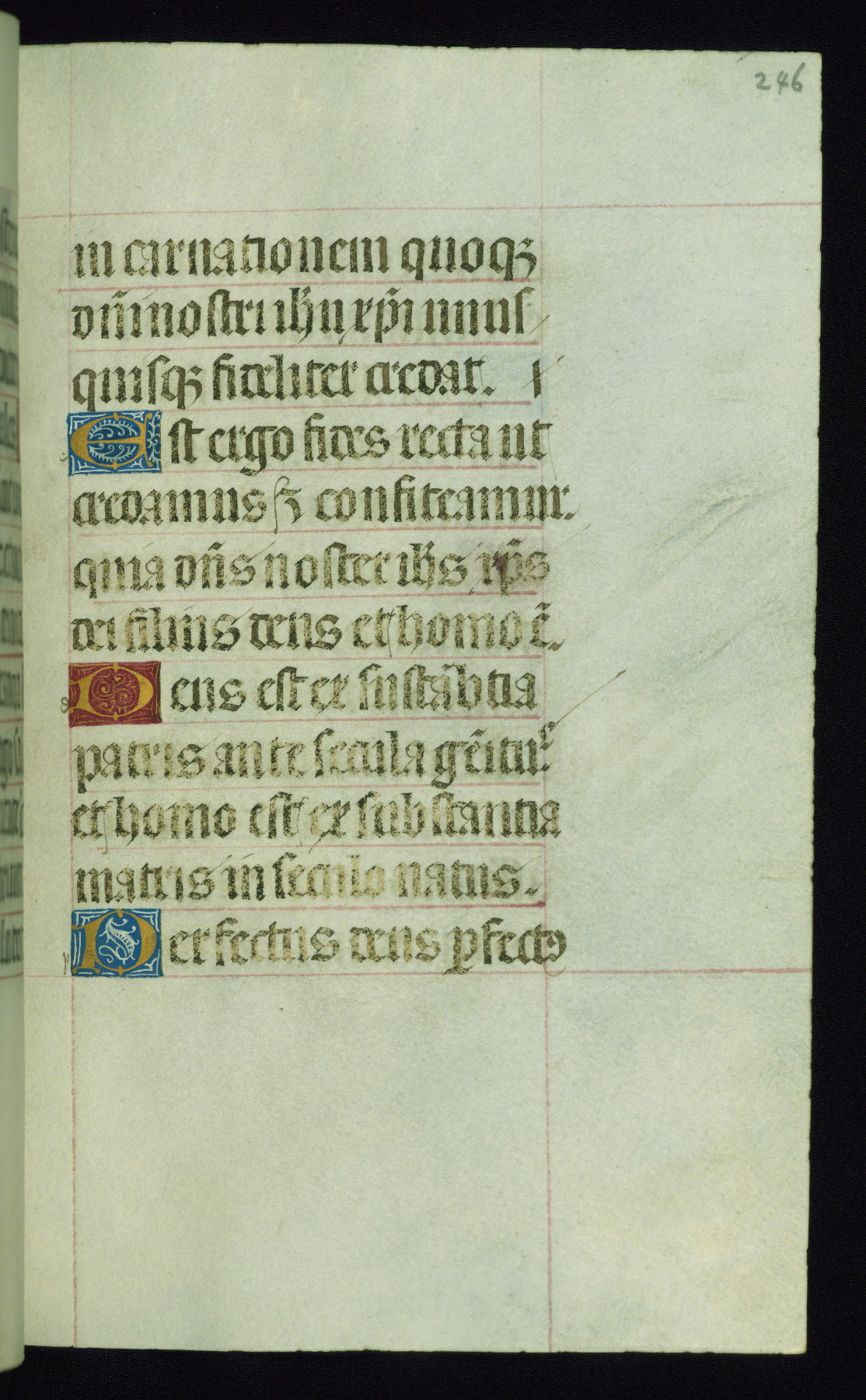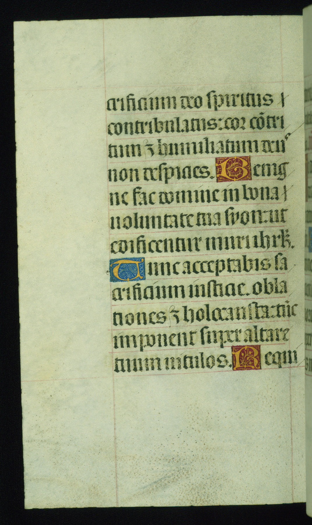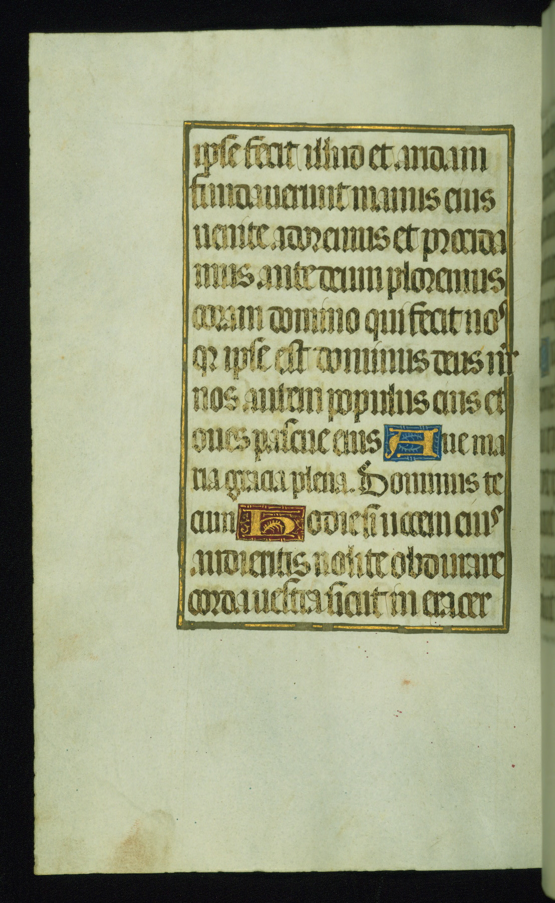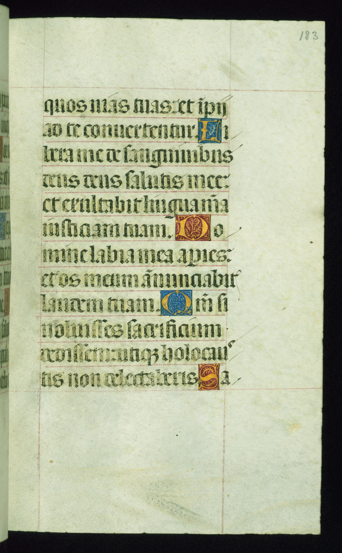 This book of hours was produced ca. 1510-1520 for a member of the Catalonian Almugavar (or AlmogĂ ver) family, whose coat of arms appears throughout the manuscript in the borders of the lavish full-page miniatures. There are twenty-six full-page polychrome miniatures (three are missing), of which six were removed from the original quire structure after portions of the miniatures were excised, and then returned to the manuscript, having been pasted onto heavy card-stock folios. There are also eighteen full-page incipits, of which three include historiated vignettes, and numerous folios with elaborate floral motif borders. A significant number of feast days associated with Barcelona help reinforce the Spanish attribution of the manuscript, although the style of the decoration is clearly influenced by contemporary Flemish design.
