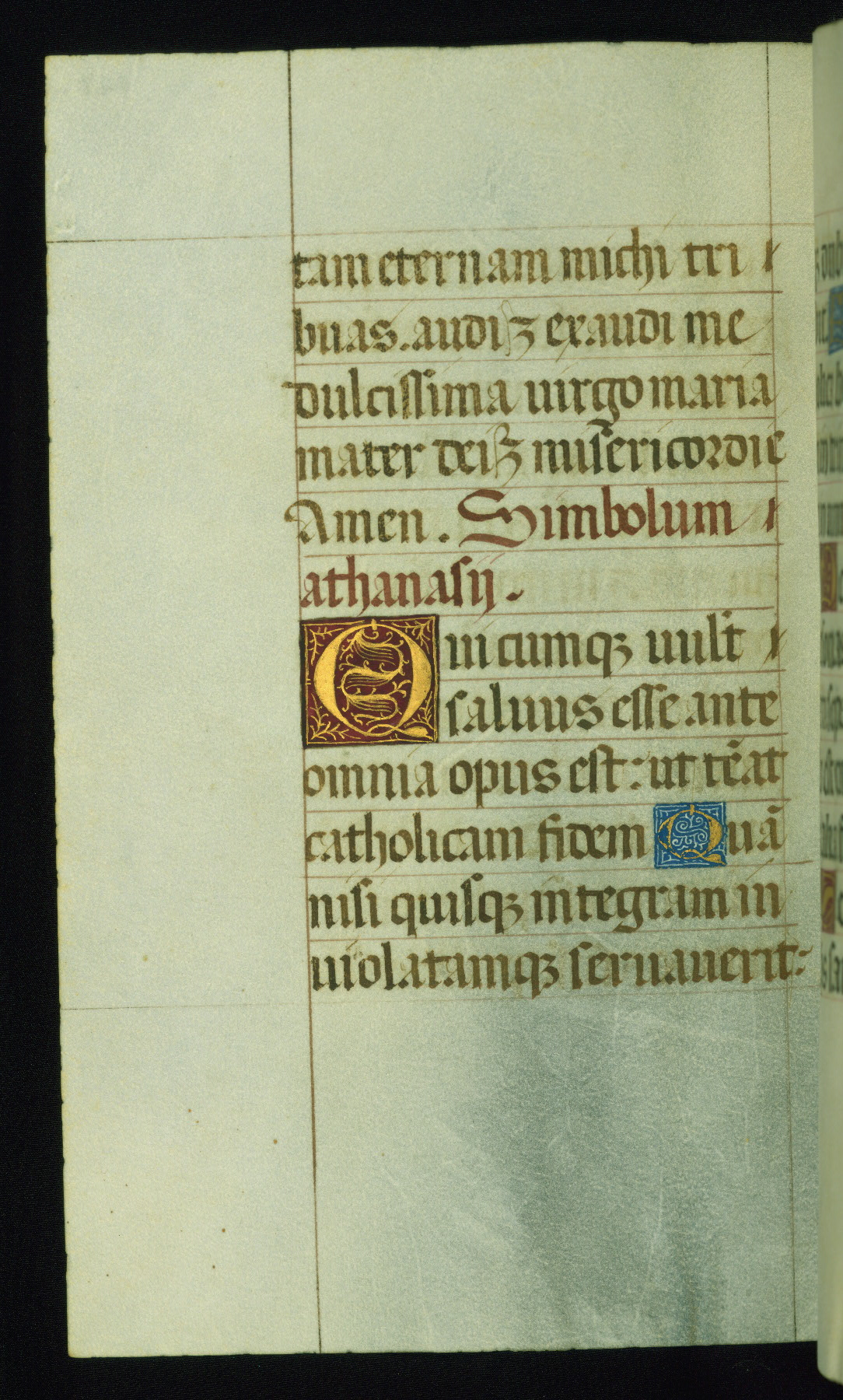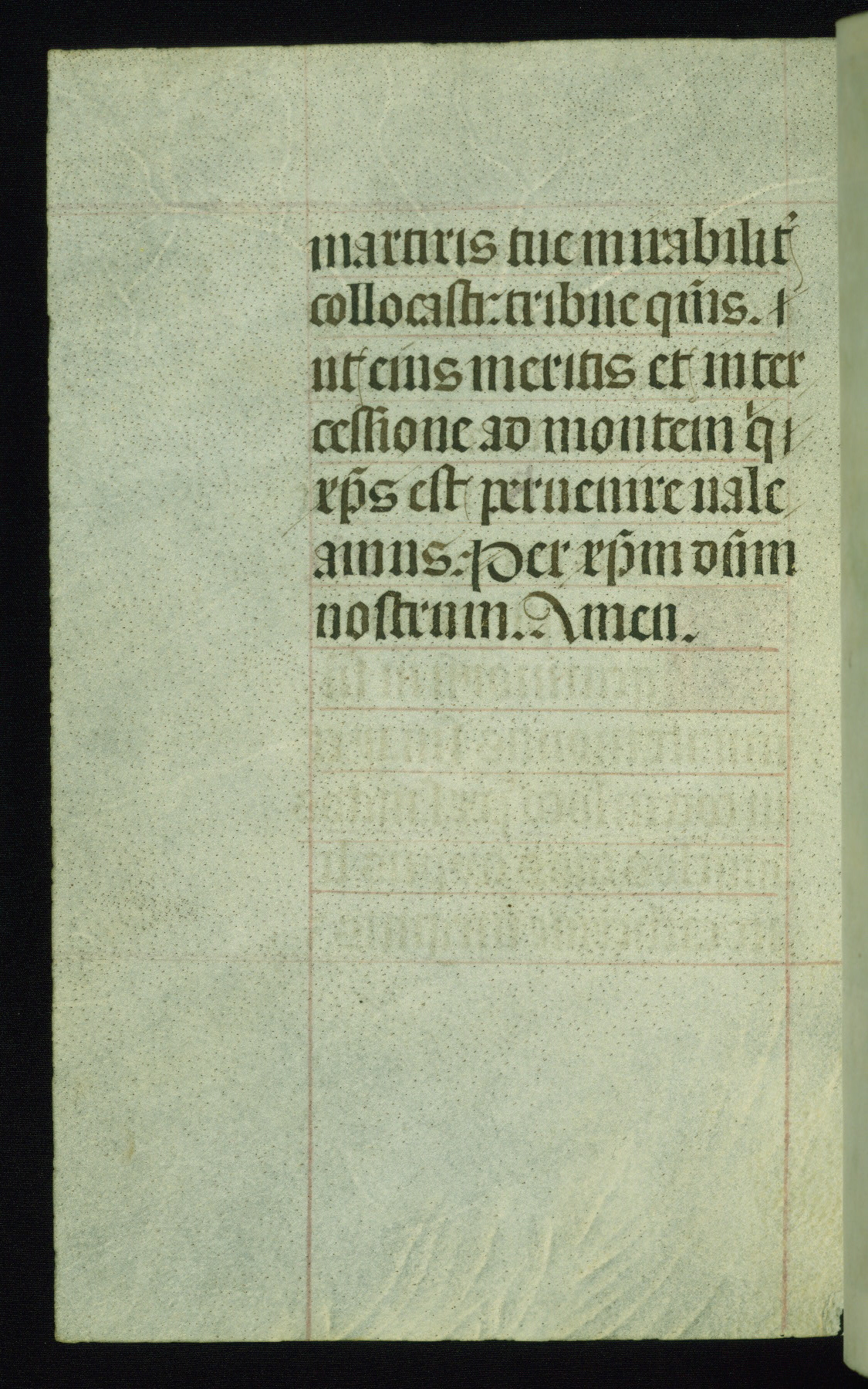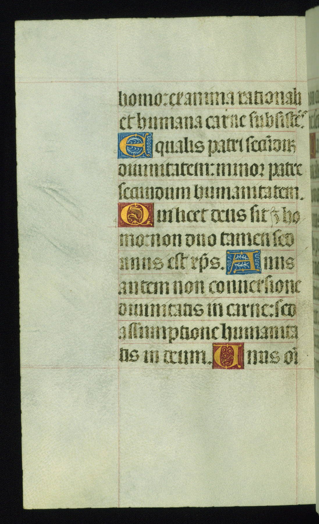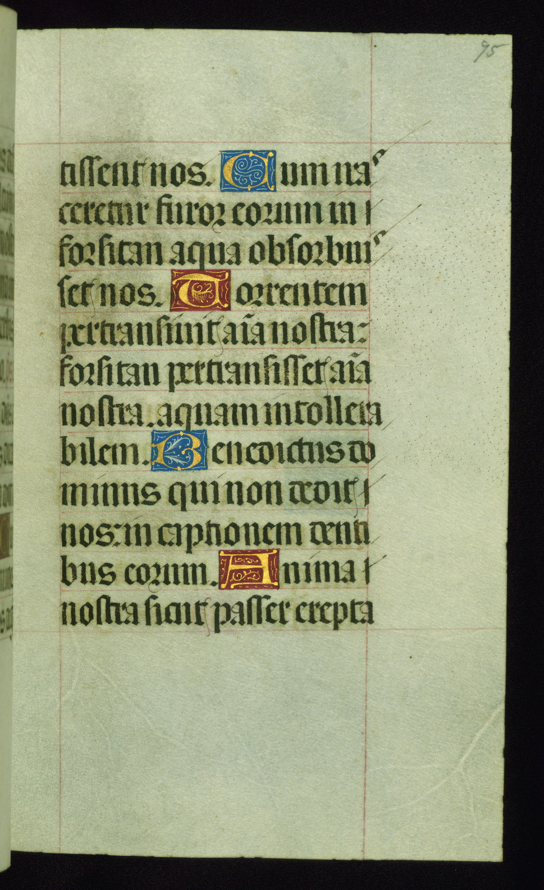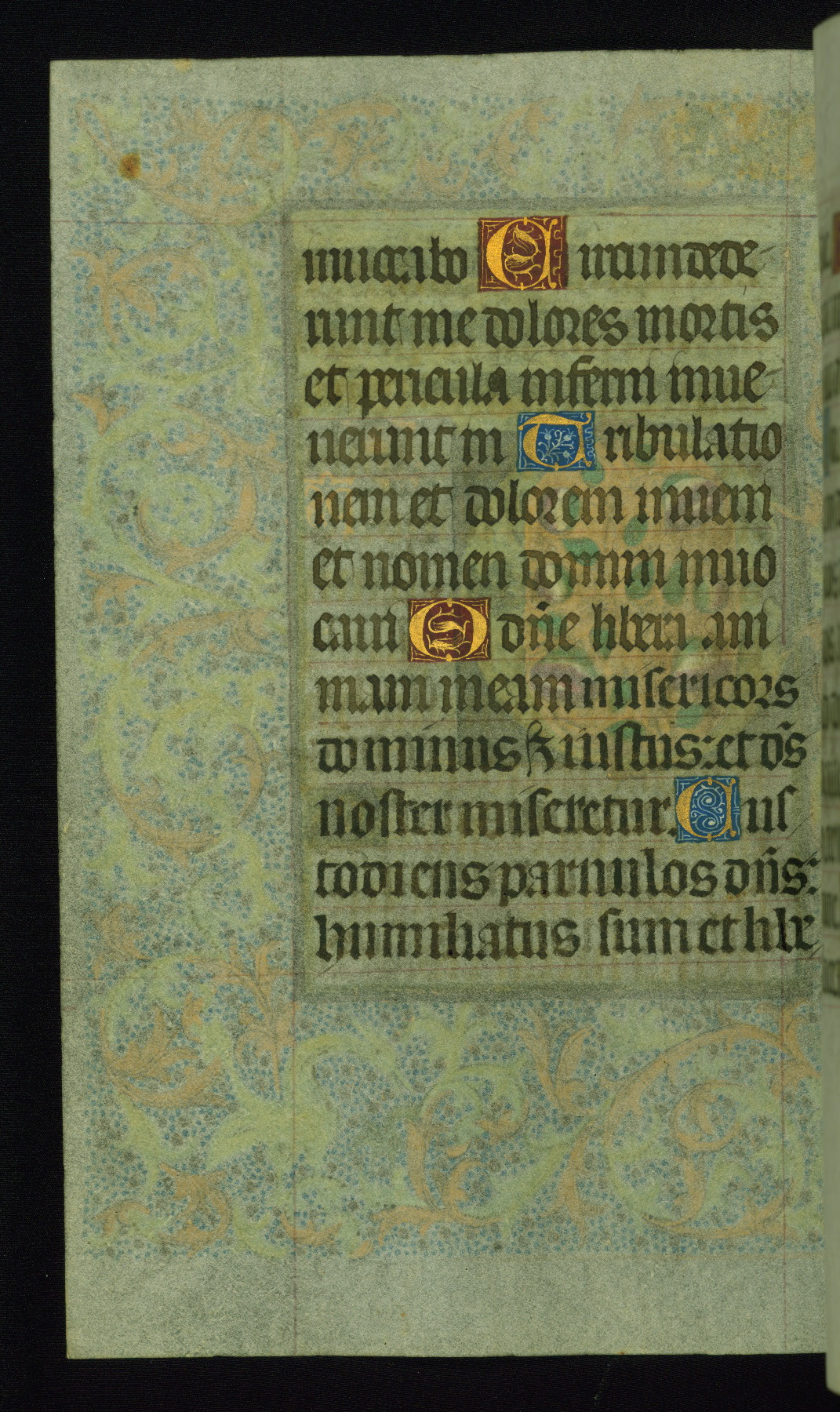 This book of hours was produced ca. 1510-1520 for a member of the Catalonian Almugavar (or AlmogĂ ver) family, whose coat of arms appears throughout the manuscript in the borders of the lavish full-page miniatures. There are twenty-six full-page polychrome miniatures (three are missing), of which six were removed from the original quire structure after portions of the miniatures were excised, and then returned to the manuscript, having been pasted onto heavy card-stock folios. There are also eighteen full-page incipits, of which three include historiated vignettes, and numerous folios with elaborate floral motif borders. A significant number of feast days associated with Barcelona help reinforce the Spanish attribution of the manuscript, although the style of the decoration is clearly influenced by contemporary Flemish design.