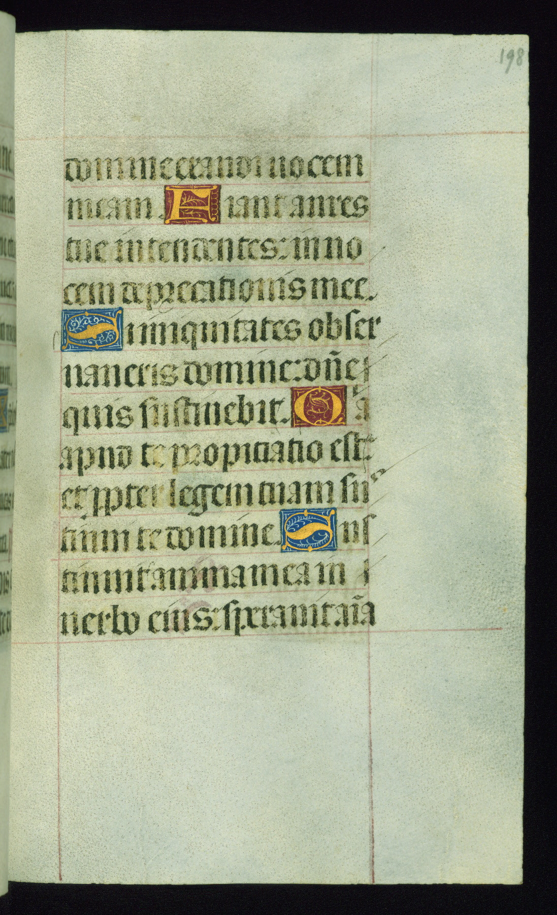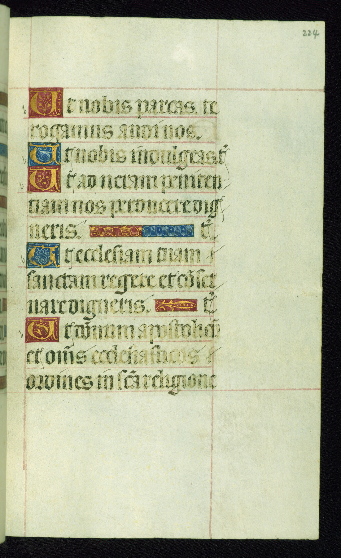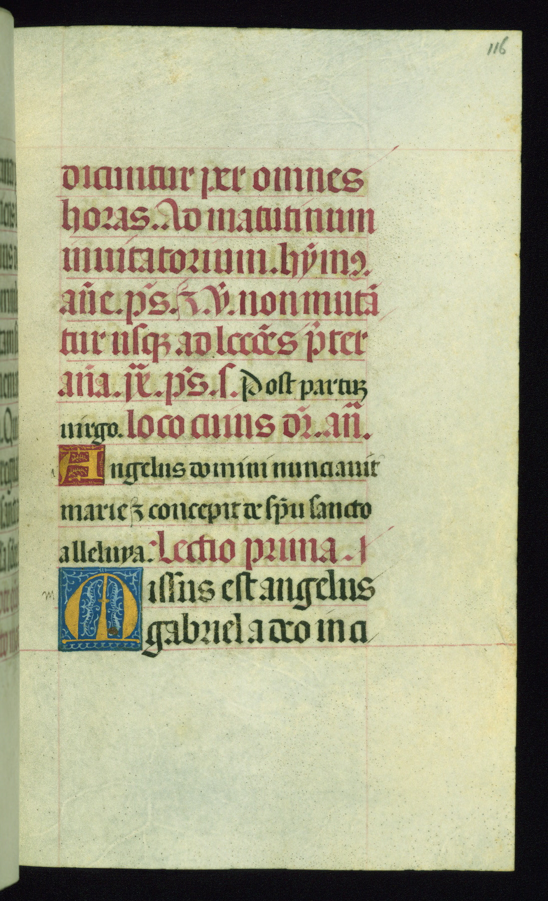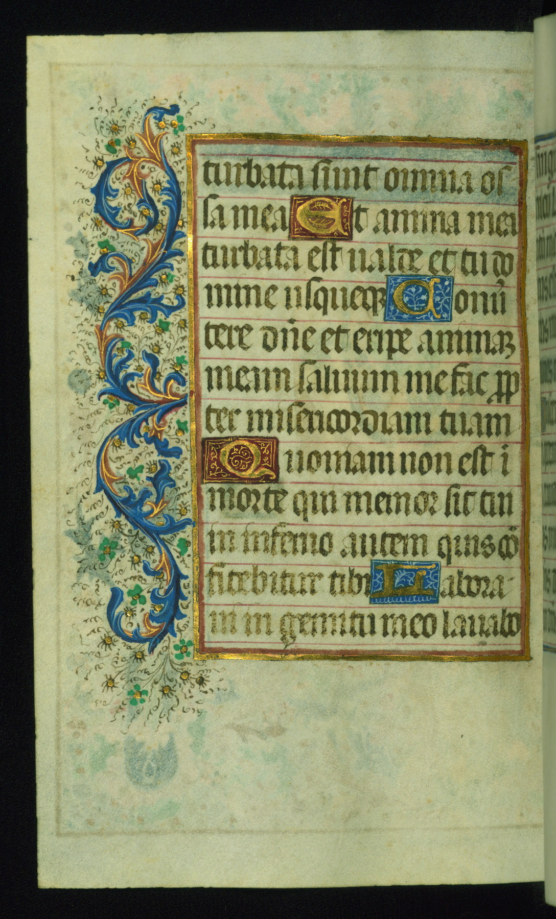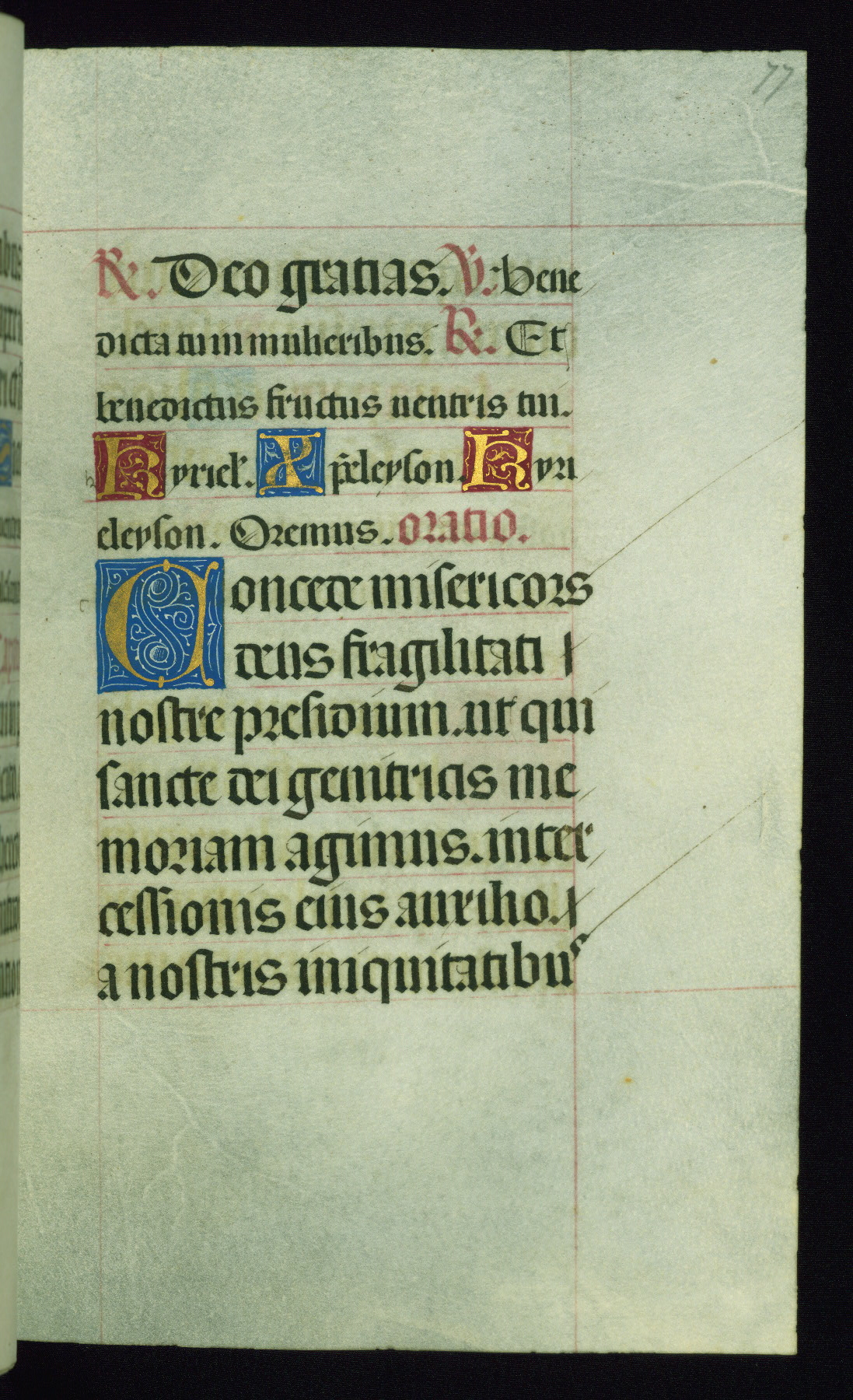 This book of hours was produced ca. 1510-1520 for a member of the Catalonian Almugavar (or AlmogĂ ver) family, whose coat of arms appears throughout the manuscript in the borders of the lavish full-page miniatures. There are twenty-six full-page polychrome miniatures (three are missing), of which six were removed from the original quire structure after portions of the miniatures were excised, and then returned to the manuscript, having been pasted onto heavy card-stock folios. There are also eighteen full-page incipits, of which three include historiated vignettes, and numerous folios with elaborate floral motif borders. A significant number of feast days associated with Barcelona help reinforce the Spanish attribution of the manuscript, although the style of the decoration is clearly influenced by contemporary Flemish design.
