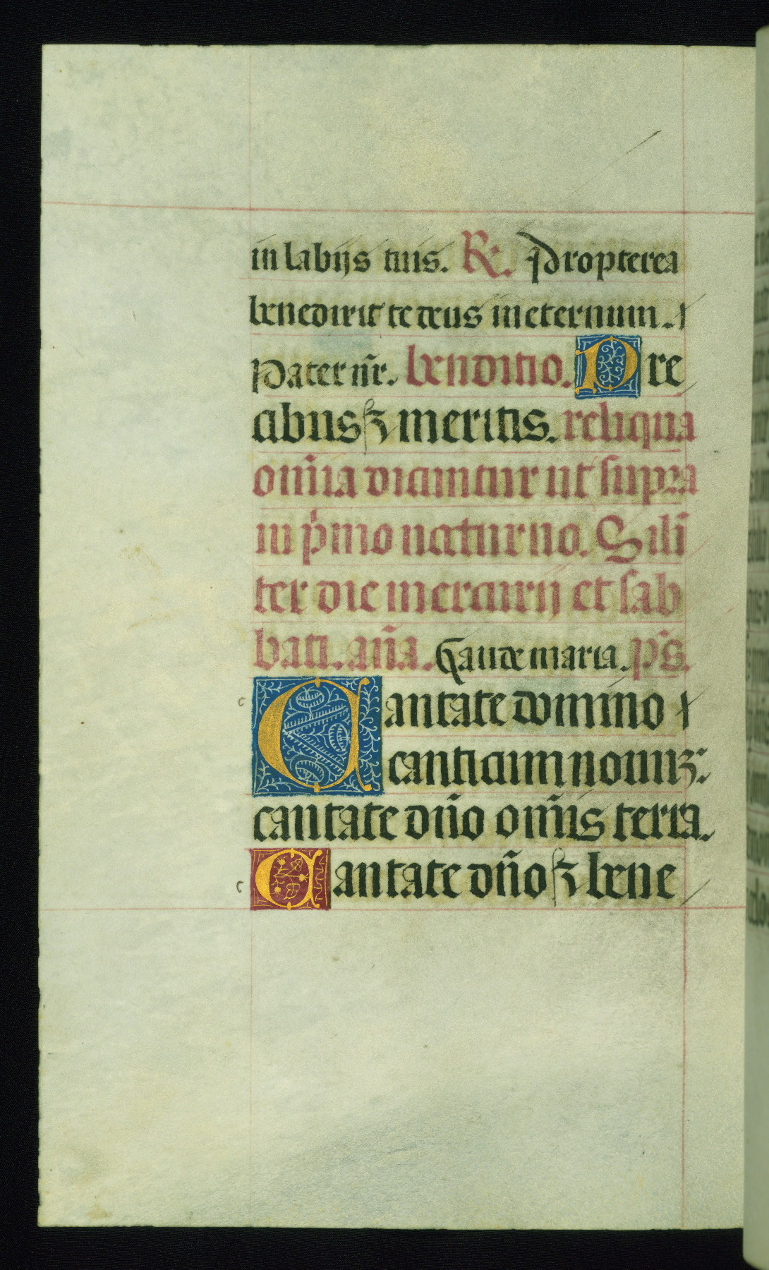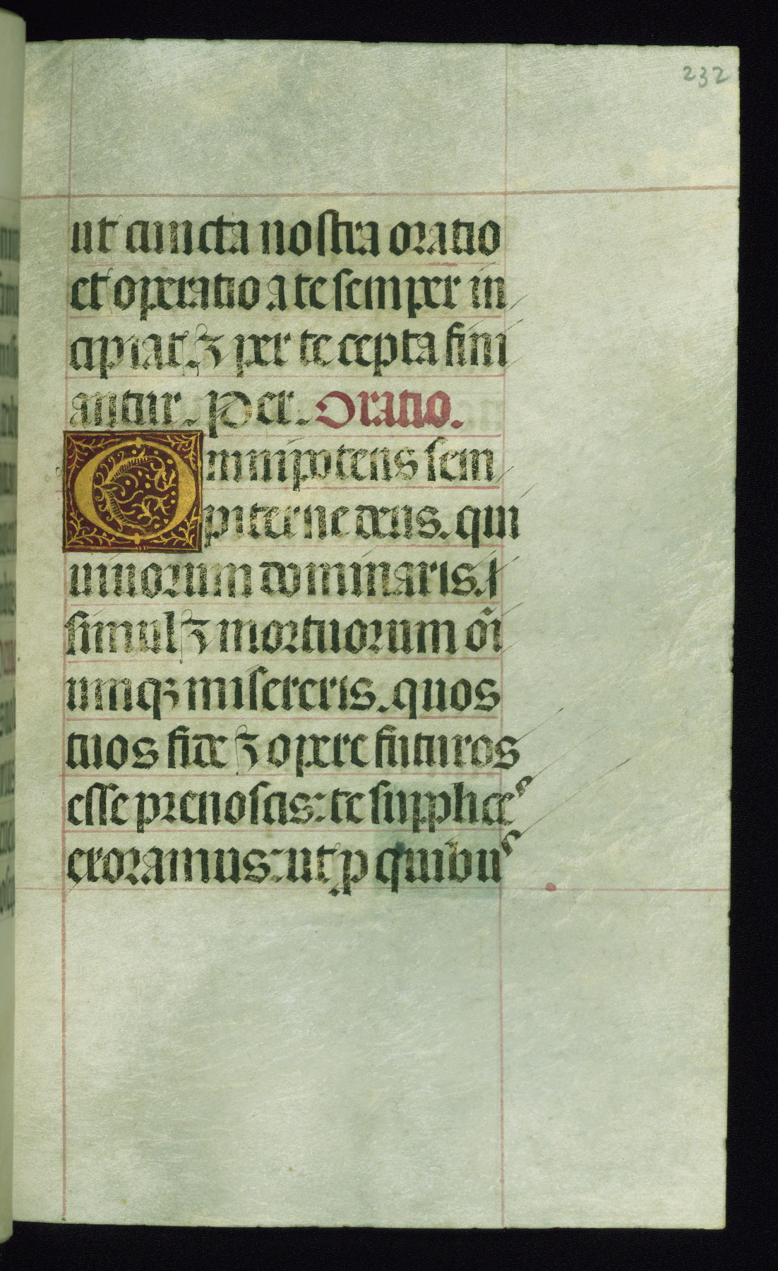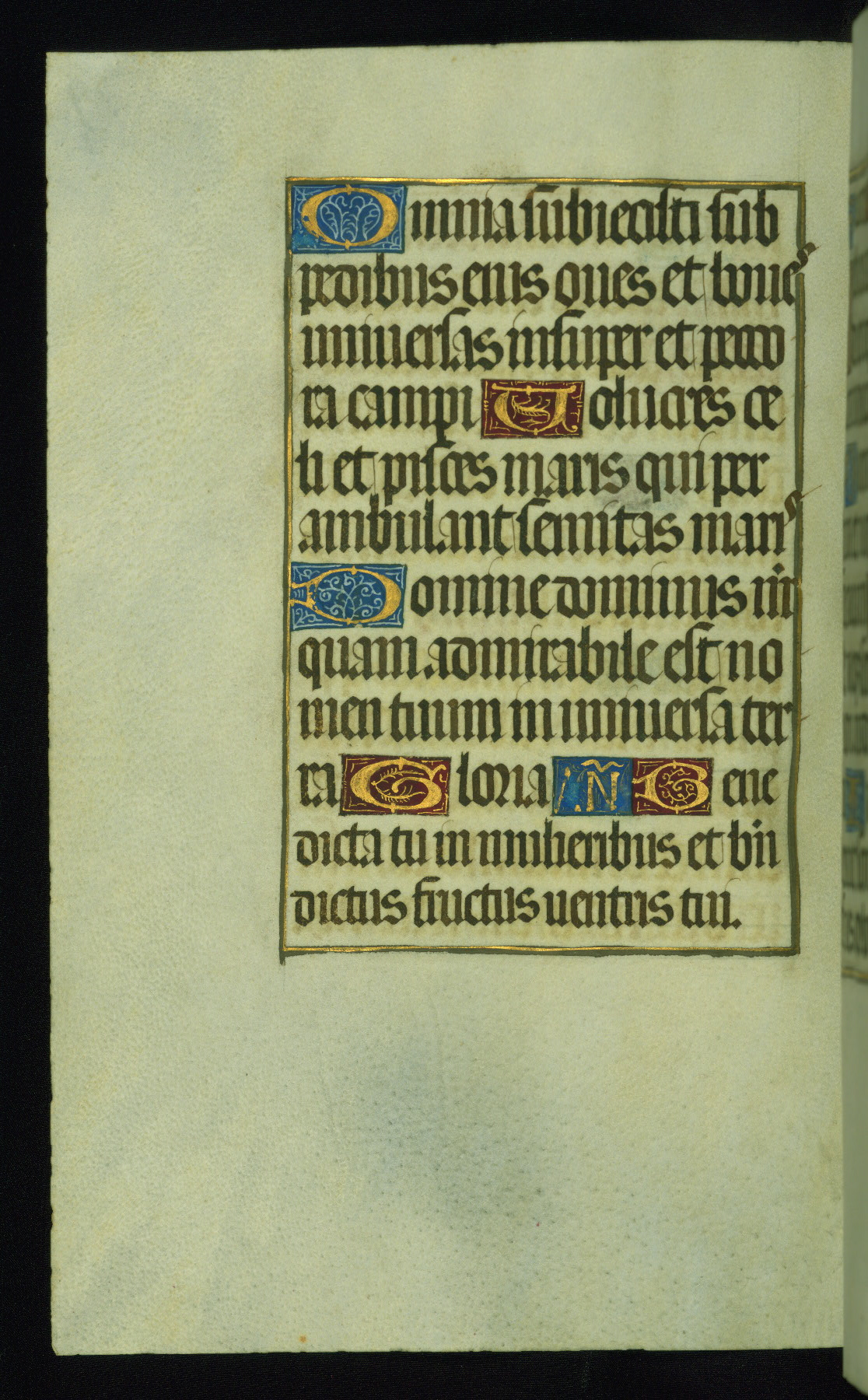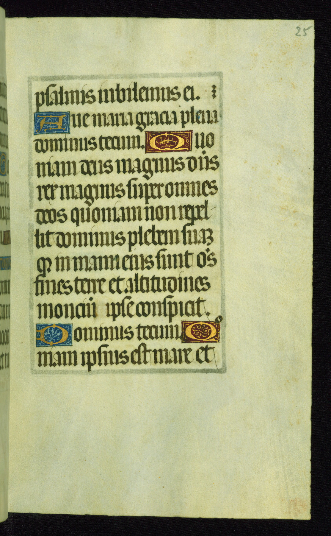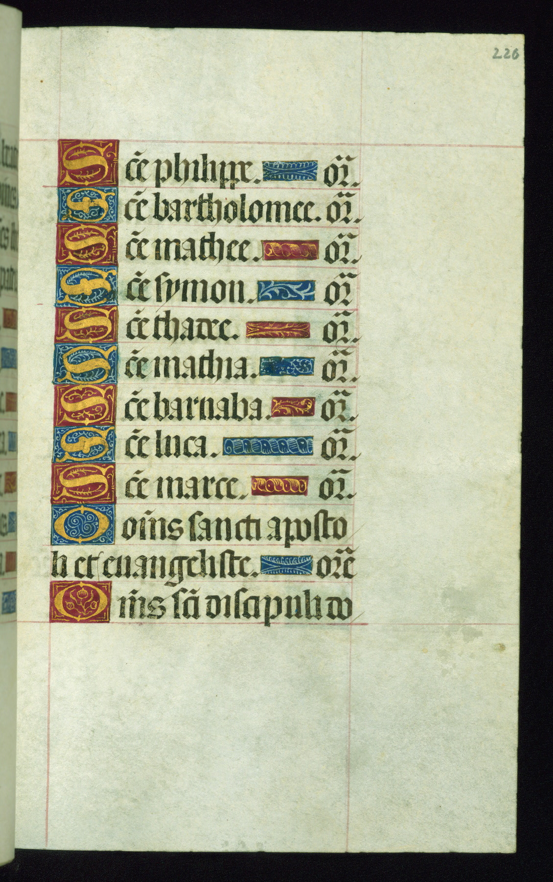 This book of hours was produced ca. 1510-1520 for a member of the Catalonian Almugavar (or AlmogĂ ver) family, whose coat of arms appears throughout the manuscript in the borders of the lavish full-page miniatures. There are twenty-six full-page polychrome miniatures (three are missing), of which six were removed from the original quire structure after portions of the miniatures were excised, and then returned to the manuscript, having been pasted onto heavy card-stock folios. There are also eighteen full-page incipits, of which three include historiated vignettes, and numerous folios with elaborate floral motif borders. A significant number of feast days associated with Barcelona help reinforce the Spanish attribution of the manuscript, although the style of the decoration is clearly influenced by contemporary Flemish design.