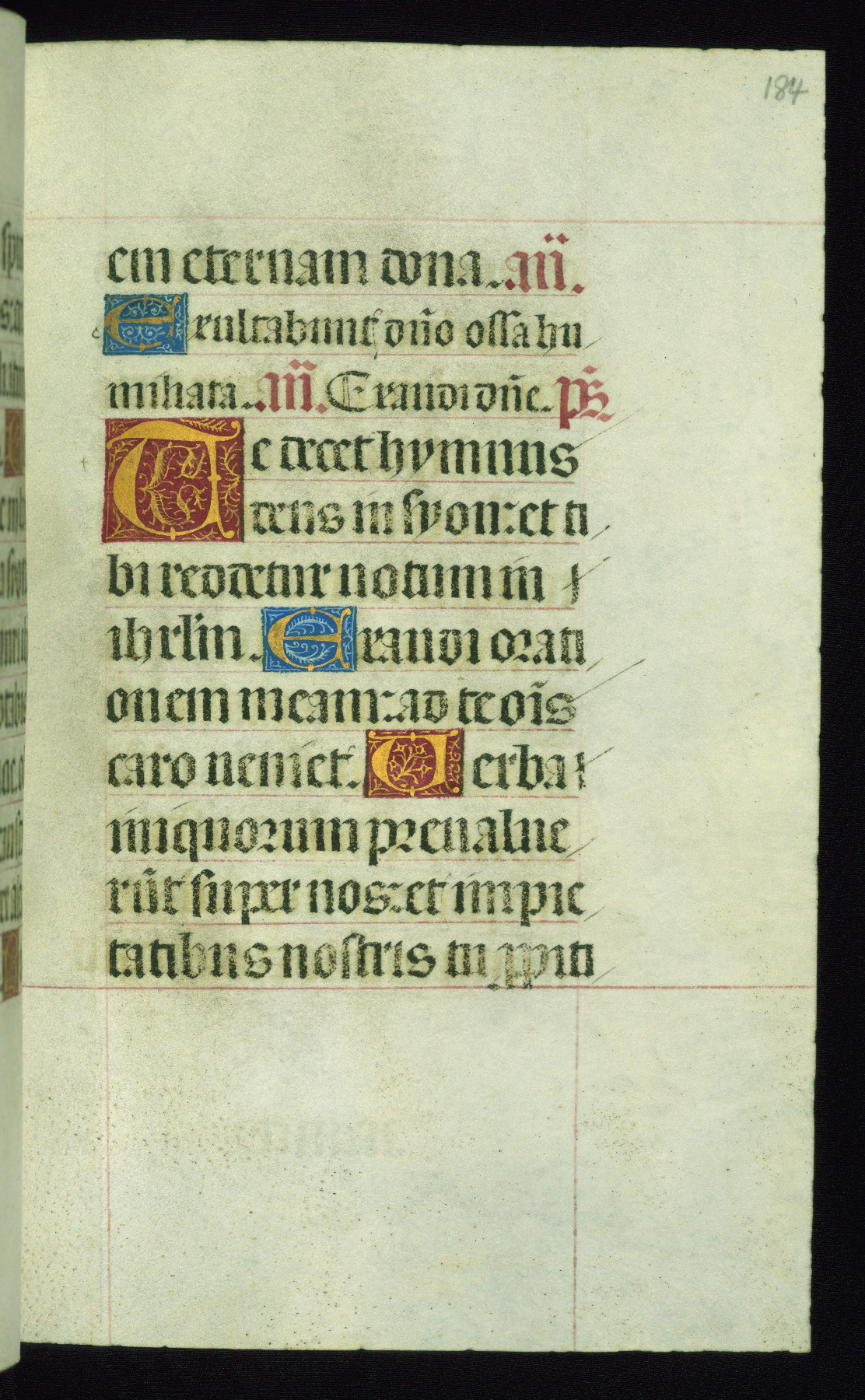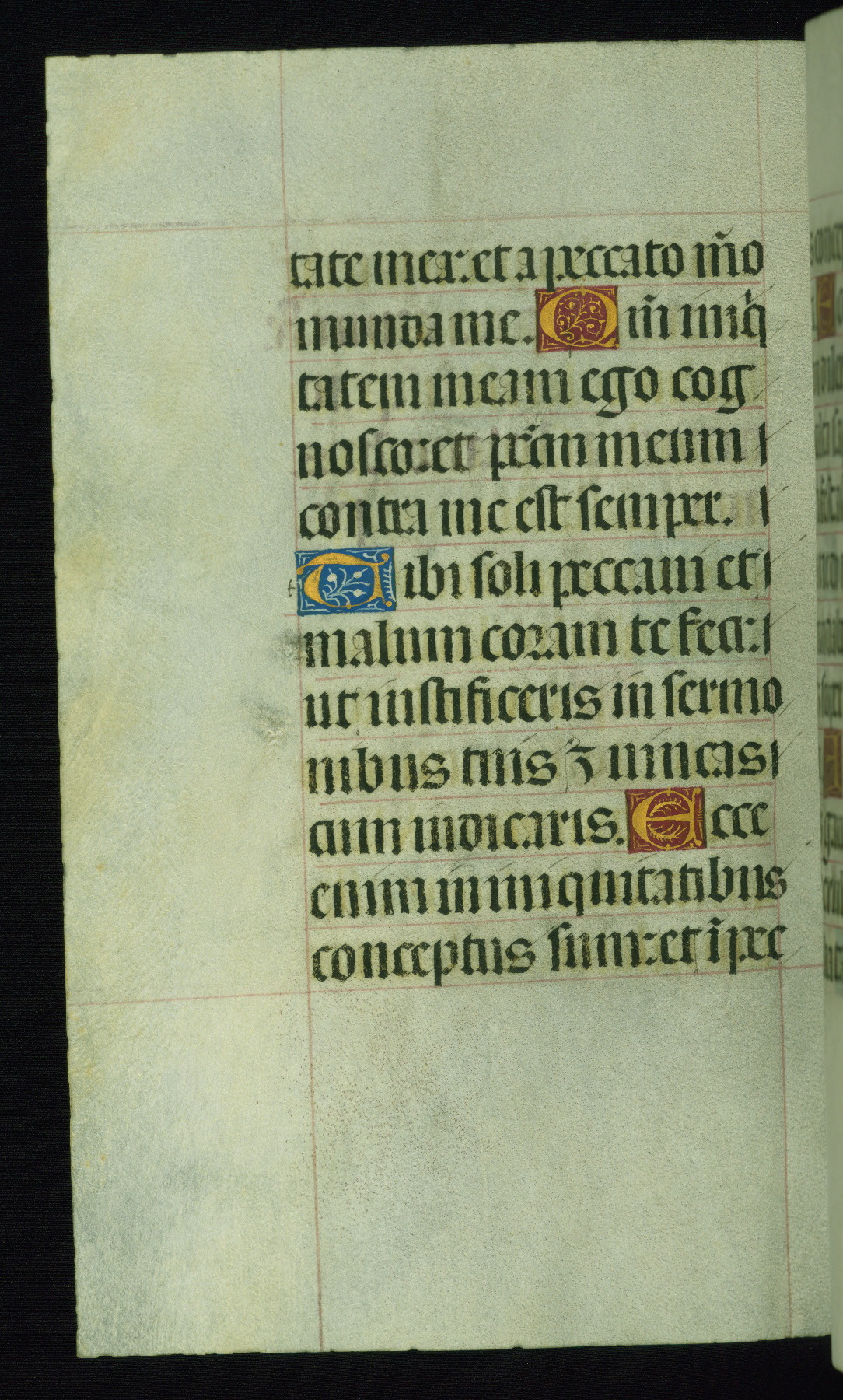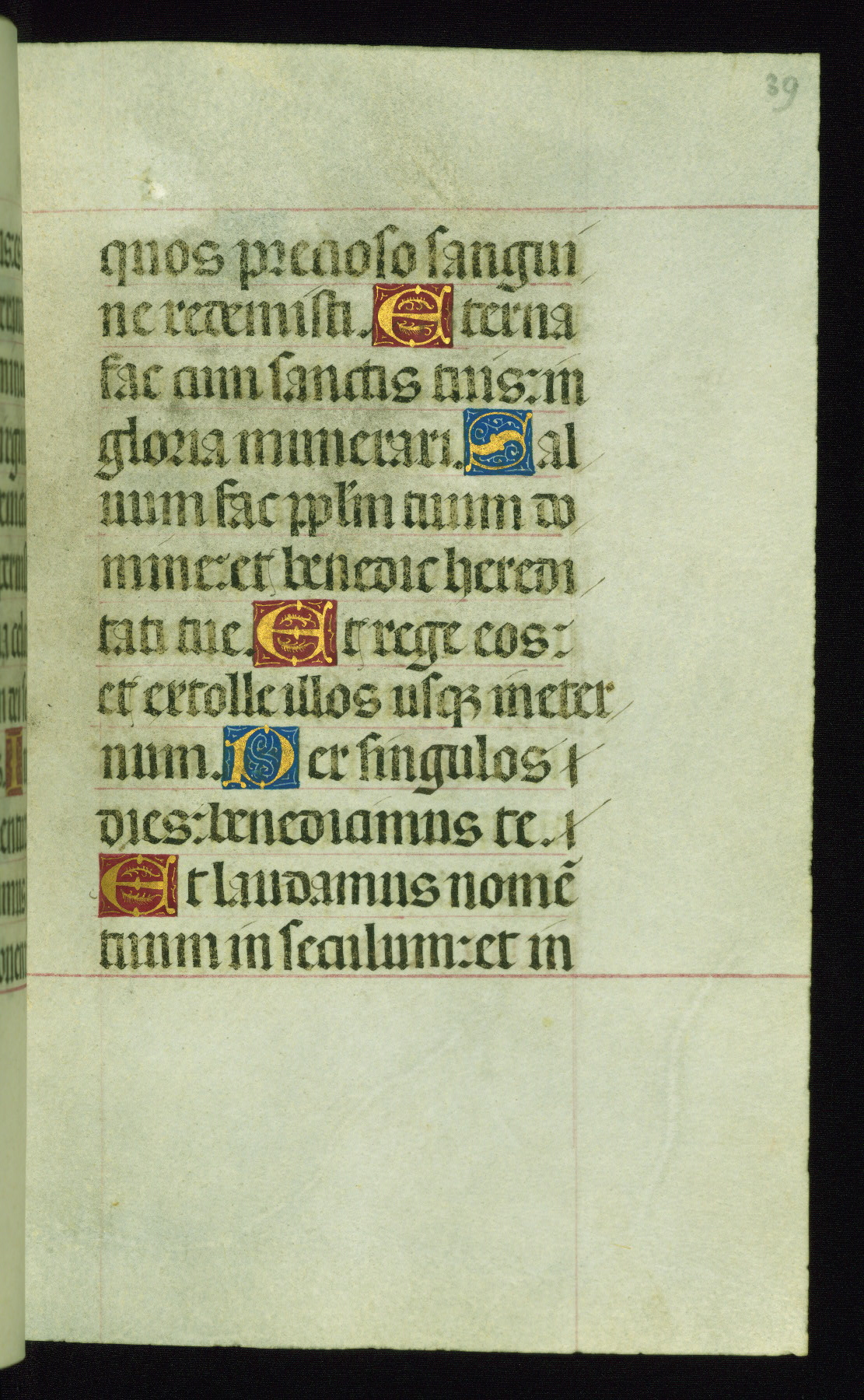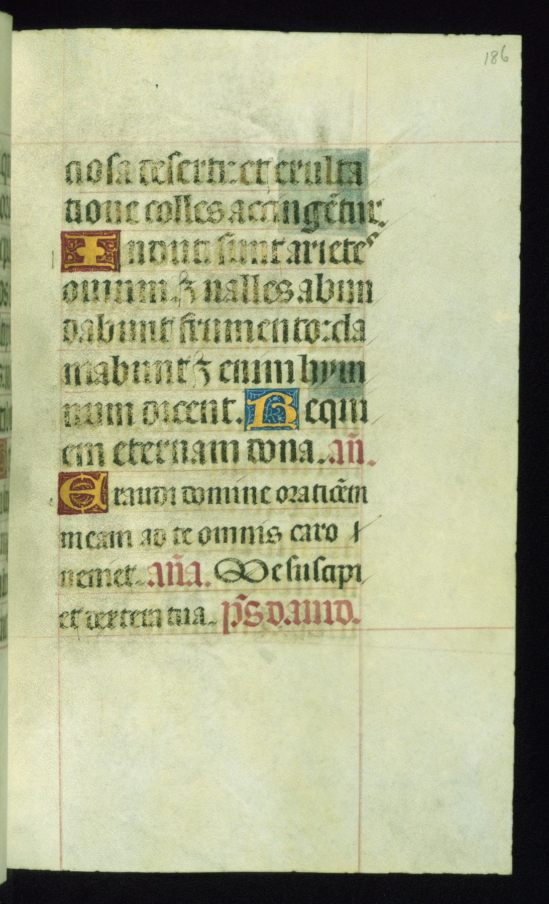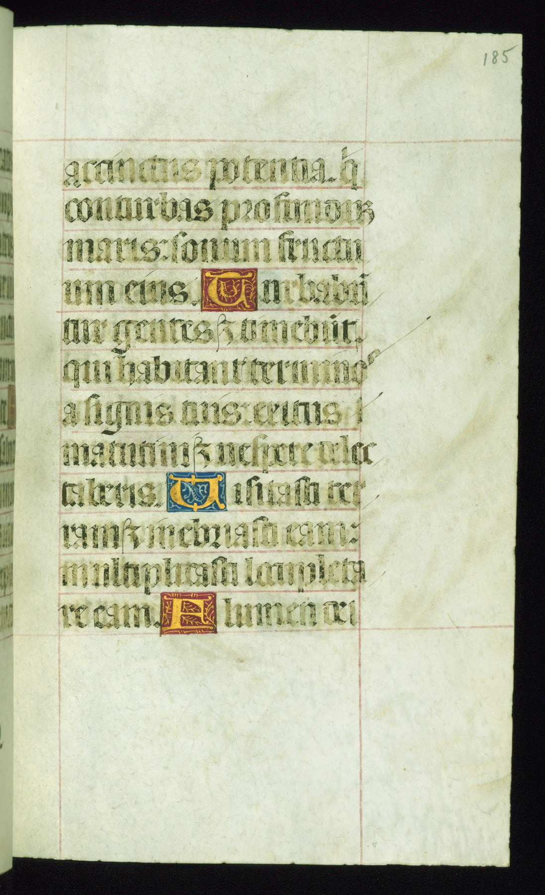 This book of hours was produced ca. 1510-1520 for a member of the Catalonian Almugavar (or AlmogĂ ver) family, whose coat of arms appears throughout the manuscript in the borders of the lavish full-page miniatures. There are twenty-six full-page polychrome miniatures (three are missing), of which six were removed from the original quire structure after portions of the miniatures were excised, and then returned to the manuscript, having been pasted onto heavy card-stock folios. There are also eighteen full-page incipits, of which three include historiated vignettes, and numerous folios with elaborate floral motif borders. A significant number of feast days associated with Barcelona help reinforce the Spanish attribution of the manuscript, although the style of the decoration is clearly influenced by contemporary Flemish design.