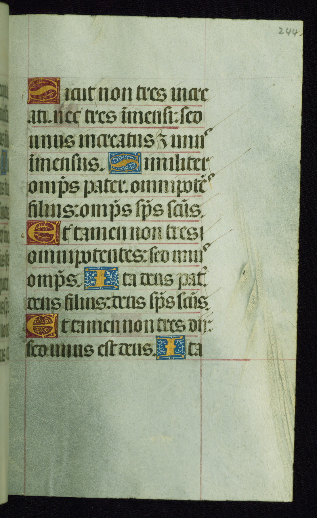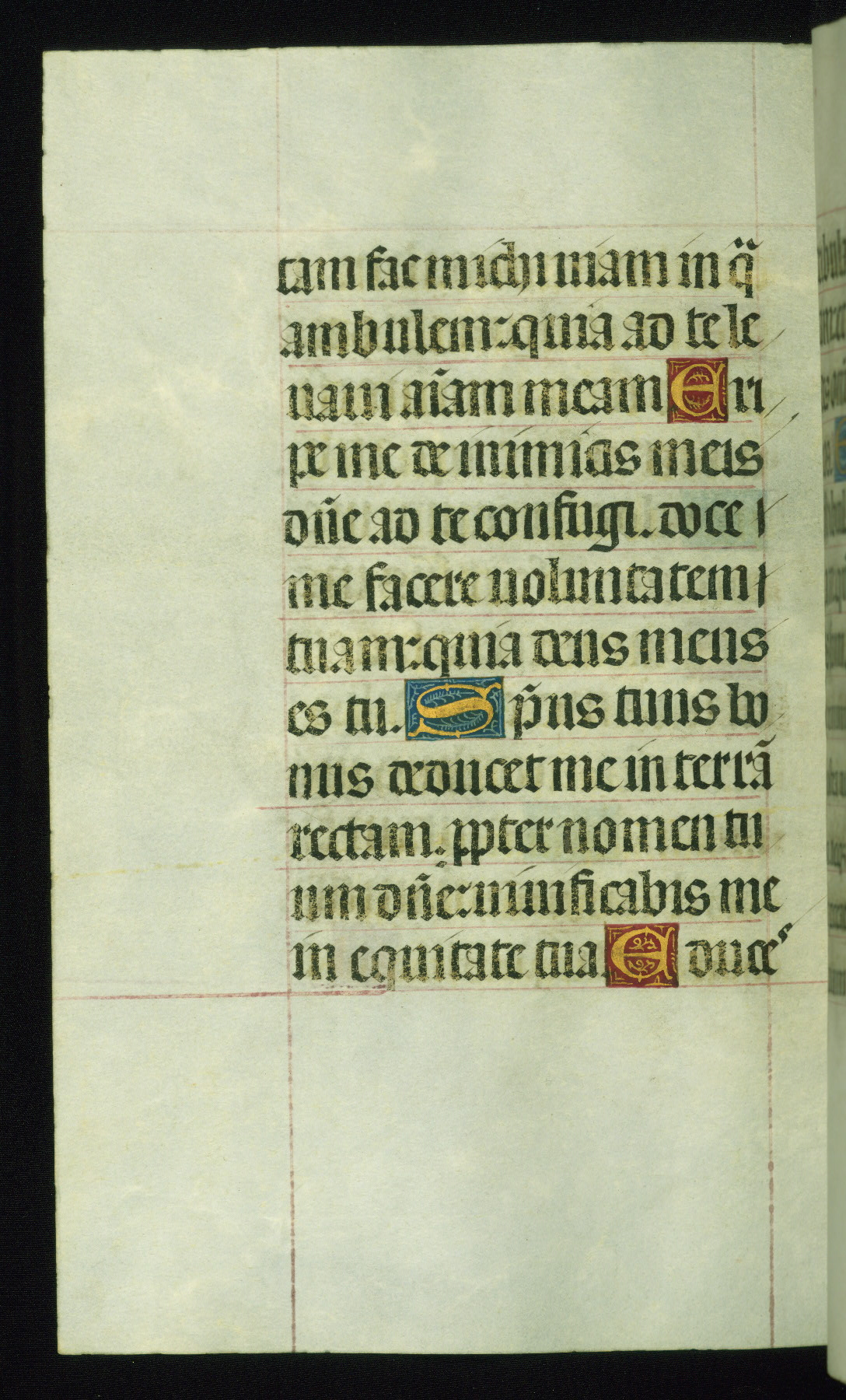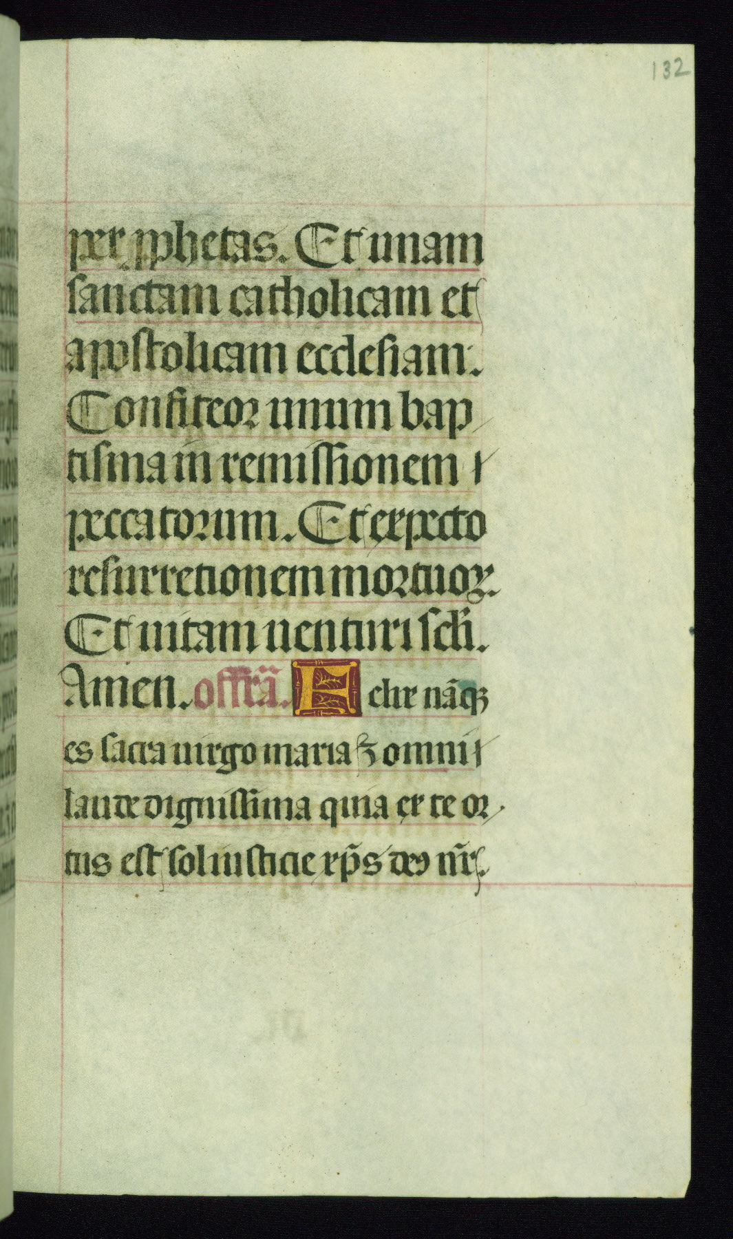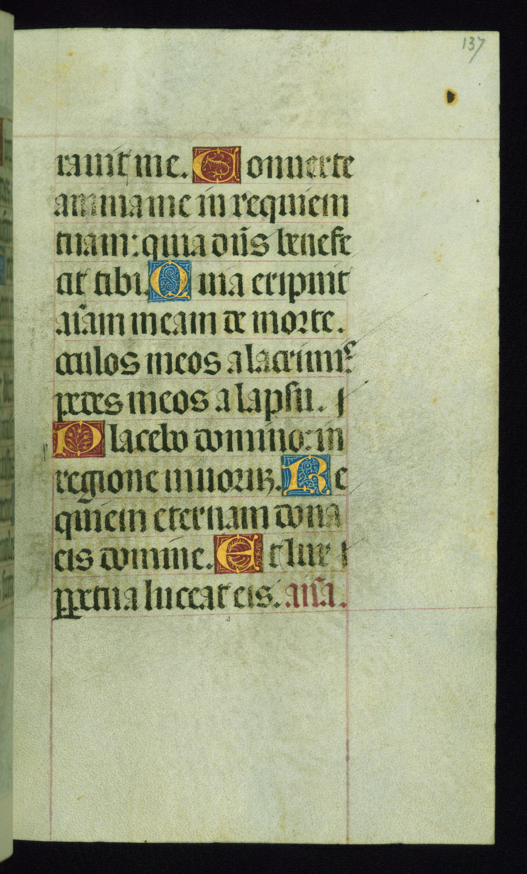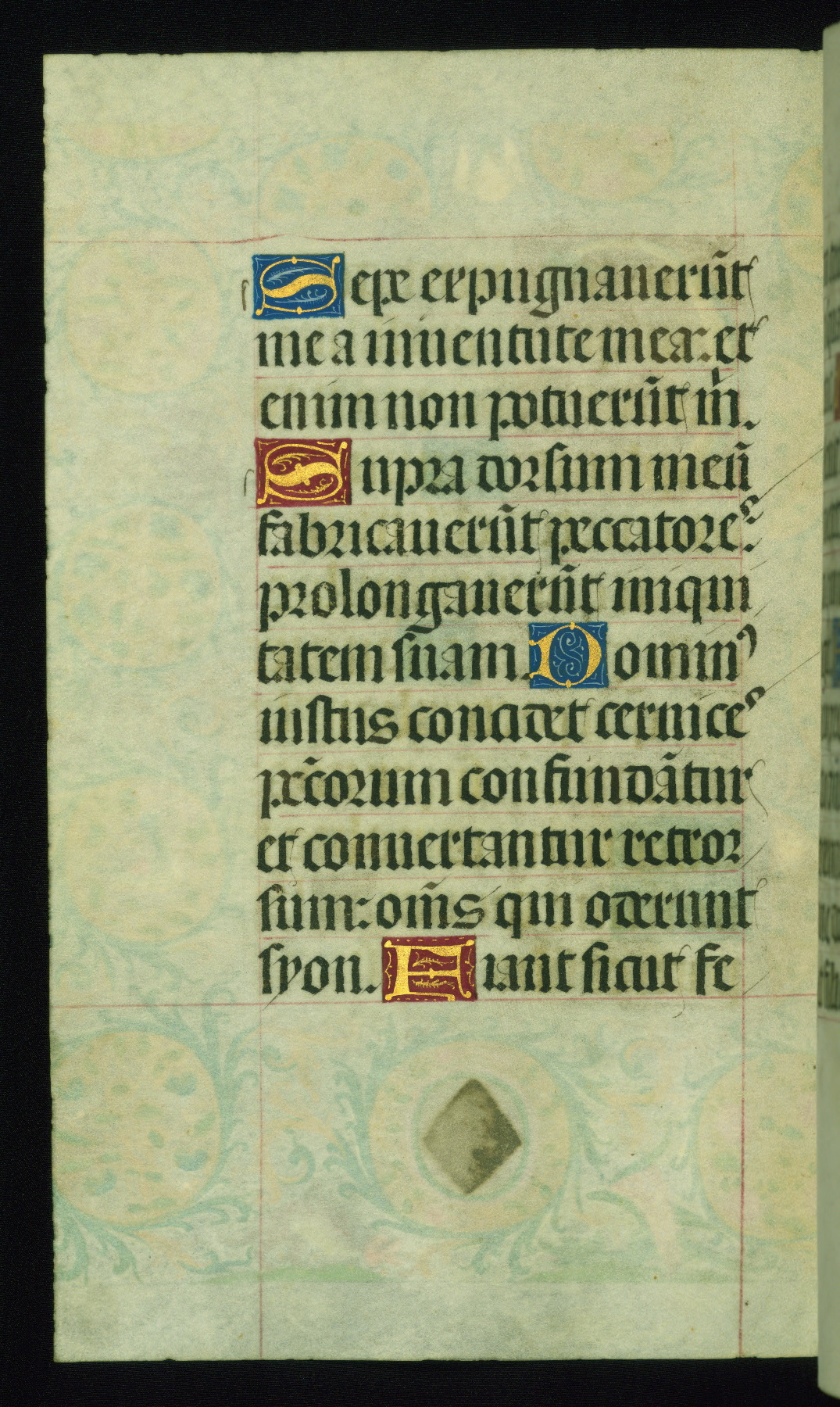 This book of hours was produced ca. 1510-1520 for a member of the Catalonian Almugavar (or AlmogĂ ver) family, whose coat of arms appears throughout the manuscript in the borders of the lavish full-page miniatures. There are twenty-six full-page polychrome miniatures (three are missing), of which six were removed from the original quire structure after portions of the miniatures were excised, and then returned to the manuscript, having been pasted onto heavy card-stock folios. There are also eighteen full-page incipits, of which three include historiated vignettes, and numerous folios with elaborate floral motif borders. A significant number of feast days associated with Barcelona help reinforce the Spanish attribution of the manuscript, although the style of the decoration is clearly influenced by contemporary Flemish design.