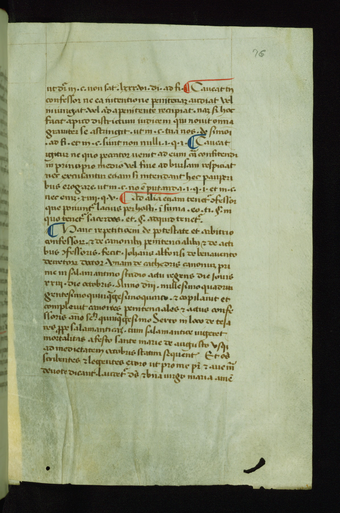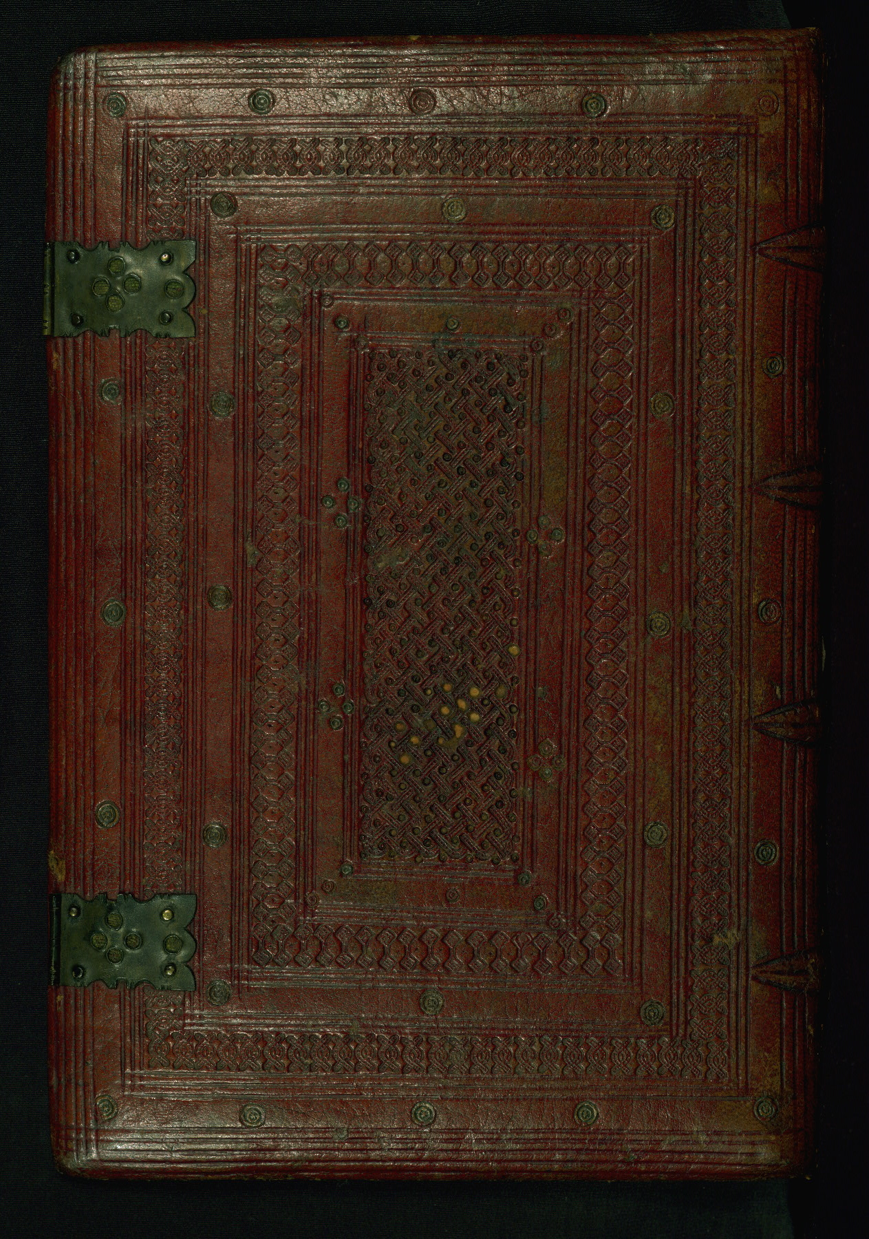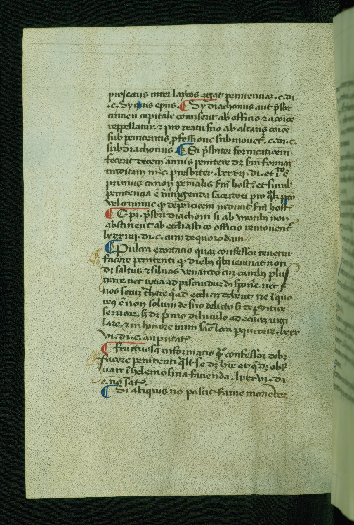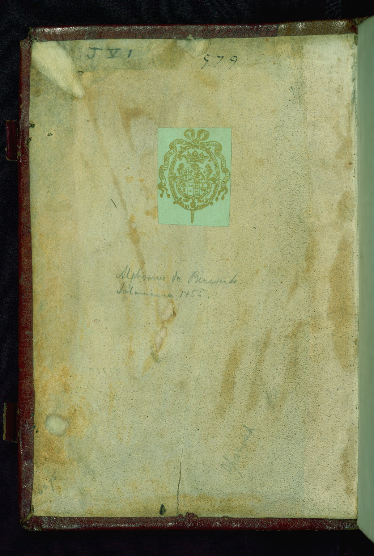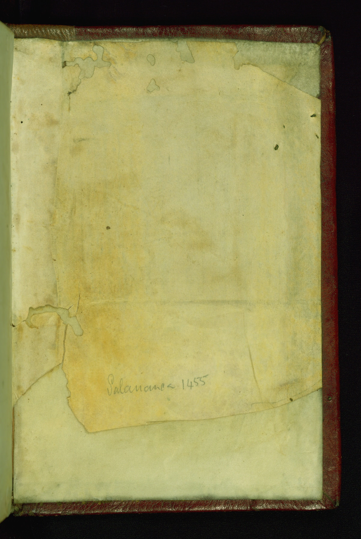 Alphonsus de Benavento wrote the treatise on penitential canons and acts of confession contained in this manuscript. The colophon informs us that Alphonsus was a professor of canon law at the university of Salmanca, Spain, and wrote this manuscript in 1456 in the nearby city of Tejares. At that time there was a pestilence in the city, for which Alphonsus asks for prayers. A historiated initial in which Alphonsus presents the treatise to a bishop begins the text, and the manuscript still retains its original stamped red leather binding.