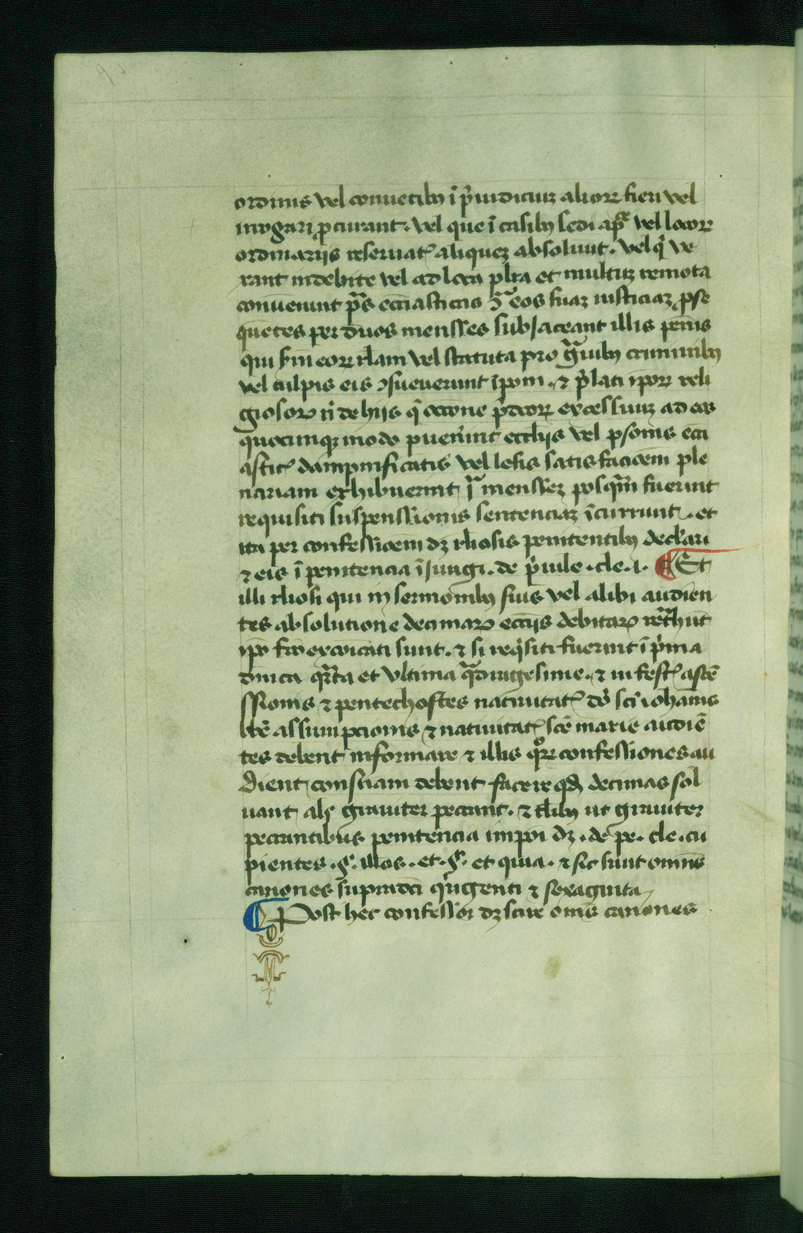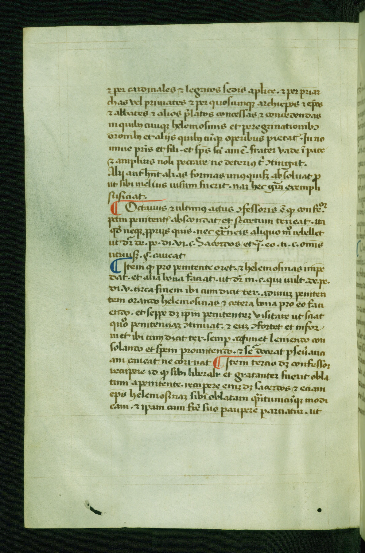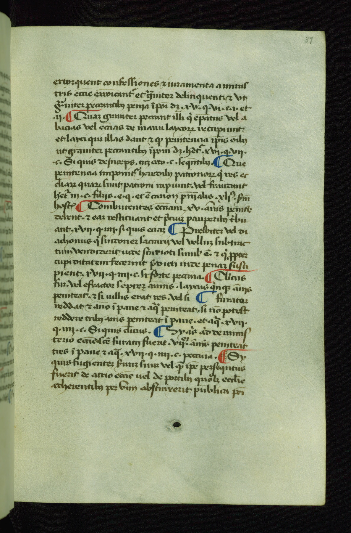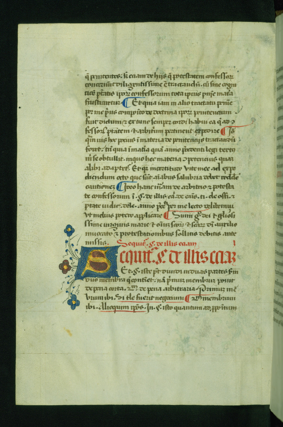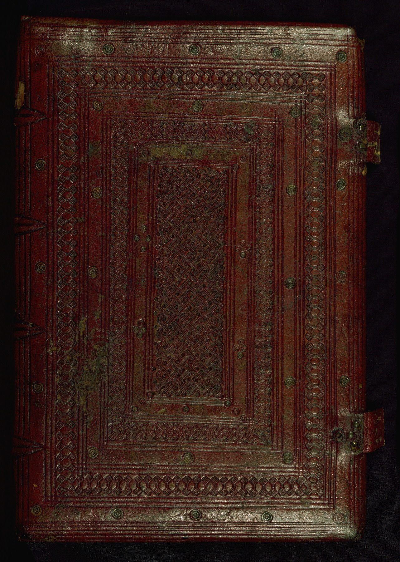 Alphonsus de Benavento wrote the treatise on penitential canons and acts of confession contained in this manuscript. The colophon informs us that Alphonsus was a professor of canon law at the university of Salmanca, Spain, and wrote this manuscript in 1456 in the nearby city of Tejares. At that time there was a pestilence in the city, for which Alphonsus asks for prayers. A historiated initial in which Alphonsus presents the treatise to a bishop begins the text, and the manuscript still retains its original stamped red leather binding.