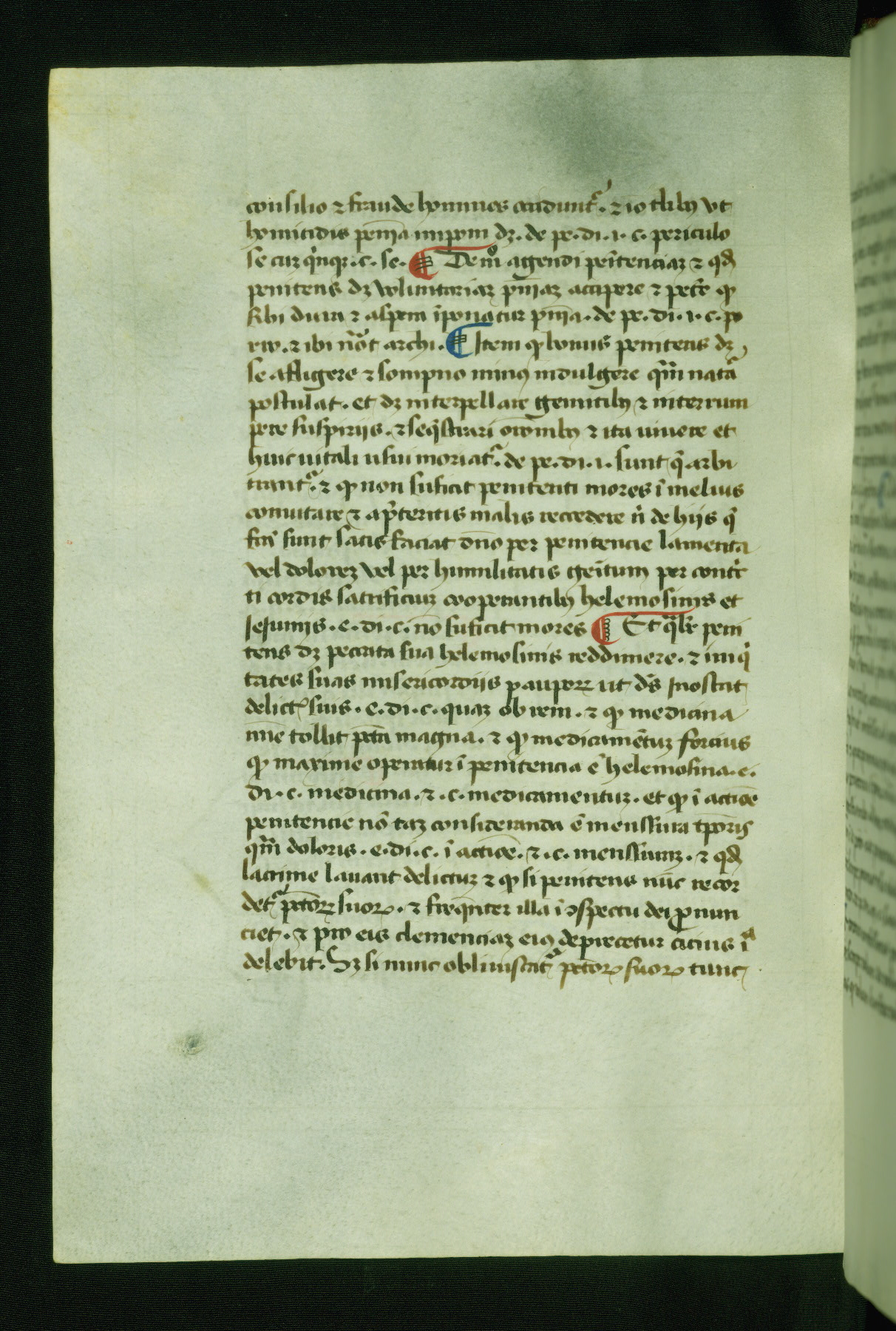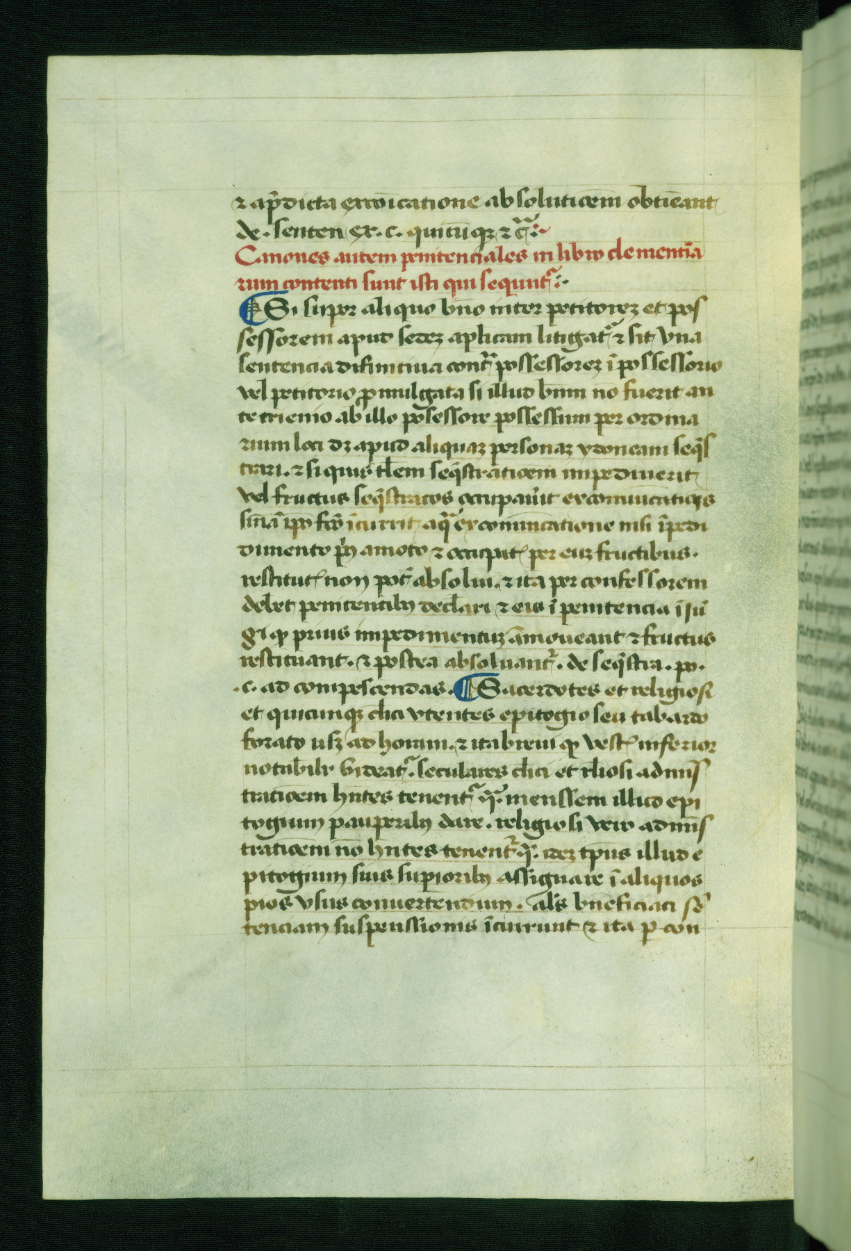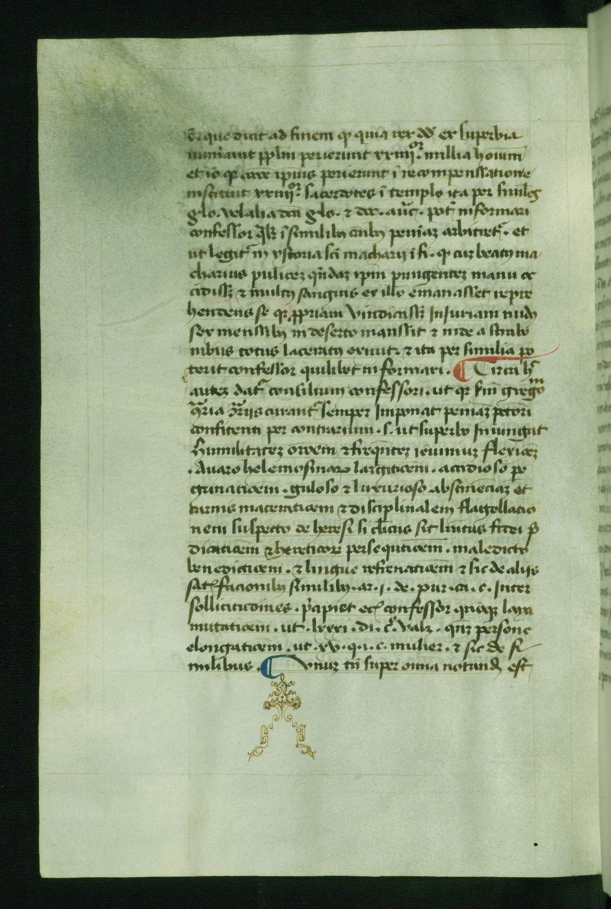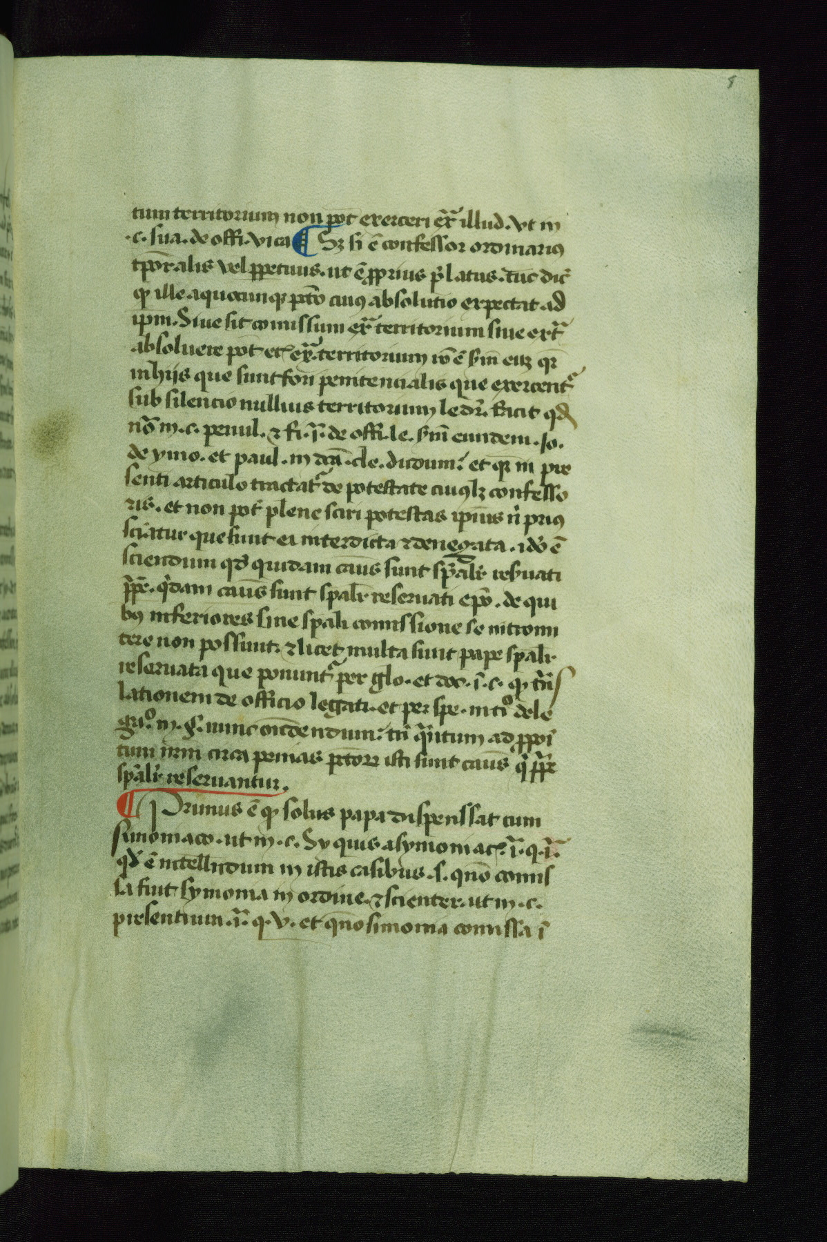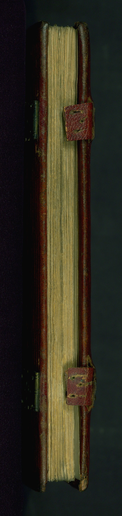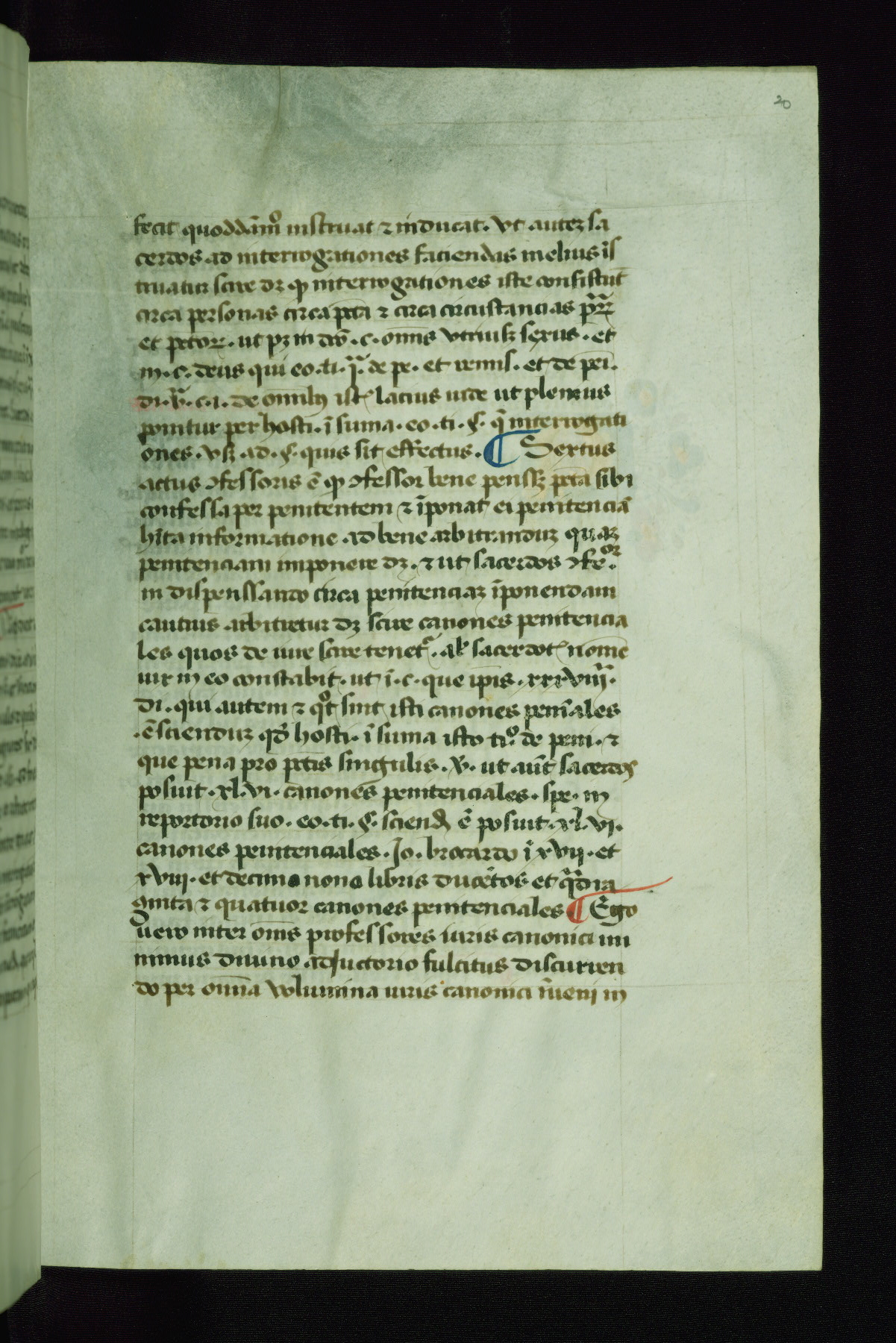 Alphonsus de Benavento wrote the treatise on penitential canons and acts of confession contained in this manuscript. The colophon informs us that Alphonsus was a professor of canon law at the university of Salmanca, Spain, and wrote this manuscript in 1456 in the nearby city of Tejares. At that time there was a pestilence in the city, for which Alphonsus asks for prayers. A historiated initial in which Alphonsus presents the treatise to a bishop begins the text, and the manuscript still retains its original stamped red leather binding.