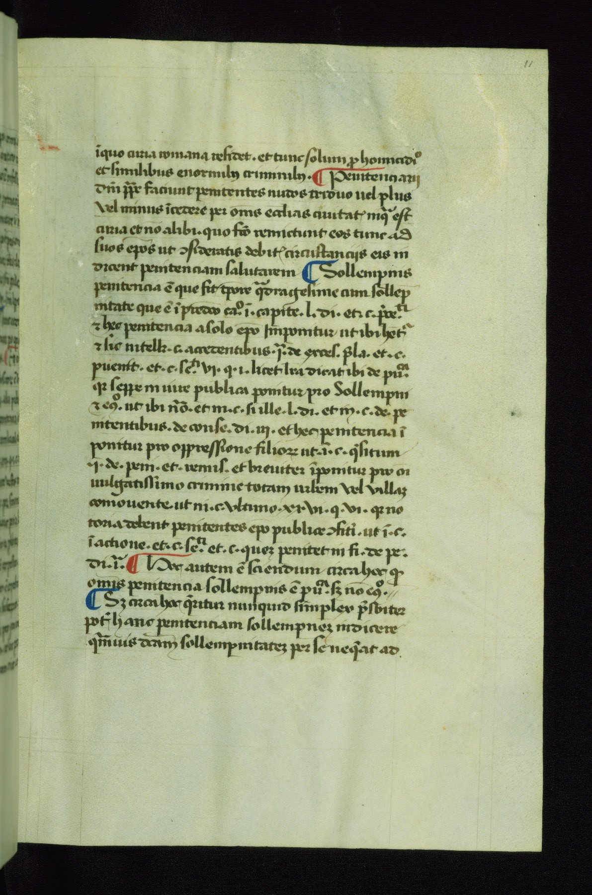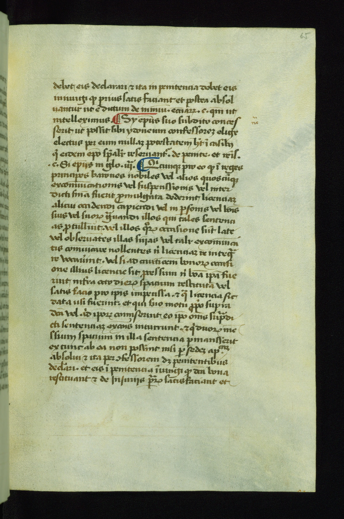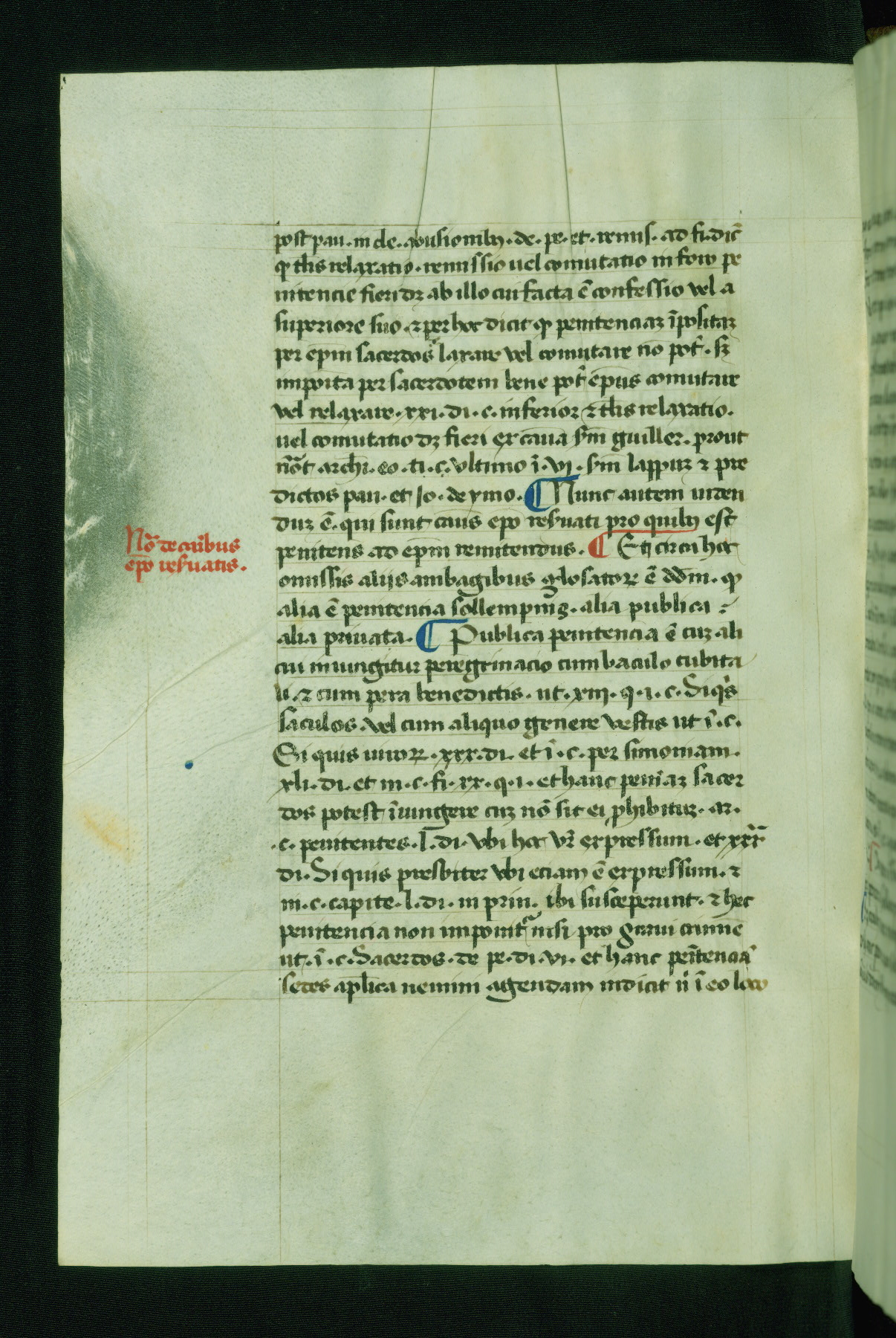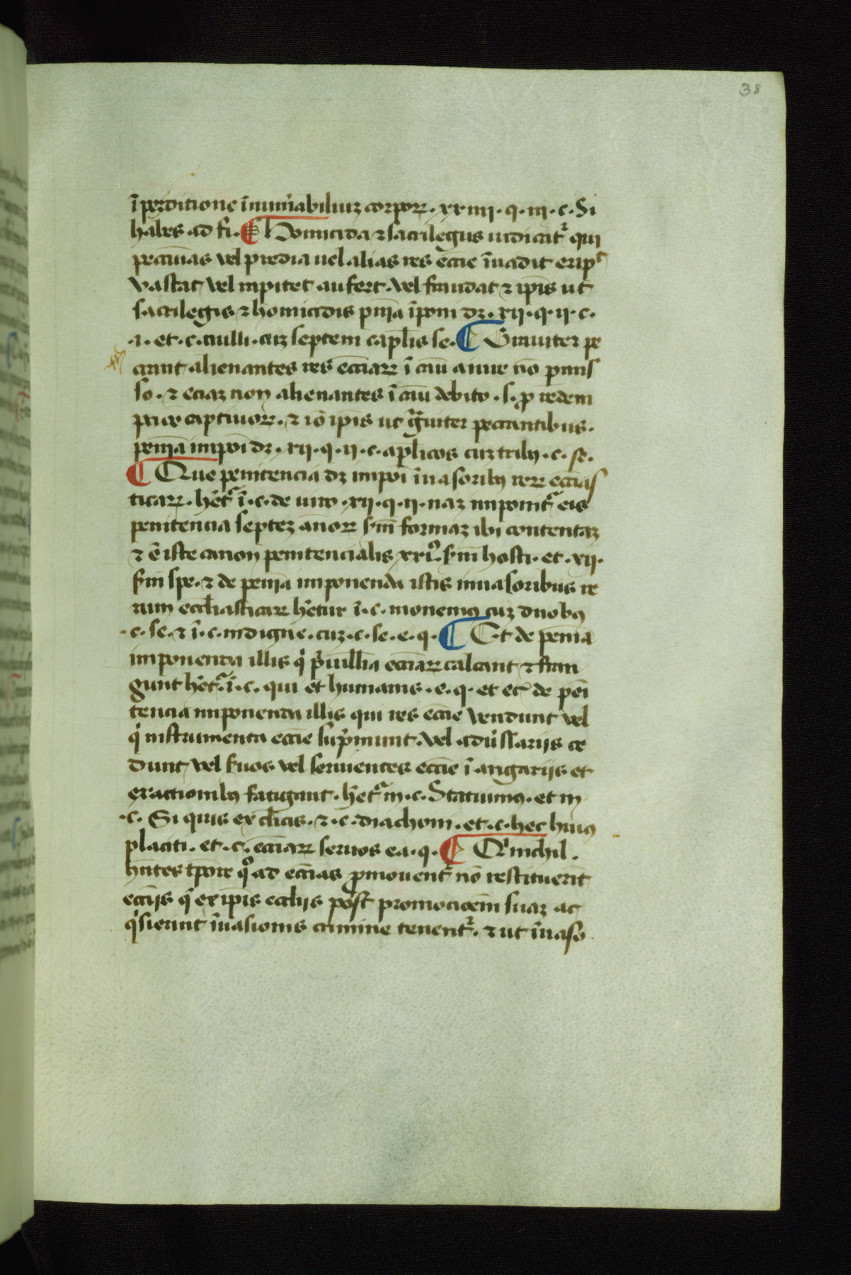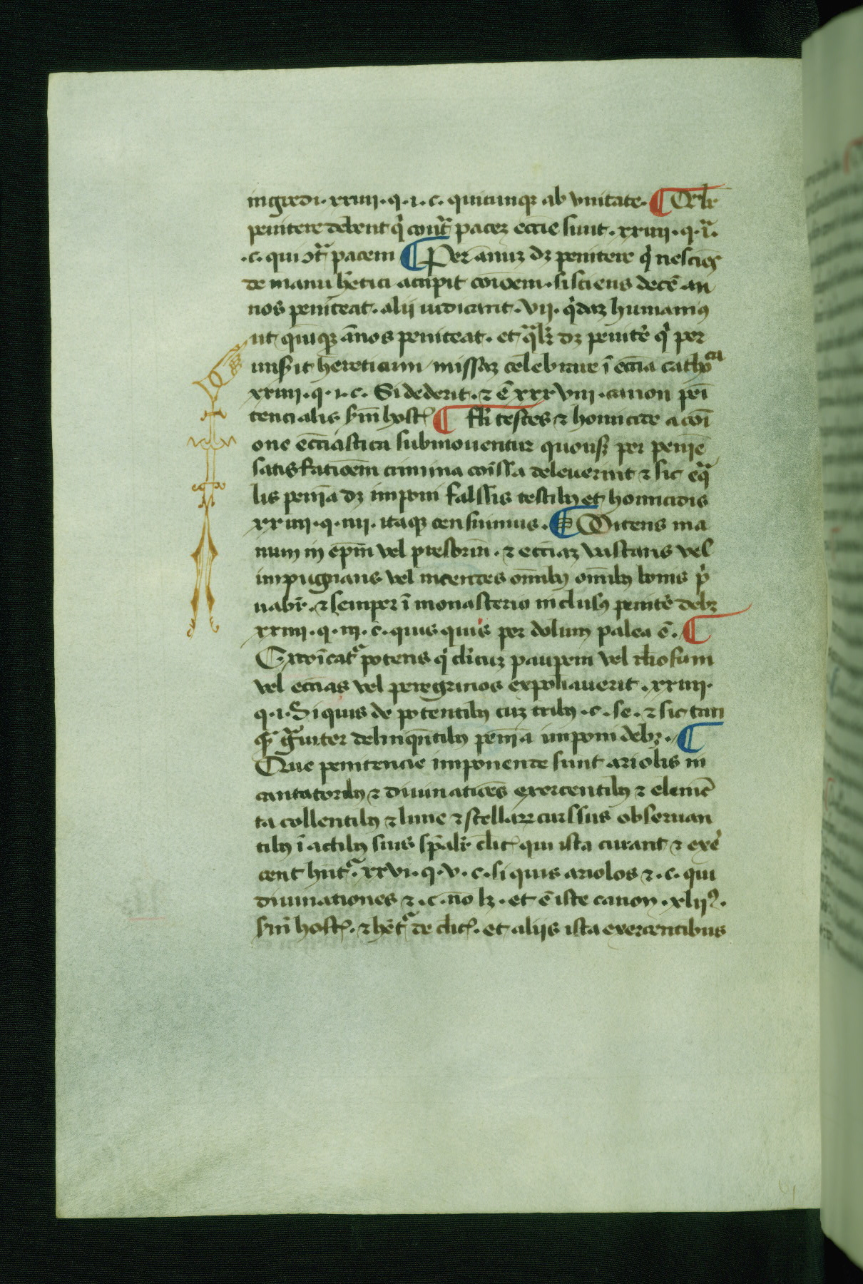 Alphonsus de Benavento wrote the treatise on penitential canons and acts of confession contained in this manuscript. The colophon informs us that Alphonsus was a professor of canon law at the university of Salmanca, Spain, and wrote this manuscript in 1456 in the nearby city of Tejares. At that time there was a pestilence in the city, for which Alphonsus asks for prayers. A historiated initial in which Alphonsus presents the treatise to a bishop begins the text, and the manuscript still retains its original stamped red leather binding.