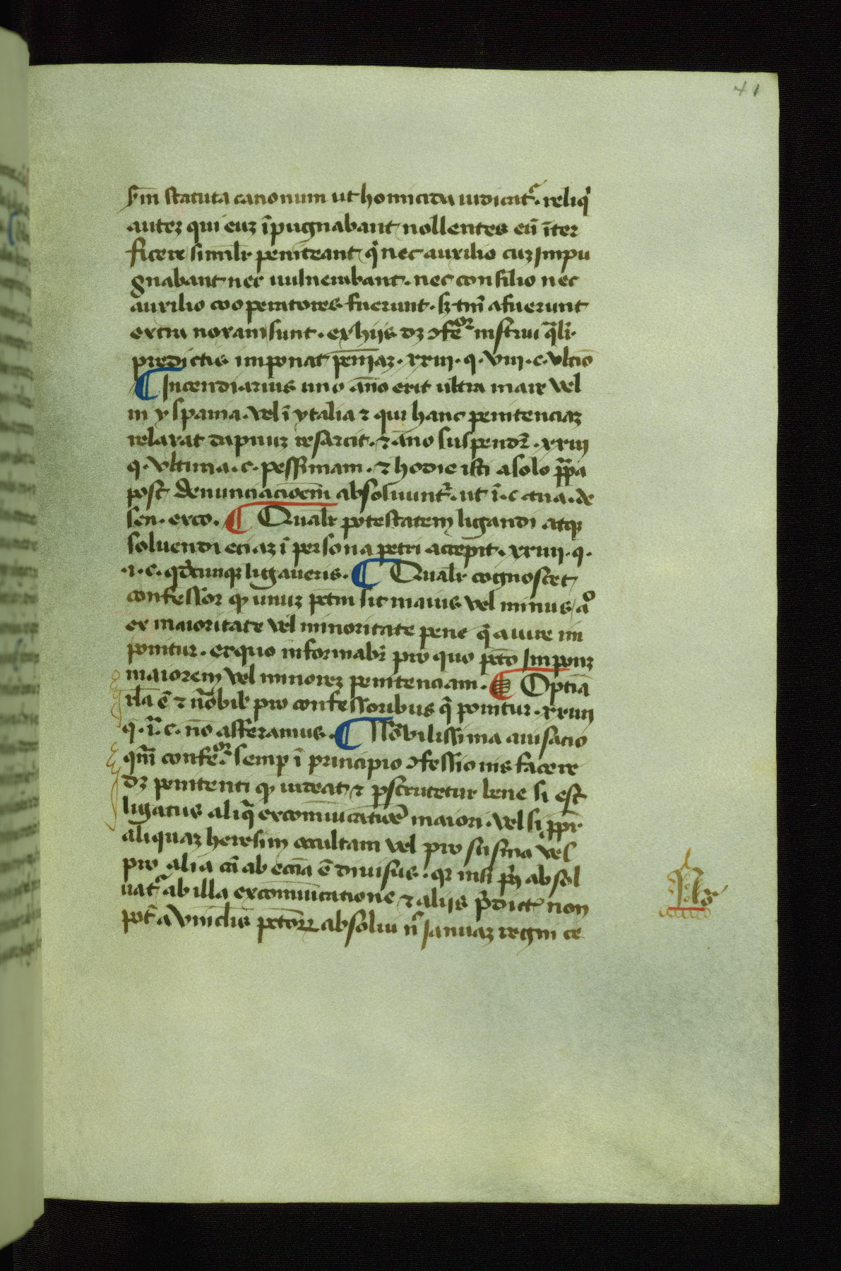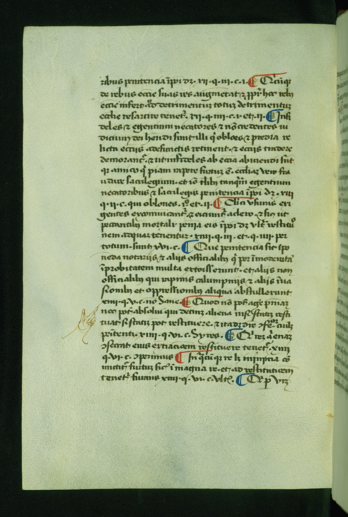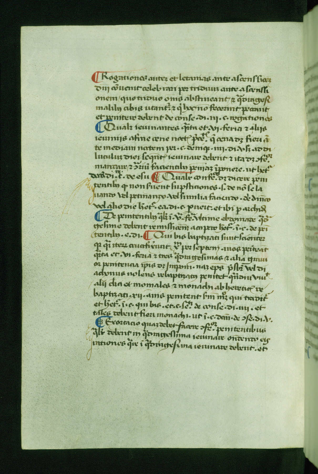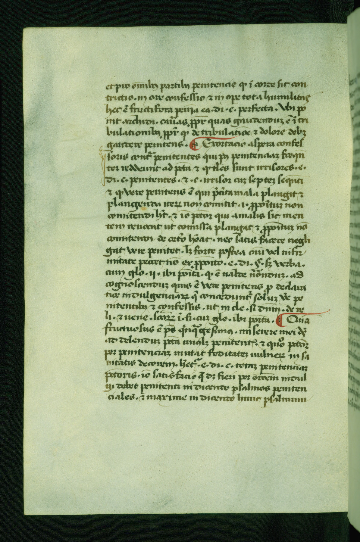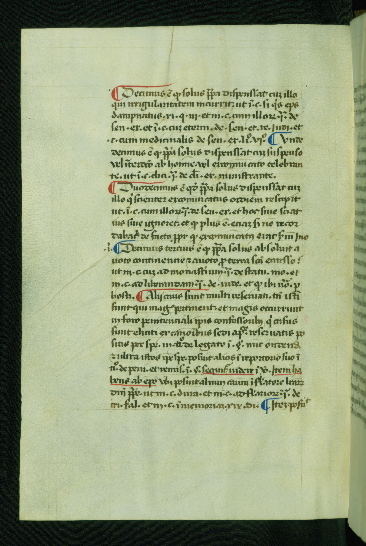 Alphonsus de Benavento wrote the treatise on penitential canons and acts of confession contained in this manuscript. The colophon informs us that Alphonsus was a professor of canon law at the university of Salmanca, Spain, and wrote this manuscript in 1456 in the nearby city of Tejares. At that time there was a pestilence in the city, for which Alphonsus asks for prayers. A historiated initial in which Alphonsus presents the treatise to a bishop begins the text, and the manuscript still retains its original stamped red leather binding.