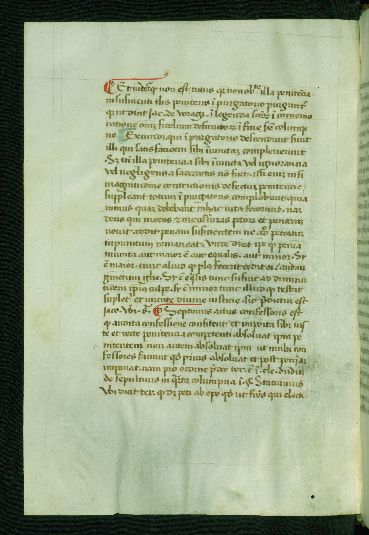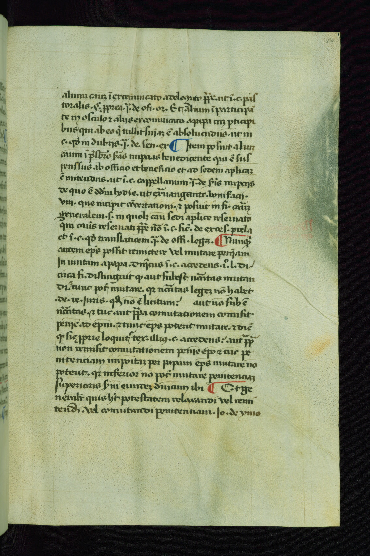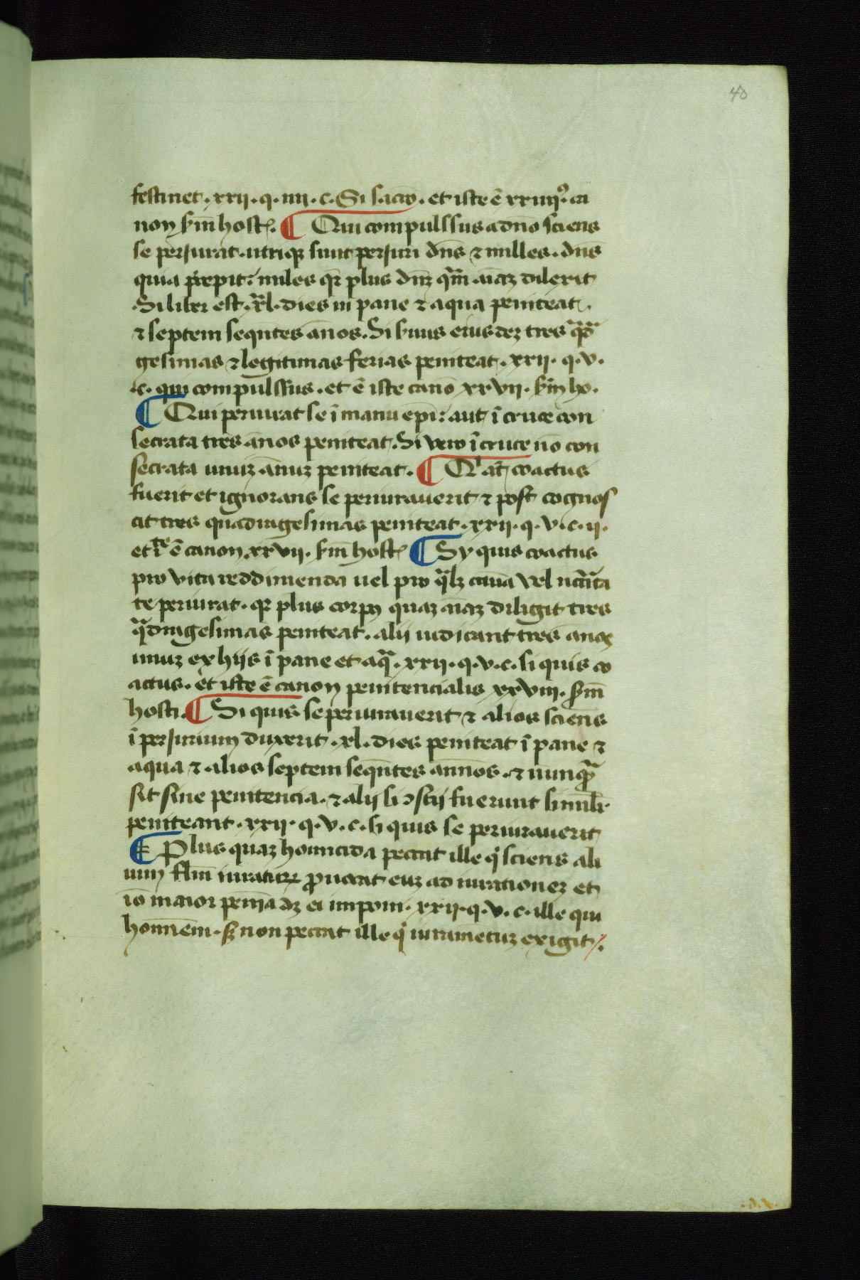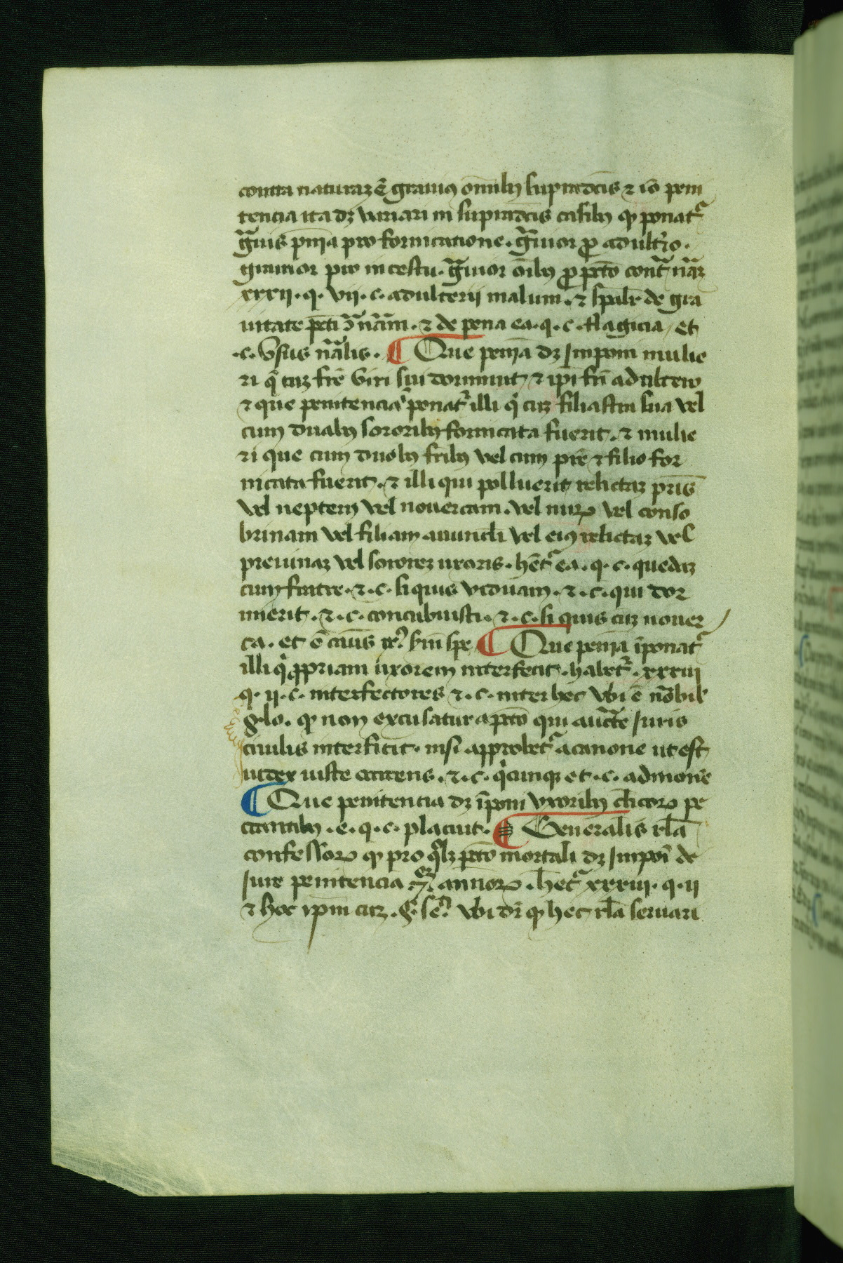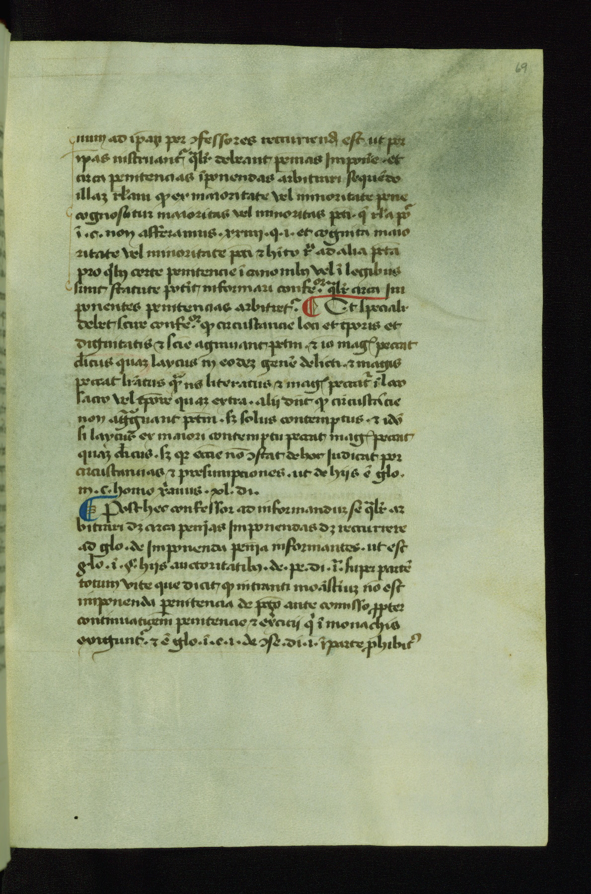 Alphonsus de Benavento wrote the treatise on penitential canons and acts of confession contained in this manuscript. The colophon informs us that Alphonsus was a professor of canon law at the university of Salmanca, Spain, and wrote this manuscript in 1456 in the nearby city of Tejares. At that time there was a pestilence in the city, for which Alphonsus asks for prayers. A historiated initial in which Alphonsus presents the treatise to a bishop begins the text, and the manuscript still retains its original stamped red leather binding.