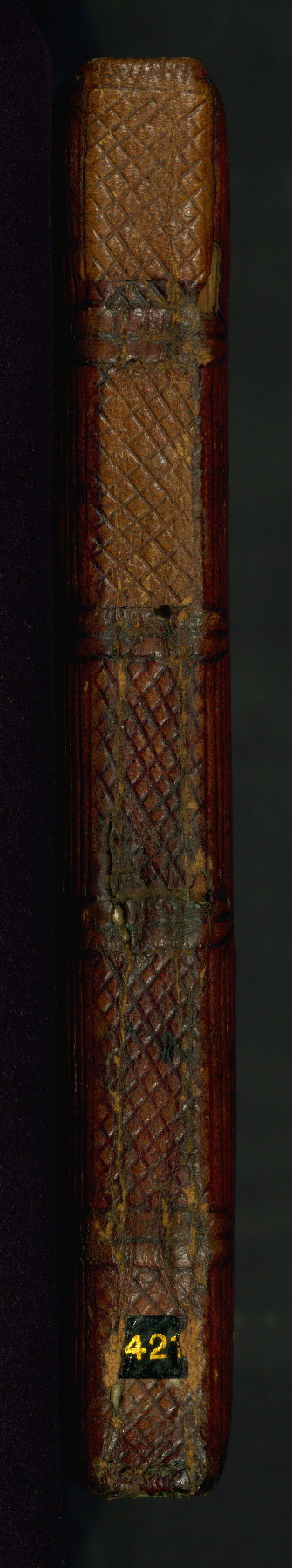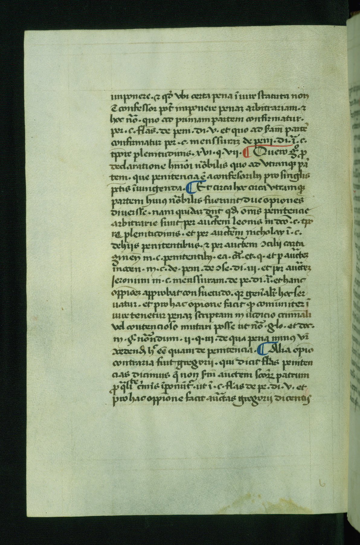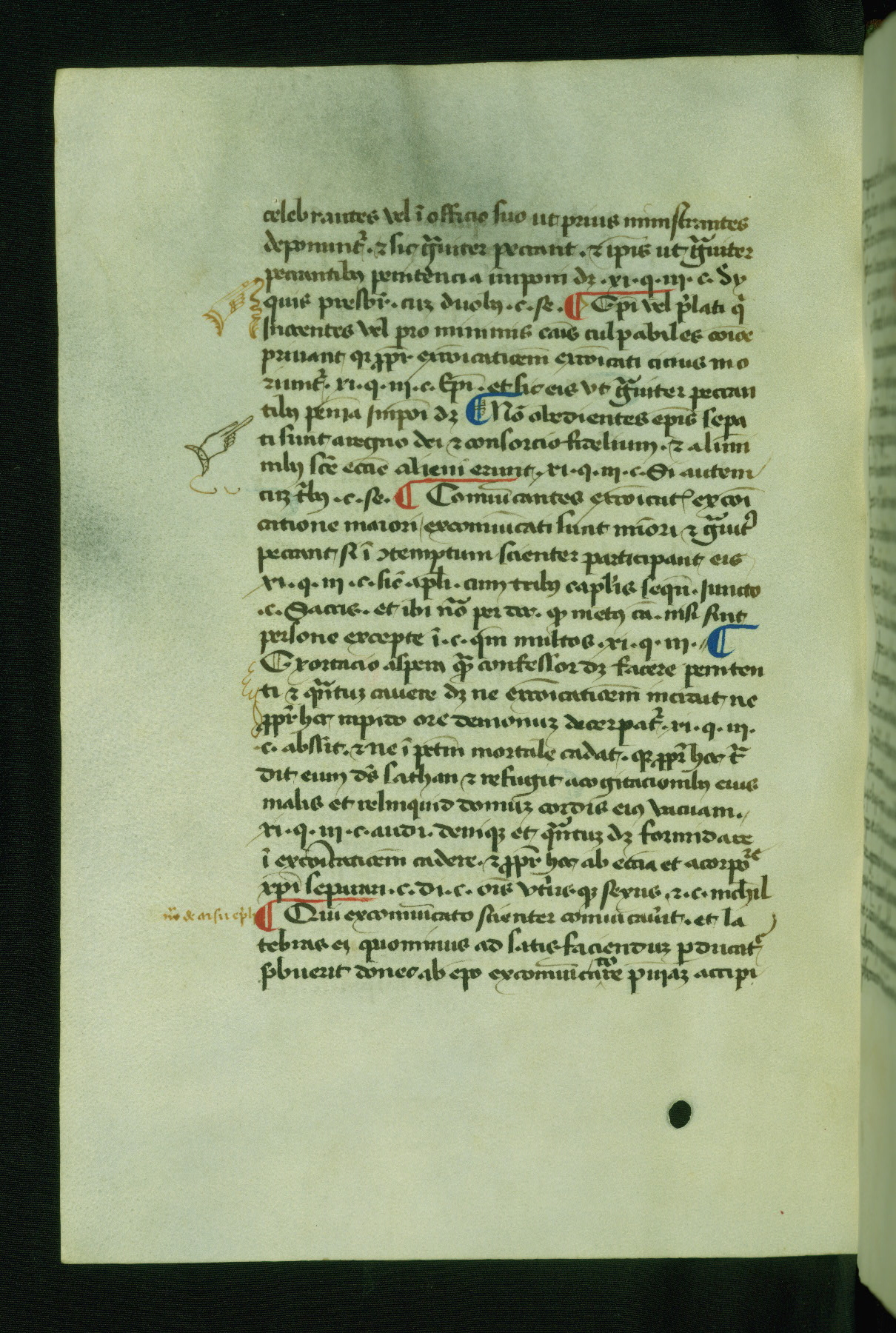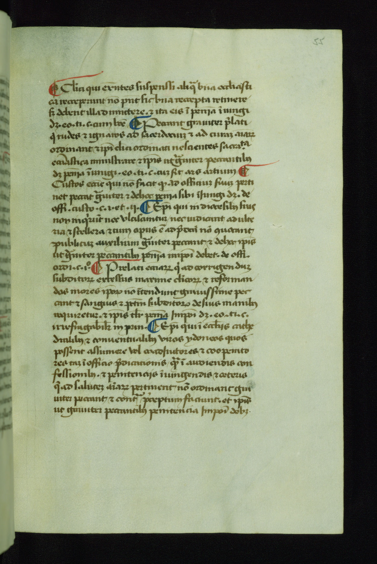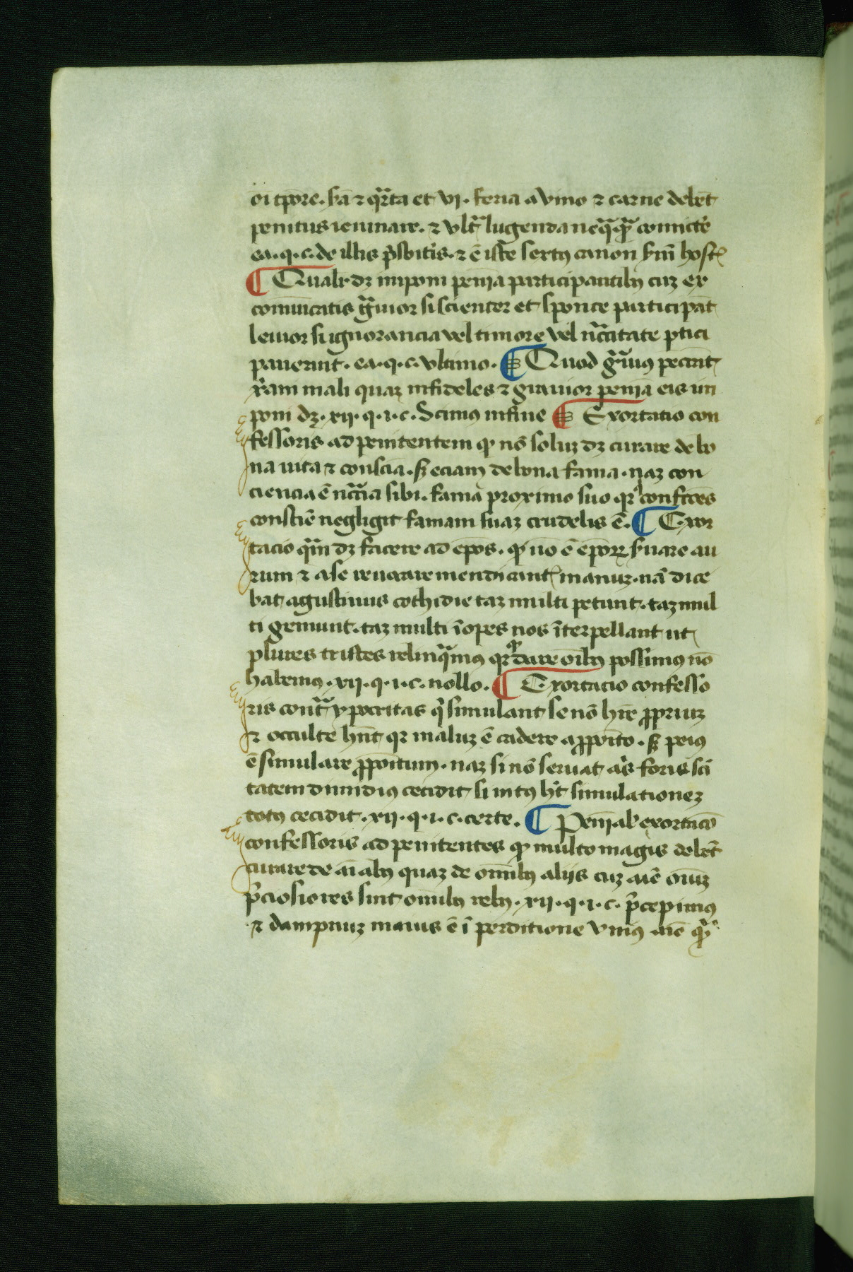 Alphonsus de Benavento wrote the treatise on penitential canons and acts of confession contained in this manuscript. The colophon informs us that Alphonsus was a professor of canon law at the university of Salmanca, Spain, and wrote this manuscript in 1456 in the nearby city of Tejares. At that time there was a pestilence in the city, for which Alphonsus asks for prayers. A historiated initial in which Alphonsus presents the treatise to a bishop begins the text, and the manuscript still retains its original stamped red leather binding.