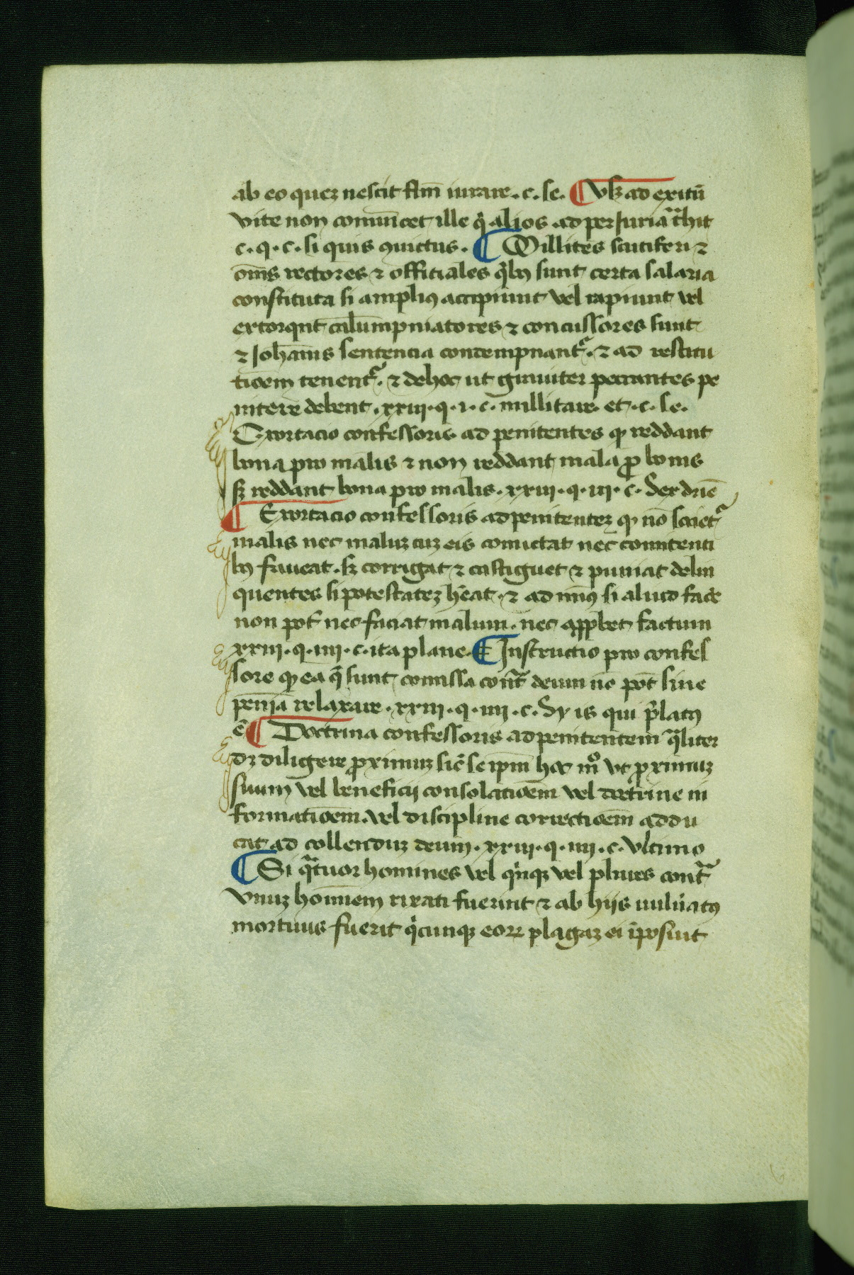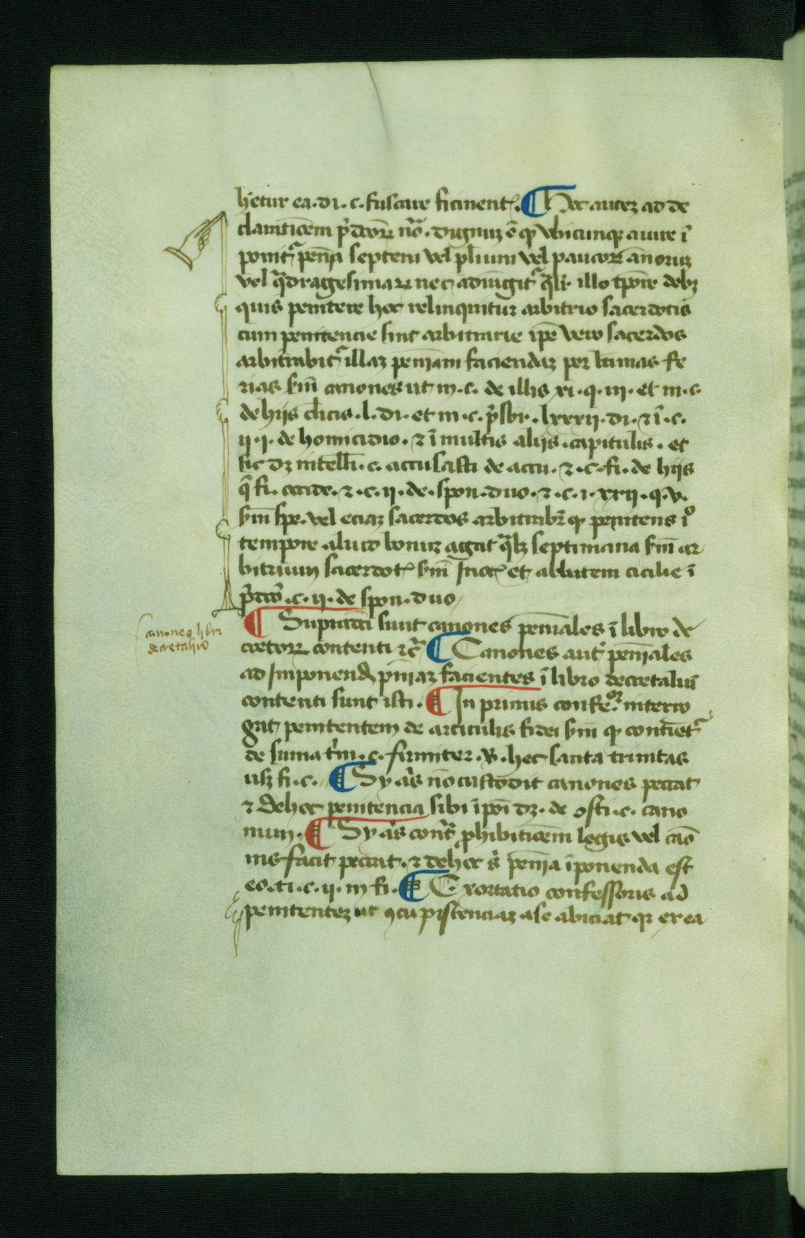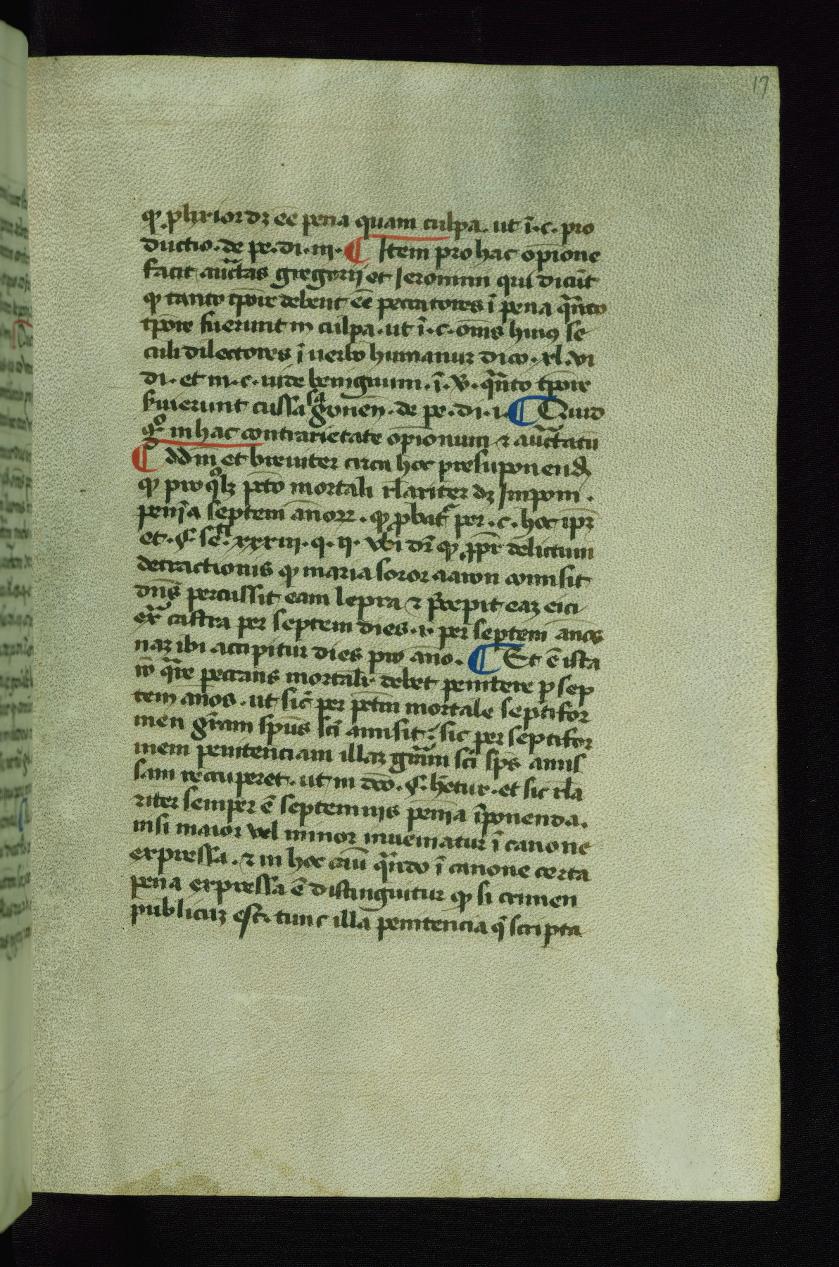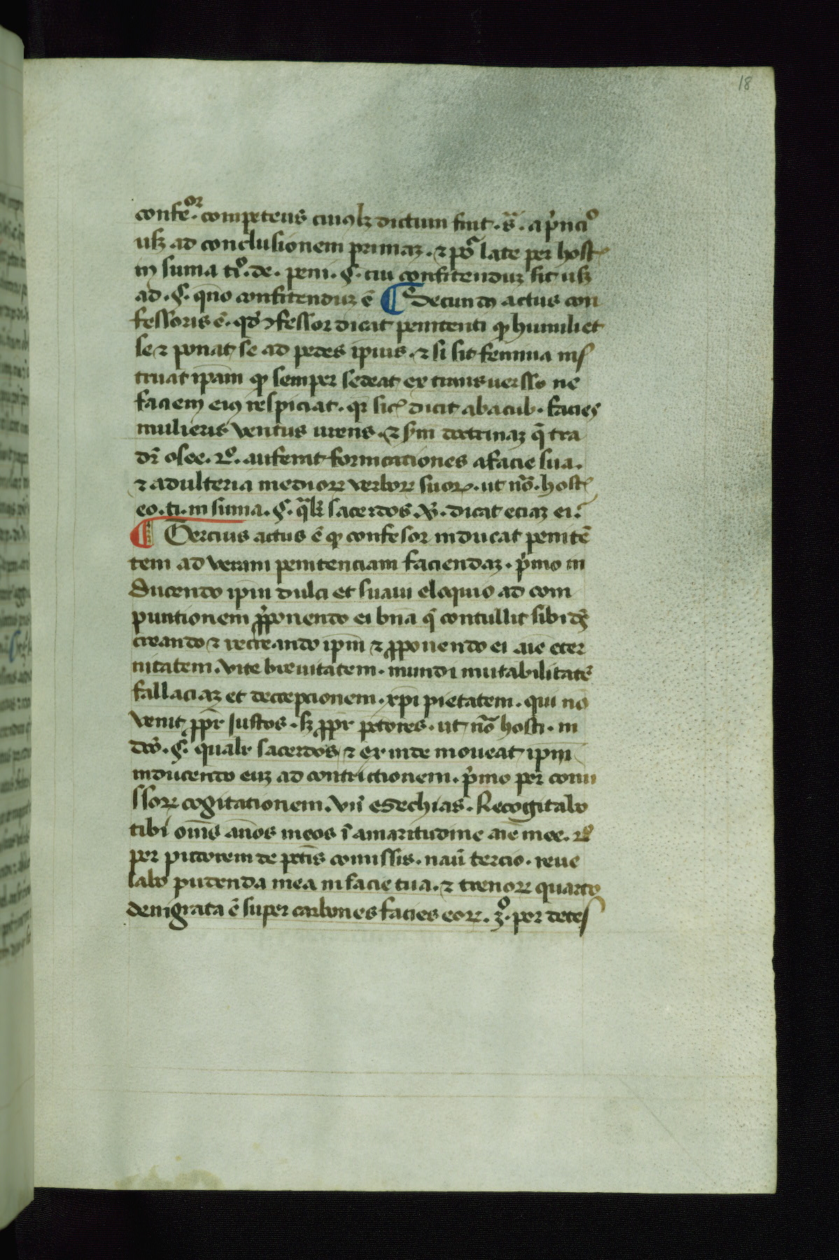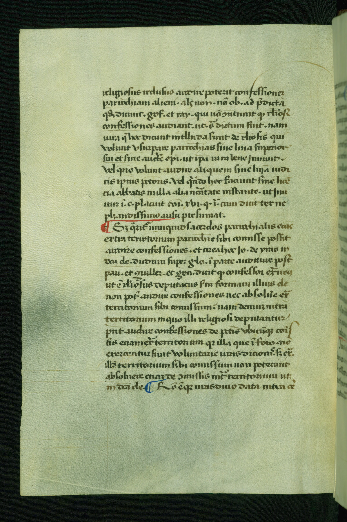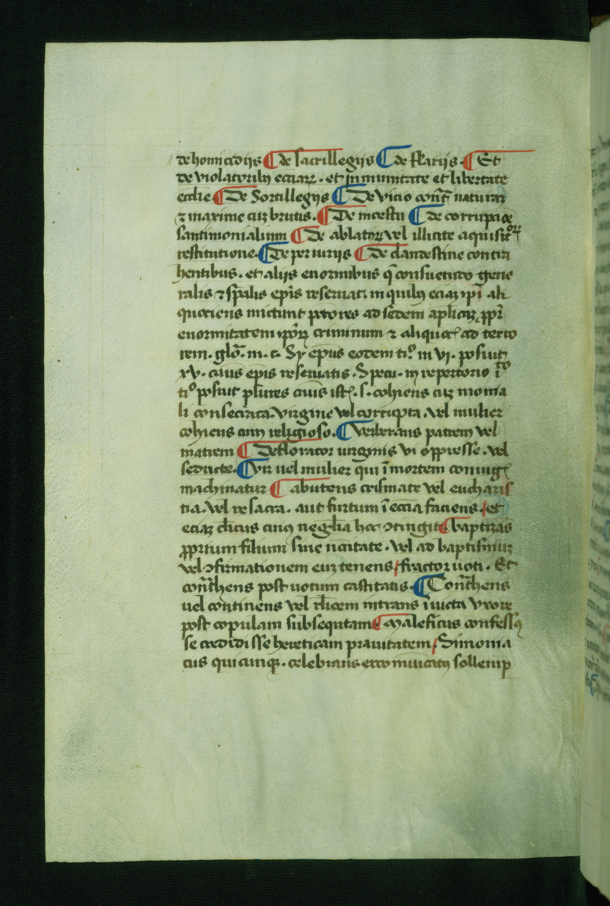 Alphonsus de Benavento wrote the treatise on penitential canons and acts of confession contained in this manuscript. The colophon informs us that Alphonsus was a professor of canon law at the university of Salmanca, Spain, and wrote this manuscript in 1456 in the nearby city of Tejares. At that time there was a pestilence in the city, for which Alphonsus asks for prayers. A historiated initial in which Alphonsus presents the treatise to a bishop begins the text, and the manuscript still retains its original stamped red leather binding.