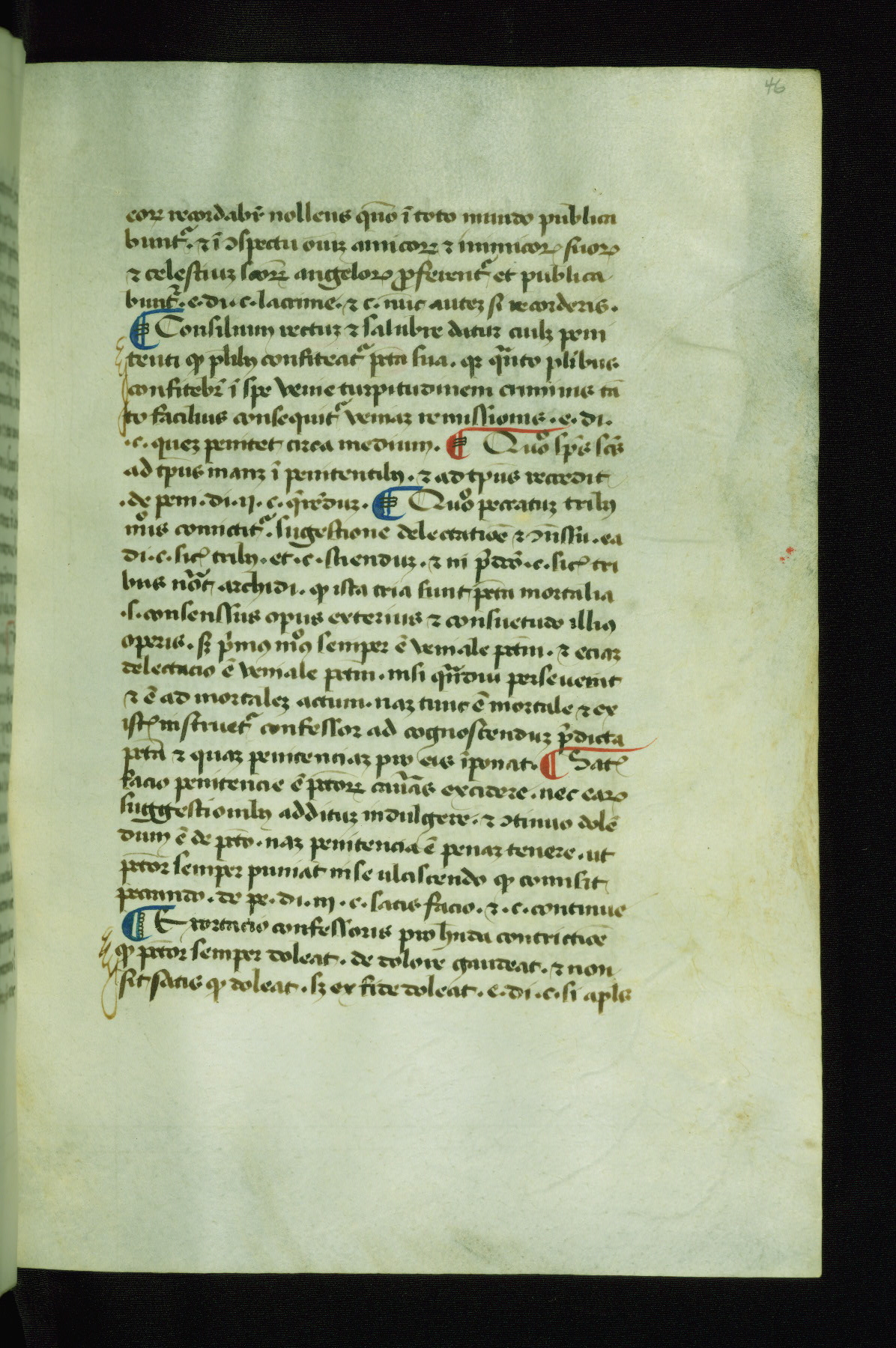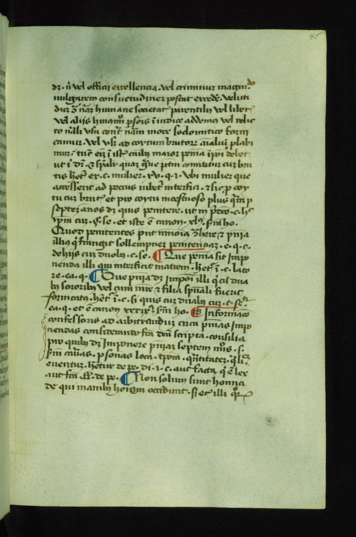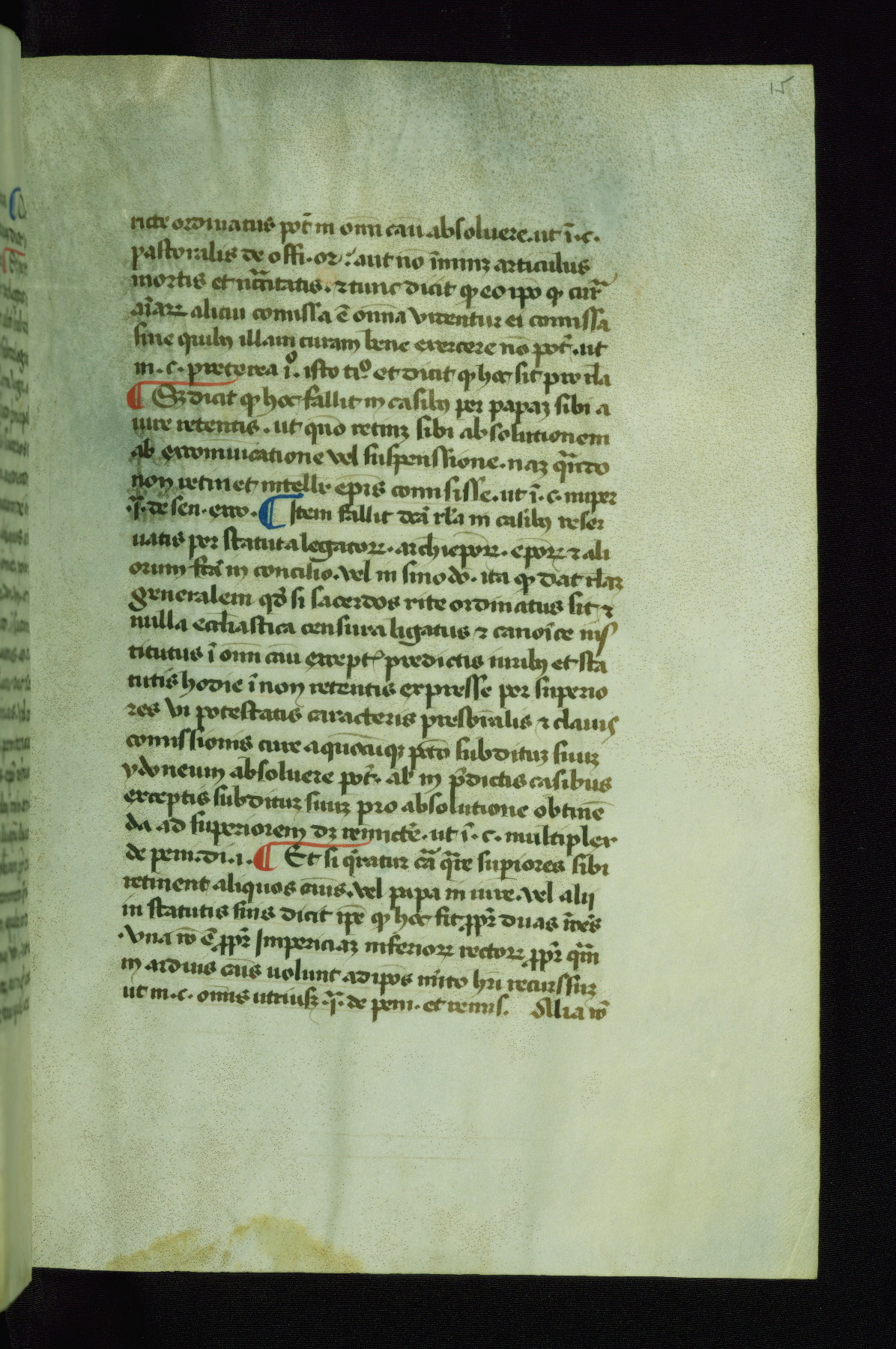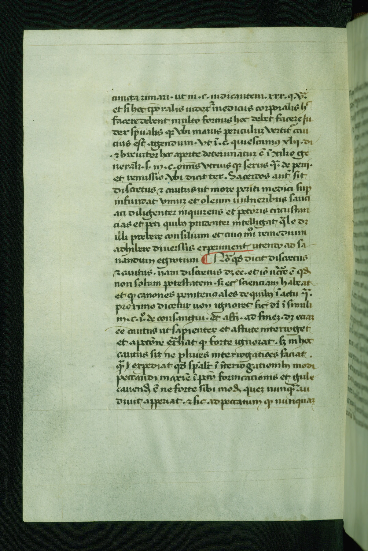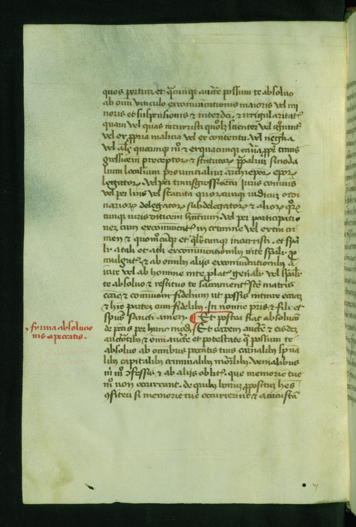 Alphonsus de Benavento wrote the treatise on penitential canons and acts of confession contained in this manuscript. The colophon informs us that Alphonsus was a professor of canon law at the university of Salmanca, Spain, and wrote this manuscript in 1456 in the nearby city of Tejares. At that time there was a pestilence in the city, for which Alphonsus asks for prayers. A historiated initial in which Alphonsus presents the treatise to a bishop begins the text, and the manuscript still retains its original stamped red leather binding.