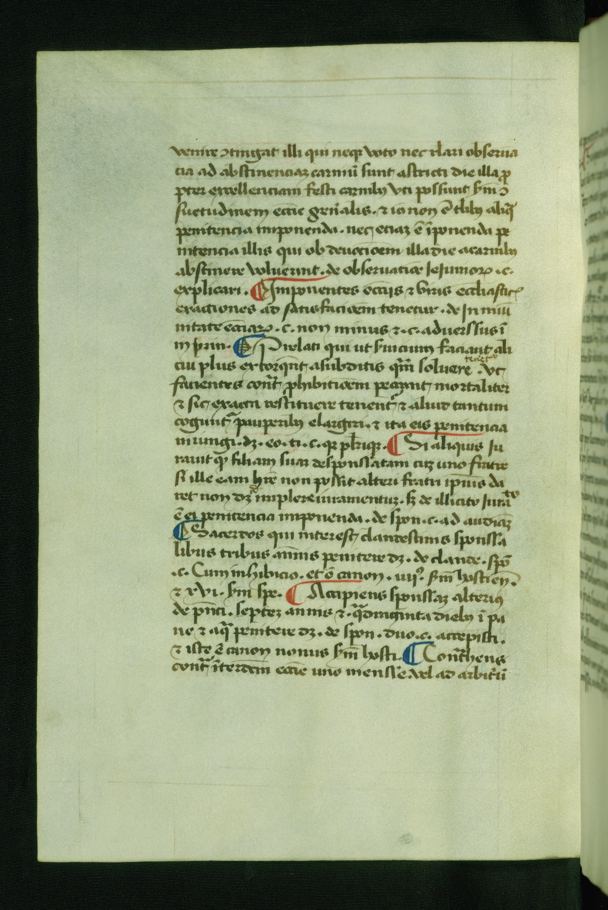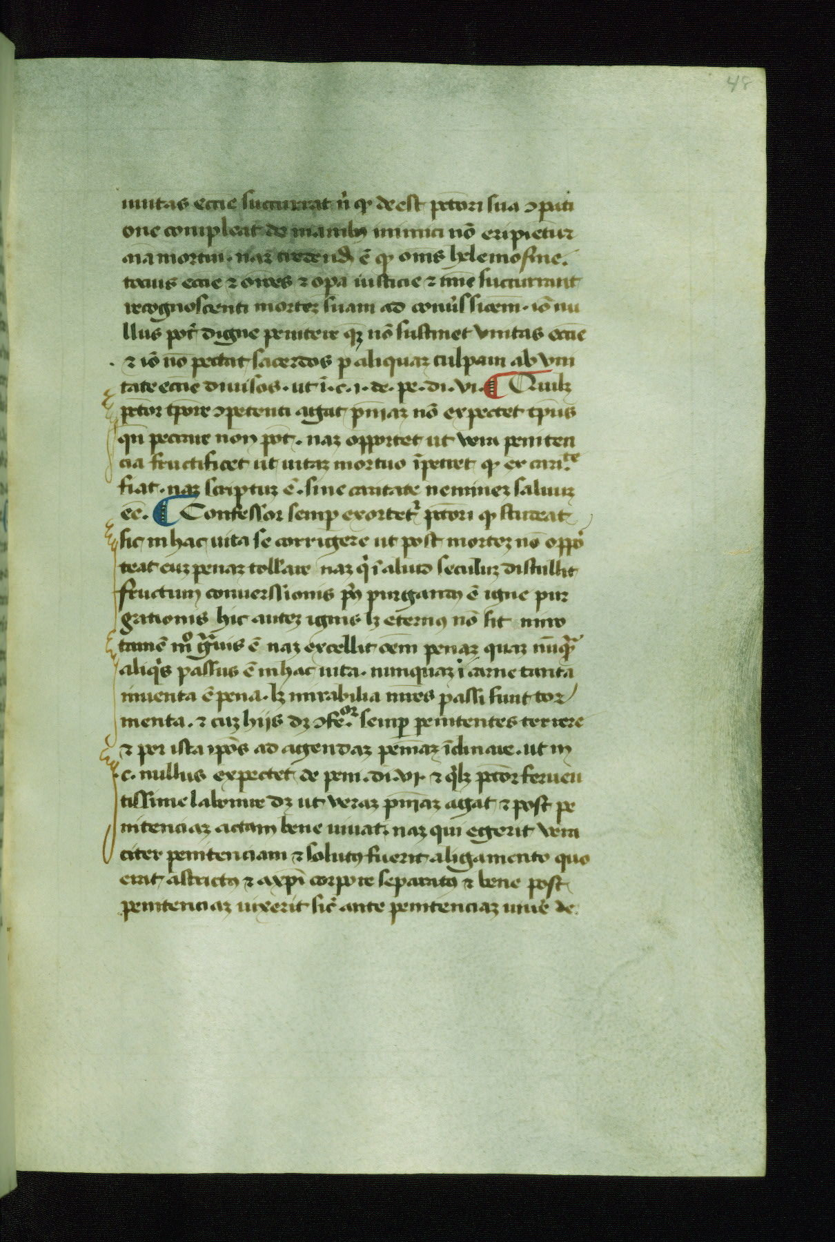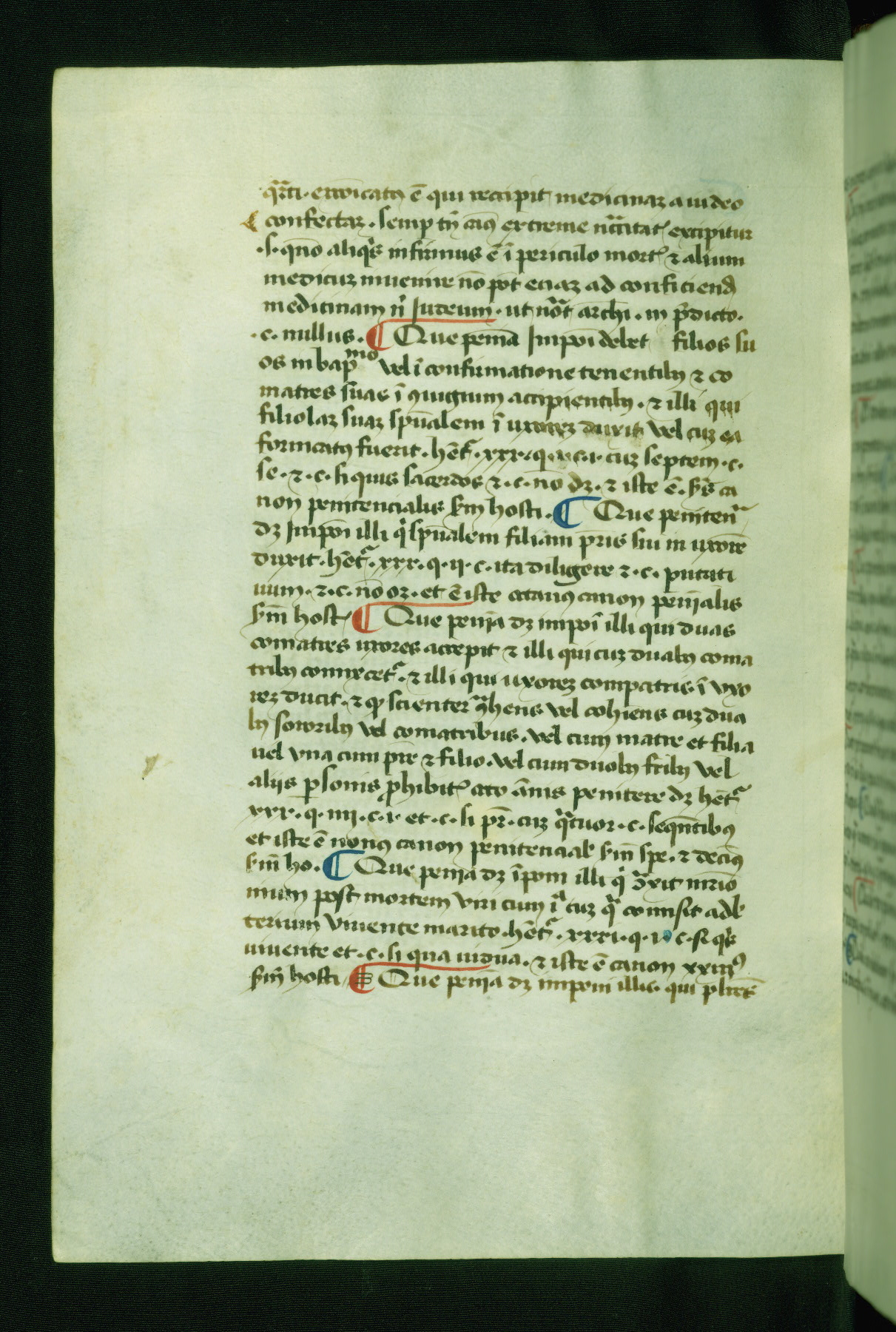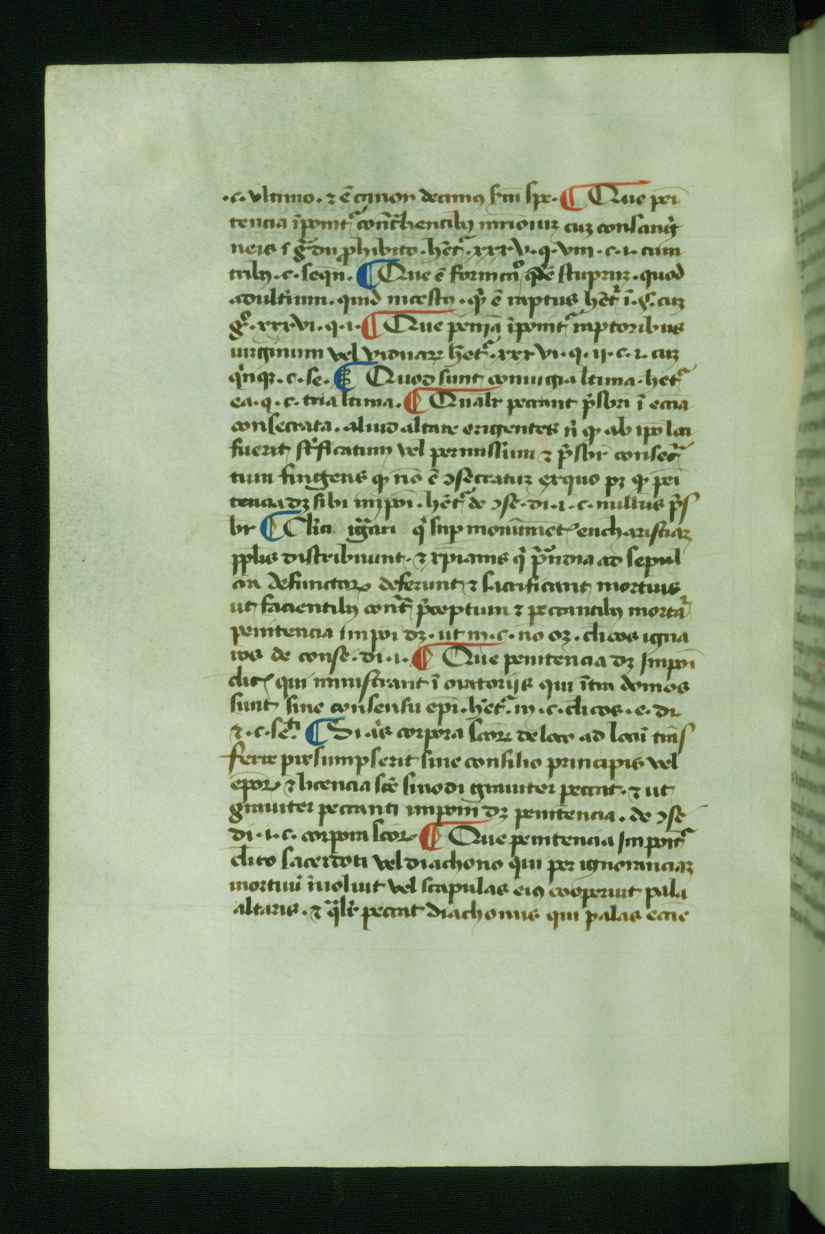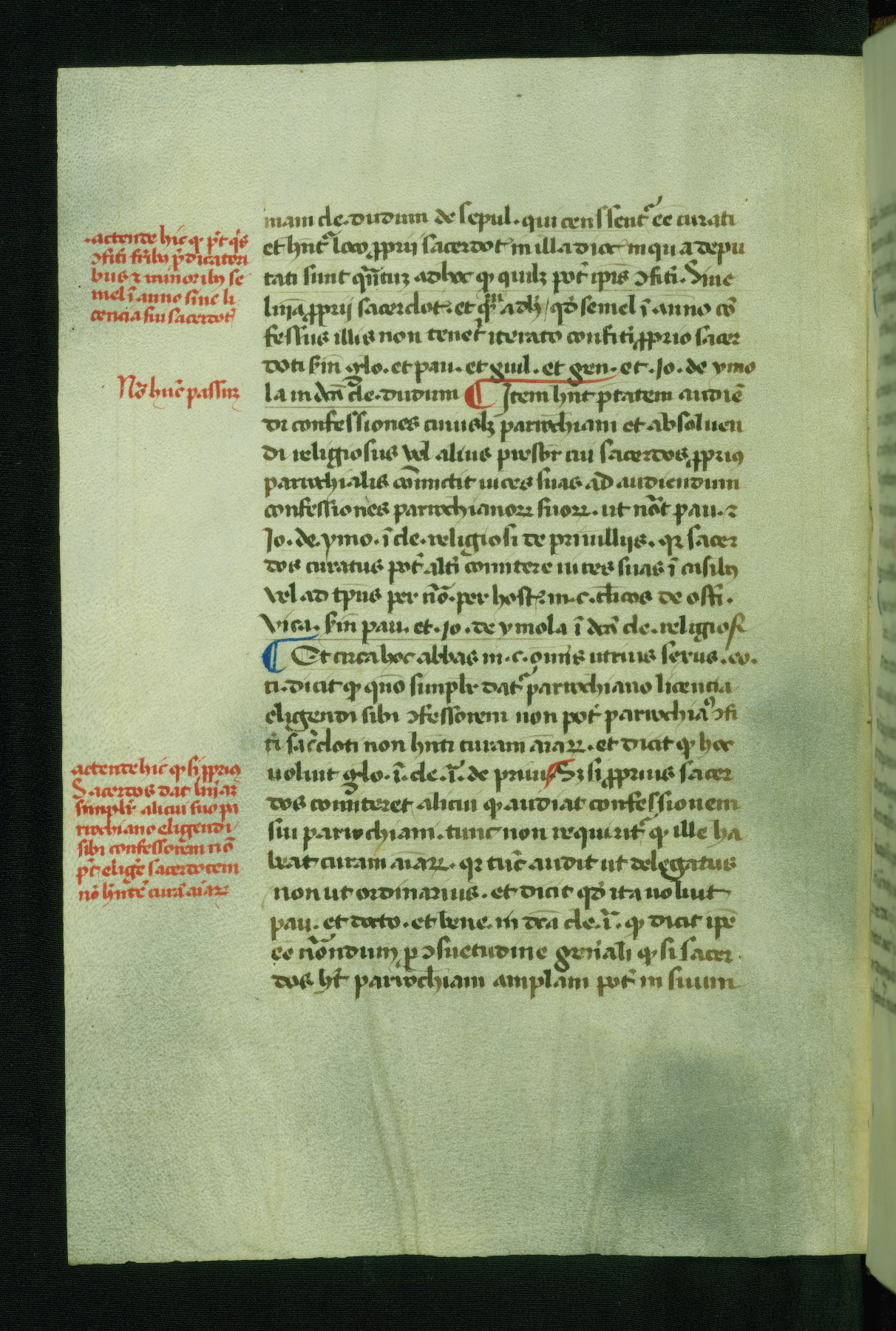 Alphonsus de Benavento wrote the treatise on penitential canons and acts of confession contained in this manuscript. The colophon informs us that Alphonsus was a professor of canon law at the university of Salmanca, Spain, and wrote this manuscript in 1456 in the nearby city of Tejares. At that time there was a pestilence in the city, for which Alphonsus asks for prayers. A historiated initial in which Alphonsus presents the treatise to a bishop begins the text, and the manuscript still retains its original stamped red leather binding.