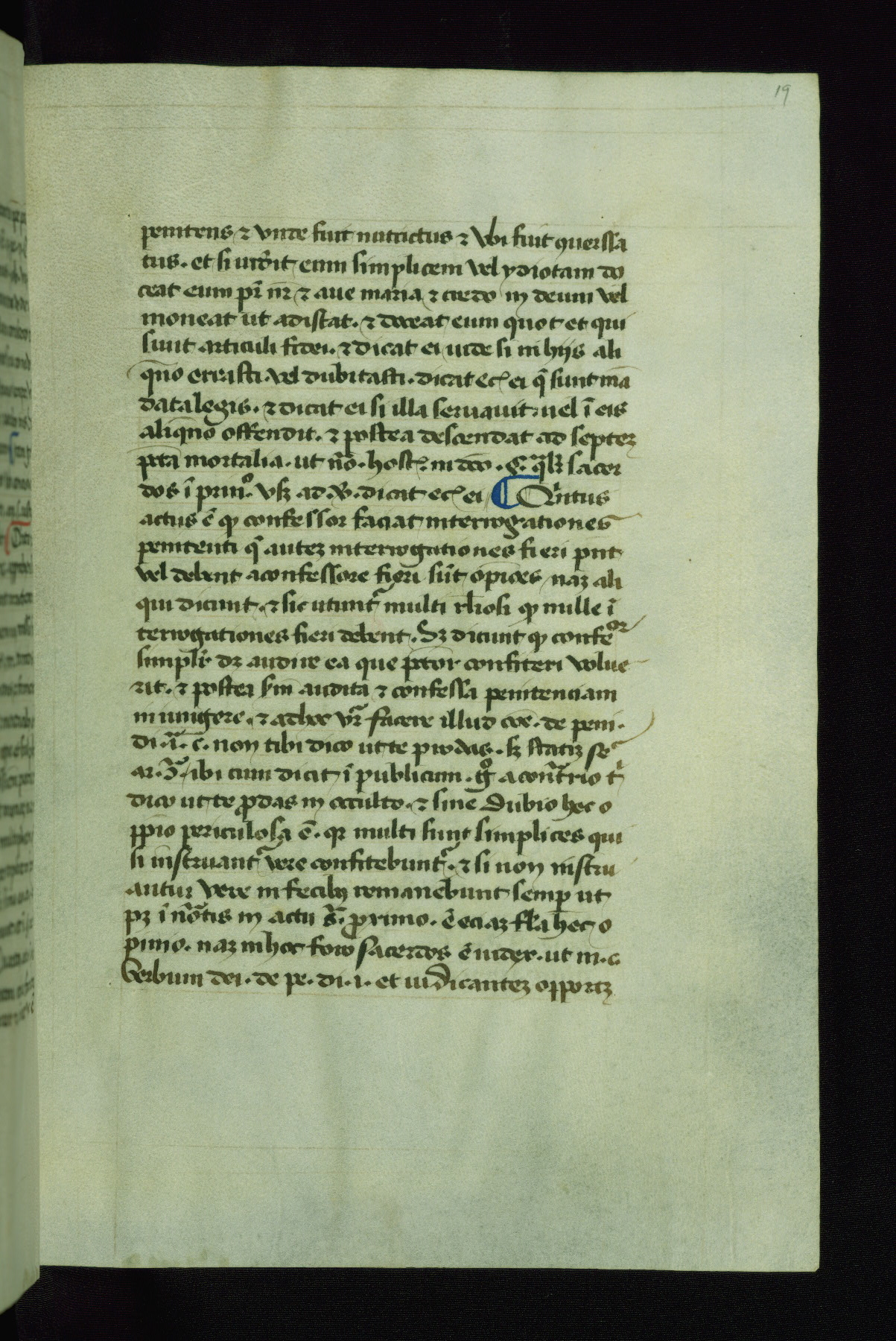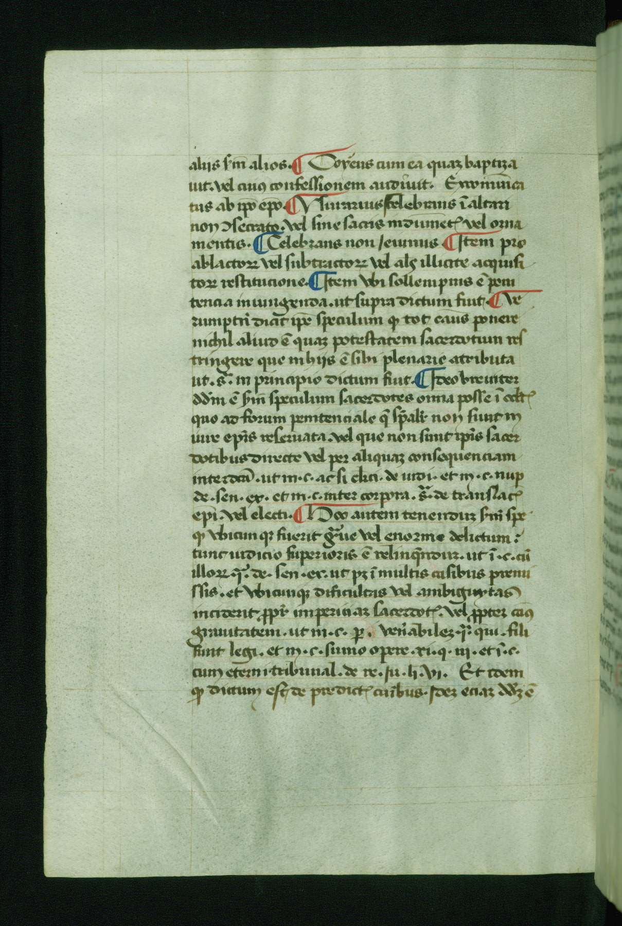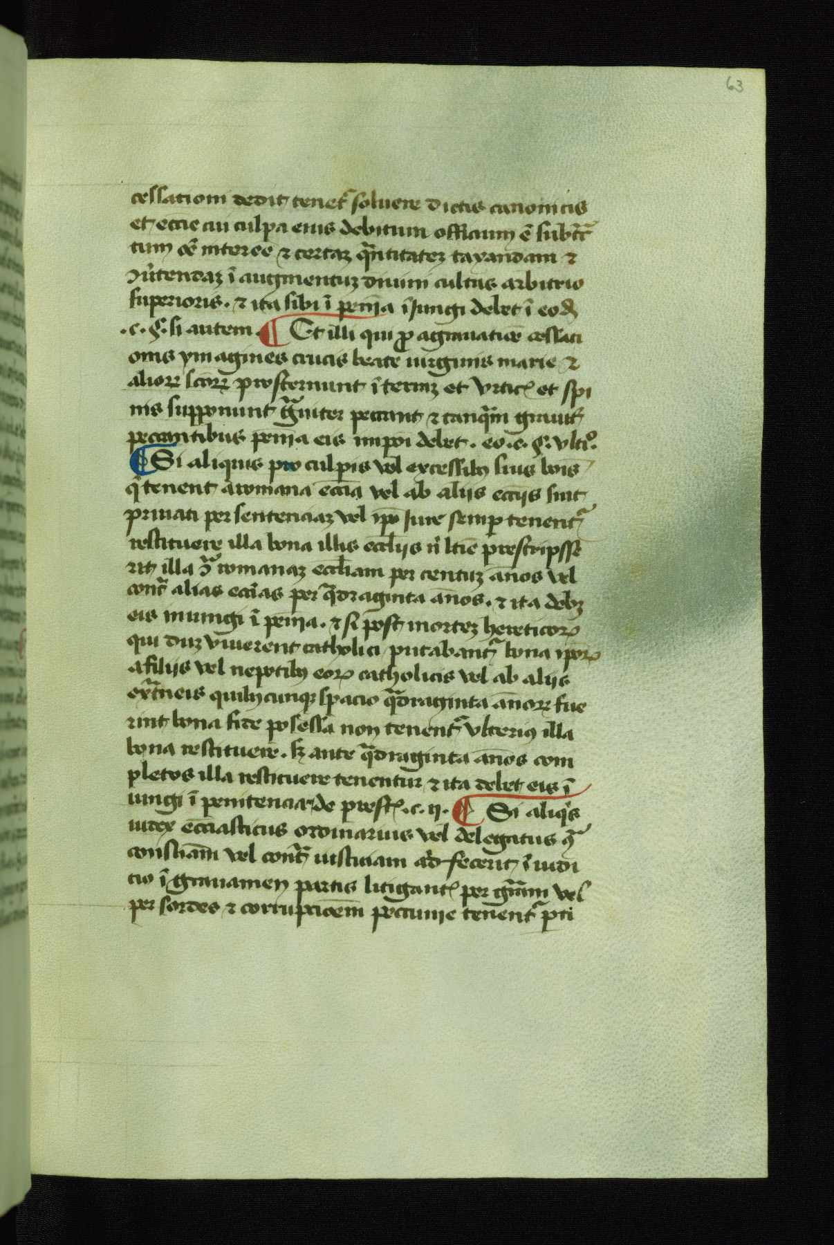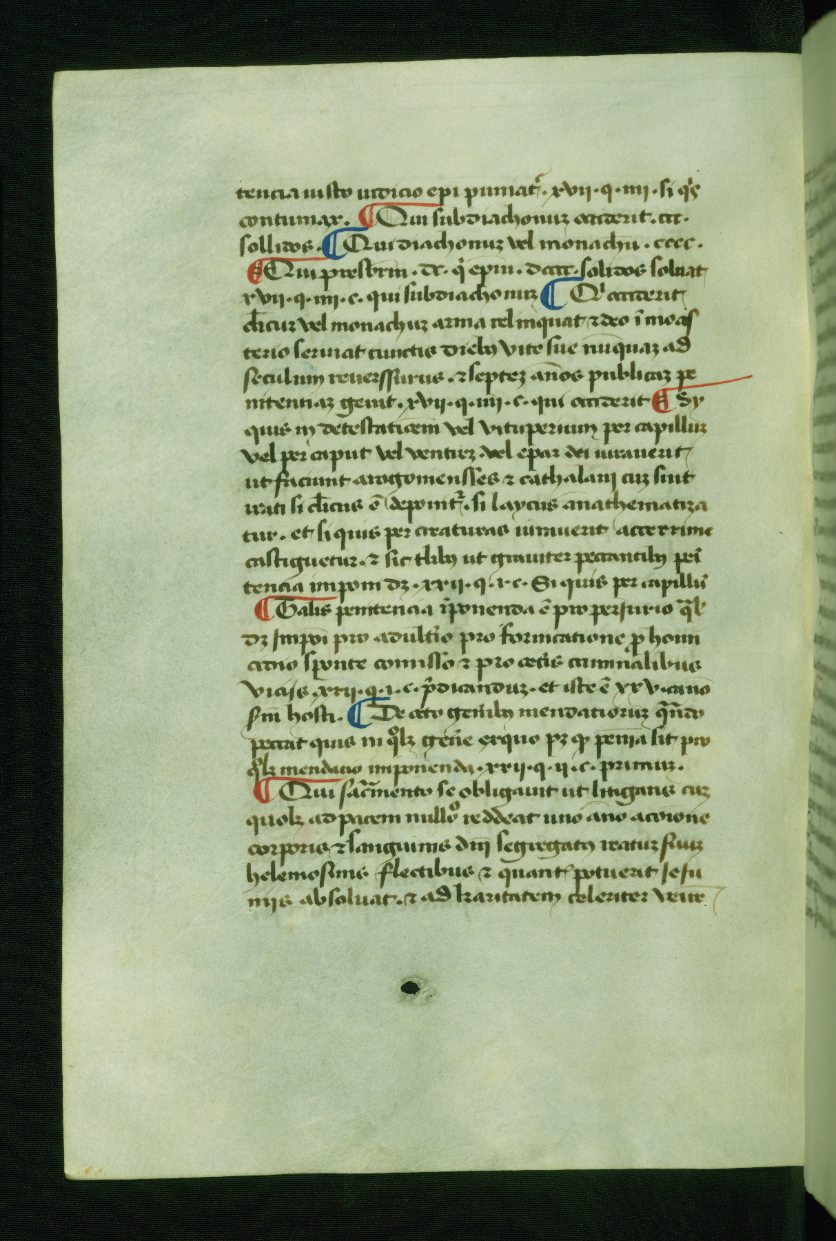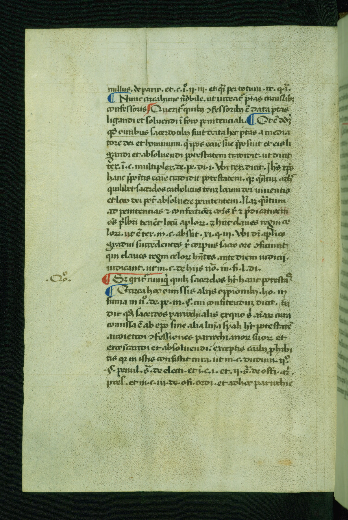 Alphonsus de Benavento wrote the treatise on penitential canons and acts of confession contained in this manuscript. The colophon informs us that Alphonsus was a professor of canon law at the university of Salmanca, Spain, and wrote this manuscript in 1456 in the nearby city of Tejares. At that time there was a pestilence in the city, for which Alphonsus asks for prayers. A historiated initial in which Alphonsus presents the treatise to a bishop begins the text, and the manuscript still retains its original stamped red leather binding.