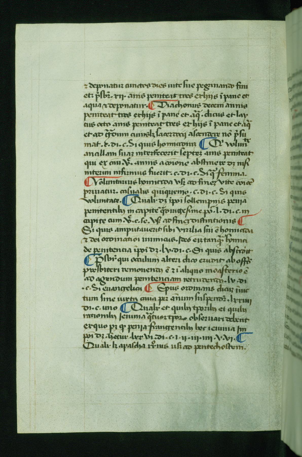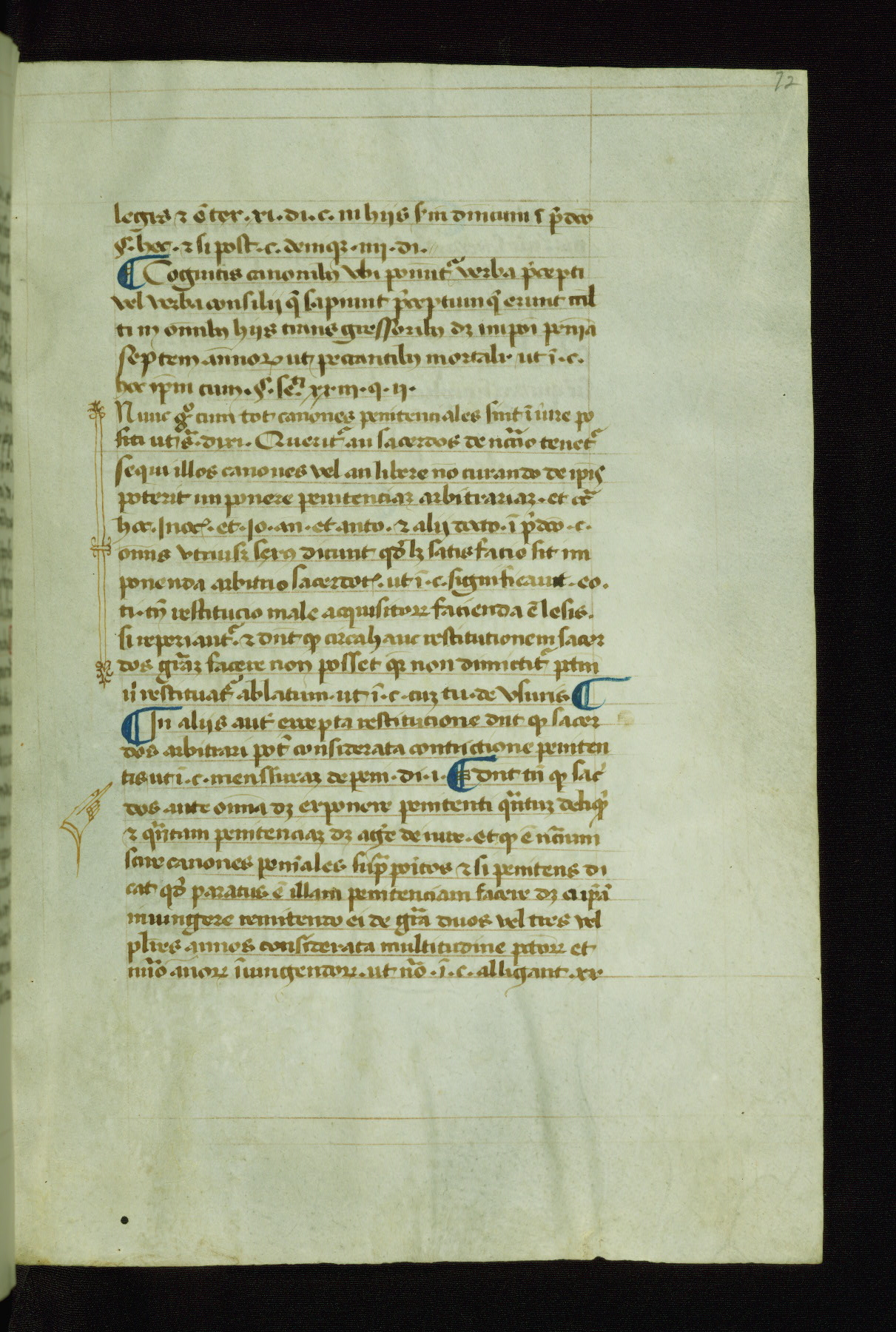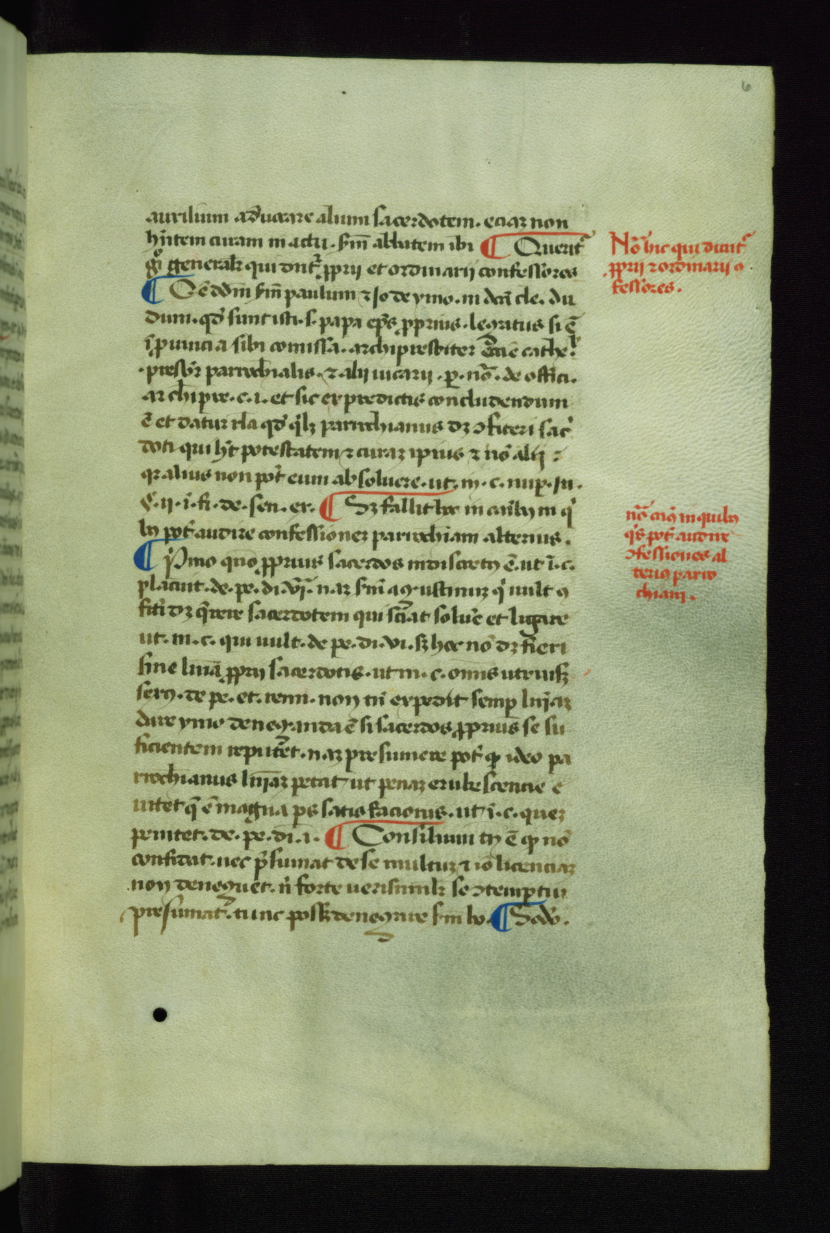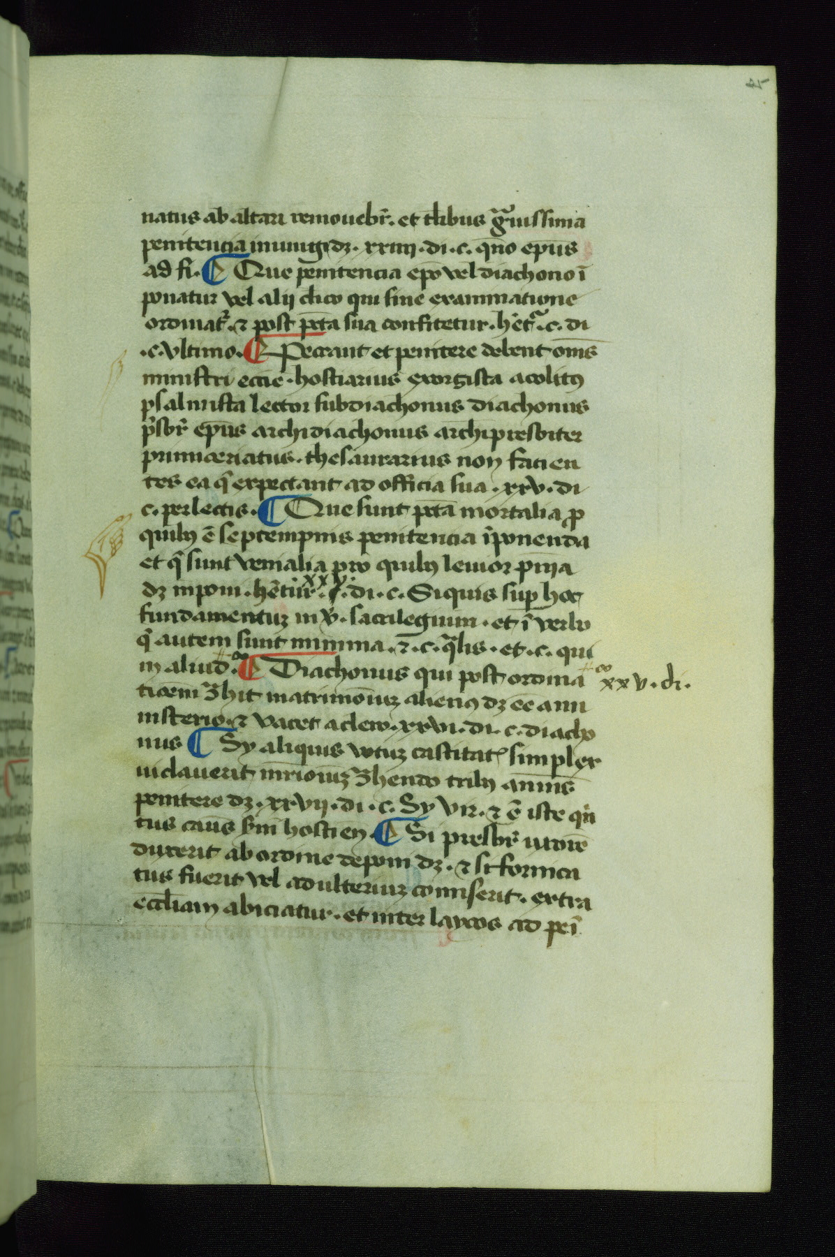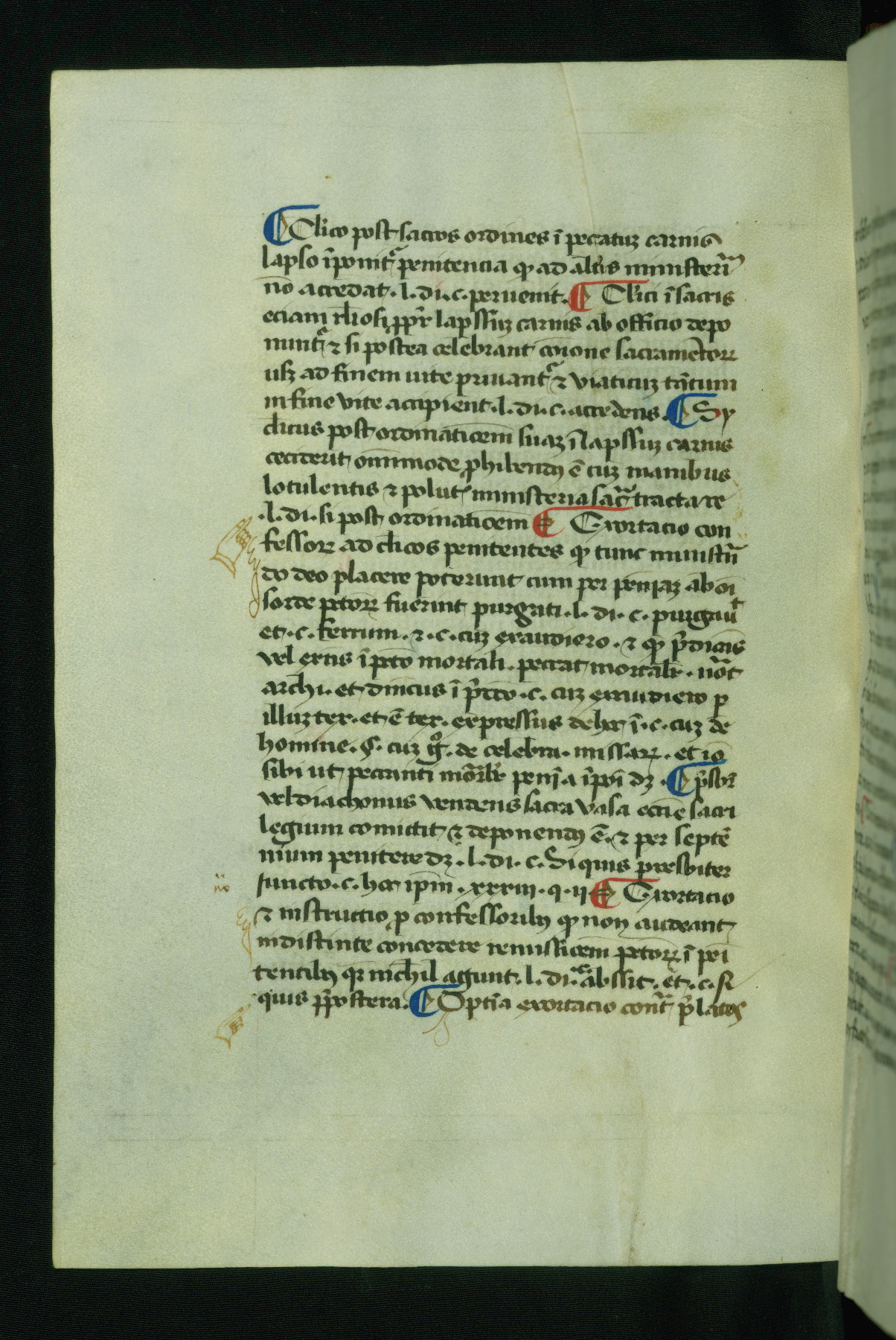 Alphonsus de Benavento wrote the treatise on penitential canons and acts of confession contained in this manuscript. The colophon informs us that Alphonsus was a professor of canon law at the university of Salmanca, Spain, and wrote this manuscript in 1456 in the nearby city of Tejares. At that time there was a pestilence in the city, for which Alphonsus asks for prayers. A historiated initial in which Alphonsus presents the treatise to a bishop begins the text, and the manuscript still retains its original stamped red leather binding.