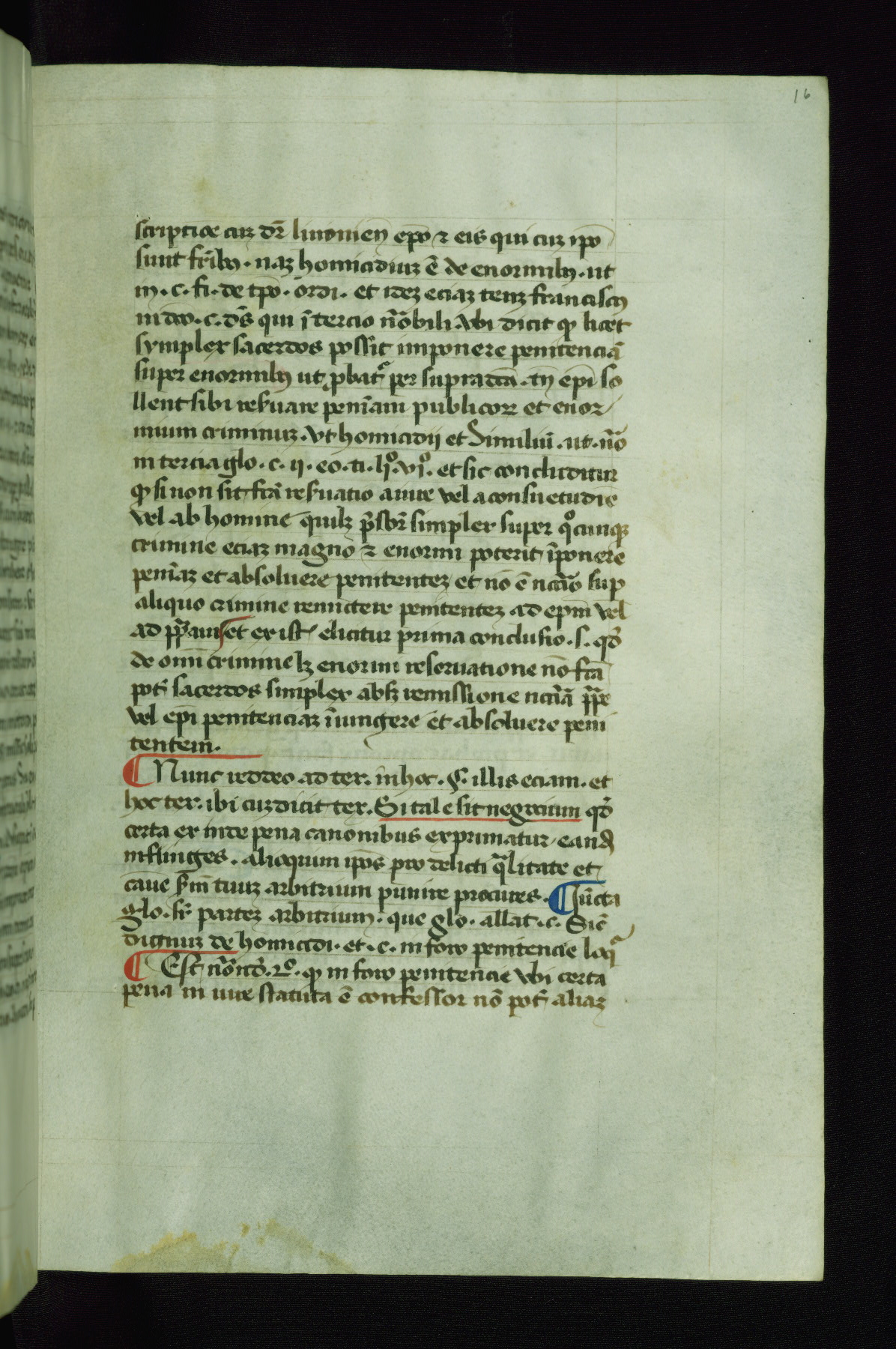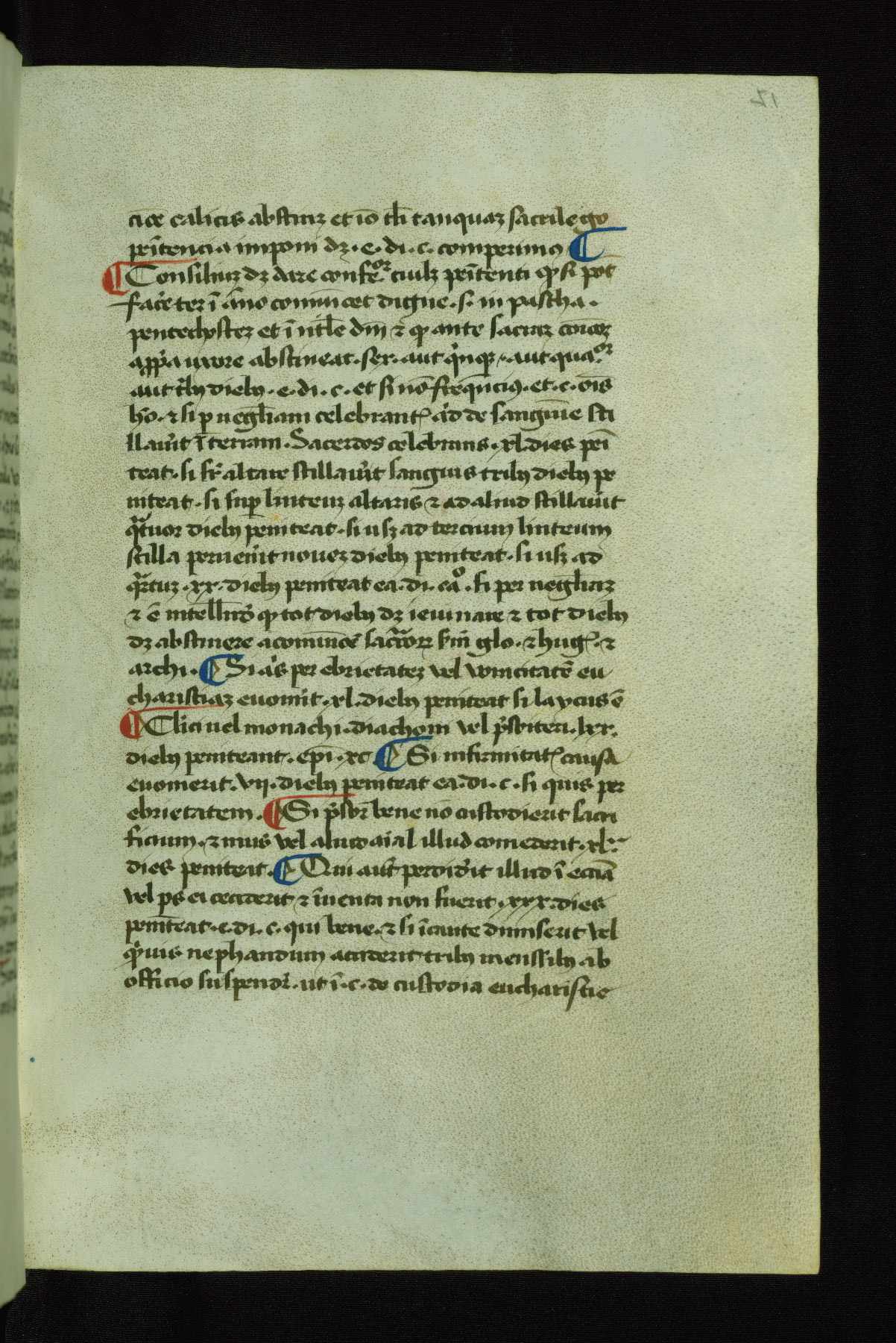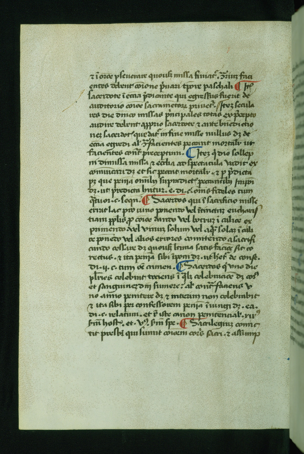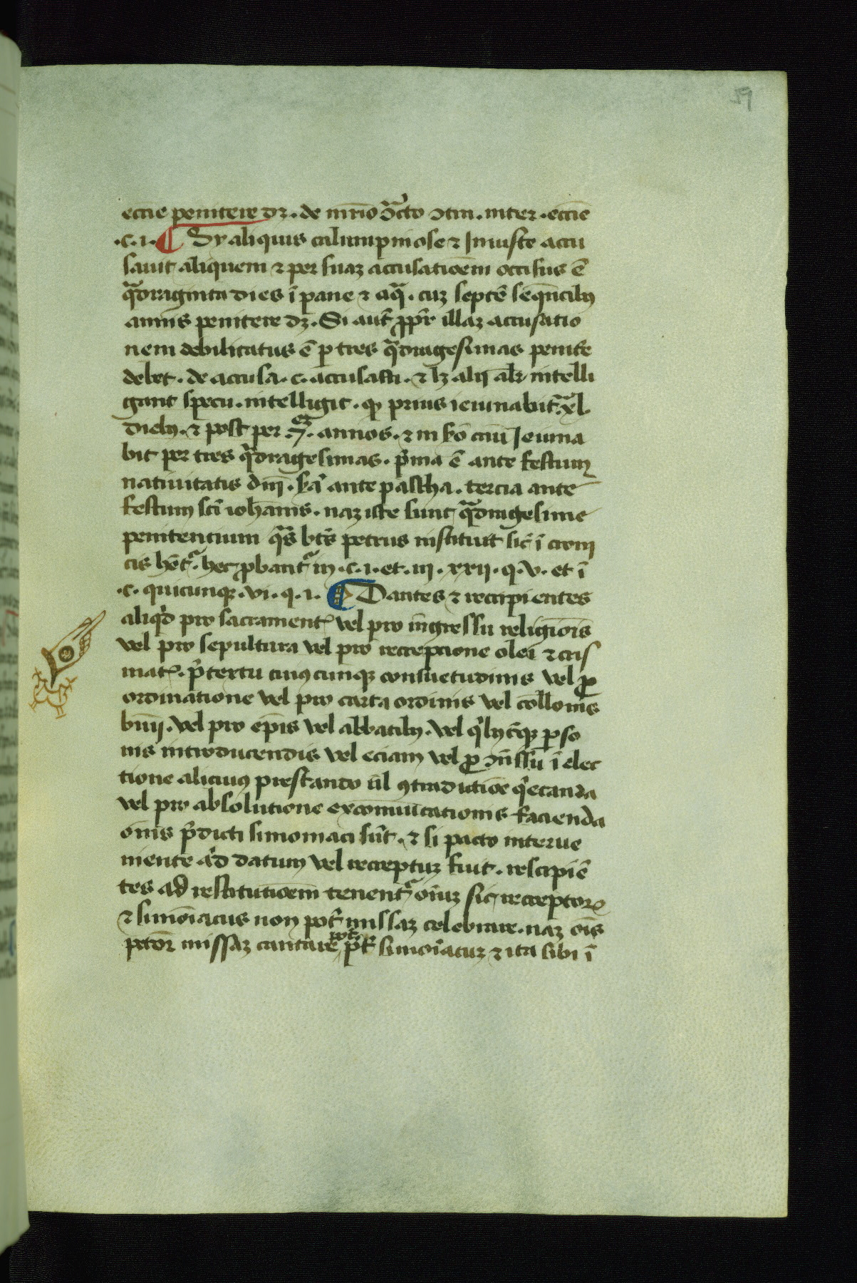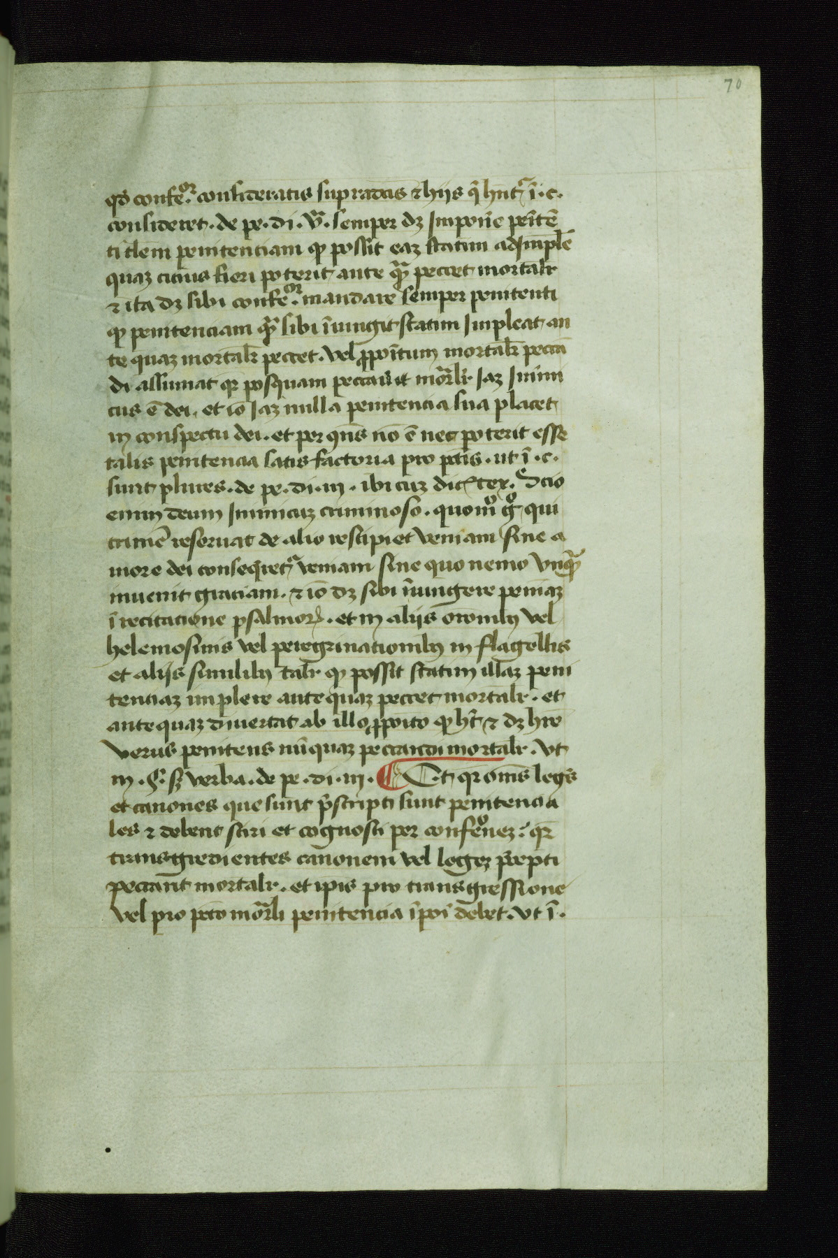 Alphonsus de Benavento wrote the treatise on penitential canons and acts of confession contained in this manuscript. The colophon informs us that Alphonsus was a professor of canon law at the university of Salmanca, Spain, and wrote this manuscript in 1456 in the nearby city of Tejares. At that time there was a pestilence in the city, for which Alphonsus asks for prayers. A historiated initial in which Alphonsus presents the treatise to a bishop begins the text, and the manuscript still retains its original stamped red leather binding.