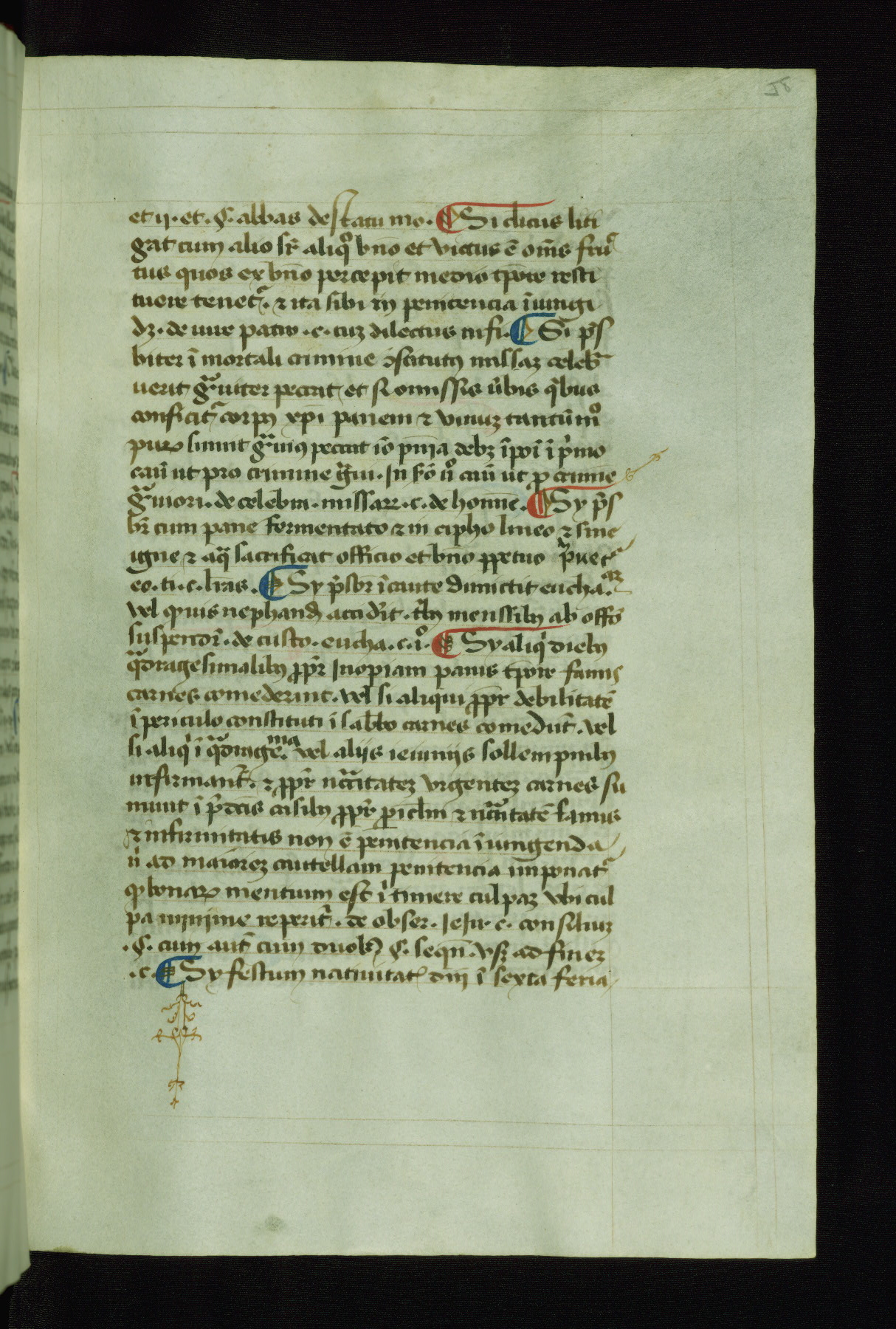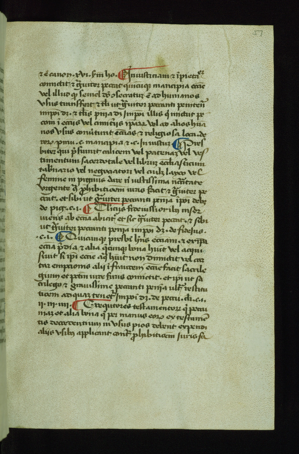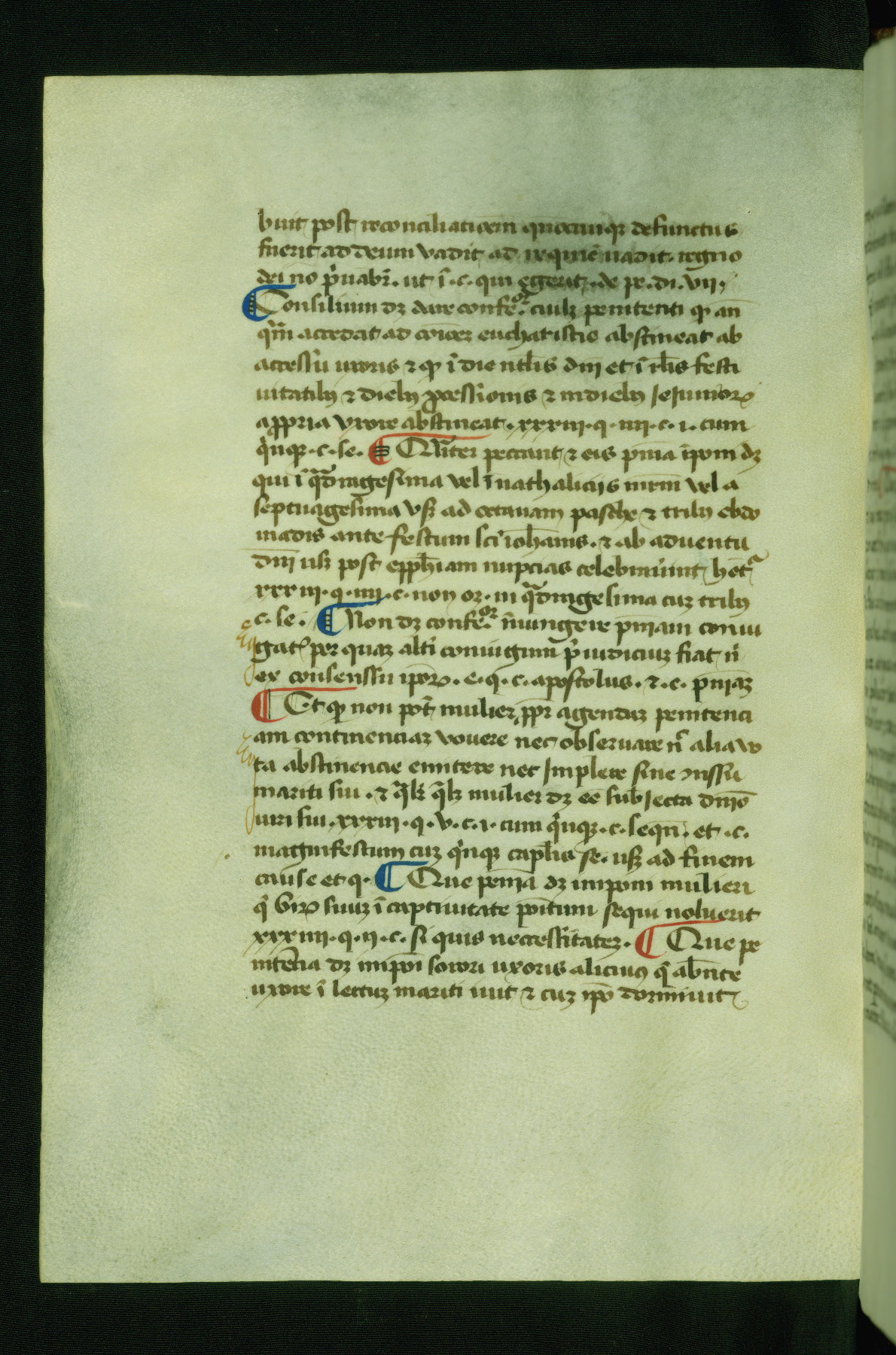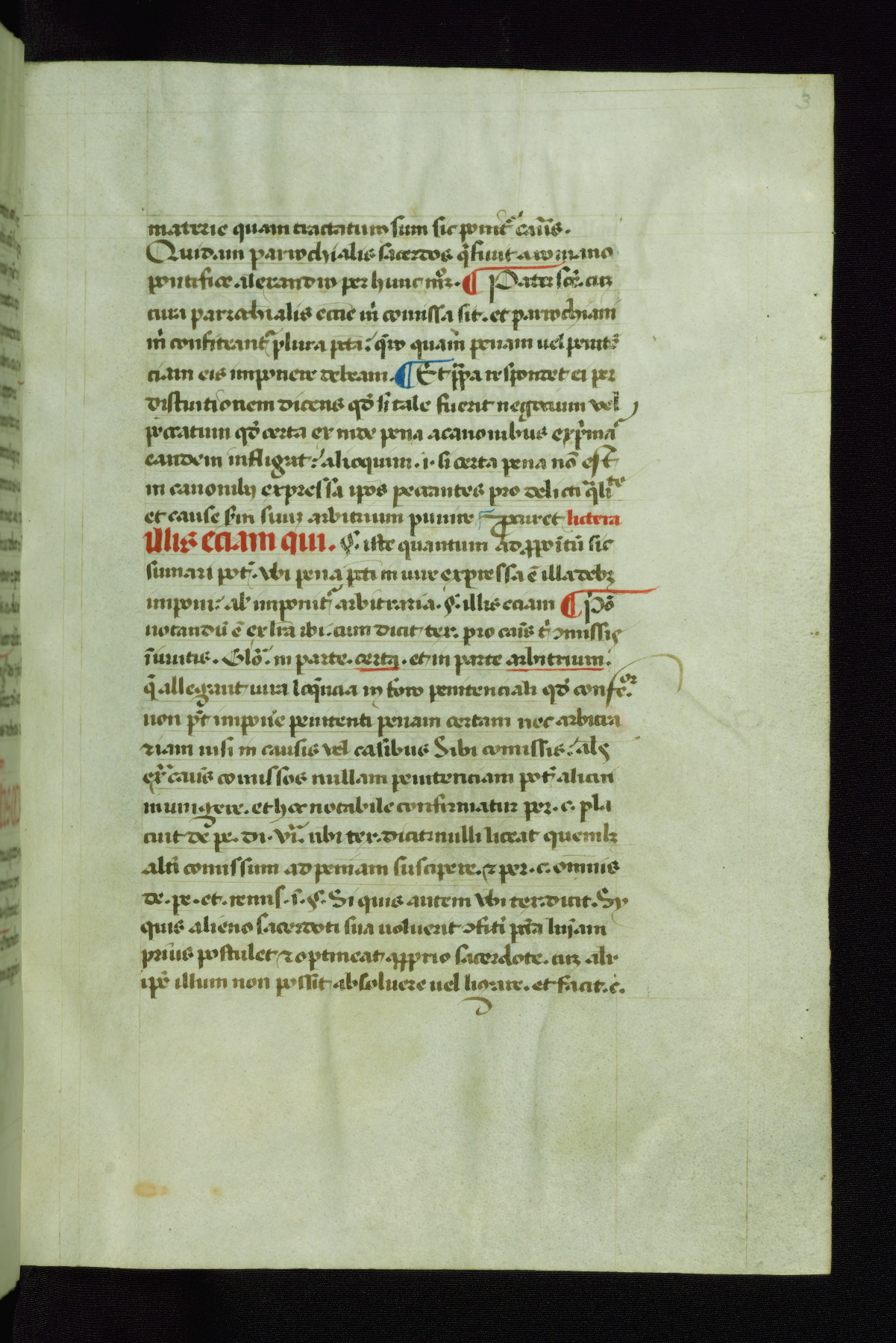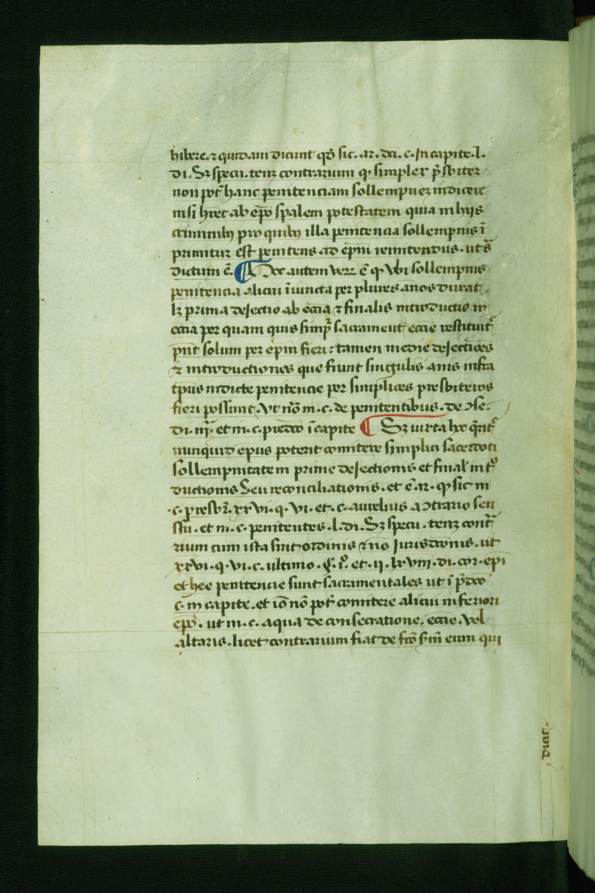 Alphonsus de Benavento wrote the treatise on penitential canons and acts of confession contained in this manuscript. The colophon informs us that Alphonsus was a professor of canon law at the university of Salmanca, Spain, and wrote this manuscript in 1456 in the nearby city of Tejares. At that time there was a pestilence in the city, for which Alphonsus asks for prayers. A historiated initial in which Alphonsus presents the treatise to a bishop begins the text, and the manuscript still retains its original stamped red leather binding.