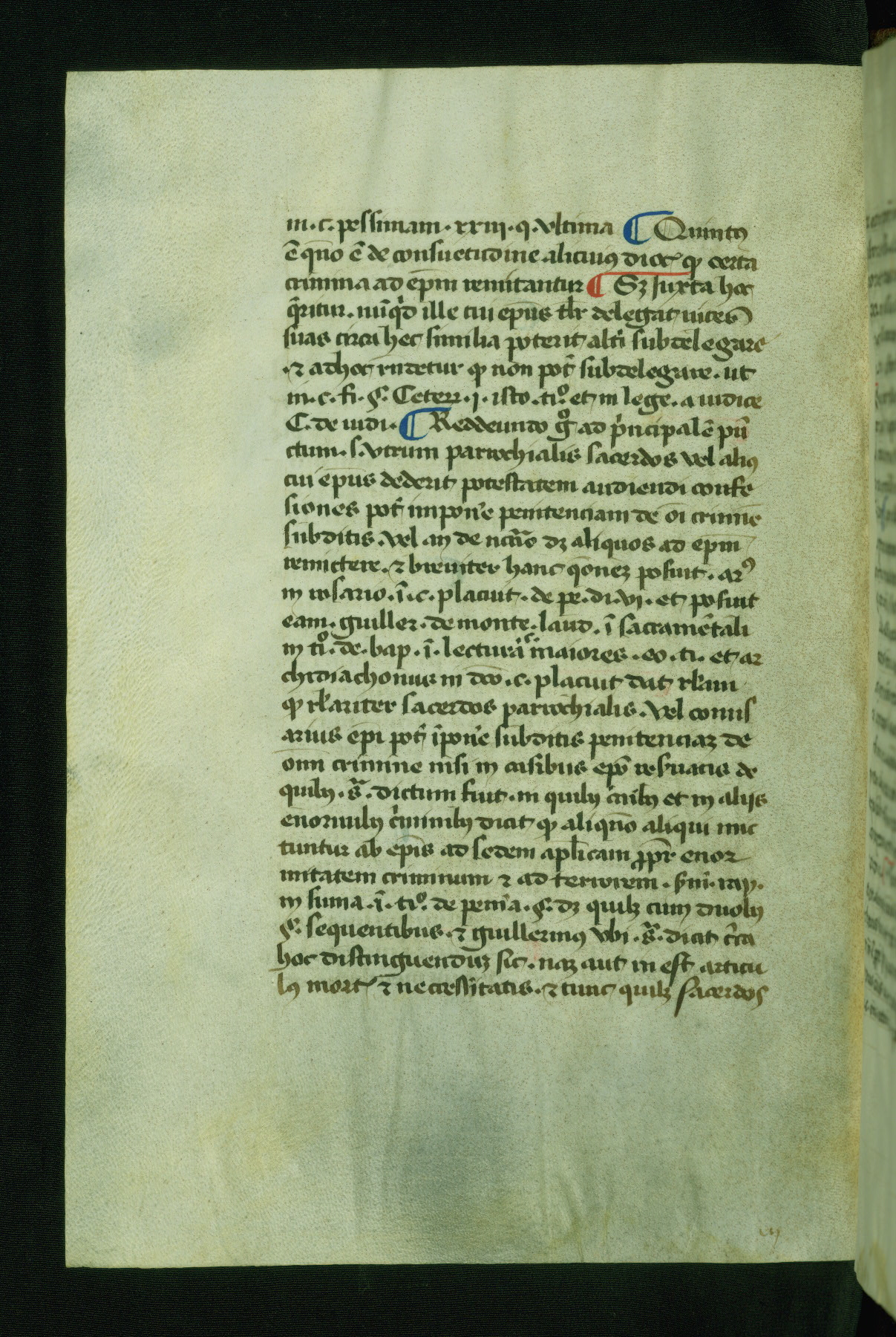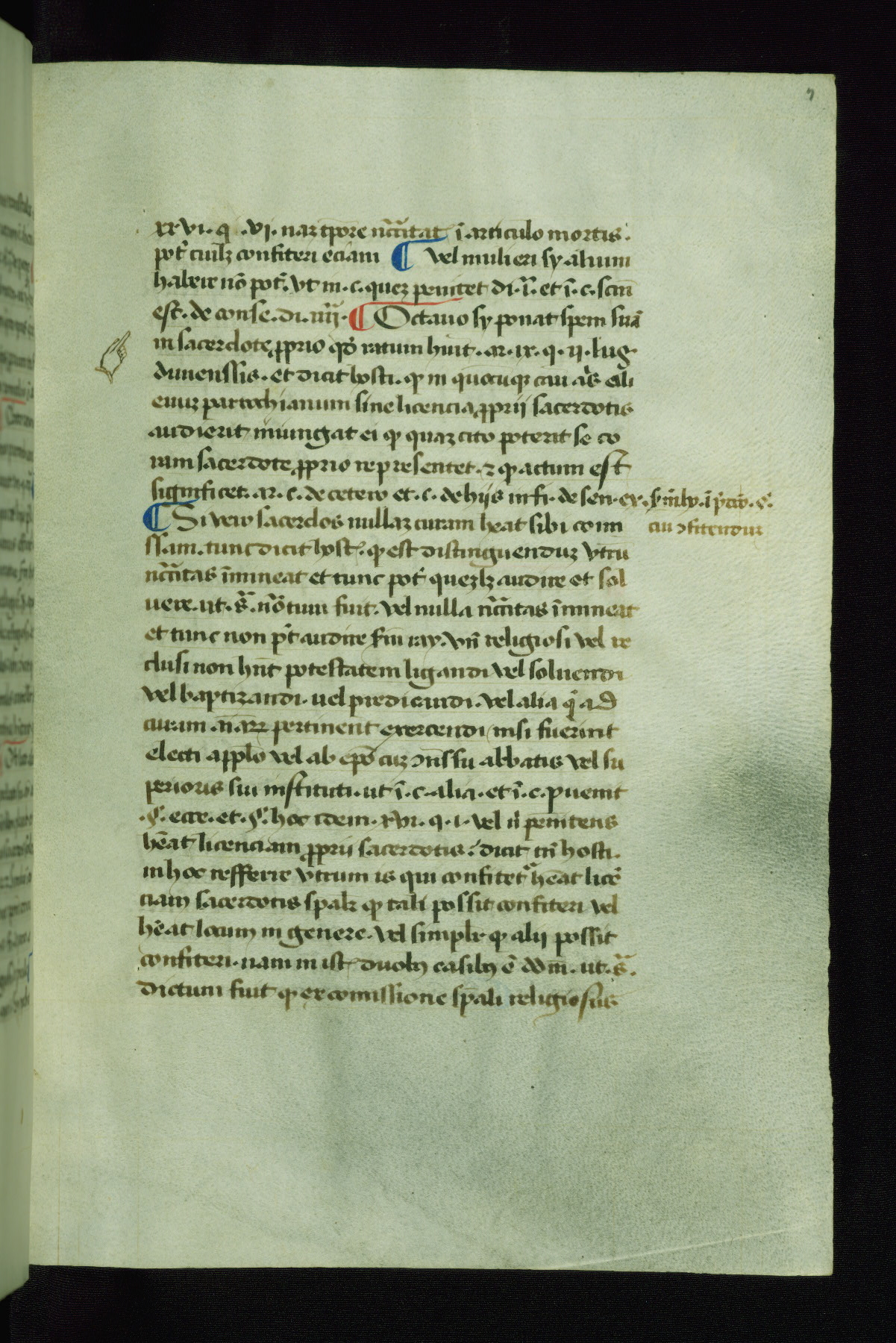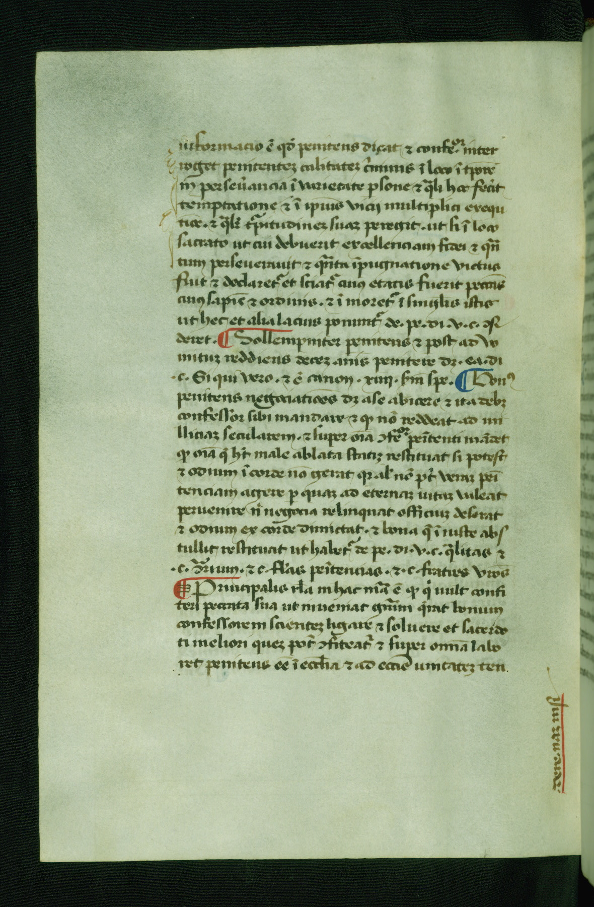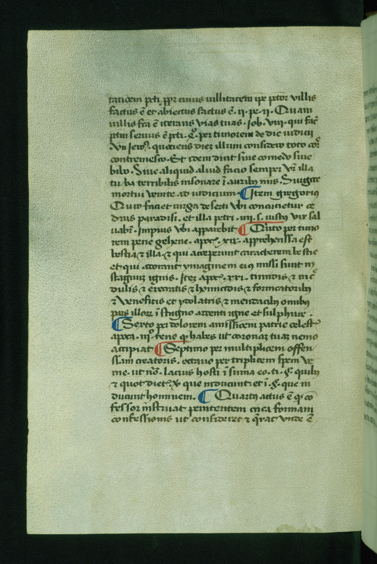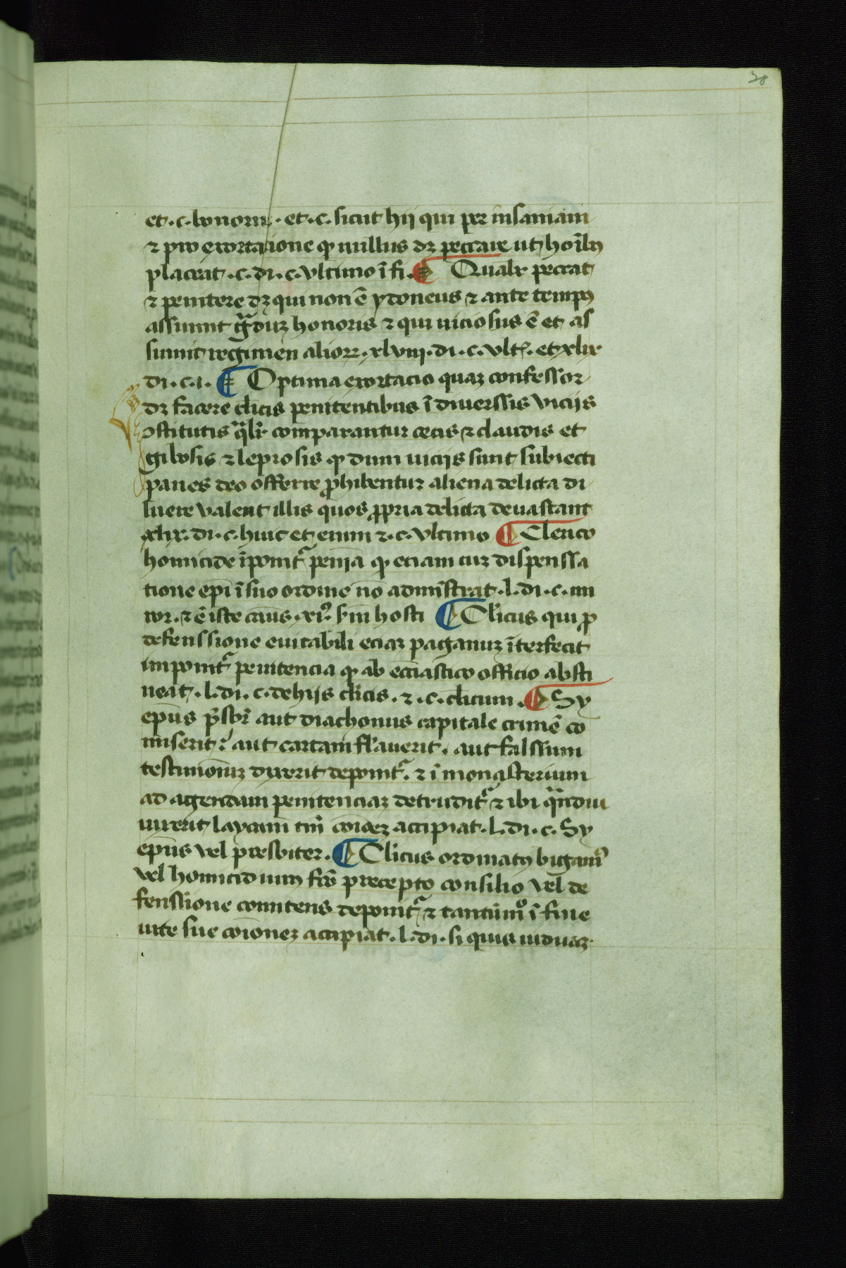 Alphonsus de Benavento wrote the treatise on penitential canons and acts of confession contained in this manuscript. The colophon informs us that Alphonsus was a professor of canon law at the university of Salmanca, Spain, and wrote this manuscript in 1456 in the nearby city of Tejares. At that time there was a pestilence in the city, for which Alphonsus asks for prayers. A historiated initial in which Alphonsus presents the treatise to a bishop begins the text, and the manuscript still retains its original stamped red leather binding.