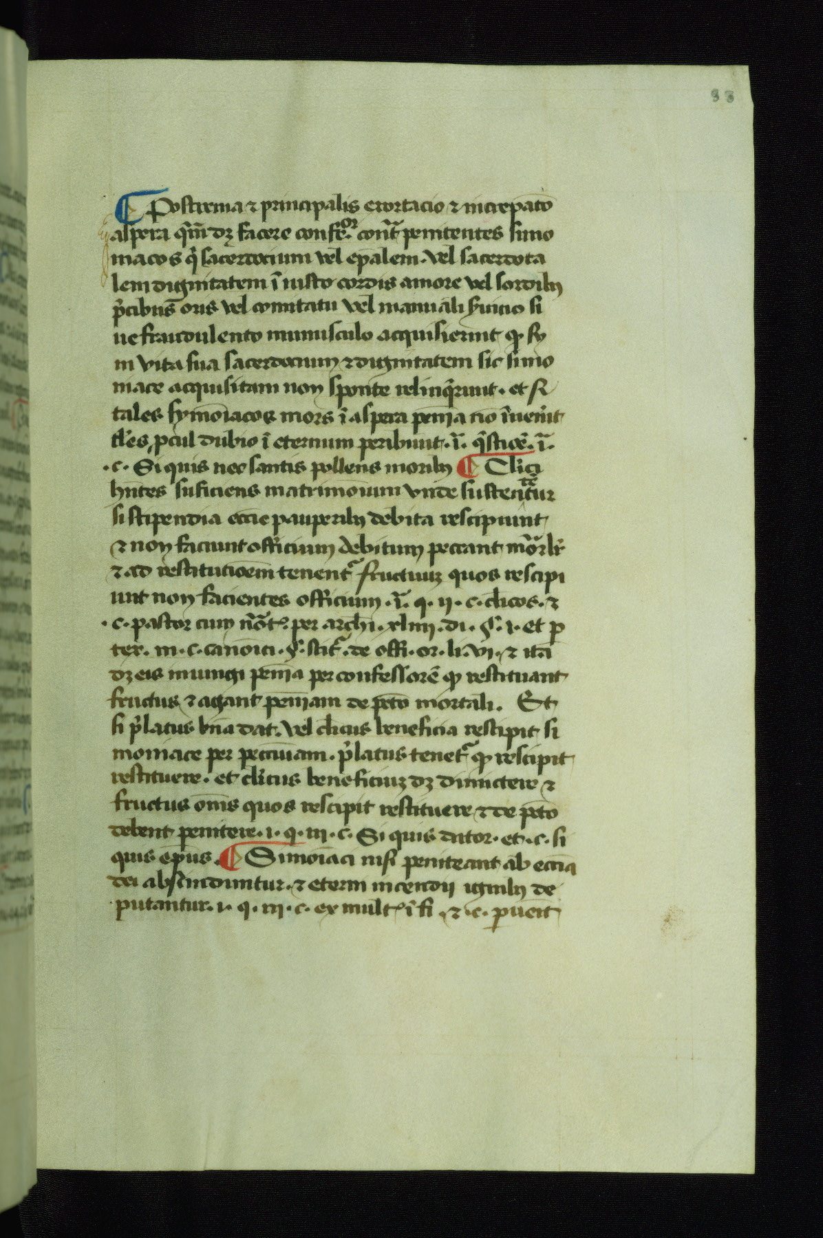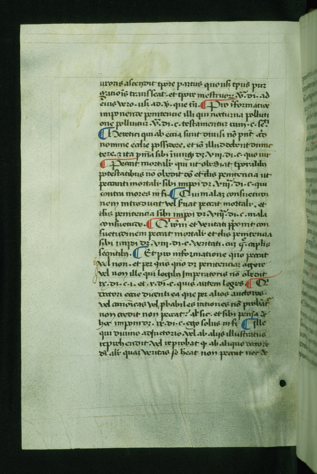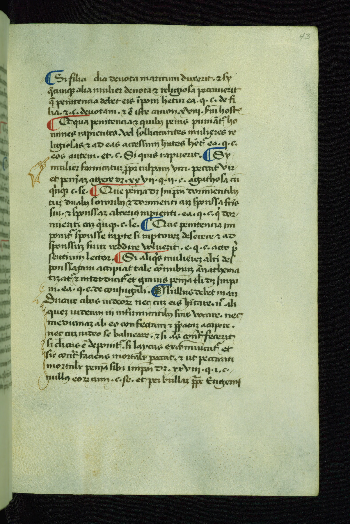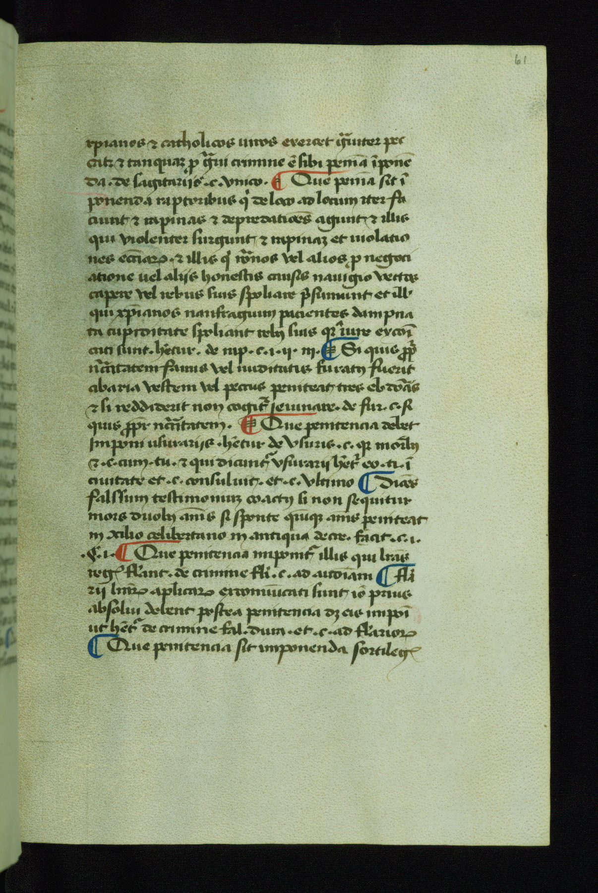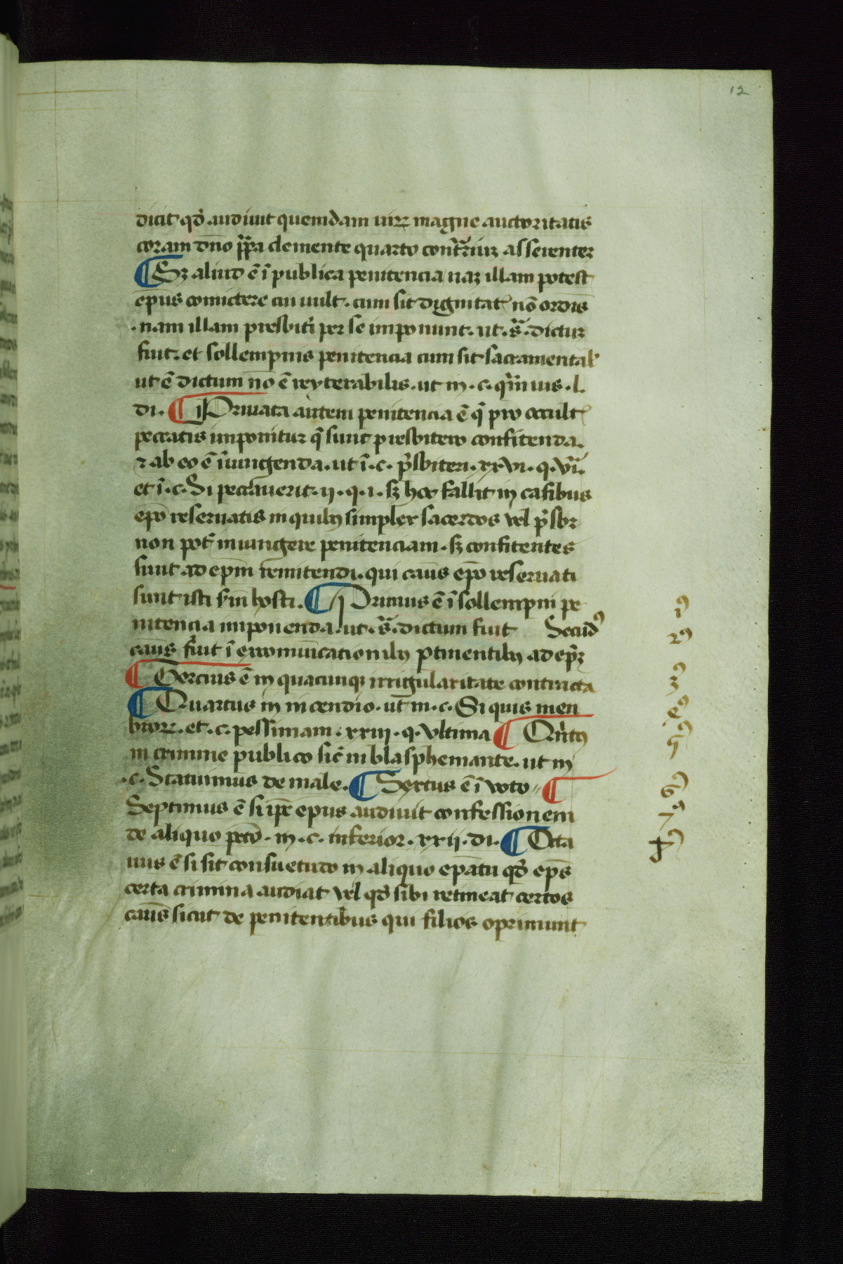 Alphonsus de Benavento wrote the treatise on penitential canons and acts of confession contained in this manuscript. The colophon informs us that Alphonsus was a professor of canon law at the university of Salmanca, Spain, and wrote this manuscript in 1456 in the nearby city of Tejares. At that time there was a pestilence in the city, for which Alphonsus asks for prayers. A historiated initial in which Alphonsus presents the treatise to a bishop begins the text, and the manuscript still retains its original stamped red leather binding.