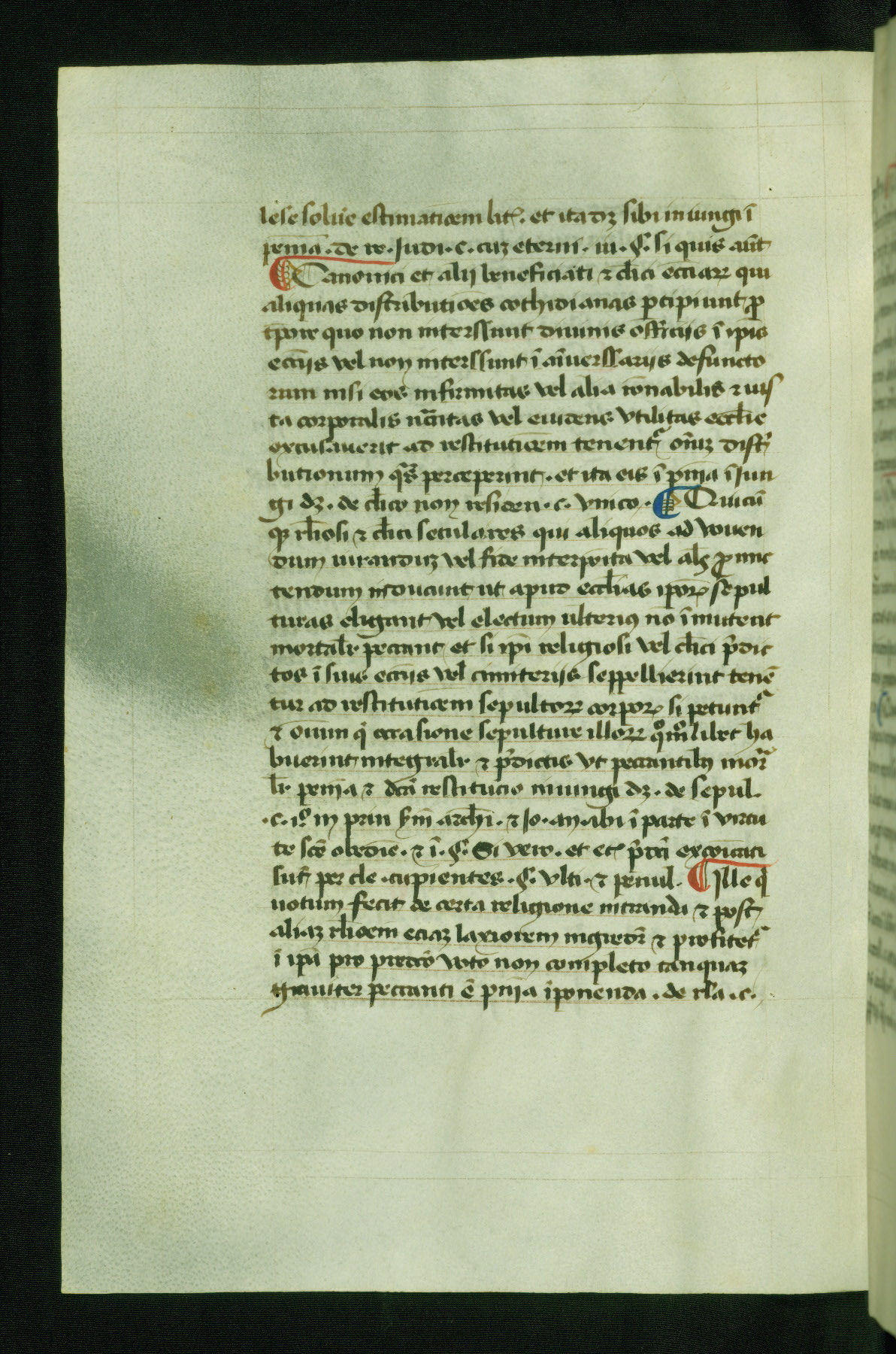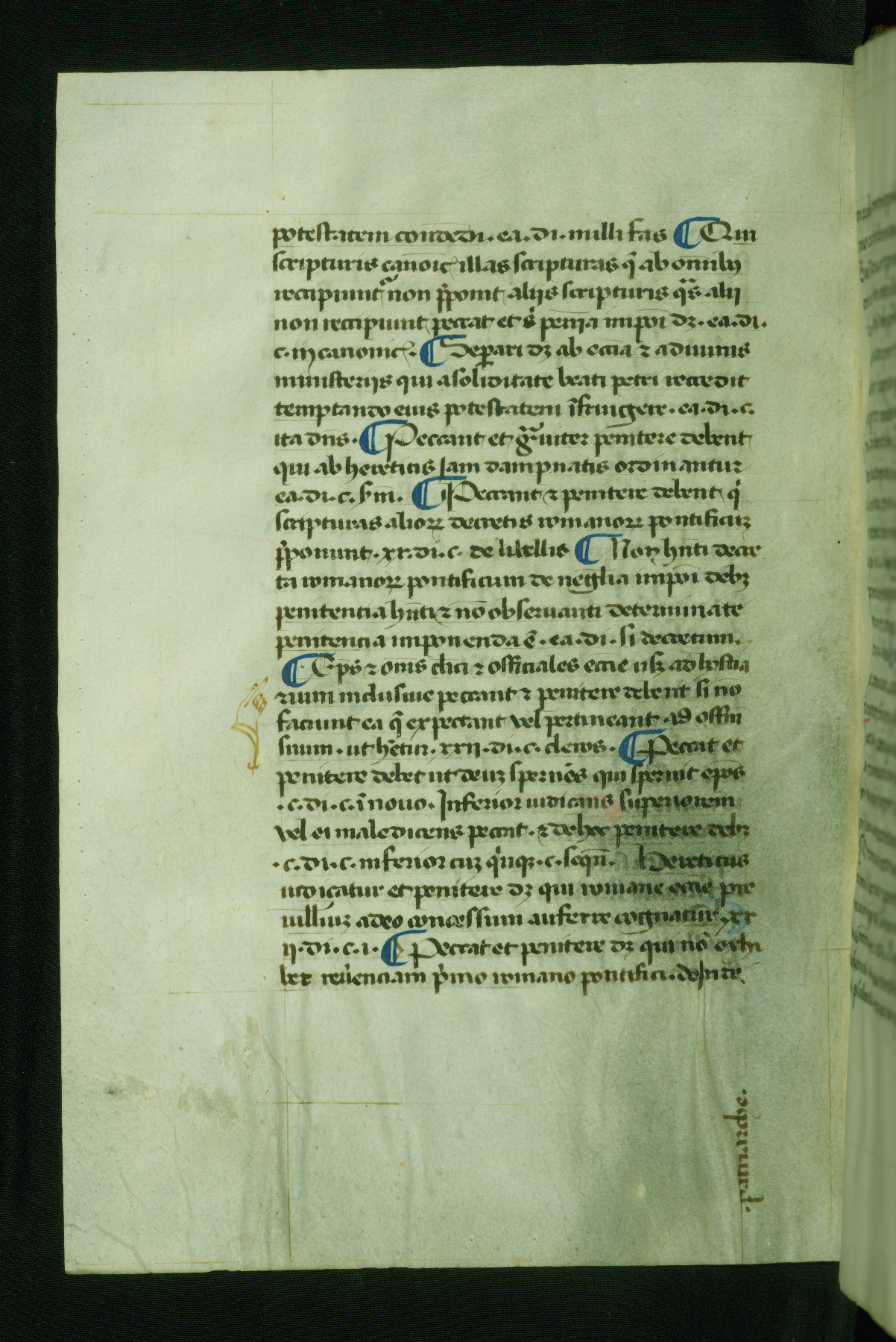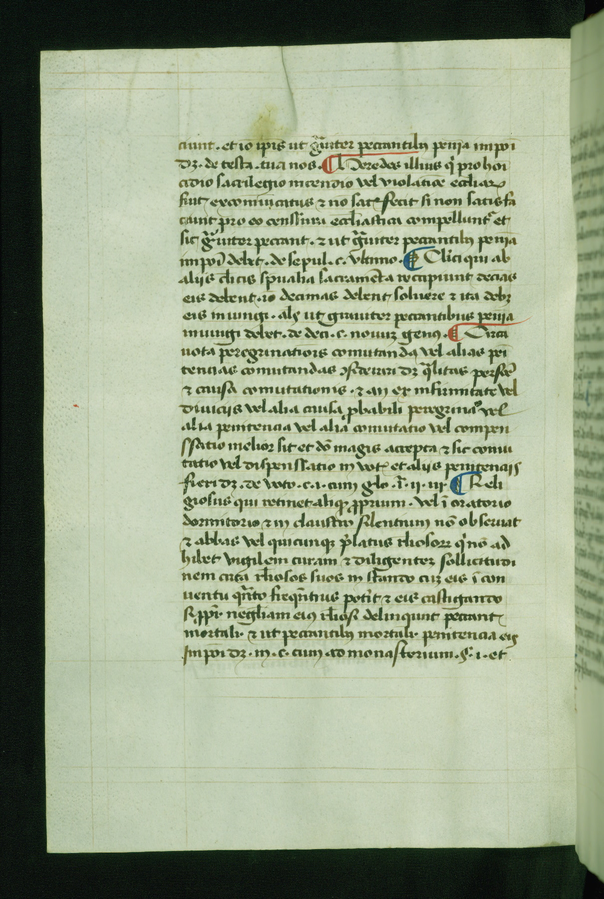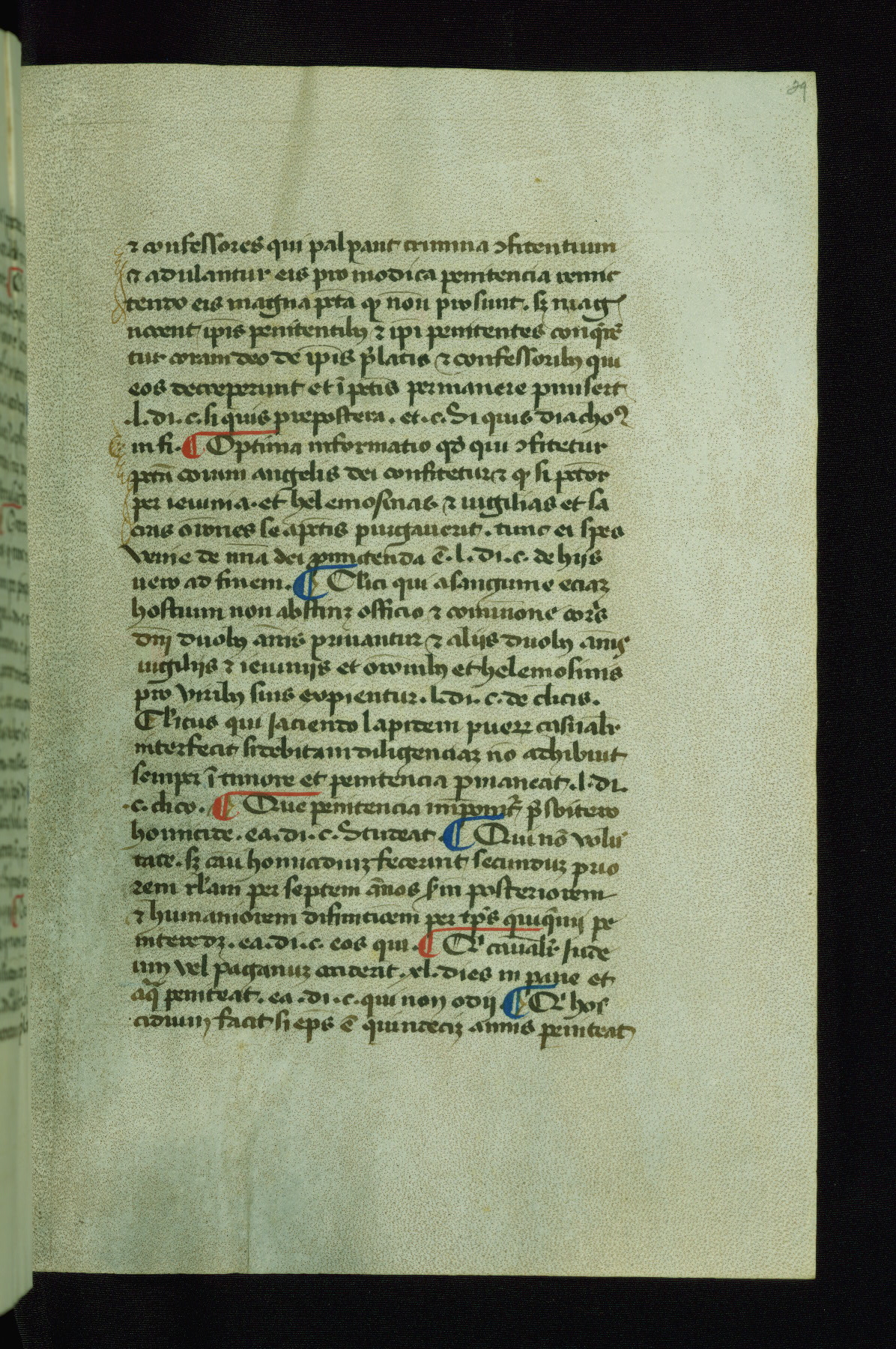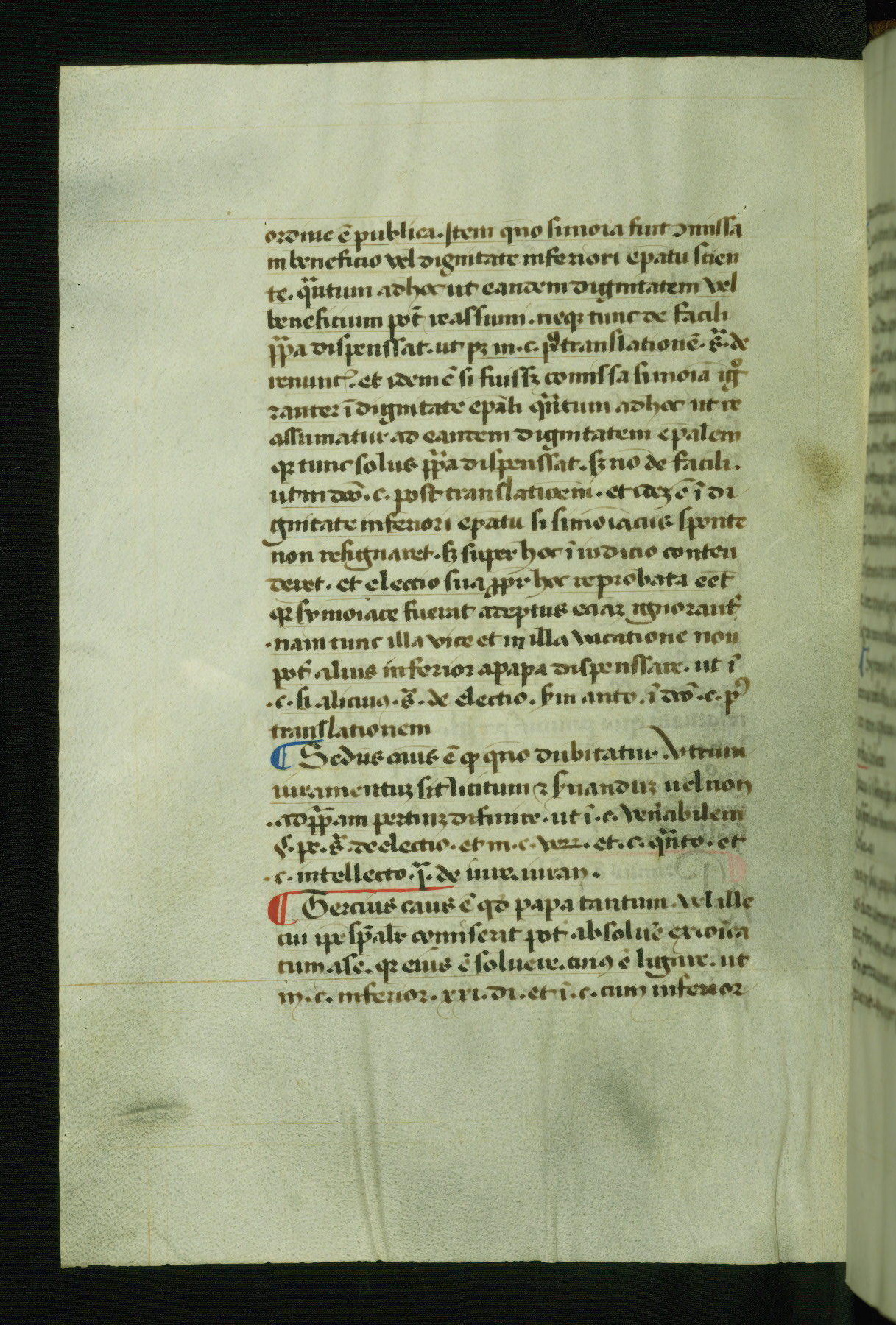 Alphonsus de Benavento wrote the treatise on penitential canons and acts of confession contained in this manuscript. The colophon informs us that Alphonsus was a professor of canon law at the university of Salmanca, Spain, and wrote this manuscript in 1456 in the nearby city of Tejares. At that time there was a pestilence in the city, for which Alphonsus asks for prayers. A historiated initial in which Alphonsus presents the treatise to a bishop begins the text, and the manuscript still retains its original stamped red leather binding.