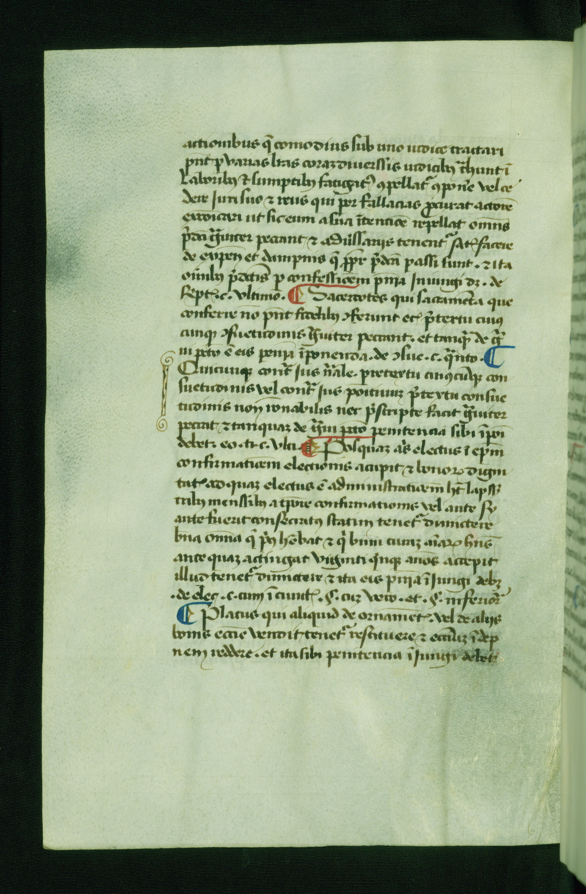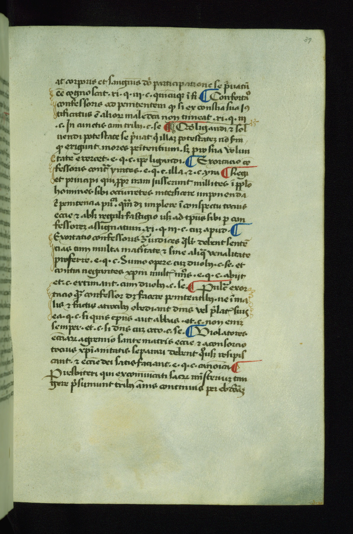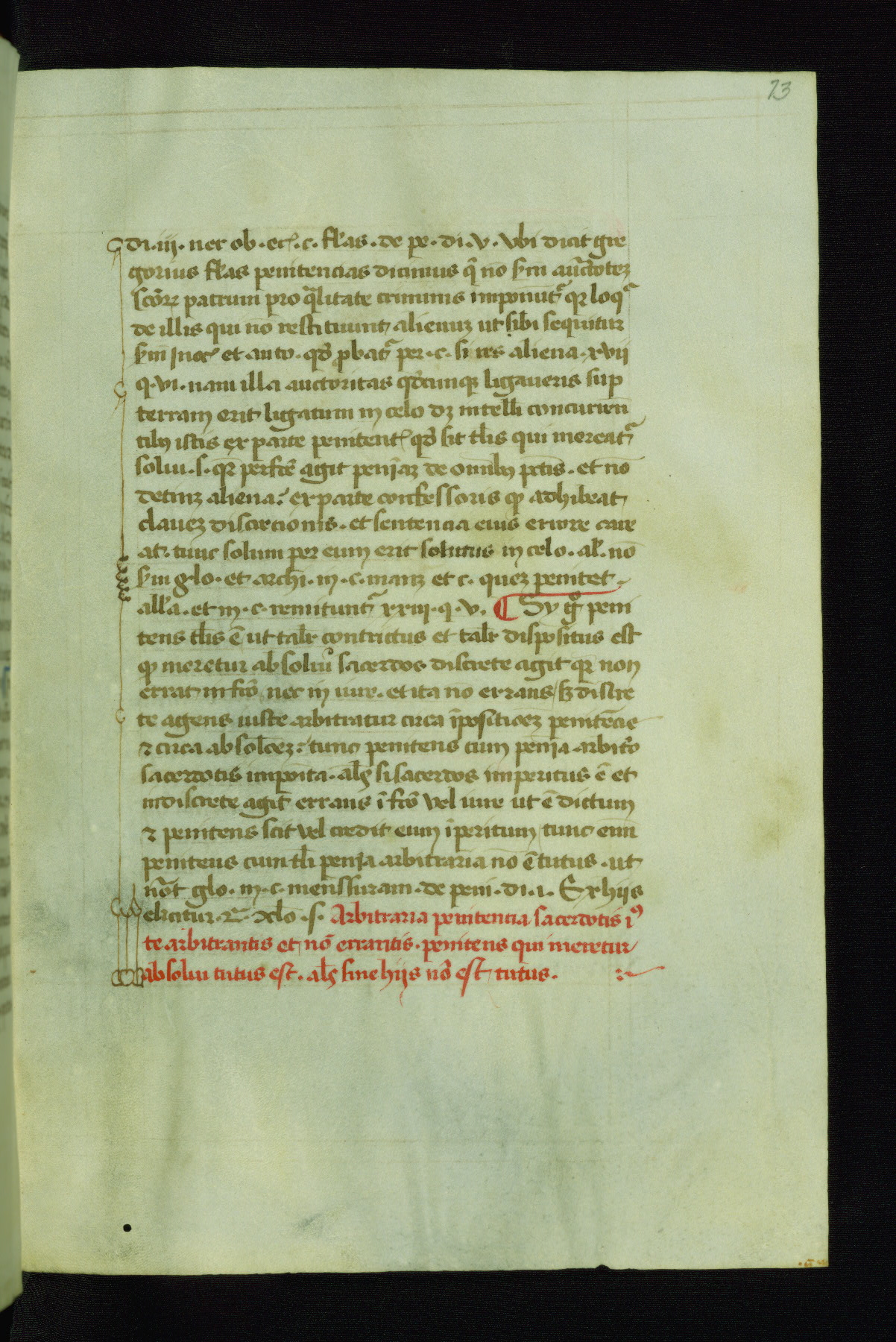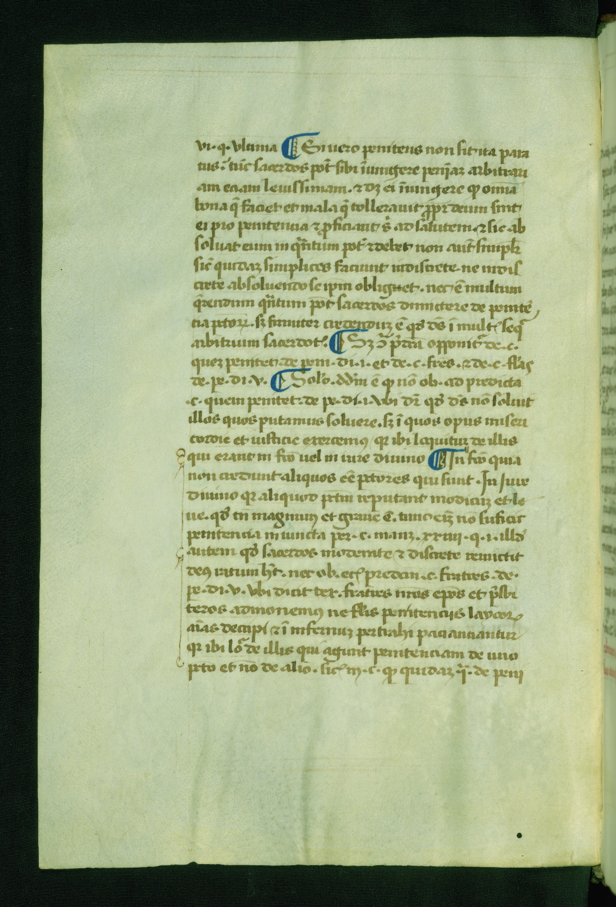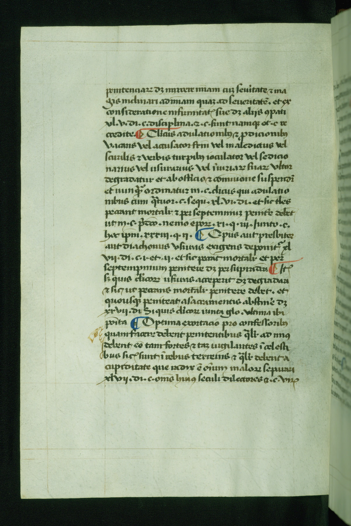 Alphonsus de Benavento wrote the treatise on penitential canons and acts of confession contained in this manuscript. The colophon informs us that Alphonsus was a professor of canon law at the university of Salmanca, Spain, and wrote this manuscript in 1456 in the nearby city of Tejares. At that time there was a pestilence in the city, for which Alphonsus asks for prayers. A historiated initial in which Alphonsus presents the treatise to a bishop begins the text, and the manuscript still retains its original stamped red leather binding.