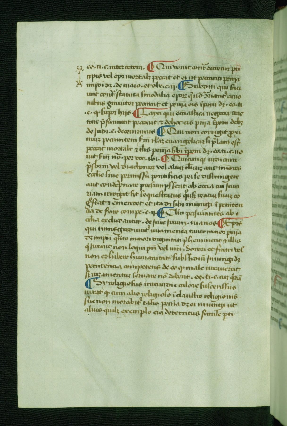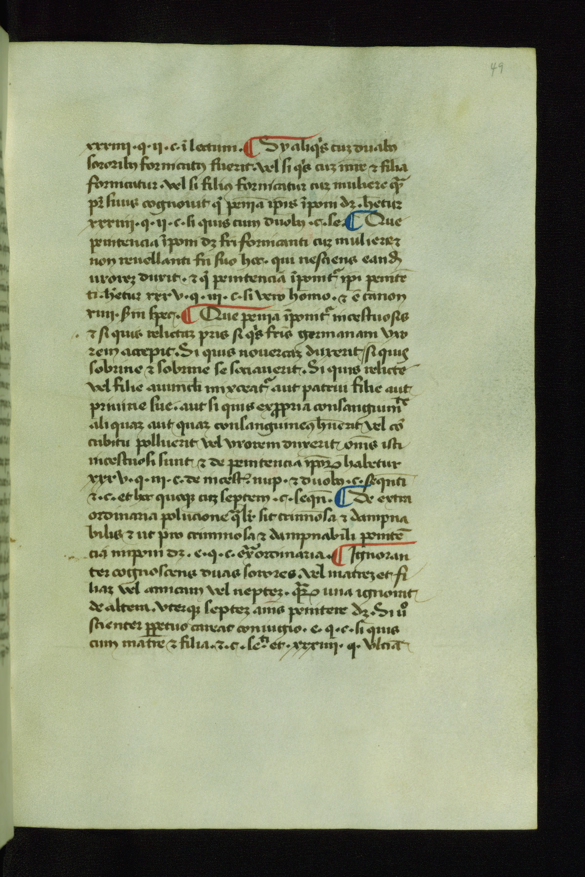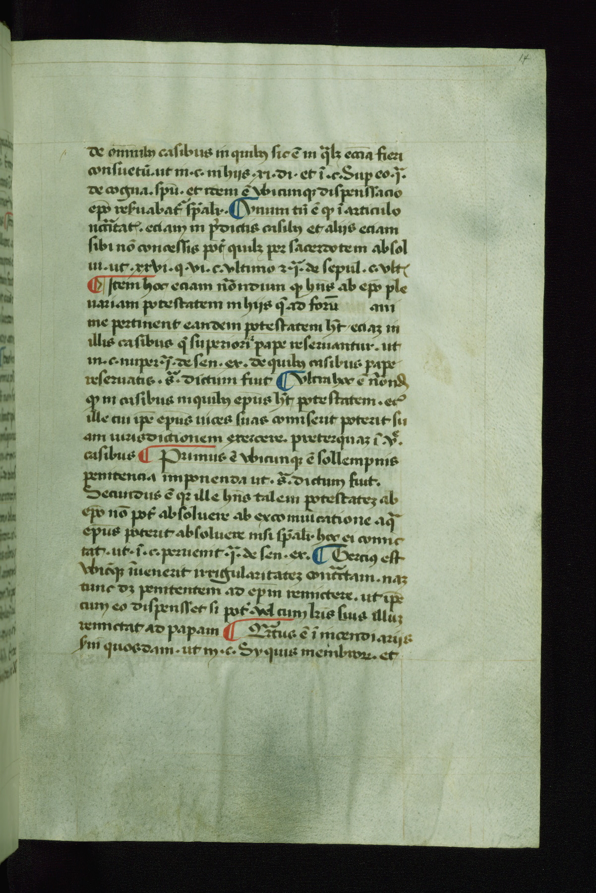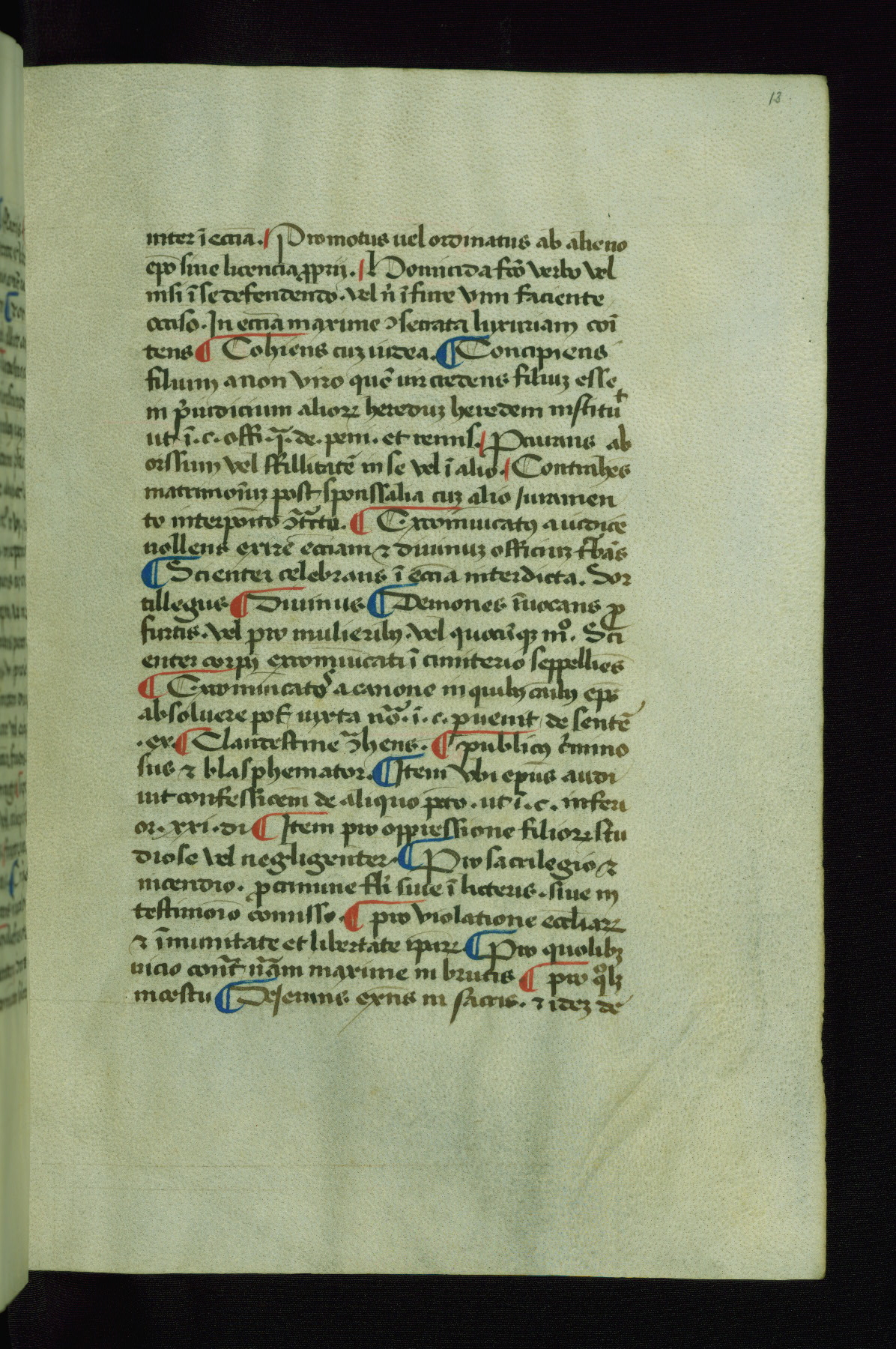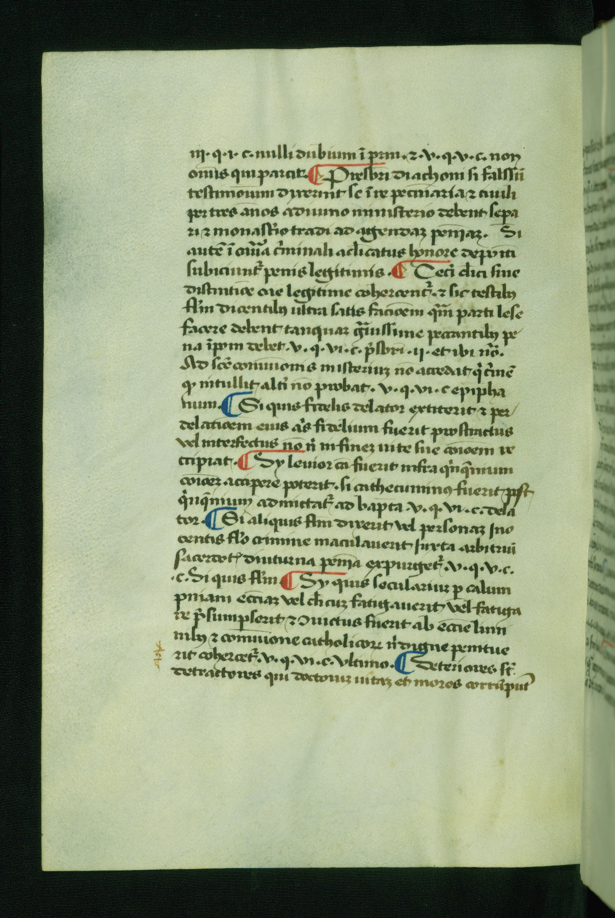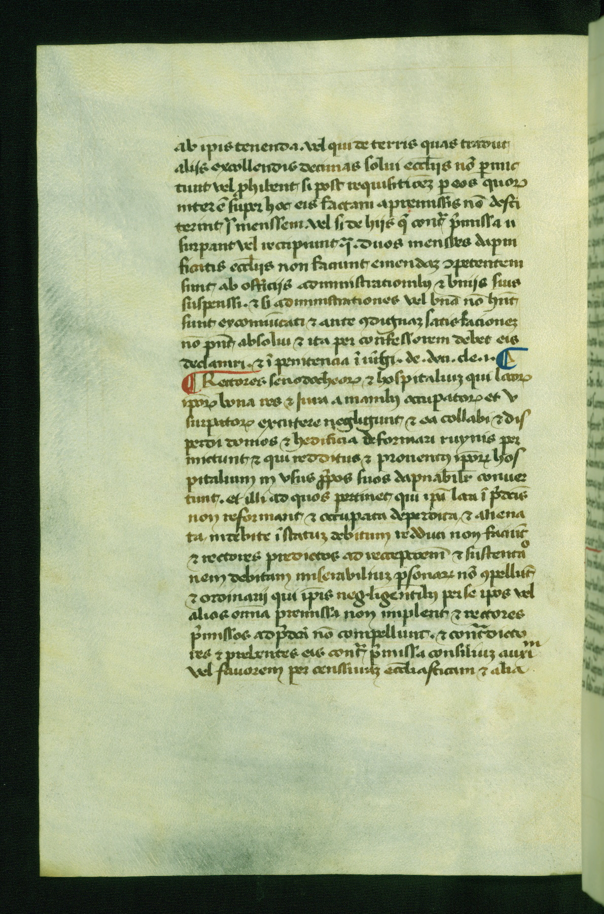 Alphonsus de Benavento wrote the treatise on penitential canons and acts of confession contained in this manuscript. The colophon informs us that Alphonsus was a professor of canon law at the university of Salmanca, Spain, and wrote this manuscript in 1456 in the nearby city of Tejares. At that time there was a pestilence in the city, for which Alphonsus asks for prayers. A historiated initial in which Alphonsus presents the treatise to a bishop begins the text, and the manuscript still retains its original stamped red leather binding.