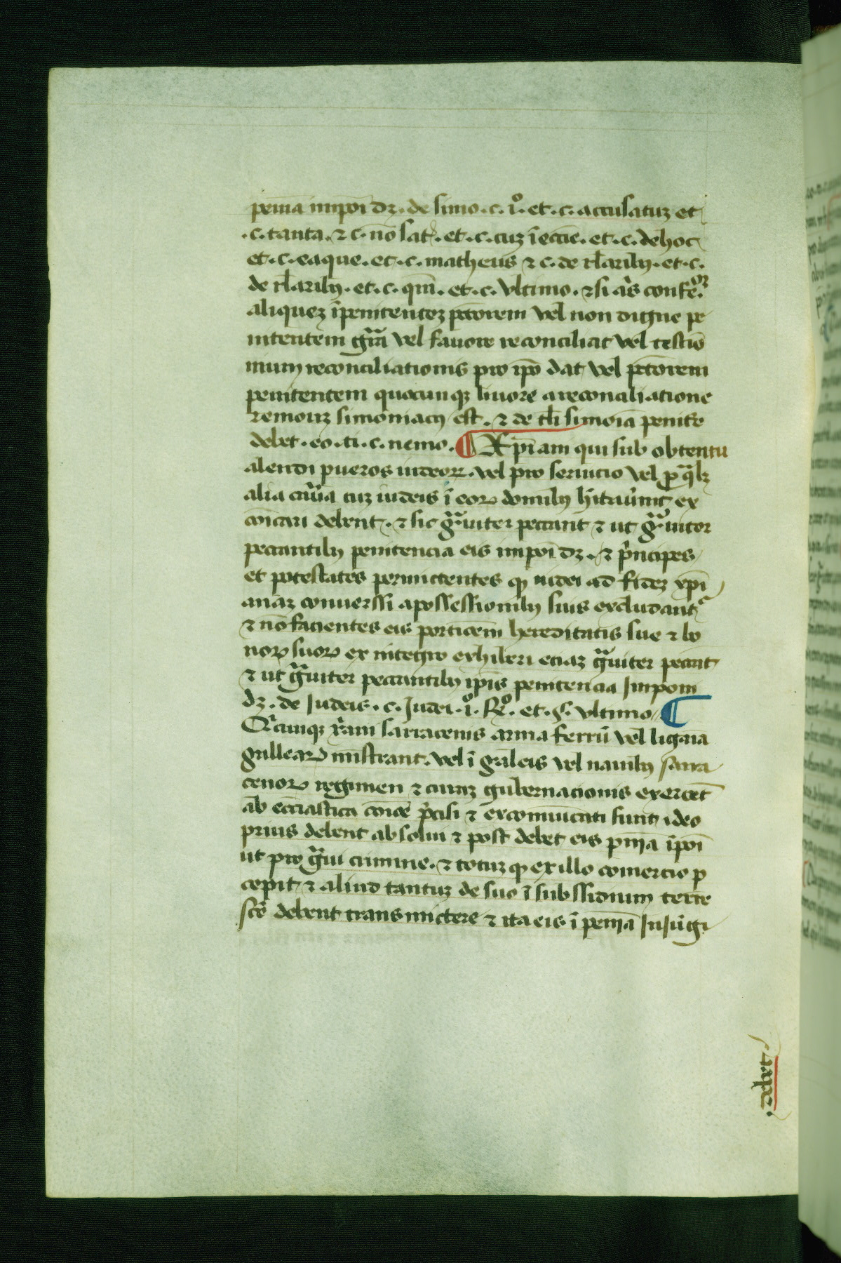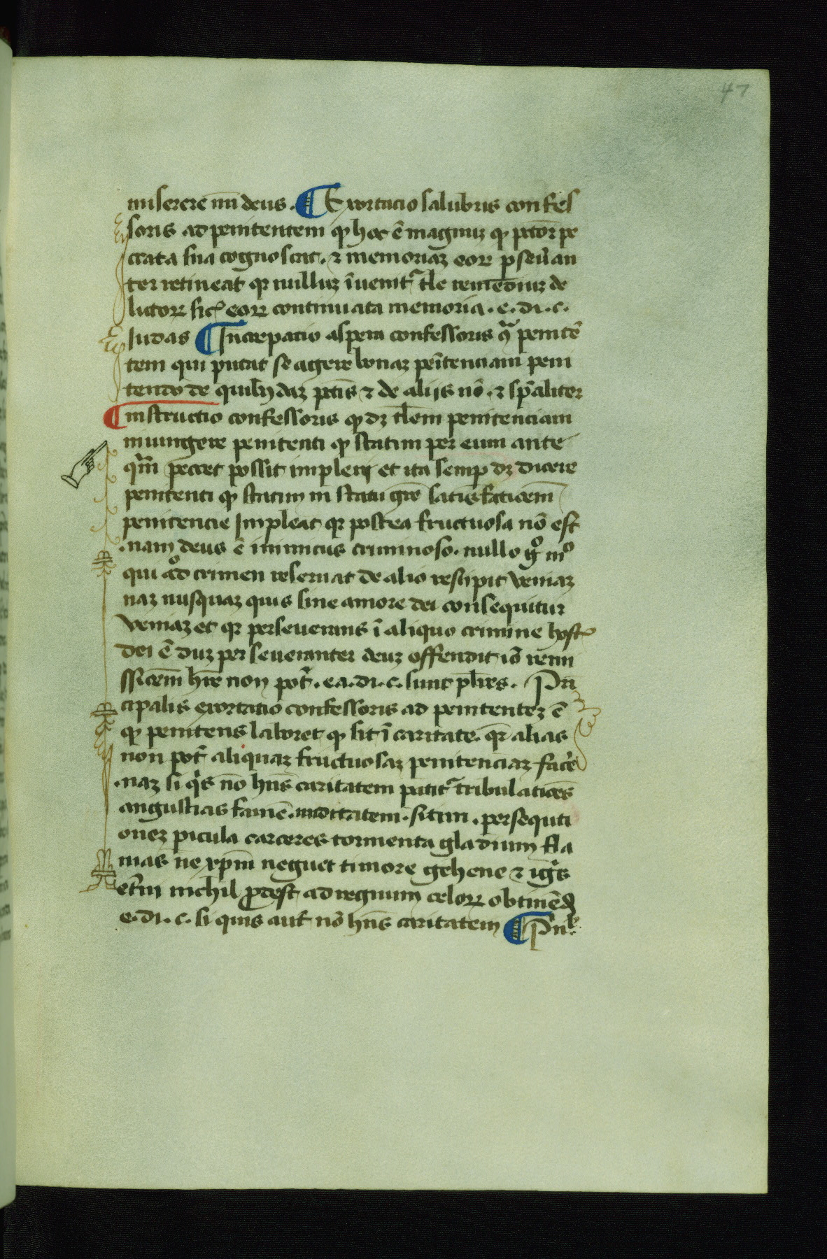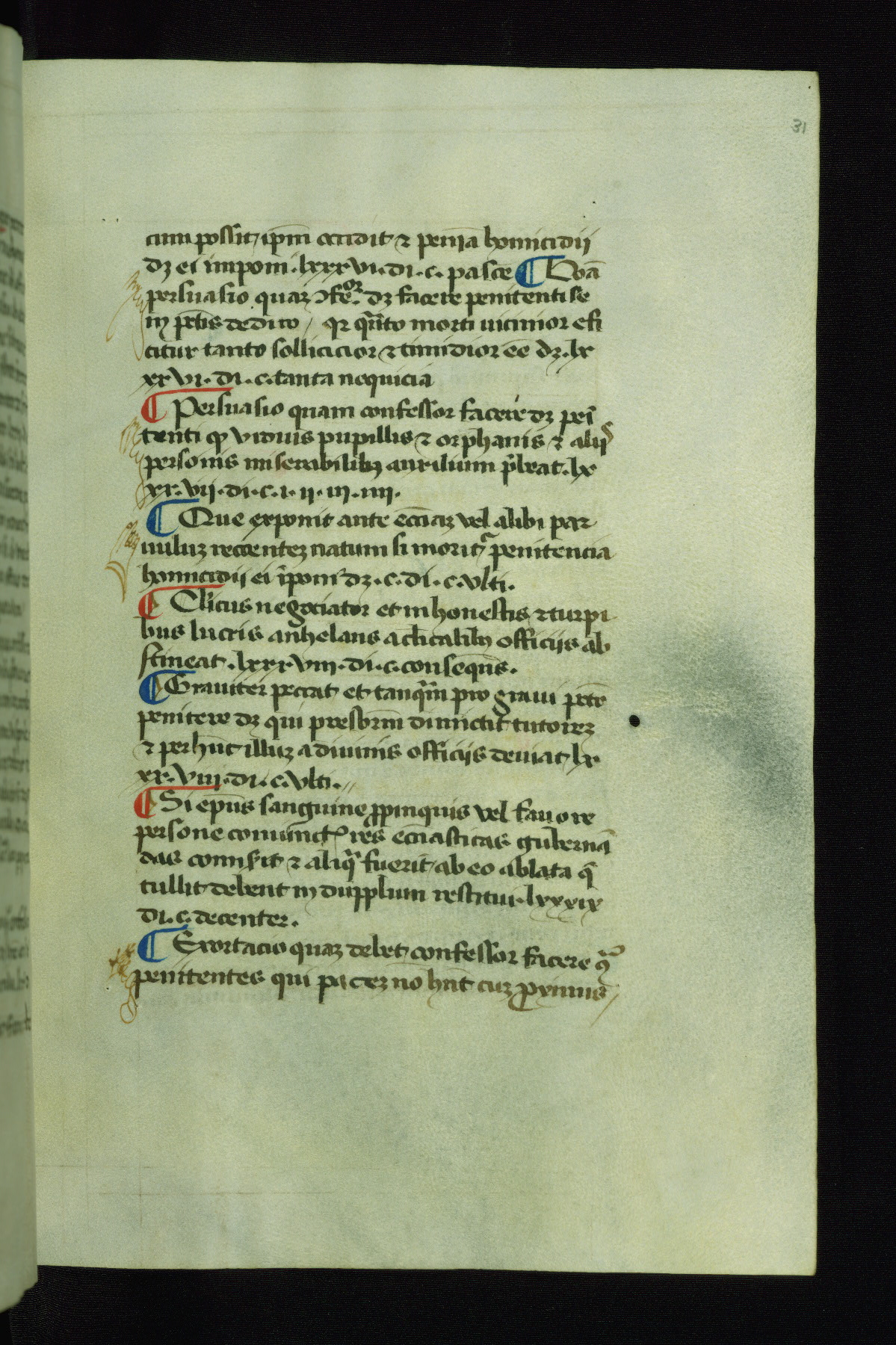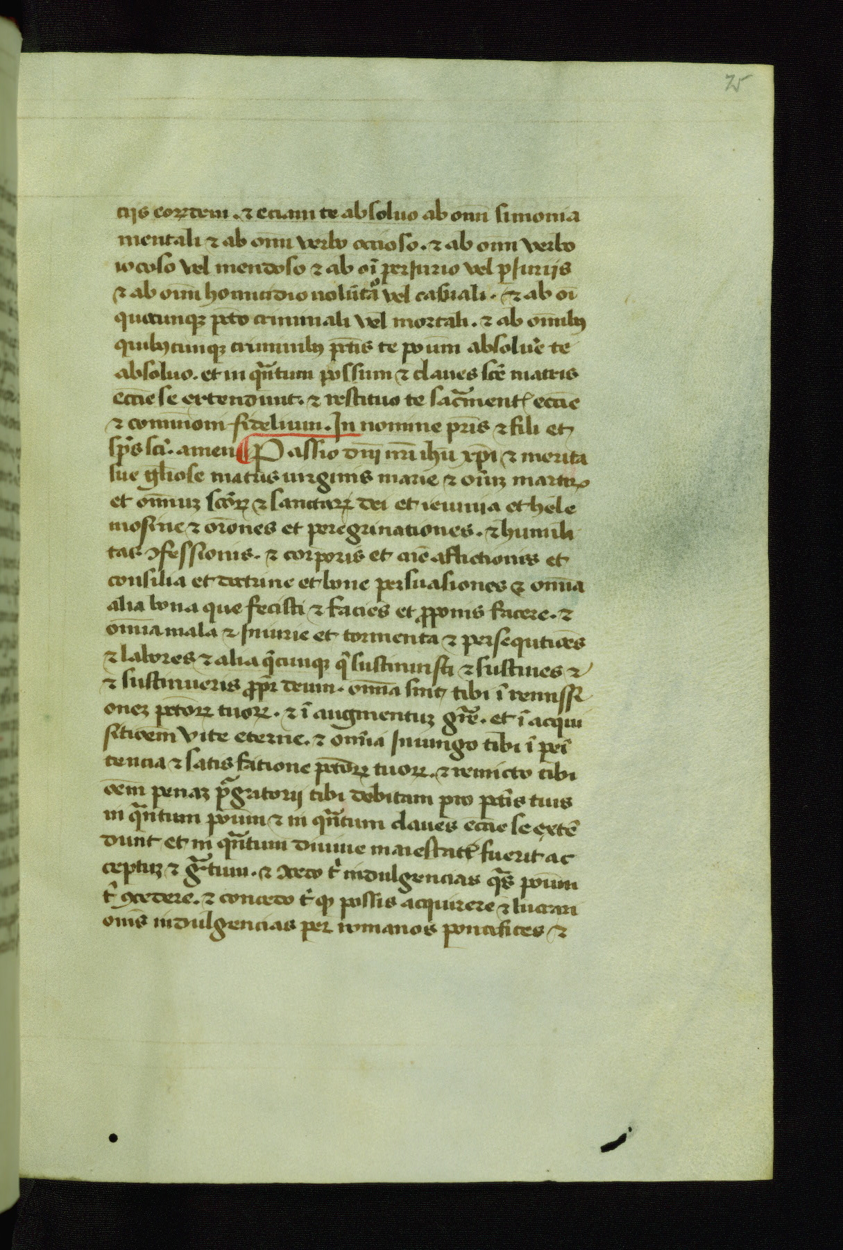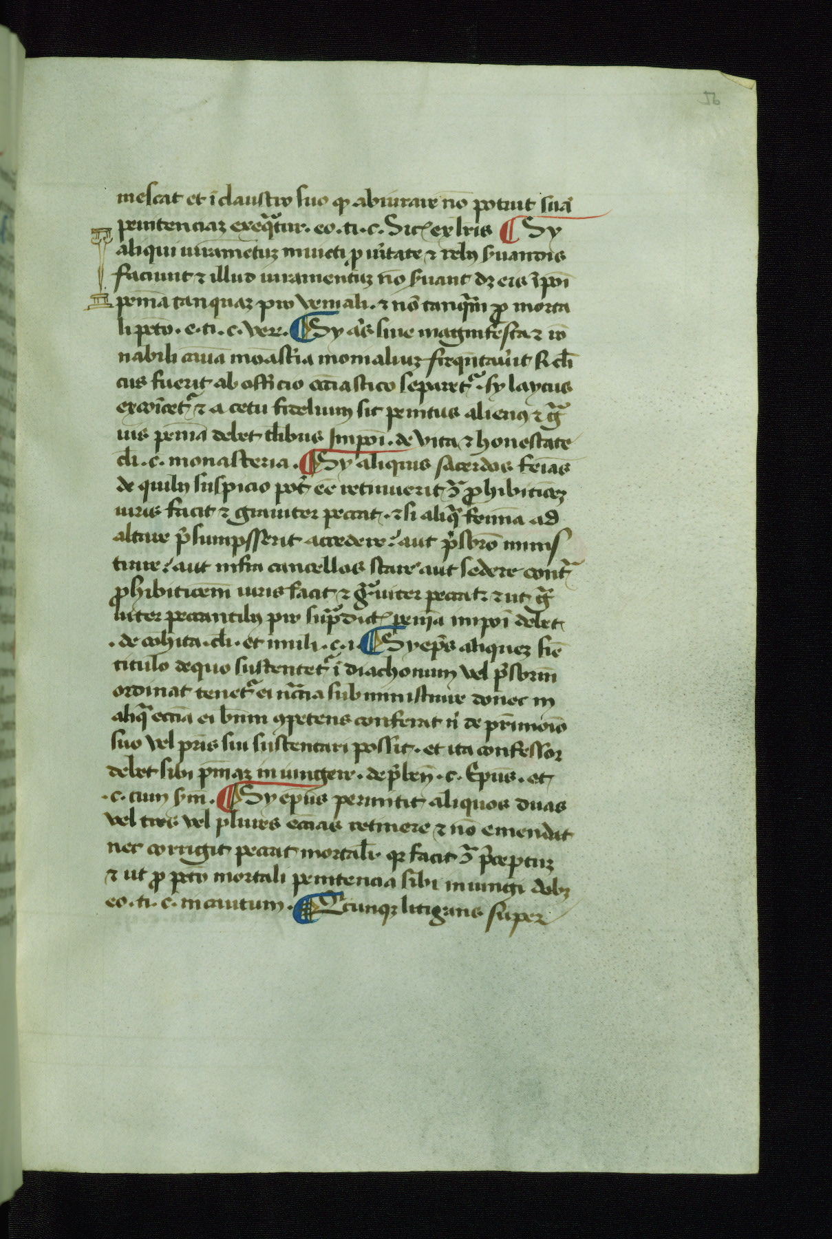 Alphonsus de Benavento wrote the treatise on penitential canons and acts of confession contained in this manuscript. The colophon informs us that Alphonsus was a professor of canon law at the university of Salmanca, Spain, and wrote this manuscript in 1456 in the nearby city of Tejares. At that time there was a pestilence in the city, for which Alphonsus asks for prayers. A historiated initial in which Alphonsus presents the treatise to a bishop begins the text, and the manuscript still retains its original stamped red leather binding.
